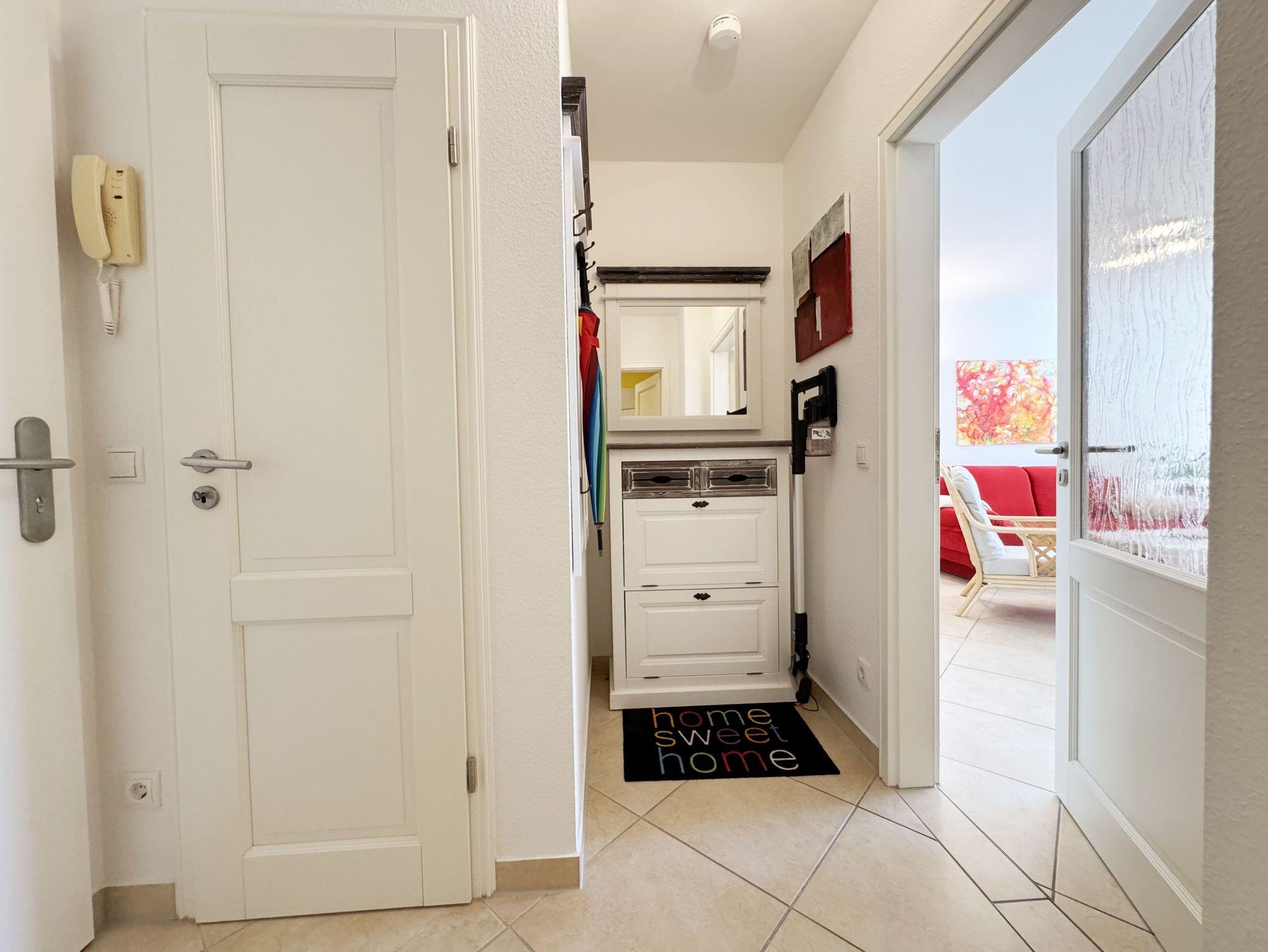 Herzlich Willkommen in unserer liebevoll eingerichteten 2-Zimmer-Wohnung (Nr.06) mit überdachtem Balkon im ersten Obergeschoß des modernen Apartmenthauses Villa Mara im schönen Ostseebad Baabe! Mit ca. 52 qm bietet die lichtdurchflutete Nichtraucherwohnung eine angenehme Atmosphäre und ist perfekt für max. 2 - 3 Personen. Der Wohnbereich ist mit einer Schlafcouch (Aufbettungsmöglichkeit 3. Person, 1,56m x 2,00m), einem Couchtisch, einem Sessel, einer Leselampe, einer Anrichte mit einem Smart-TV und einer Internet/DAB-Stereo-Anlage ausgestattet. Mit einer kleinen Auswahl an Gesellschaftsspielen und spannenden Büchern können Sie auch hier entspannte Stunden verbringen. Abgerundet wird der Bereich mit einem Essplatz am Fenster. Die angrenzende offene Wohnküchenzeile verfügt über einen kleinen Esstisch, ein Cerankochfeld, einen Backofen, eine Mikrowelle, einen Kühlschrank mit Gefrierfach, einen Geschirrspüler, einen Pürierstab, eine kombinierte Kaffeefilter/Senseo-Pad-Maschine mit Thermoskanne, einen Wasserkocher und einen Toaster. Ebenso sind die nötigen Küchenutensilien vorhanden, sodass Sie hier bequem selbst kochen können. Der sonnige und bestuhlte Südbalkon ist sowohl vom Wohnbereich als auch vom Schlafzimmer zugänglich und lädt zum Frühstücken ein oder um gemütliche Abende ausklingen zu lassen und gleichzeitig die frischen Ostseeluft in vollen Zügen zu genießen. Das Schlafzimmer bietet Ihnen ein bequemes Doppelbett (1,80m x 2,00m), verstellbare Lattenroste, Nachttischablagen mit Beleuchtung, Kleiderablage, einen geräumigen Kleiderschrank und einen Smart-TV. Das geräumige innenliegende Badezimmer ist komfortabel mit einer Fußbodenheizung, einem WC, einem Fön, einem Kosmetikspiegel und einer ebenerdigen Dusche ausgestattet. Haustiere sind in der Wohnung nicht erlaubt. Im vorhandenen Abstellraum welcher sich zusätzlich in der Wohnung befindet, finden Sie unteranderem Reinigungsutensilien ein Bügelbrett, ein Bügeleisen und ein Kinderreisebett für unsere kleinen Gäste. Der weitläufige Außenbereich mit altem Baumbestand und Grillplatz lädt zum Verweilen an der frischer Ostseeluft ein. Dort befindet sich auch eine geschützte Unterstellmöglichkeit für Ihre mitgebrachten Fahrräder. Ein PKW-Stellplatz (Nr.06) befindet sich direkt hinter dem Haus. Die Erstausstattung eines Wäschepaketes (komplette Bettwäsche, 1 Duschhandtuch, 1 kleines Handtuch) können Sie bis 14 Tage vor Anreise gegen Aufpreis dazu buchen oder durch eigene ergänzen. Ab 2 gebuchten Paketen erhalten Sie einmalig 1 Geschirrhandtuch und 1 Duschvorleger dazu. Wir wünschen Ihnen eine erholsame Zeit im Ostseebad Baabe und würden uns freuen, Sie wieder als Gäste begrüßen zu dürfen.