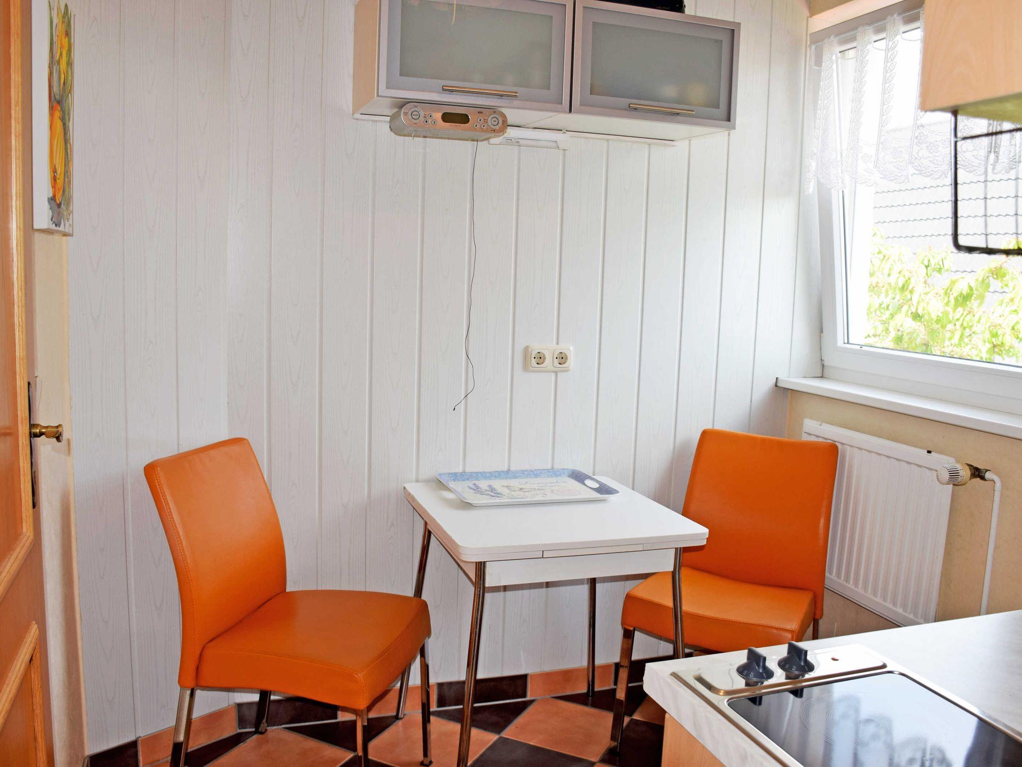 In der separaten Küche stehen ein kleiner Esstisch mit Stühlen und eine Küchenzeile. Die Küchenzeile ist mit einem Herd, Mikrowelle, Wasserkocher, Kaffeemaschine, Toaster, Spüle und Kühlschrank ausgestattet.