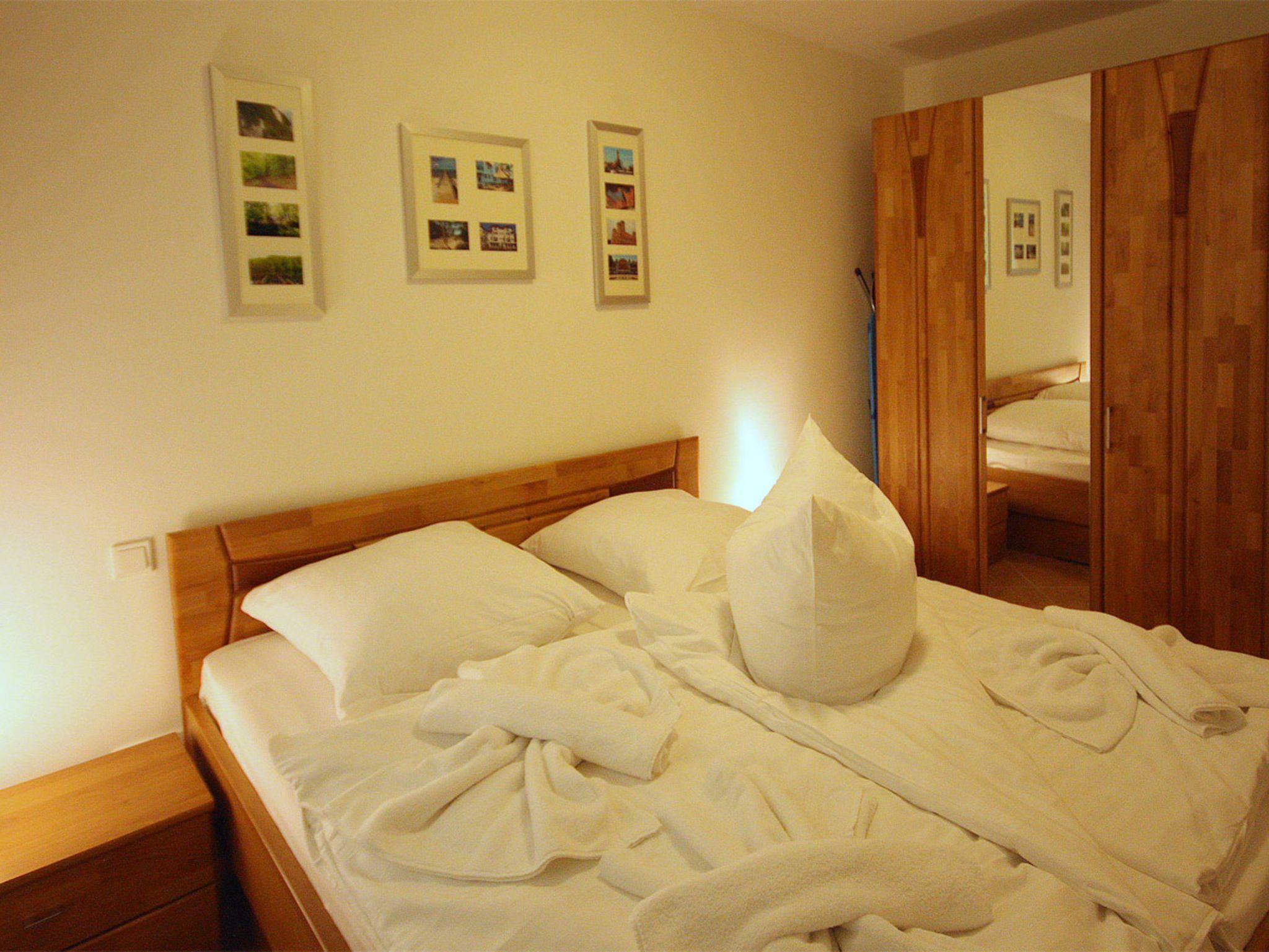 Der Wohn-/Essbereich ist mit einem Fernseher, einem CD- und DVD-Player, Radio und WLAN sowie einem Schlafsofa ausgestattet. Dort können ein dritter Erwachsener oder zwei Kinder bis 12 Jahren übernachten. Im separaten Schlafzimmer befindet sich ein extralanges Doppelbett (2,20 x 1,80) mit einem weiteren Fernseher und einem Kleiderschrank.