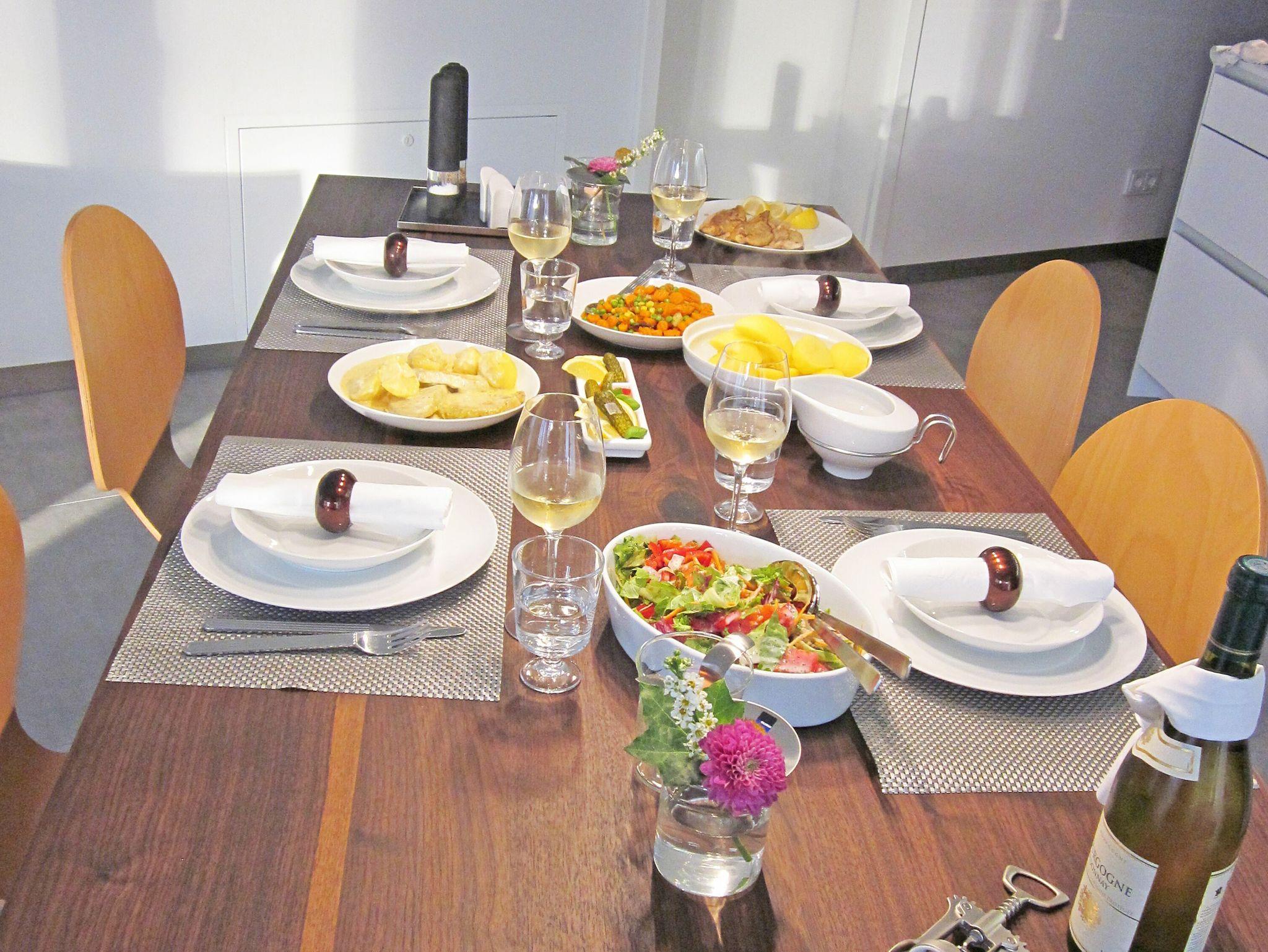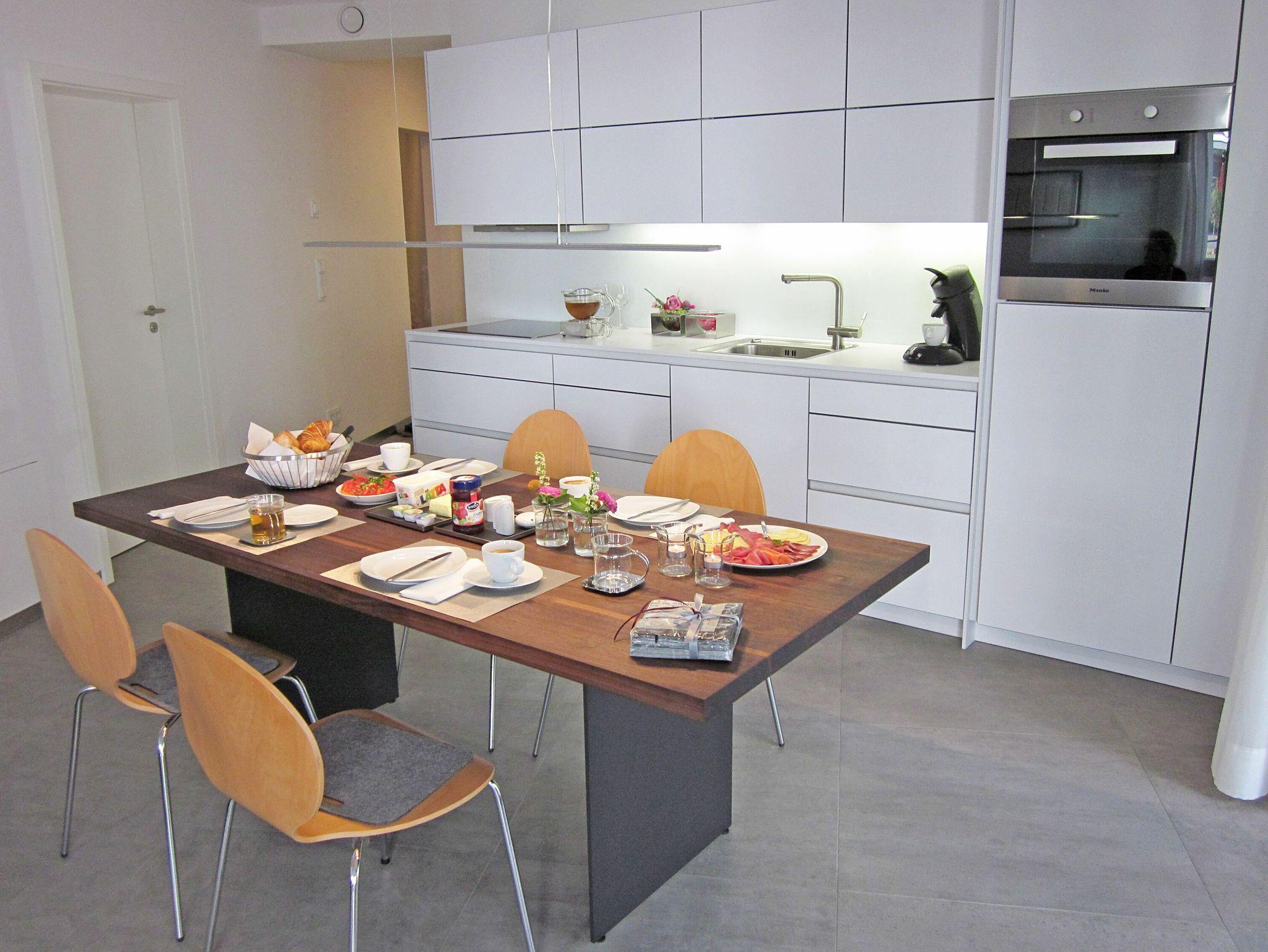 Die moderne Küche mit dem großen Esstisch lädt zum gemeinsamen Kochen auch mit Freunden ein. Zur Ausstattung gehören ein Kühlschrank mit Gefrierfach, Geschirrspüler, Induktionskochfeld, Backofen, Mikrowelle und diverse Kleingeräte.