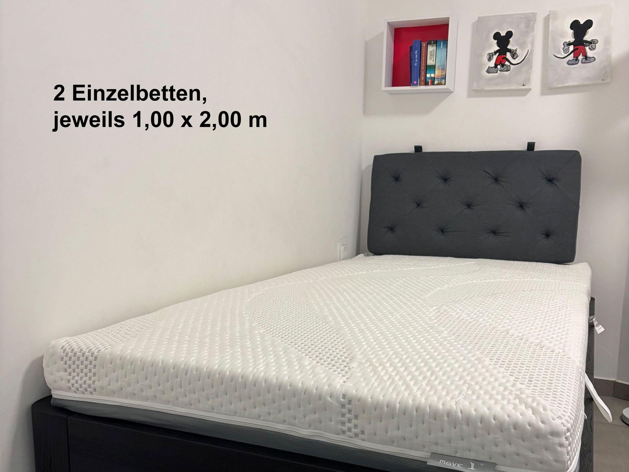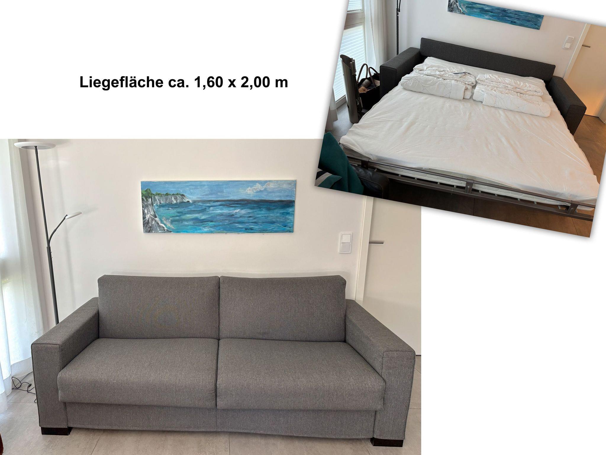 Zur Verfügung stehen zwei Bäder mit jeweils großen ebenerdigen Duschen, zwei Schlafzimmer mit Fernsehern und einem Doppelbett bzw. zwei Einzelbetten (1,00m x 2,00m). Im Wohnbereich bietet ein Schlafsofa (1,60 x 2,00 m) eine zusätzliche Übernachtungsmöglichkeit für weitere zwei Gäste.