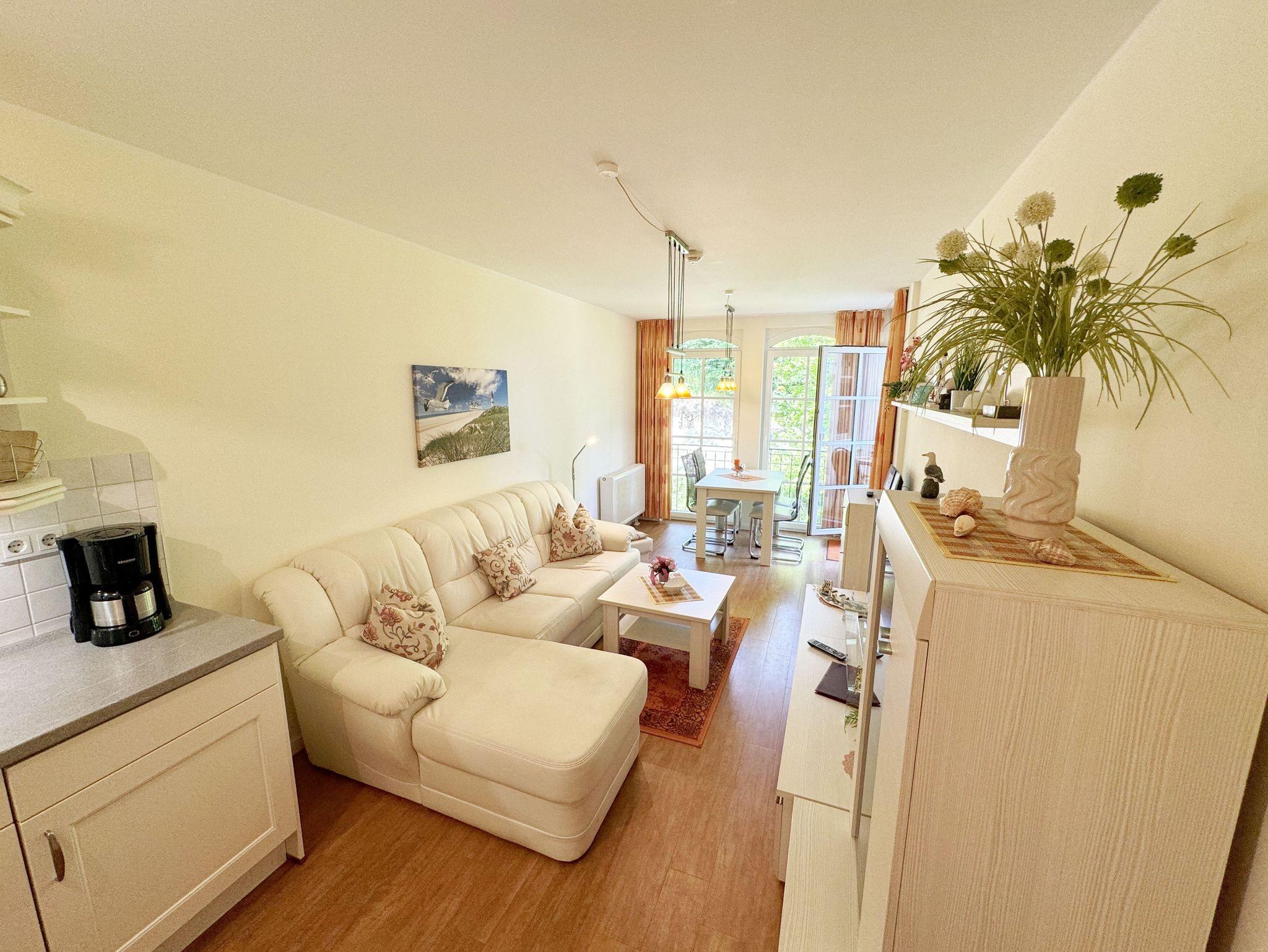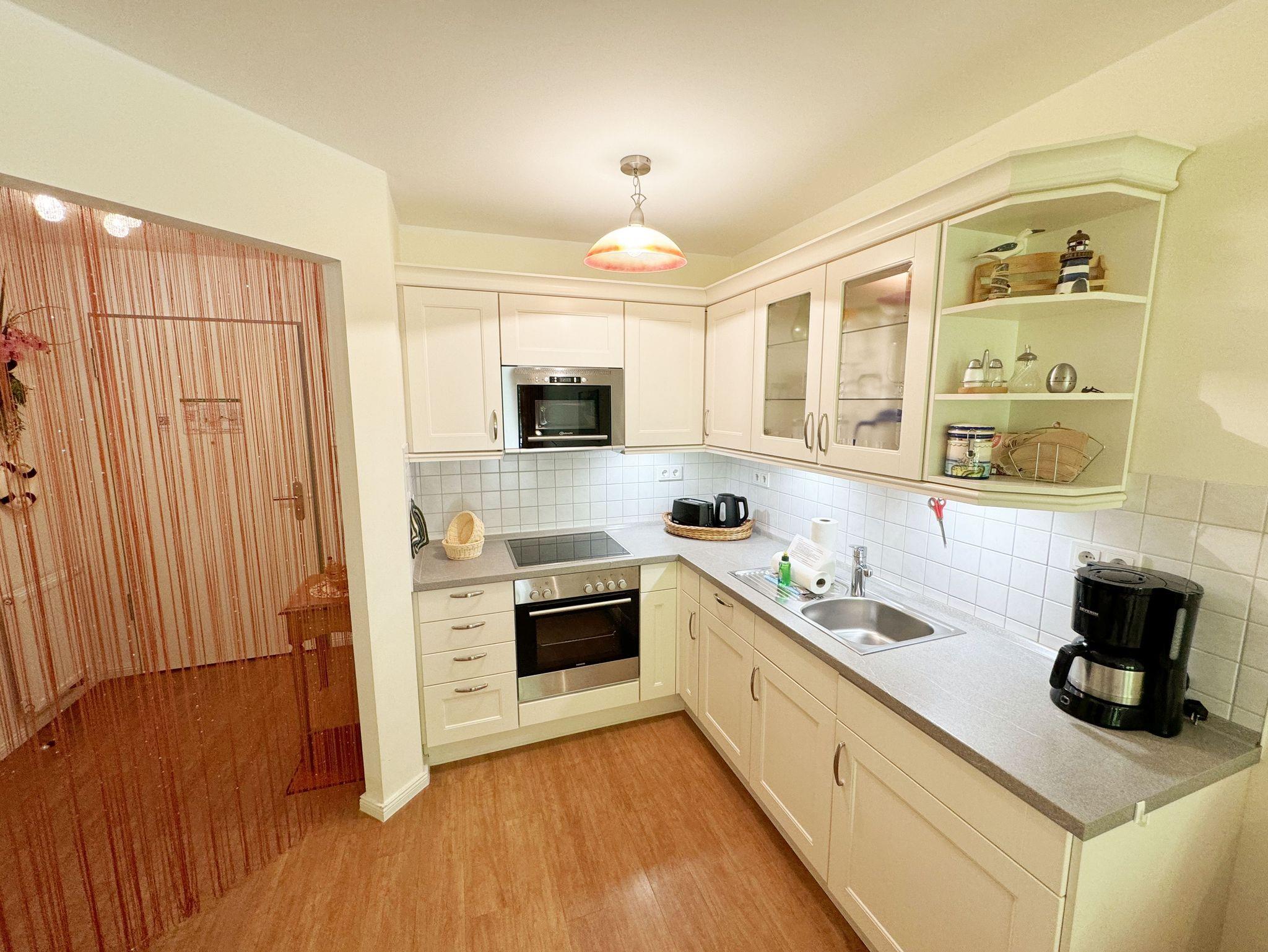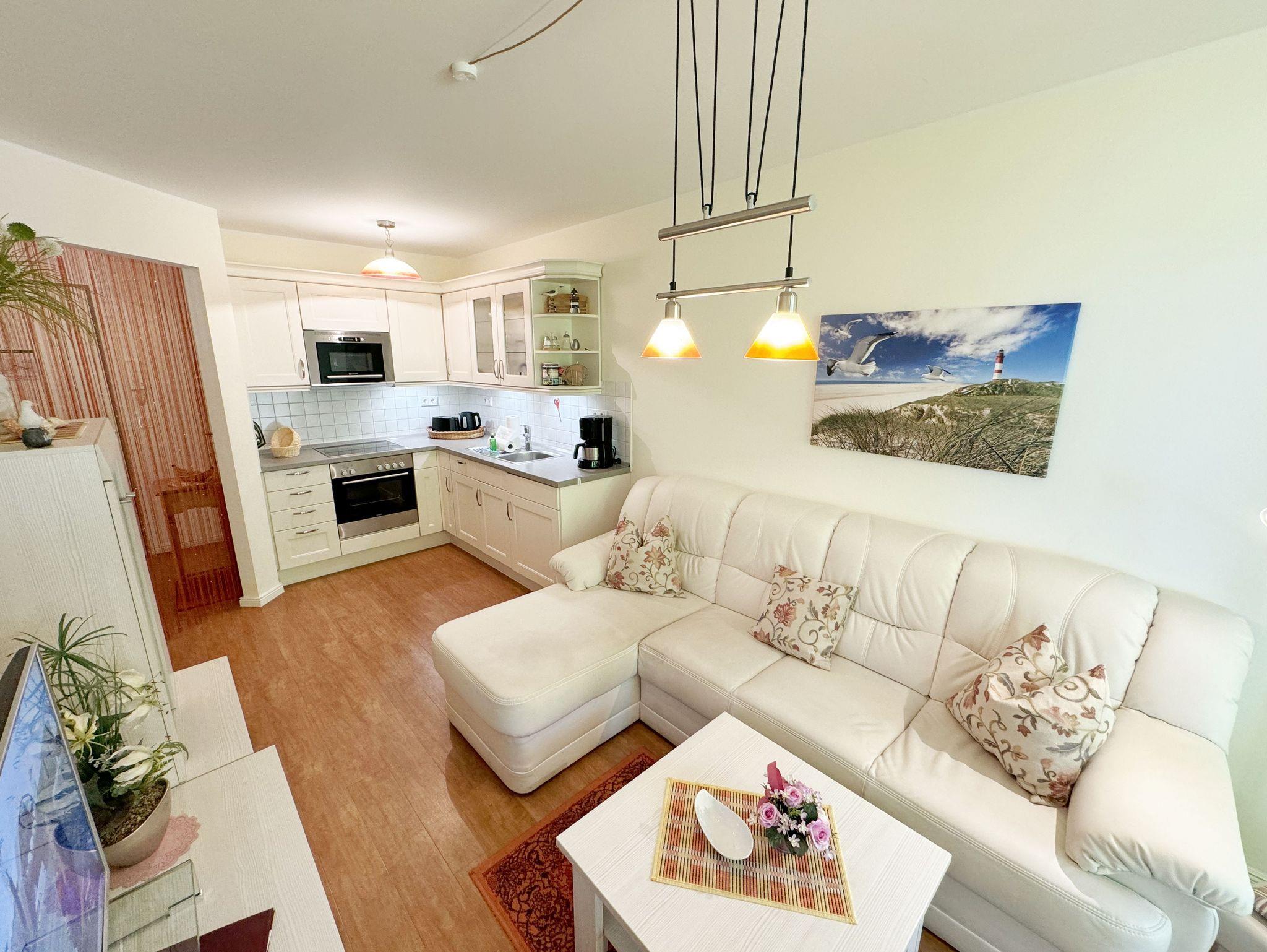Die Nichtraucher/Ferienwohnung Strandoase (A.1.21) ist mit viel Liebe zum Detail ausgestattet und eingerichtet worden. Sie wohnen in einer ca. 42 qm 2-Zimmer Wohnung, die für max. 2 Personen ausgelegt ist. Die Wohnung Strandoase befindet sich in der 1. Etage und ist bequem per Fahrstuhl von der Tiefgarage zu erreichen. In der Wohnung finden Sie einen kombinierten Wohn/Koch- und Essbereich. Die integrierte Küchenzeile lässt mit Mikrowelle, Backofen, Ceranfeld, Spülmaschine, Kühlschrank mit Gefrierfach, Kaffeemaschine, Toaster, Wasserkocher und anderen praktischen Helfern keine Wünsche offen. Im Wohnbereich ist weiterhin eine Essecke, eine gemütliche Couch sowie ein Smart-TV, DVD-Player und ein Radio mit CD und eine Leselampe. Ein Internetanschluss (WLAN/LAN) ist für Sie inklusive. Der Balkon ist vom Wohn/Essbereich begehbar und komplett möbliert. Von hier aus schauen Sie in Richtung Kiefern und Dünen. Drei große bis zum Boden reichende Glastüren/fenster geben dem Zimmer eine besondere Note. Das Schlafzimmer ist mit einem Boxspringbett (1,80m x 2,00m), Ablagefläche und einem Kleiderschrank und Insektenschutzgitter ausgestattet. Das Bad verfügt über eine ebenerdige Dusche, Waschbecken, WC, Kosmetikspiegel, Haarfön und Handtuchheizkörper. Eine kleine Abstellkammer finden Sie im Flurbereich. Ein eigener PKW-Stellplatz (Nr. 29, Einfahrtshöhe 2,00m) befindet sich in der Tiefgarage des Hauses. Im Keller des Hauses haben Sie die Möglichkeit eine Waschmaschine/Trockner gegen Gebühr zu nutzen. Mit dem Fahrstuhl des Hauses A gelangen sie in das Untergeschoss der Meeresblickanlage, wo Sie ein großzügiger und heller Wellnessbereich erwartet. Hier können sie in einem Pool kleine Bahnen schwimmen, in 2 Saunen Ihren Kreislauf in Schwung bringen, in einem dazugehörigen Ruheraum Ihren Körper wieder beruhigen, in einer Schneckendusche sowie weiteren Duschen das kühle Nass genießen und auf einer Außenterrasse mit Außendusche die frische Luft einatmen. Die Erstausstattung von einem Wäschepaket (die komplette Bettwäsche, 2 kleine Handtücher, 1 Duschhandtuch) ist im Mietpreis ab 7 Nächte pro Person inbegriffen. Bei einer Belegung unter 7 Nächten können Sie diese durch Eigenmitnahme ergänzen bzw. bis 14 Tage vor Anreise gegen einen Aufpreis dazu buchen. Ab 2 gebuchten Paketen erhalten Sie einmalig 1 Geschirrhandtuch und 1 Duschvorleger hinzu. Haustiere sind nicht erlaubt.
