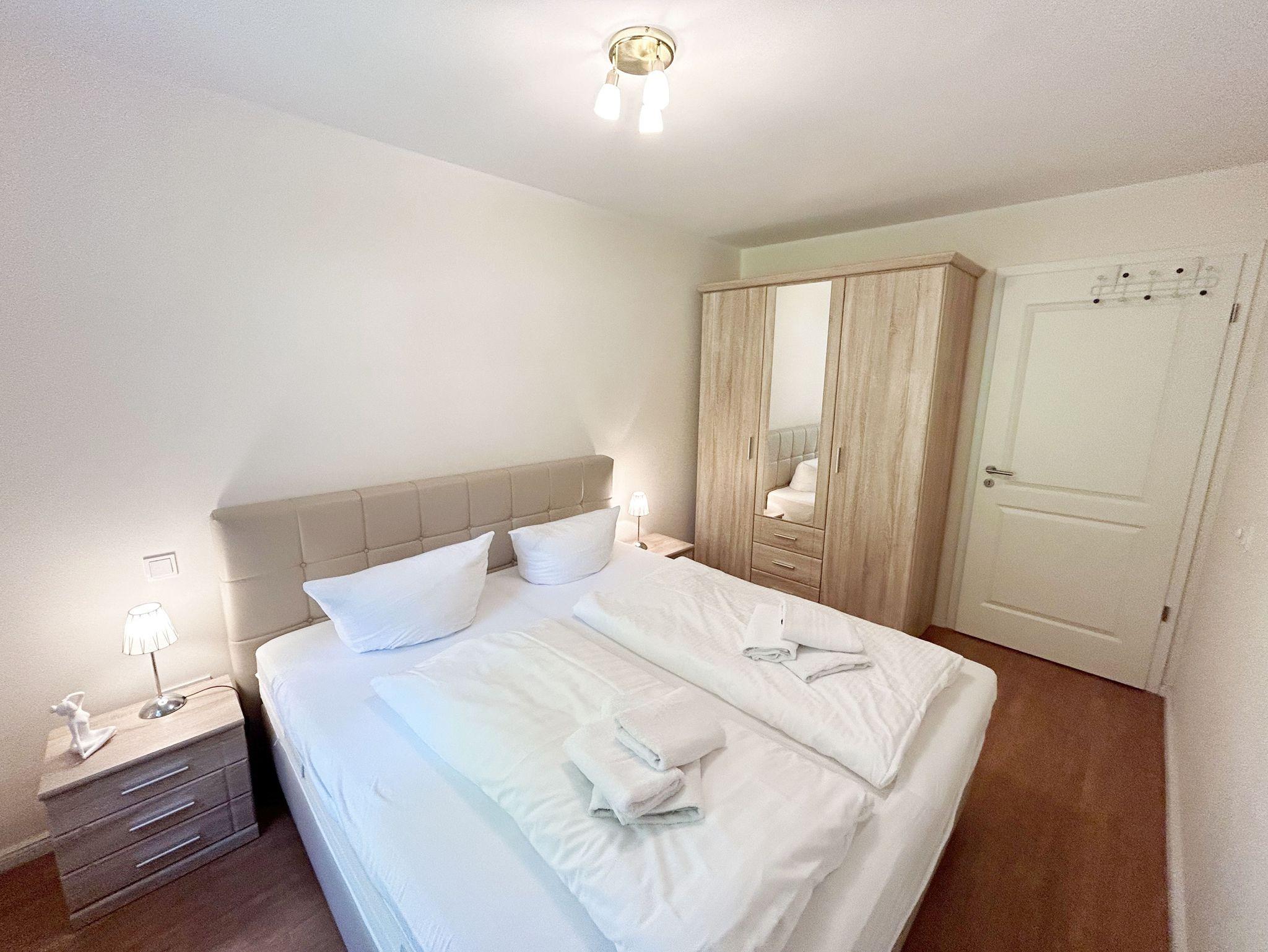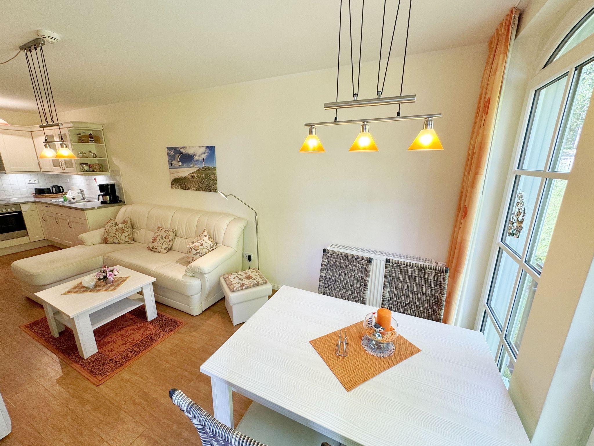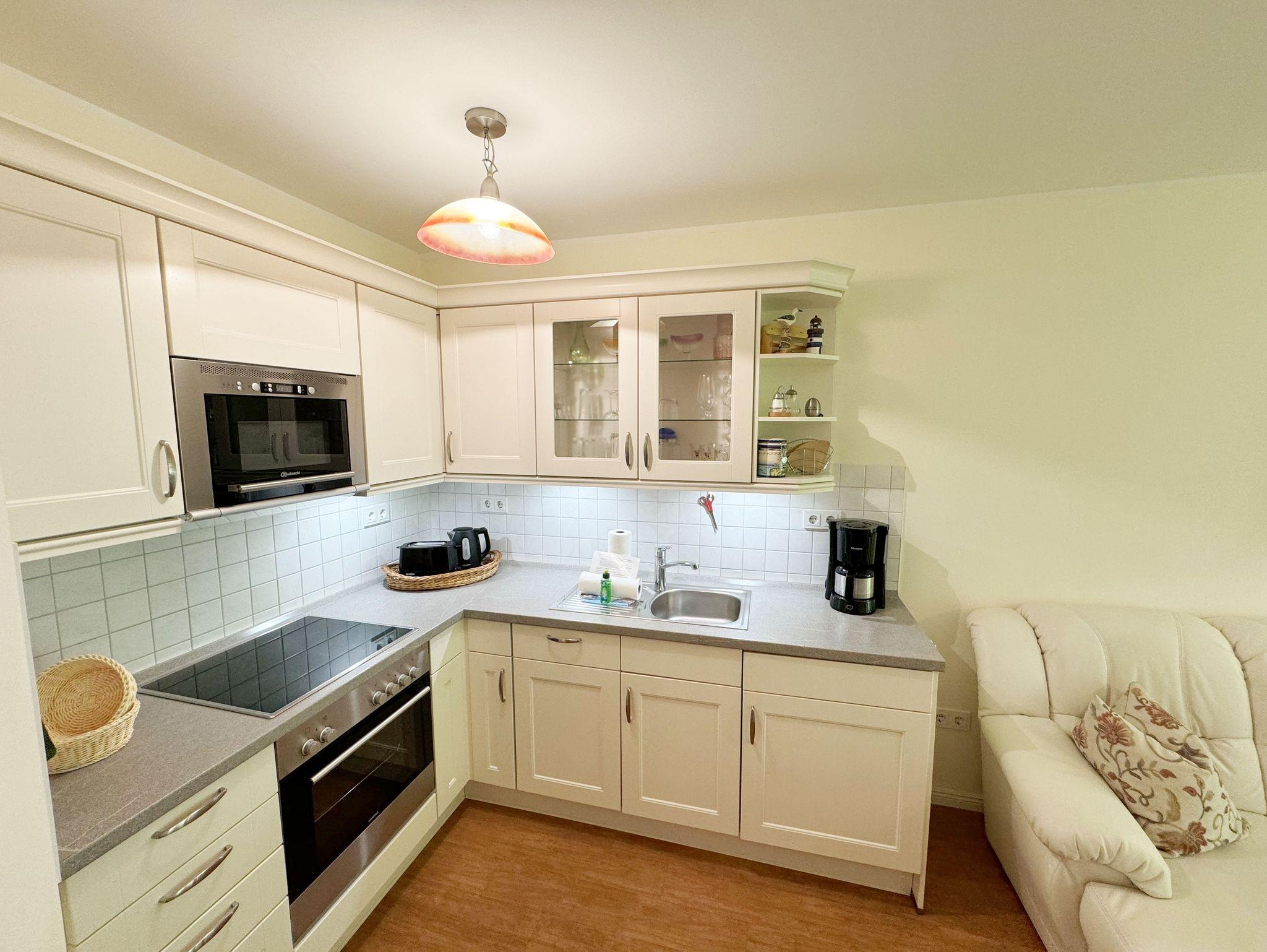 Die Nichtraucher/Ferienwohnung Strandoase (A.1.21) ist mit viel Liebe zum Detail ausgestattet und eingerichtet worden. Sie wohnen in einer ca. 42 qm 2-Zimmer Wohnung, die für max. 2 Personen ausgelegt ist. Die Wohnung Strandoase befindet sich in der 1. Etage und ist bequem per Fahrstuhl von der Tiefgarage zu erreichen. In der Wohnung finden Sie einen kombinierten Wohn/Koch- und Essbereich. Die integrierte Küchenzeile lässt mit Mikrowelle, Backofen, Ceranfeld, Spülmaschine, Kühlschrank mit Gefrierfach, Kaffeemaschine, Toaster, Wasserkocher und anderen praktischen Helfern keine Wünsche offen. Im Wohnbereich ist weiterhin eine Essecke, eine gemütliche Couch sowie ein Smart-TV, DVD-Player und ein Radio mit CD und eine Leselampe. Ein Internetanschluss (WLAN/LAN) ist für Sie inklusive. Der Balkon ist vom Wohn/Essbereich begehbar und komplett möbliert. Von hier aus schauen Sie in Richtung Kiefern und Dünen. Drei große bis zum Boden reichende Glastüren/fenster geben dem Zimmer eine besondere Note. Das Schlafzimmer ist mit einem Boxspringbett (1,80m x 2,00m), Ablagefläche und einem Kleiderschrank und Insektenschutzgitter ausgestattet. Das Bad verfügt über eine ebenerdige Dusche, Waschbecken, WC, Kosmetikspiegel, Haarfön und Handtuchheizkörper. Eine kleine Abstellkammer finden Sie im Flurbereich. Ein eigener PKW-Stellplatz (Nr. 29, Einfahrtshöhe 2,00m) befindet sich in der Tiefgarage des Hauses. Im Keller des Hauses haben Sie die Möglichkeit eine Waschmaschine/Trockner gegen Gebühr zu nutzen. Mit dem Fahrstuhl des Hauses A gelangen sie in das Untergeschoss der Meeresblickanlage, wo Sie ein großzügiger und heller Wellnessbereich erwartet. Hier können sie in einem Pool kleine Bahnen schwimmen, in 2 Saunen Ihren Kreislauf in Schwung bringen, in einem dazugehörigen Ruheraum Ihren Körper wieder beruhigen, in einer Schneckendusche sowie weiteren Duschen das kühle Nass genießen und auf einer Außenterrasse mit Außendusche die frische Luft einatmen. Die Erstausstattung von einem Wäschepaket (die komplette Bettwäsche, 2 kleine Handtücher, 1 Duschhandtuch) ist im Mietpreis ab 7 Nächte pro Person inbegriffen. Bei einer Belegung unter 7 Nächten können Sie diese durch Eigenmitnahme ergänzen bzw. bis 14 Tage vor Anreise gegen einen Aufpreis dazu buchen. Ab 2 gebuchten Paketen erhalten Sie einmalig 1 Geschirrhandtuch und 1 Duschvorleger hinzu. Haustiere sind nicht erlaubt.