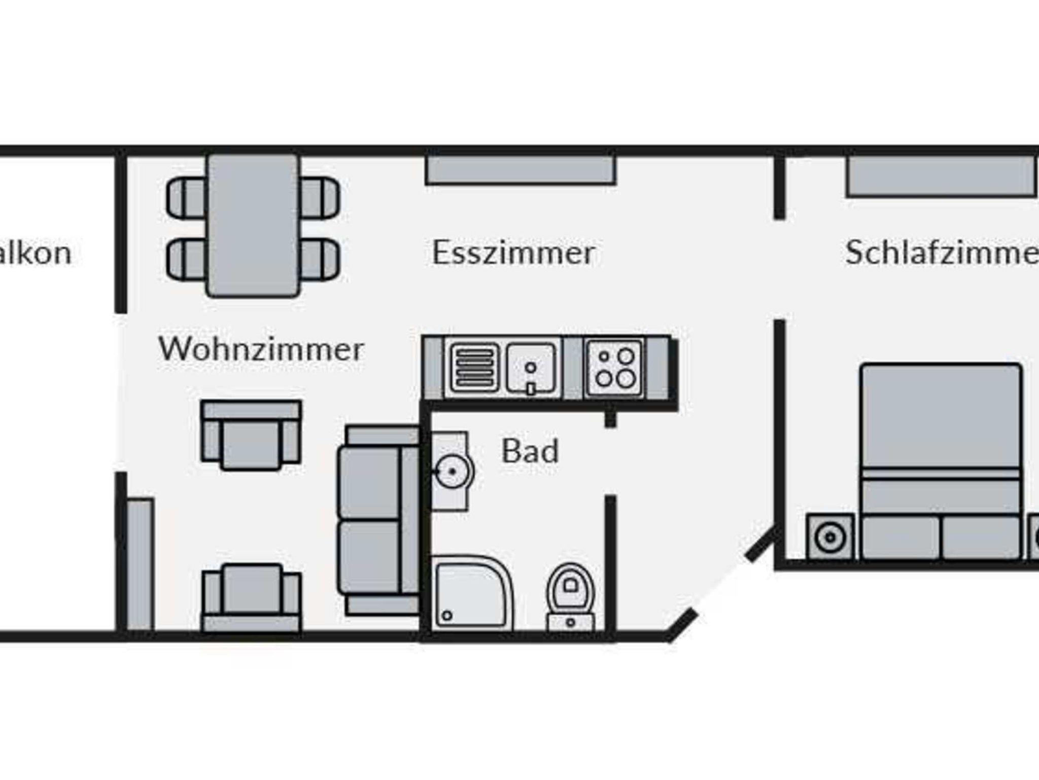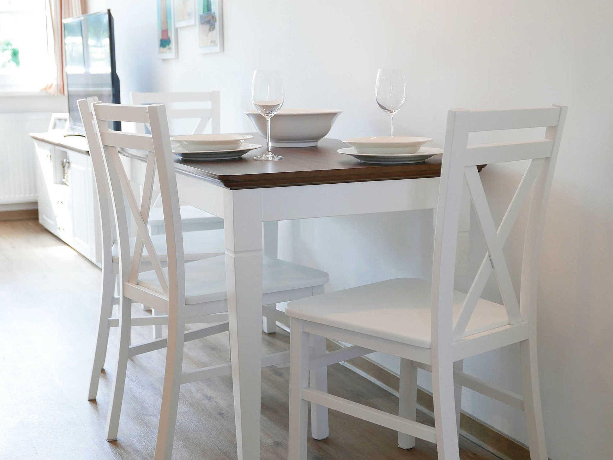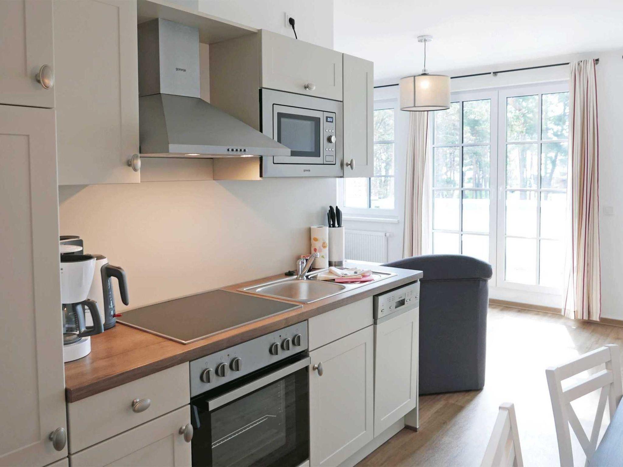 Der Wohnbereich ist außerdem mit einem Ess- sowie Küchenbereich ausgestattet. Damit Sie in der Ferienwohnung kochen können, ist die Küche mit allem Nötigen versehen, etwa einer Geschirrspülmaschine sowie einem Backofen.