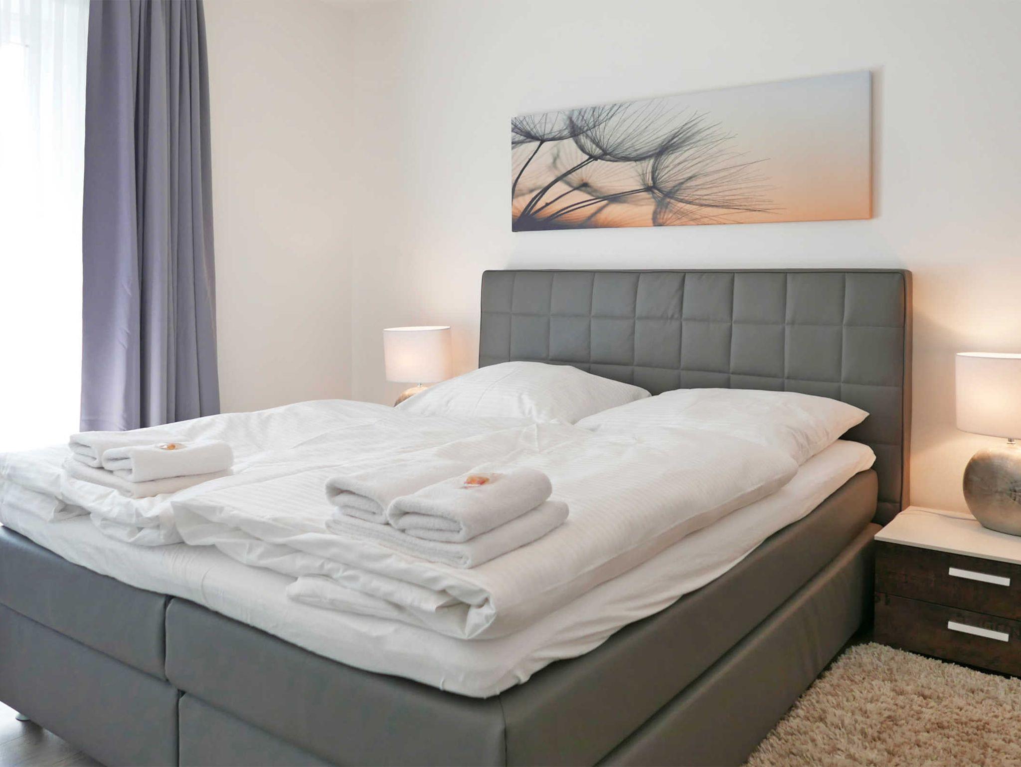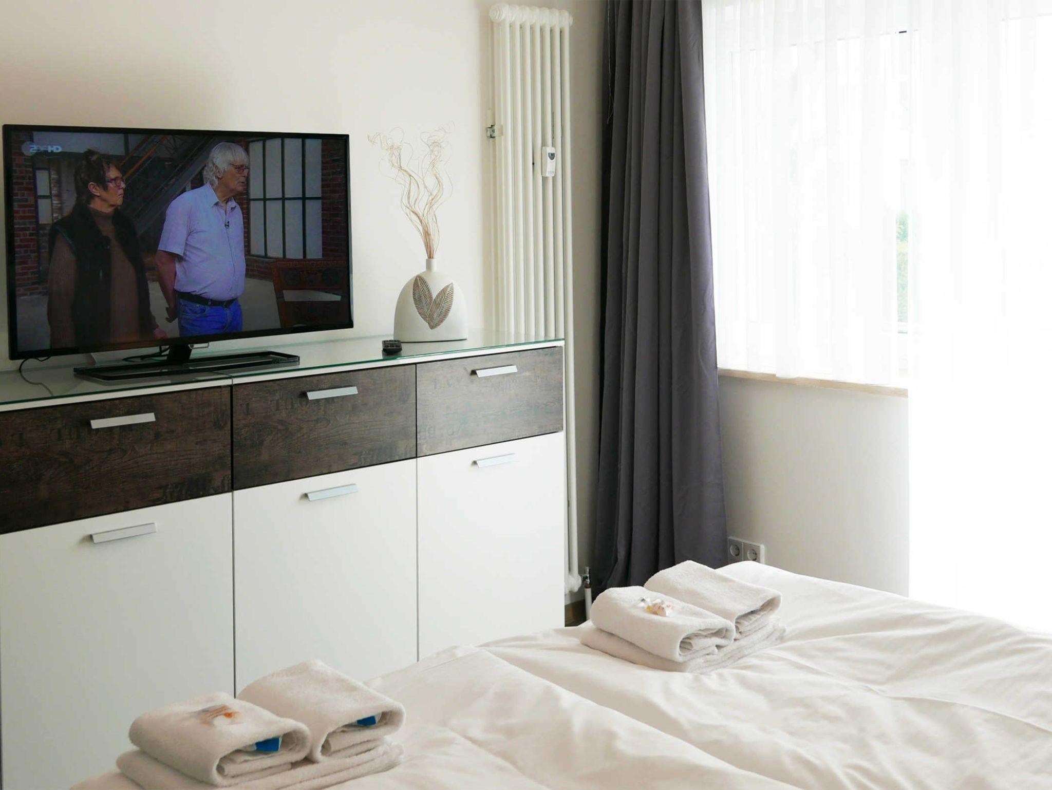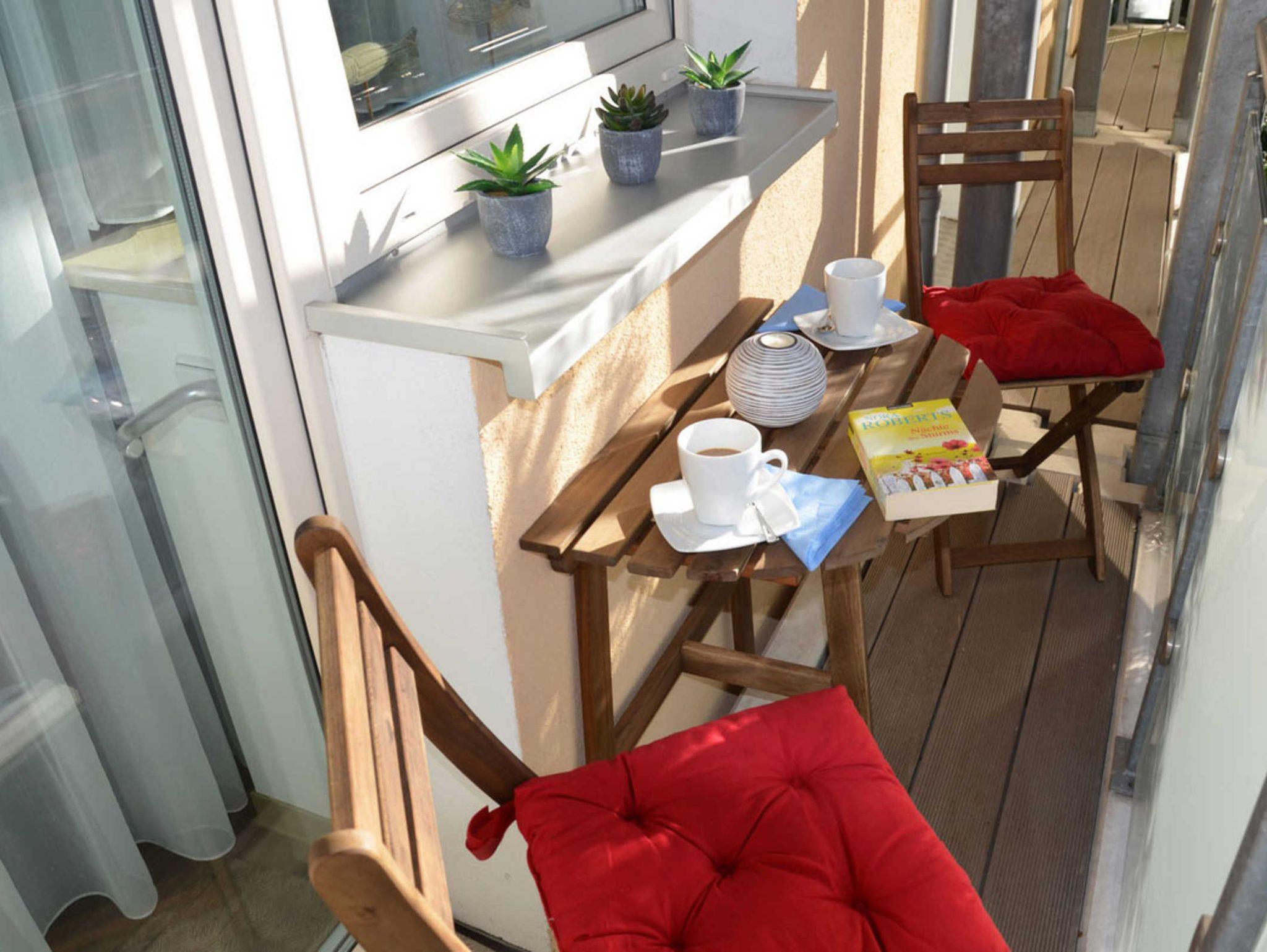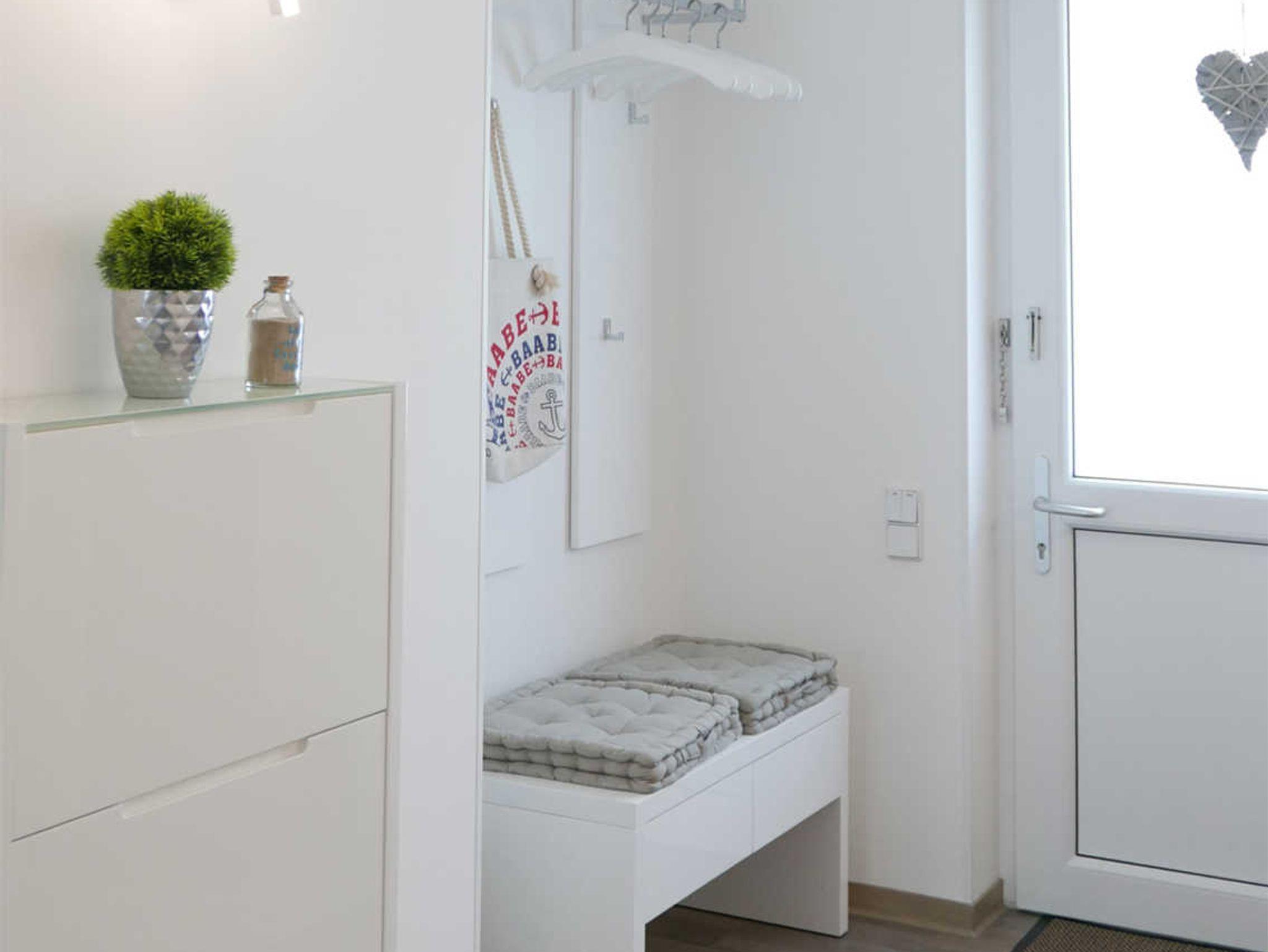 Modern eingerichtete Ferienwohnung in der 1. Etage mit Balkon in strandnähe. Das Schlafzimmer ist mit einem hochwertigem Boxspringbett (180x200cm) ausgestattet und verfügt zusätzlich über einen großen Fernseher. In dem Wohnzimmer finden Sie zum einen den ansprechenden Sofabereich mit großzügigem Flachbildfernseher, zum anderen einen Esstisch, der je nach belieben vergrößert werden kann. Das Sofa kann auf 180x200 oder einzeln zu 90x200 ausgezogen werden. In der Küchenzeile befindet sich ein Backofen, Herd, Kühlschrank mit Gefrierfach, Geschirrspülmaschine, Kaffeemaschine, Toaster, Wasserkocher und Mixer. Die Dusche im Bad ist ebenerdig. Auf dem Balkon befinden sich zwei Stühle und ein Tisch.