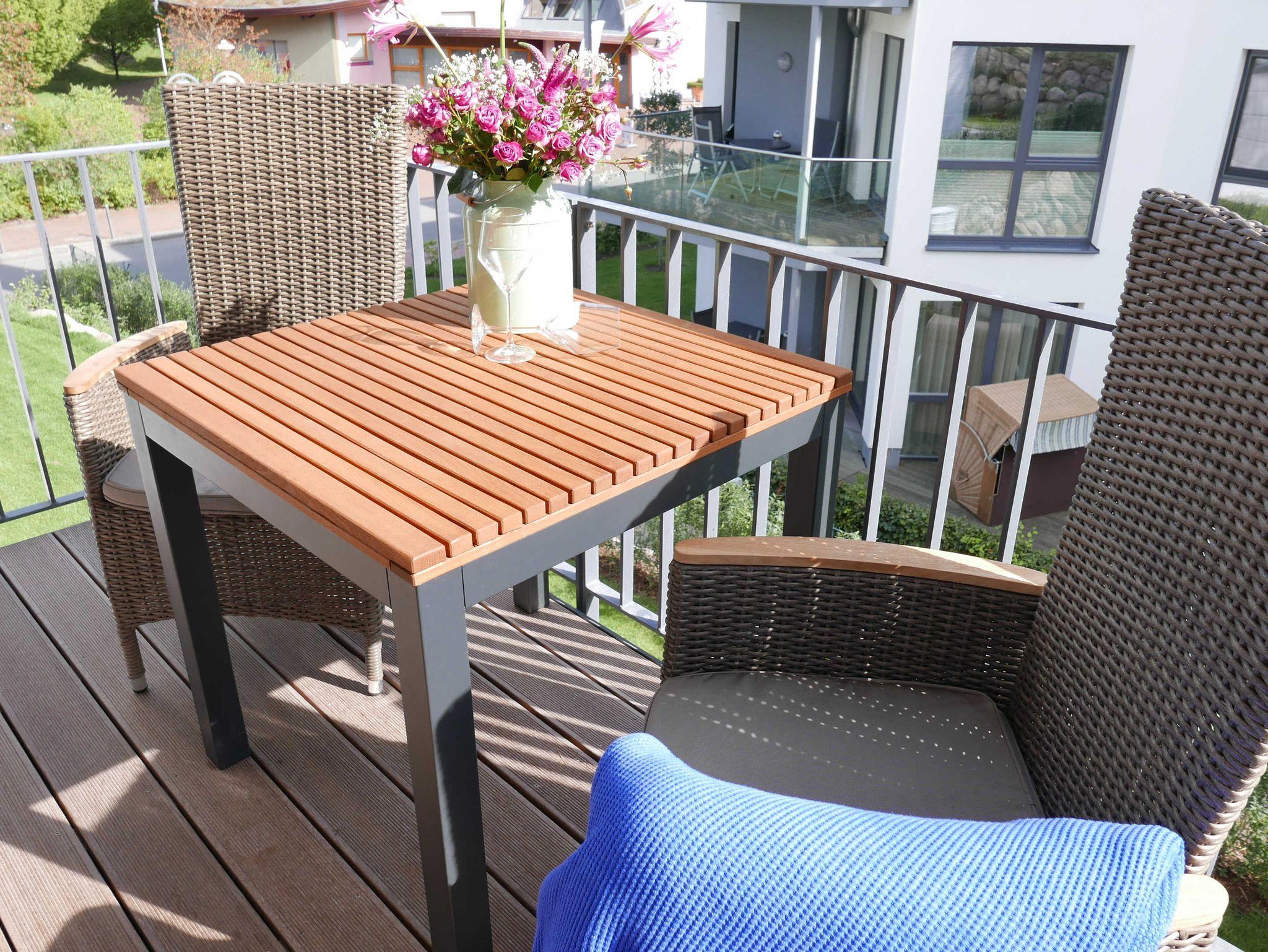 Zur Wohnung gehört auch ein Balkon mit 4 Stühlen und einem kleinen Tisch.