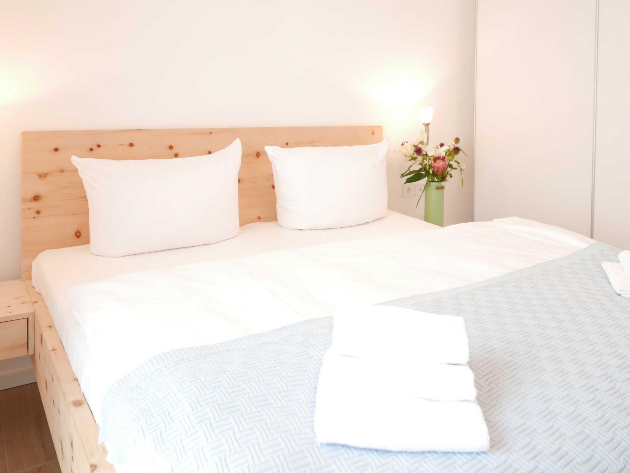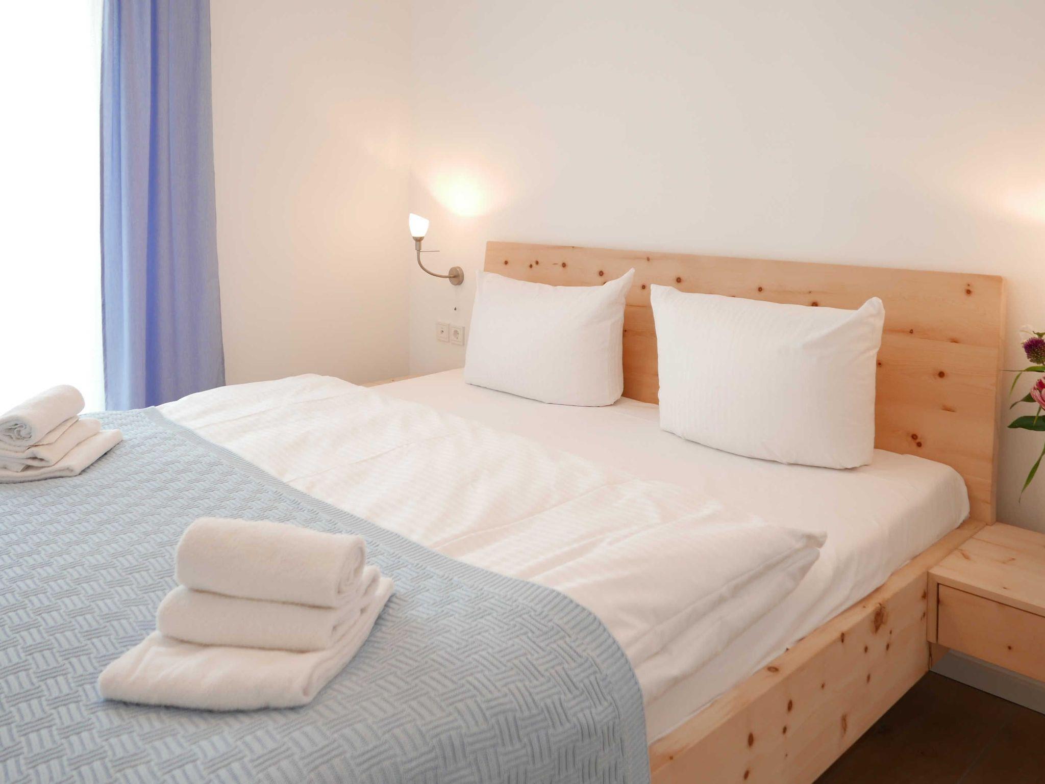 Im Schlafzimmer sorgt ein Doppelbett, Zirbenbett mit Naturlatexmatrazen 180 x 200 cm, für erholsamen Schlaf.