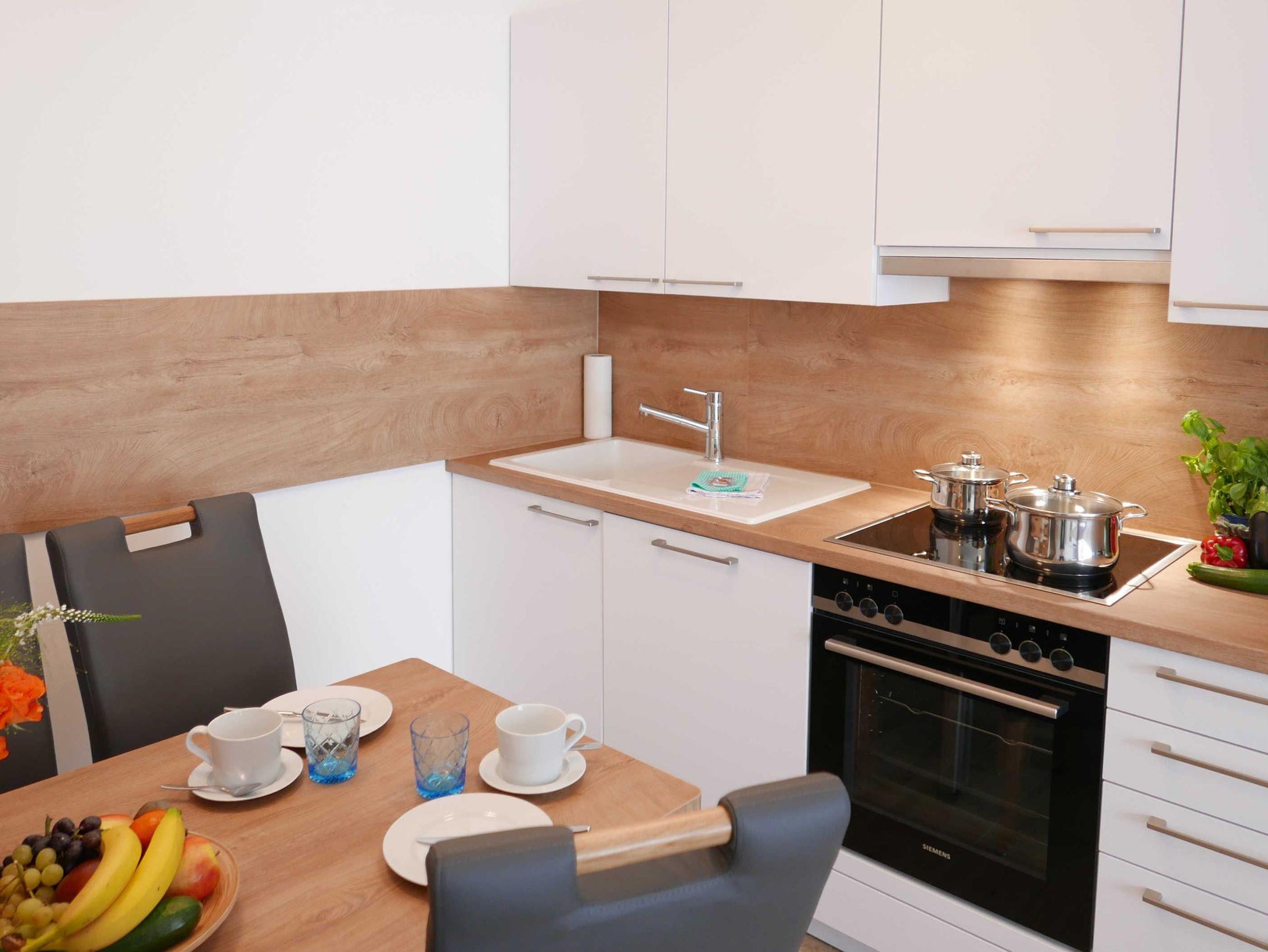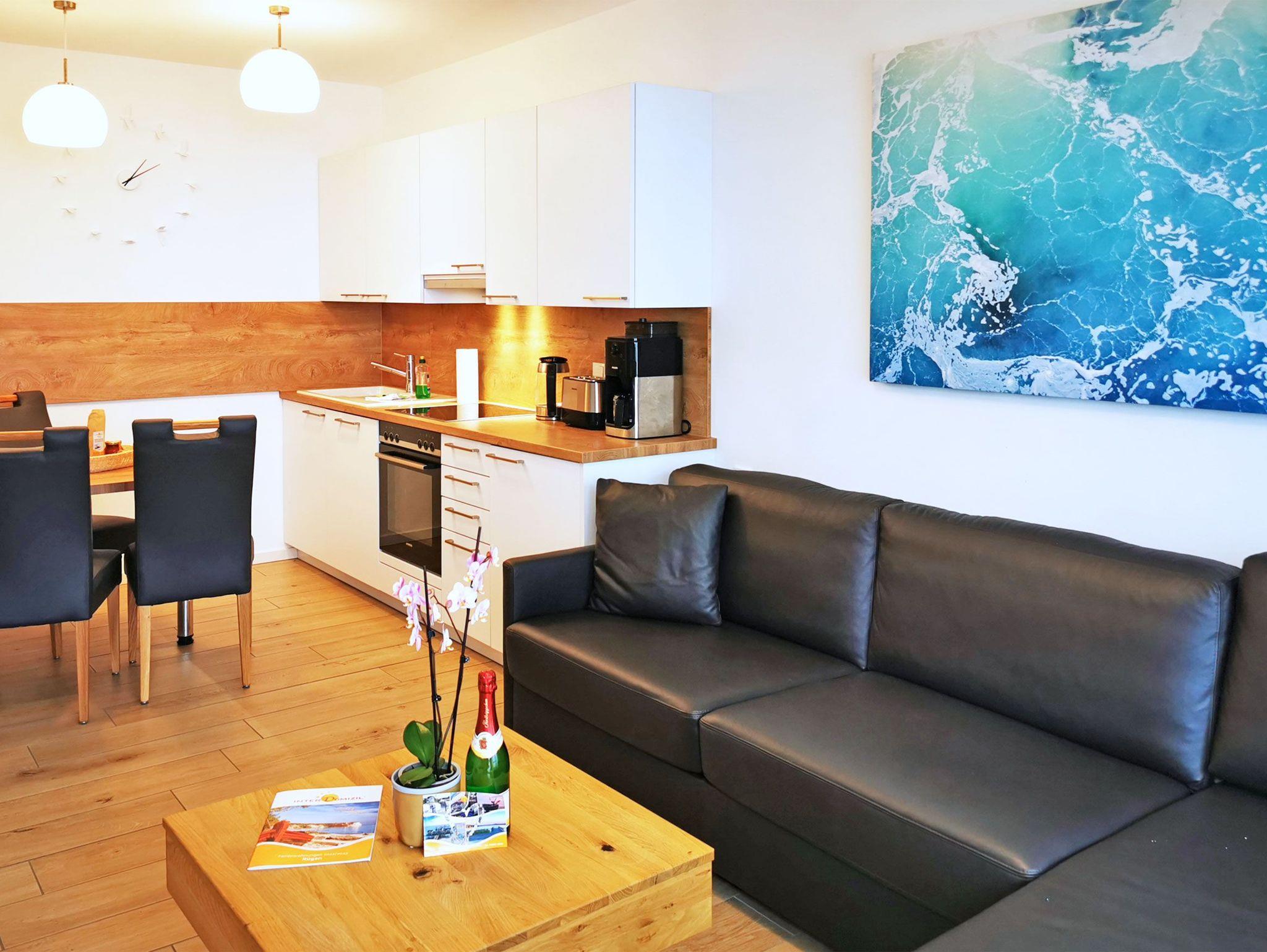 Der helle und offene Wohnbereich ist gemütlich und hochwertig mit Fernseher, Blu-ray Player und Schlafsofa 160 x 200cm eingerichtet. Bücher und Gesellschaftsspiele bieten die Möglichkeit für entspannte Abende. Die integrierte Küchenzeile (verlängert auf 2,8 m) ist gut ausgestattet mit 4-Platten-Ceranherd, Kühlschrank (inkl. Gefrierfach), Backofen, Geschirrspülmaschine, Kaffeemaschine, Toaster und Wasserkocher.