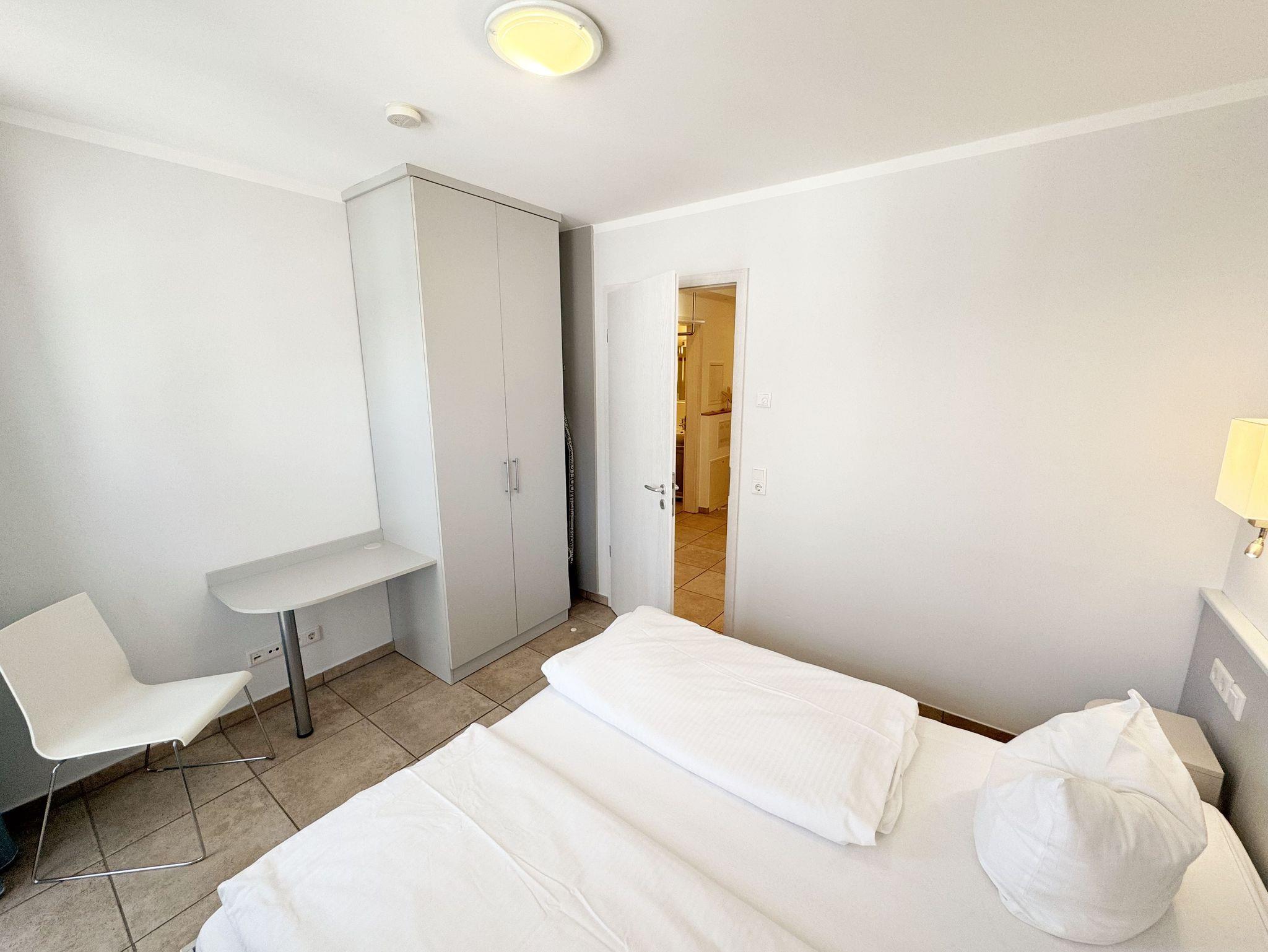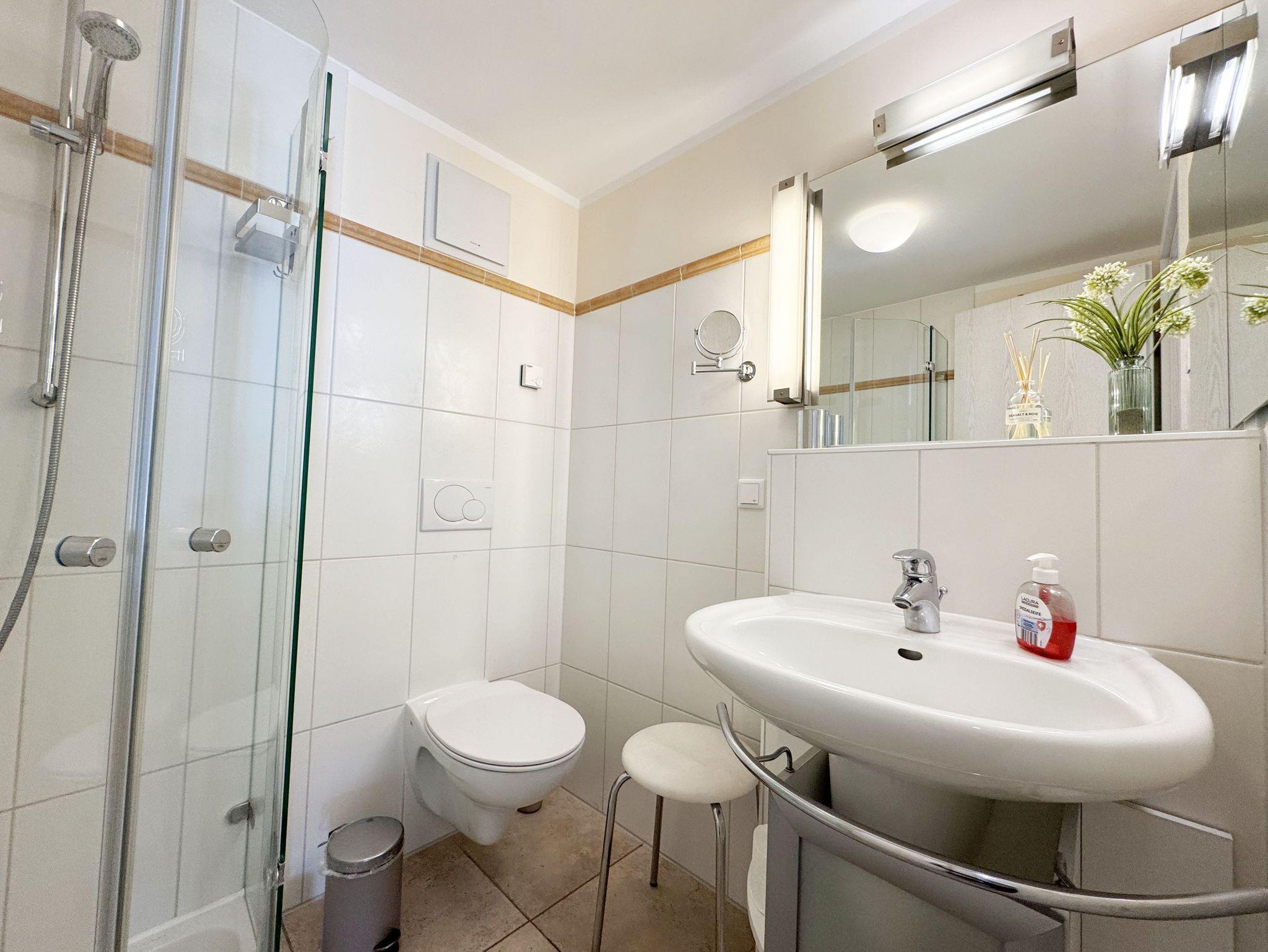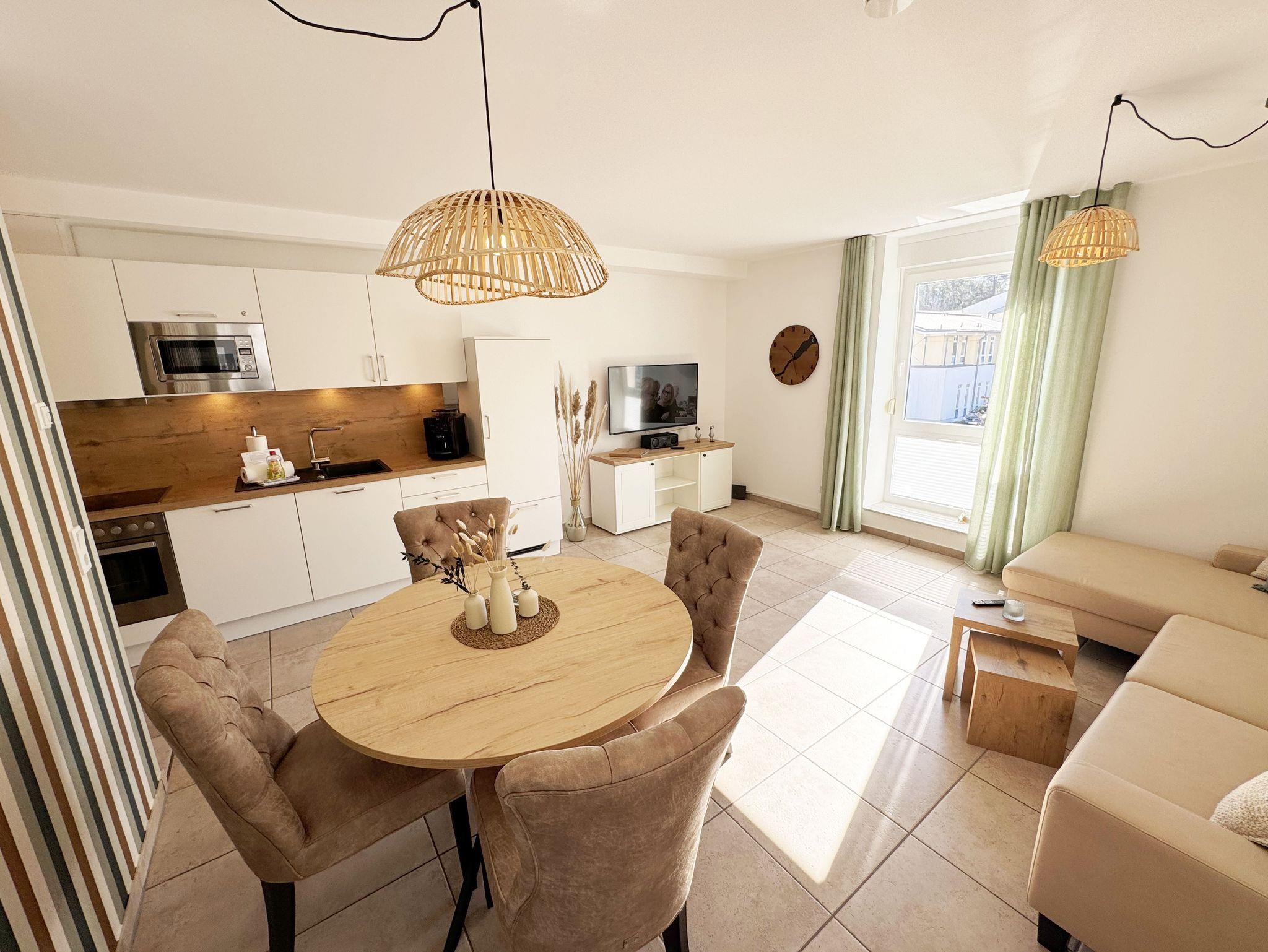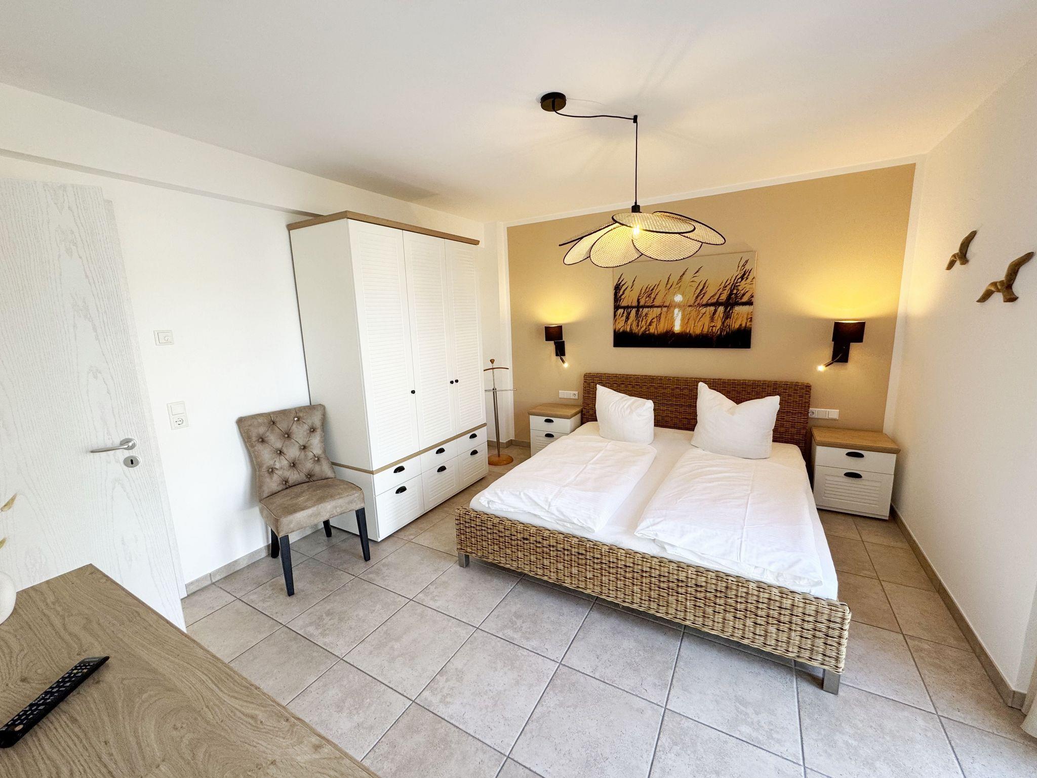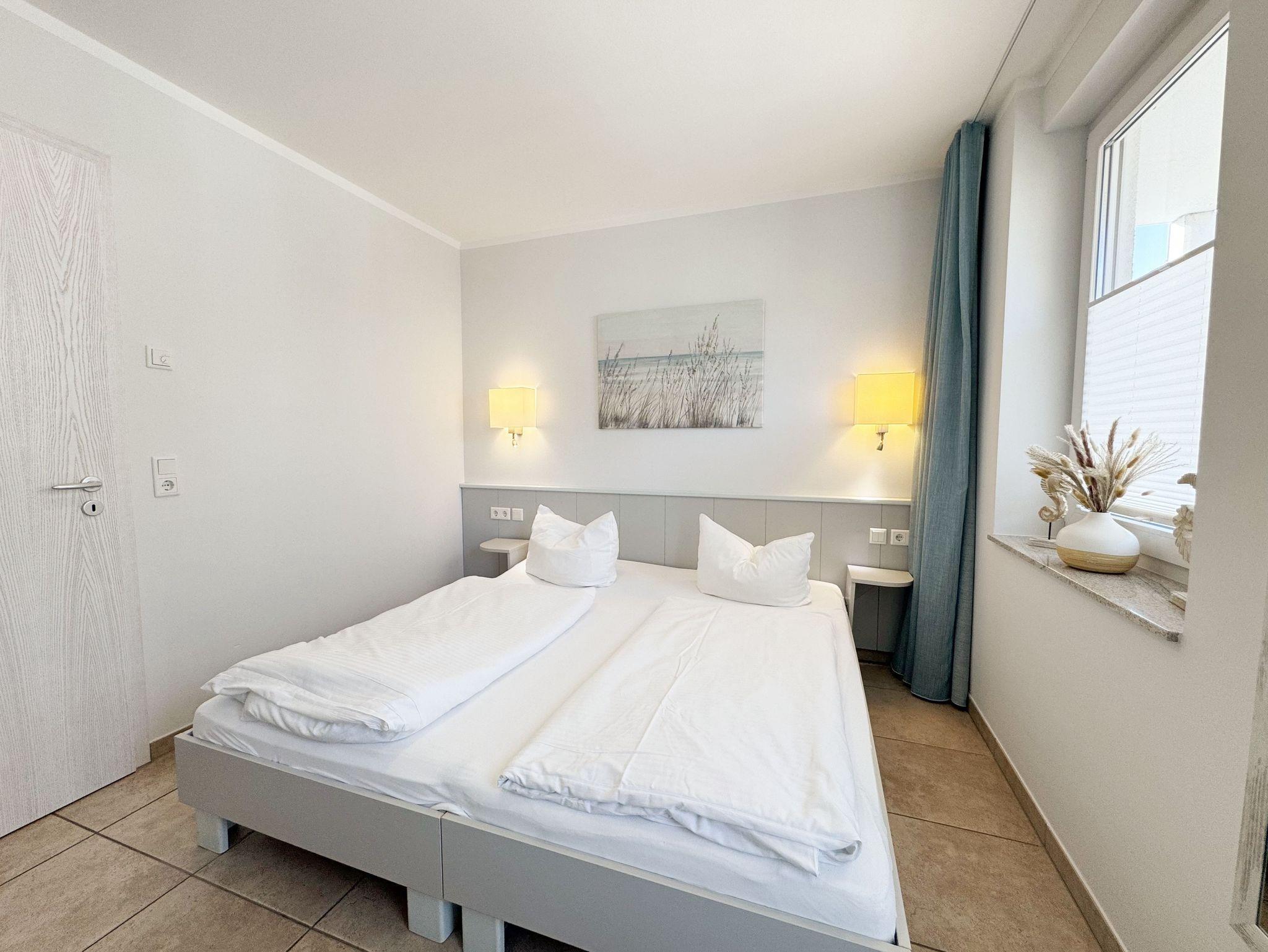 Sie wohnen auf ca. 70 m² in einer 3-Raum-Ferienwohnung für max. 2 bis 4 Personen. Die Nichtraucherferienwohnung befindet sich in der Villa Salus, in der 1. Etage. Der Eingangsbereich ist mit einer Garderobe, einem Ganzkörperspiegel und einer Sitzbank versehen. Von hier gelangen Sie in den Wohn-/Essbereich, der Ihnen mit seinen bodentiefen Fenstern eine helle und lichtdurchflutete Atmosphäre bietet. Der gemütliche Wohnbereich bietet Ihnen eine Couch, einen Couchtisch, beleuchtete Vitrine, ein TV-Board mit Smart-TV und ein Sky Angebot wie Serien, Blockbuster-Filmen sowie Live-Sport. Ein DAB-CD-Radio mit USB-Anschluss und ein WLAN-Zugang runden den technischen Bereich ab. Von hier gelangen Sie auf Ihren bestuhlten Balkon (West) mit Sonnenschirm. Die angrenzende Küchenzeile ist mit einem Backofen, einem Ceranfeld, einer Mikrowelle, einer Spülmaschine, einem Kühlschrank mit Gefrierfach, einer Kaffeemaschine, einem Wasserkocher, einem Toaster, einem Mixer, einem Pürierstab sowie Küchenhelfern ausgestattet. Abgerundet wird der Bereich mit einem Esstisch. Das erste Schlafzimmer verfügt über ein Doppelbett (1,80m x 2,00m) mit Nachttischablagen, verstellbare Lattenroste, einen Ganzkörperspiegel, einen Kleiderschrank sowie ein Smart-TV. Von hier gelangen Sie direkt in eines der beiden Bäder, welches mit einer Dusche (flacher Einstieg), einem Waschplatz, einem WC, einem Handtuchheizkörper, einem Kosmetikspiegel, einem Fön und Fenster ausgestattet ist. Das zweite Schlafzimmer verfügt über ein Doppelbett (1,80m x 2,00m) mit Nachttischablagen, verstellbare Lattenroste, einen Ganzkörperspiegel, einen Kleiderschrank sowie einen Schreibtisch. Von hier haben Sie auch einen Zugang zu ihrem West-Balkon. In beiden Schlafzimmern sorgen Insektenschutzgitter für einen angenehmen Schlaf. Das 2. innenliegende Badezimmer erreichen Sie vom Flurbereich, welches ebenfalls mit einer Dusche (flacher Einstieg), einem Waschplatz, einem WC und einem Handtuchheizkörper ausgestattet ist. Für eine wohlige Wärme sorgt die in der gesamten Wohnung verlegte Fußbodenheizung. In der gesamten Wohnung können Sie sich über Außenrollläden freuen. Für unsere kleinen Gäste stehen ein Hochstuhl sowie ein Kinderreisebett (inklusive Zusatzmatratze) zur Verfügung. Reinigungsutensilien sowie ein Wäscheständer stehen Ihnen zusätzlich zur Verfügung. Haustiere sind nicht erlaubt. Ihre mitgebrachten oder auch geliehenen Fahrräder können Sie im zugehörigen eigenen Abstellraum im Erdgeschoss unterstellen. Hier können Sie auch eine Waschmaschine, einen Trockner sowie ein Bügelbrett und ein Bügeleisen nutzen. Ihr eigener Stellplatz (Nr. 04) befindet sich direkt hinter dem Haus. Die Erstausstattung eines Wäschepaketes (komplette Bettwäsche, 1 Duschhandtuch, 2 kleine Handtücher) können Sie bis 14 Tage vor Anreise gegen einen Aufpreis dazu buchen oder durch Eigenes ergänzen. Ab 2 gebuchten Paketen erhalten Sie einmalig 1 Geschirrhandtuch und 1 Duschvorleger hinzu.
