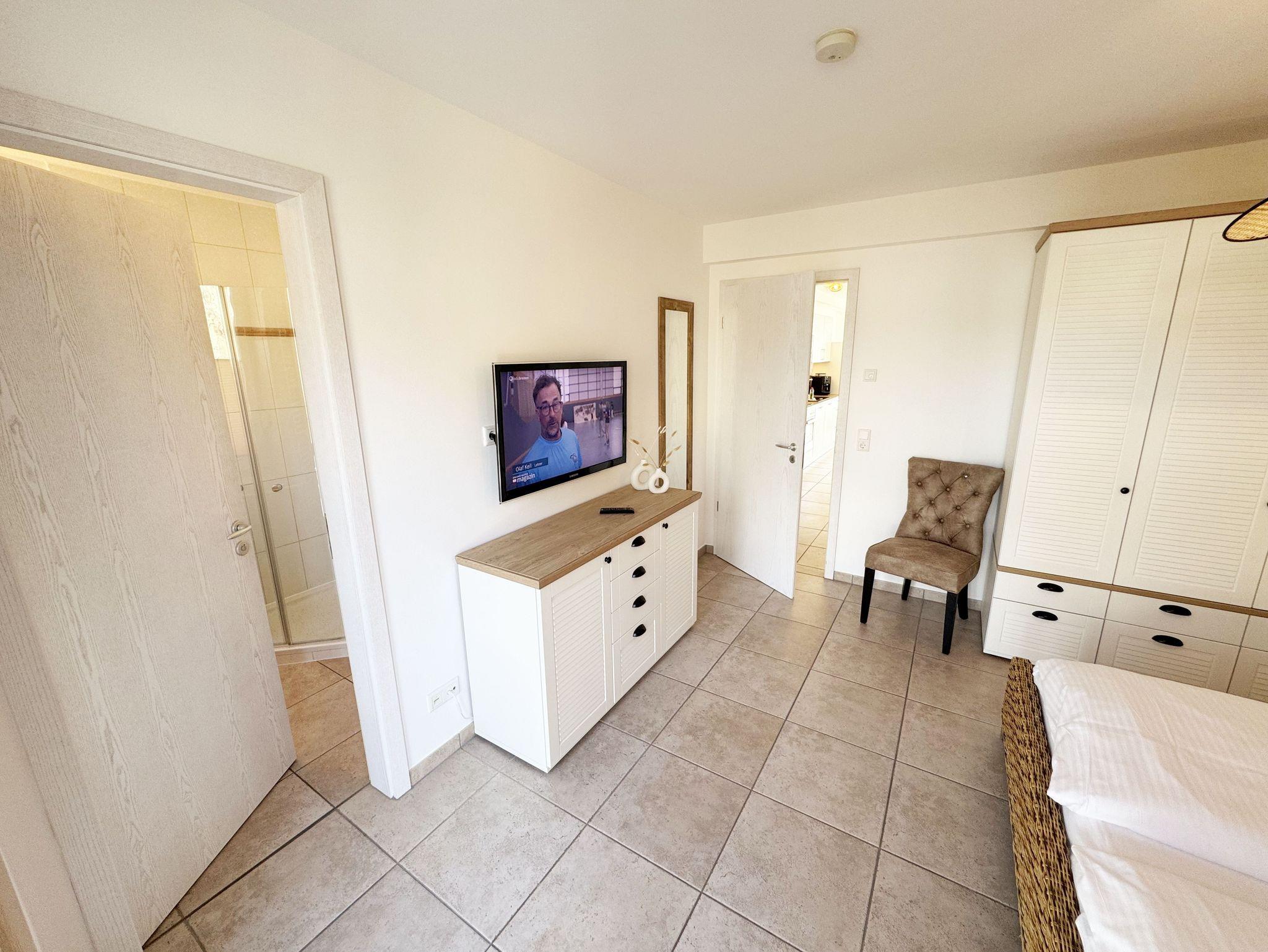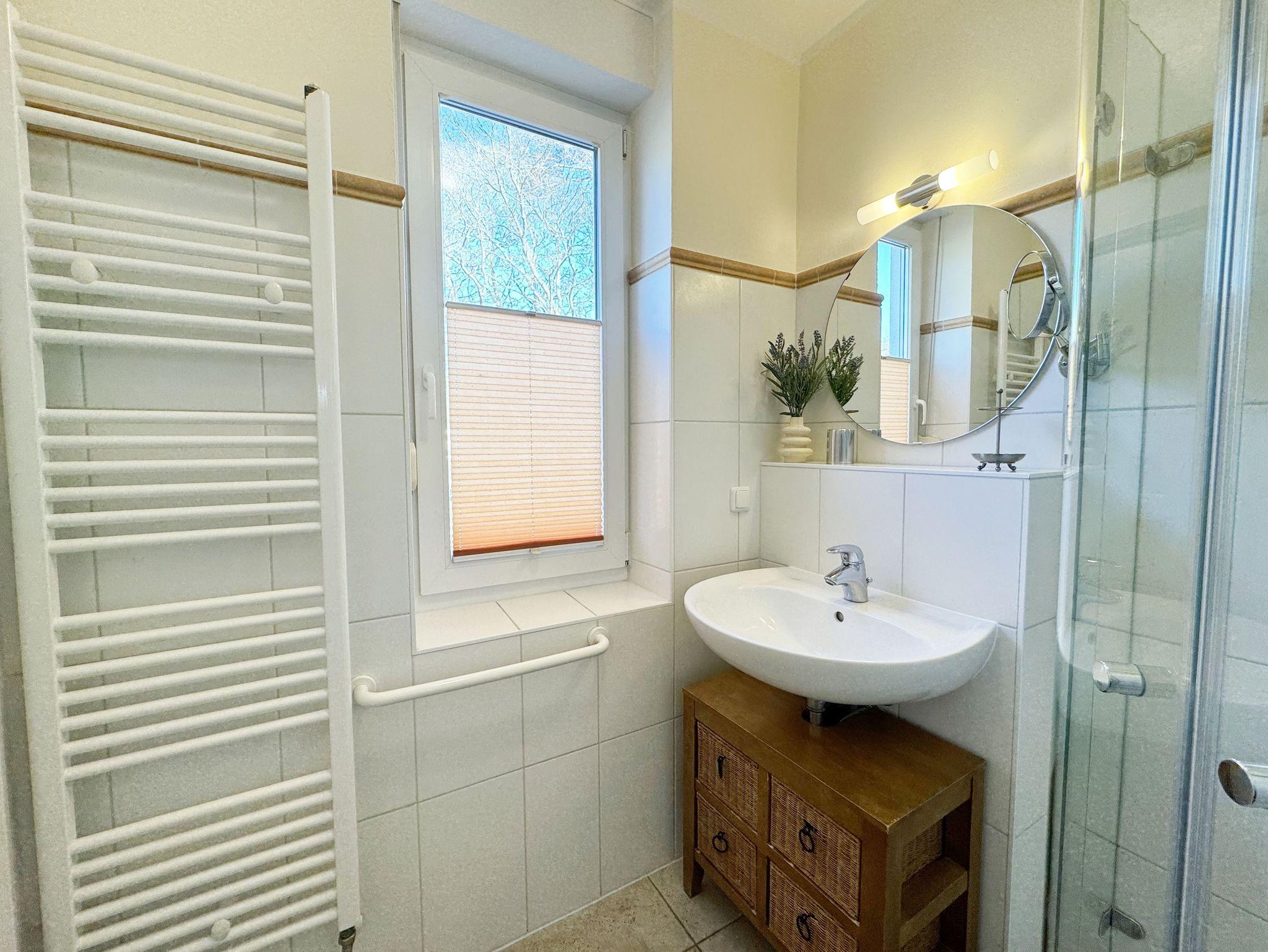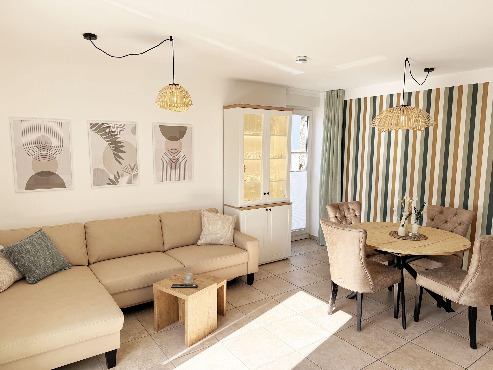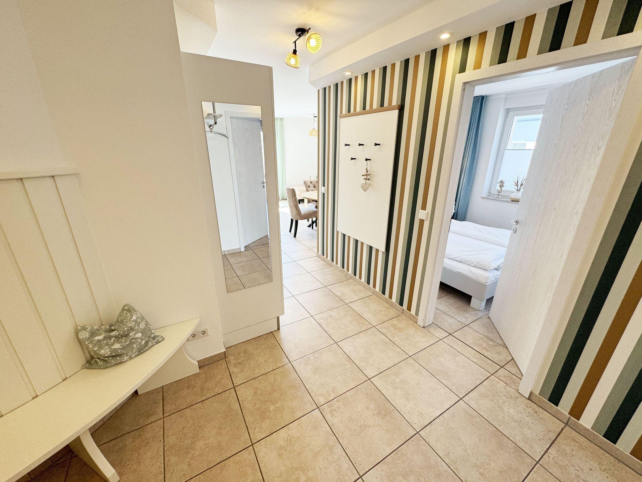 Sie wohnen auf ca. 70 m² in einer 3-Raum-Ferienwohnung für max. 2 bis 4 Personen. Die Nichtraucherferienwohnung befindet sich in der Villa Salus, in der 1. Etage. Der Eingangsbereich ist mit einer Garderobe, einem Ganzkörperspiegel und einer Sitzbank versehen. Von hier gelangen Sie in den Wohn-/Essbereich, der Ihnen mit seinen bodentiefen Fenstern eine helle und lichtdurchflutete Atmosphäre bietet. Der gemütliche Wohnbereich bietet Ihnen eine Couch, einen Couchtisch, beleuchtete Vitrine, ein TV-Board mit Smart-TV und ein Sky Angebot wie Serien, Blockbuster-Filmen sowie Live-Sport. Ein DAB-CD-Radio mit USB-Anschluss und ein WLAN-Zugang runden den technischen Bereich ab. Von hier gelangen Sie auf Ihren bestuhlten Balkon (West) mit Sonnenschirm. Die angrenzende Küchenzeile ist mit einem Backofen, einem Ceranfeld, einer Mikrowelle, einer Spülmaschine, einem Kühlschrank mit Gefrierfach, einer Kaffeemaschine, einem Wasserkocher, einem Toaster, einem Mixer, einem Pürierstab sowie Küchenhelfern ausgestattet. Abgerundet wird der Bereich mit einem Esstisch. Das erste Schlafzimmer verfügt über ein Doppelbett (1,80m x 2,00m) mit Nachttischablagen, verstellbare Lattenroste, einen Ganzkörperspiegel, einen Kleiderschrank sowie ein Smart-TV. Von hier gelangen Sie direkt in eines der beiden Bäder, welches mit einer Dusche (flacher Einstieg), einem Waschplatz, einem WC, einem Handtuchheizkörper, einem Kosmetikspiegel, einem Fön und Fenster ausgestattet ist. Das zweite Schlafzimmer verfügt über ein Doppelbett (1,80m x 2,00m) mit Nachttischablagen, verstellbare Lattenroste, einen Ganzkörperspiegel, einen Kleiderschrank sowie einen Schreibtisch. Von hier haben Sie auch einen Zugang zu ihrem West-Balkon. In beiden Schlafzimmern sorgen Insektenschutzgitter für einen angenehmen Schlaf. Das 2. innenliegende Badezimmer erreichen Sie vom Flurbereich, welches ebenfalls mit einer Dusche (flacher Einstieg), einem Waschplatz, einem WC und einem Handtuchheizkörper ausgestattet ist. Für eine wohlige Wärme sorgt die in der gesamten Wohnung verlegte Fußbodenheizung. In der gesamten Wohnung können Sie sich über Außenrollläden freuen. Für unsere kleinen Gäste stehen ein Hochstuhl sowie ein Kinderreisebett (inklusive Zusatzmatratze) zur Verfügung. Reinigungsutensilien sowie ein Wäscheständer stehen Ihnen zusätzlich zur Verfügung. Haustiere sind nicht erlaubt. Ihre mitgebrachten oder auch geliehenen Fahrräder können Sie im zugehörigen eigenen Abstellraum im Erdgeschoss unterstellen. Hier können Sie auch eine Waschmaschine, einen Trockner sowie ein Bügelbrett und ein Bügeleisen nutzen. Ihr eigener Stellplatz (Nr. 04) befindet sich direkt hinter dem Haus. Die Erstausstattung eines Wäschepaketes (komplette Bettwäsche, 1 Duschhandtuch, 2 kleine Handtücher) können Sie bis 14 Tage vor Anreise gegen einen Aufpreis dazu buchen oder durch Eigenes ergänzen. Ab 2 gebuchten Paketen erhalten Sie einmalig 1 Geschirrhandtuch und 1 Duschvorleger hinzu.