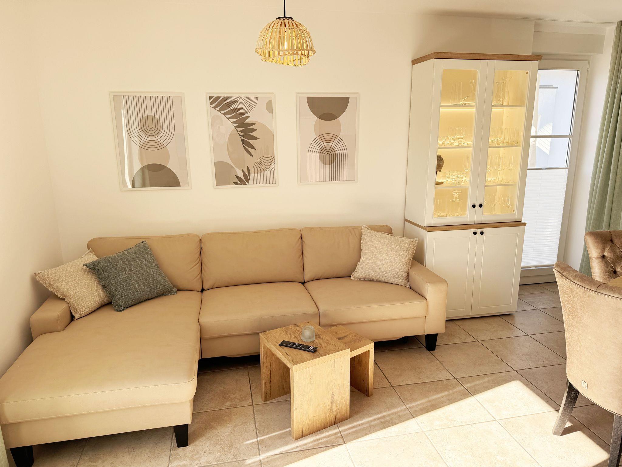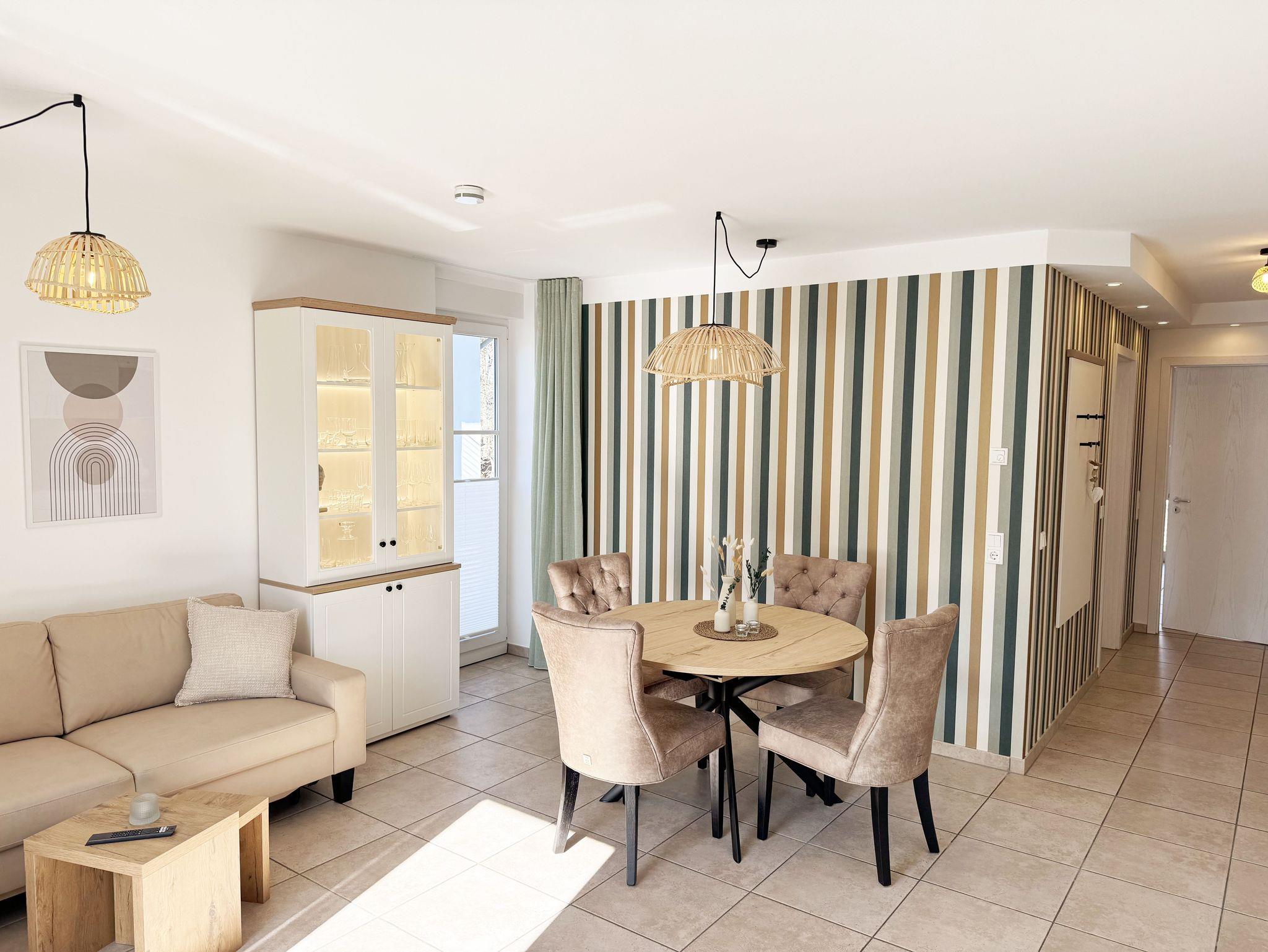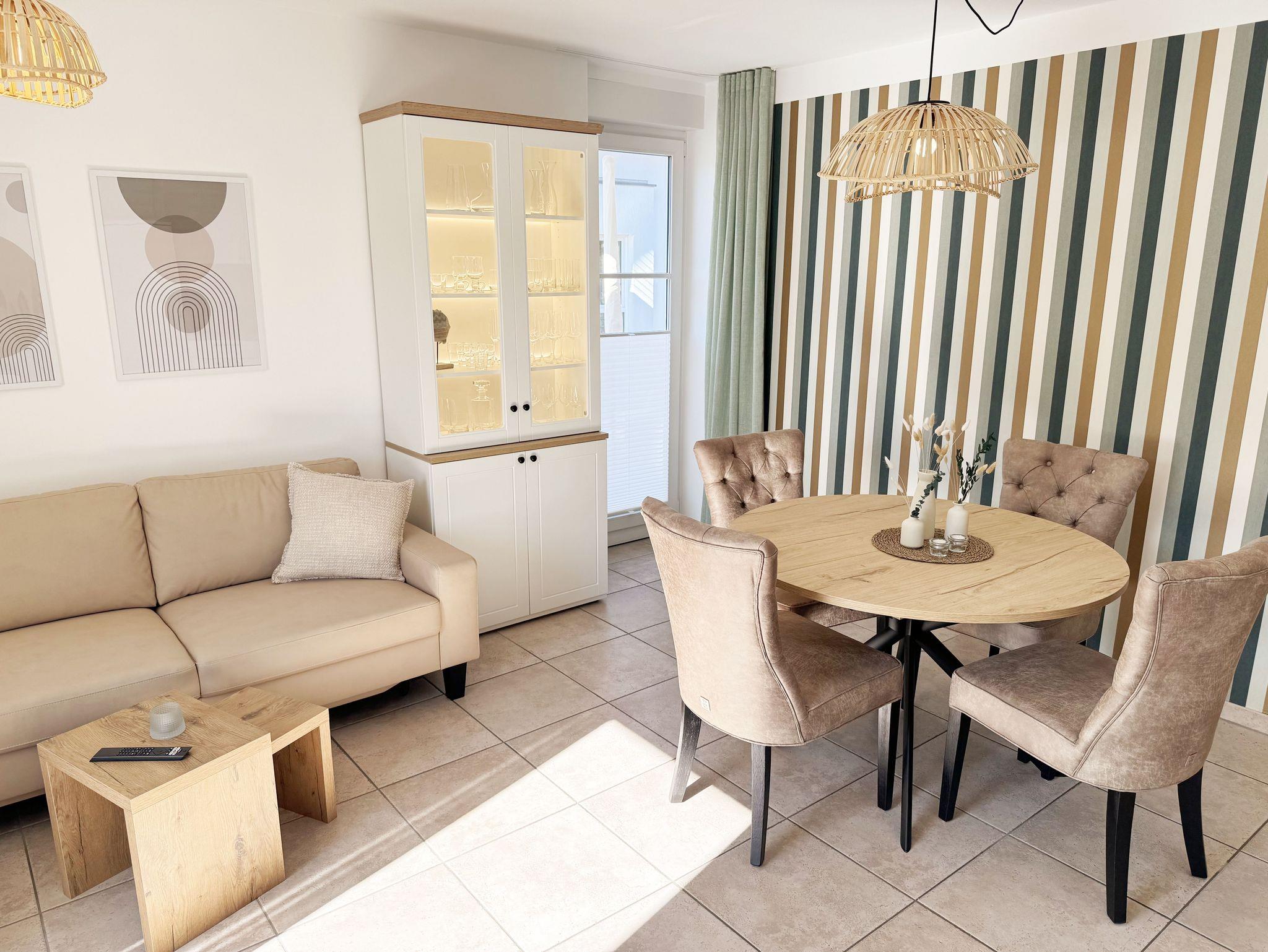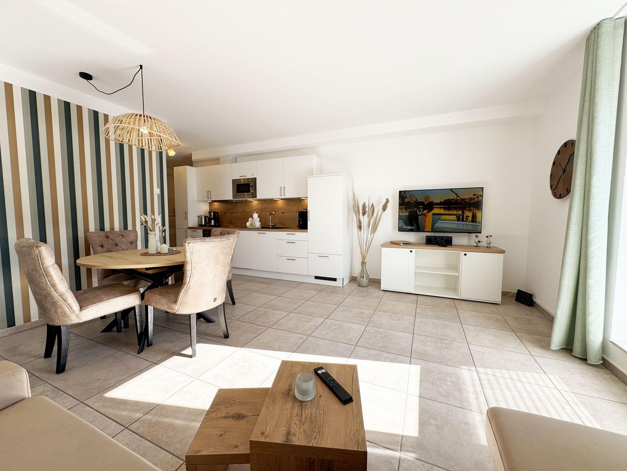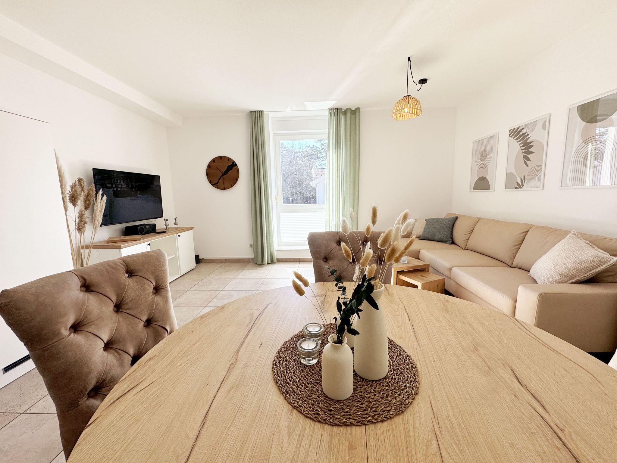 Sie wohnen auf ca. 70 m² in einer 3-Raum-Ferienwohnung für max. 2 bis 4 Personen. Die Nichtraucherferienwohnung befindet sich in der Villa Salus, in der 1. Etage. Der Eingangsbereich ist mit einer Garderobe, einem Ganzkörperspiegel und einer Sitzbank versehen. Von hier gelangen Sie in den Wohn-/Essbereich, der Ihnen mit seinen bodentiefen Fenstern eine helle und lichtdurchflutete Atmosphäre bietet. Der gemütliche Wohnbereich bietet Ihnen eine Couch, einen Couchtisch, beleuchtete Vitrine, ein TV-Board mit Smart-TV und ein Sky Angebot wie Serien, Blockbuster-Filmen sowie Live-Sport. Ein DAB-CD-Radio mit USB-Anschluss und ein WLAN-Zugang runden den technischen Bereich ab. Von hier gelangen Sie auf Ihren bestuhlten Balkon (West) mit Sonnenschirm. Die angrenzende Küchenzeile ist mit einem Backofen, einem Ceranfeld, einer Mikrowelle, einer Spülmaschine, einem Kühlschrank mit Gefrierfach, einer Kaffeemaschine, einem Wasserkocher, einem Toaster, einem Mixer, einem Pürierstab sowie Küchenhelfern ausgestattet. Abgerundet wird der Bereich mit einem Esstisch. Das erste Schlafzimmer verfügt über ein Doppelbett (1,80m x 2,00m) mit Nachttischablagen, verstellbare Lattenroste, einen Ganzkörperspiegel, einen Kleiderschrank sowie ein Smart-TV. Von hier gelangen Sie direkt in eines der beiden Bäder, welches mit einer Dusche (flacher Einstieg), einem Waschplatz, einem WC, einem Handtuchheizkörper, einem Kosmetikspiegel, einem Fön und Fenster ausgestattet ist. Das zweite Schlafzimmer verfügt über ein Doppelbett (1,80m x 2,00m) mit Nachttischablagen, verstellbare Lattenroste, einen Ganzkörperspiegel, einen Kleiderschrank sowie einen Schreibtisch. Von hier haben Sie auch einen Zugang zu ihrem West-Balkon. In beiden Schlafzimmern sorgen Insektenschutzgitter für einen angenehmen Schlaf. Das 2. innenliegende Badezimmer erreichen Sie vom Flurbereich, welches ebenfalls mit einer Dusche (flacher Einstieg), einem Waschplatz, einem WC und einem Handtuchheizkörper ausgestattet ist. Für eine wohlige Wärme sorgt die in der gesamten Wohnung verlegte Fußbodenheizung. In der gesamten Wohnung können Sie sich über Außenrollläden freuen. Für unsere kleinen Gäste stehen ein Hochstuhl sowie ein Kinderreisebett (inklusive Zusatzmatratze) zur Verfügung. Reinigungsutensilien sowie ein Wäscheständer stehen Ihnen zusätzlich zur Verfügung. Haustiere sind nicht erlaubt. Ihre mitgebrachten oder auch geliehenen Fahrräder können Sie im zugehörigen eigenen Abstellraum im Erdgeschoss unterstellen. Hier können Sie auch eine Waschmaschine, einen Trockner sowie ein Bügelbrett und ein Bügeleisen nutzen. Ihr eigener Stellplatz (Nr. 04) befindet sich direkt hinter dem Haus. Die Erstausstattung eines Wäschepaketes (komplette Bettwäsche, 1 Duschhandtuch, 2 kleine Handtücher) können Sie bis 14 Tage vor Anreise gegen einen Aufpreis dazu buchen oder durch Eigenes ergänzen. Ab 2 gebuchten Paketen erhalten Sie einmalig 1 Geschirrhandtuch und 1 Duschvorleger hinzu.