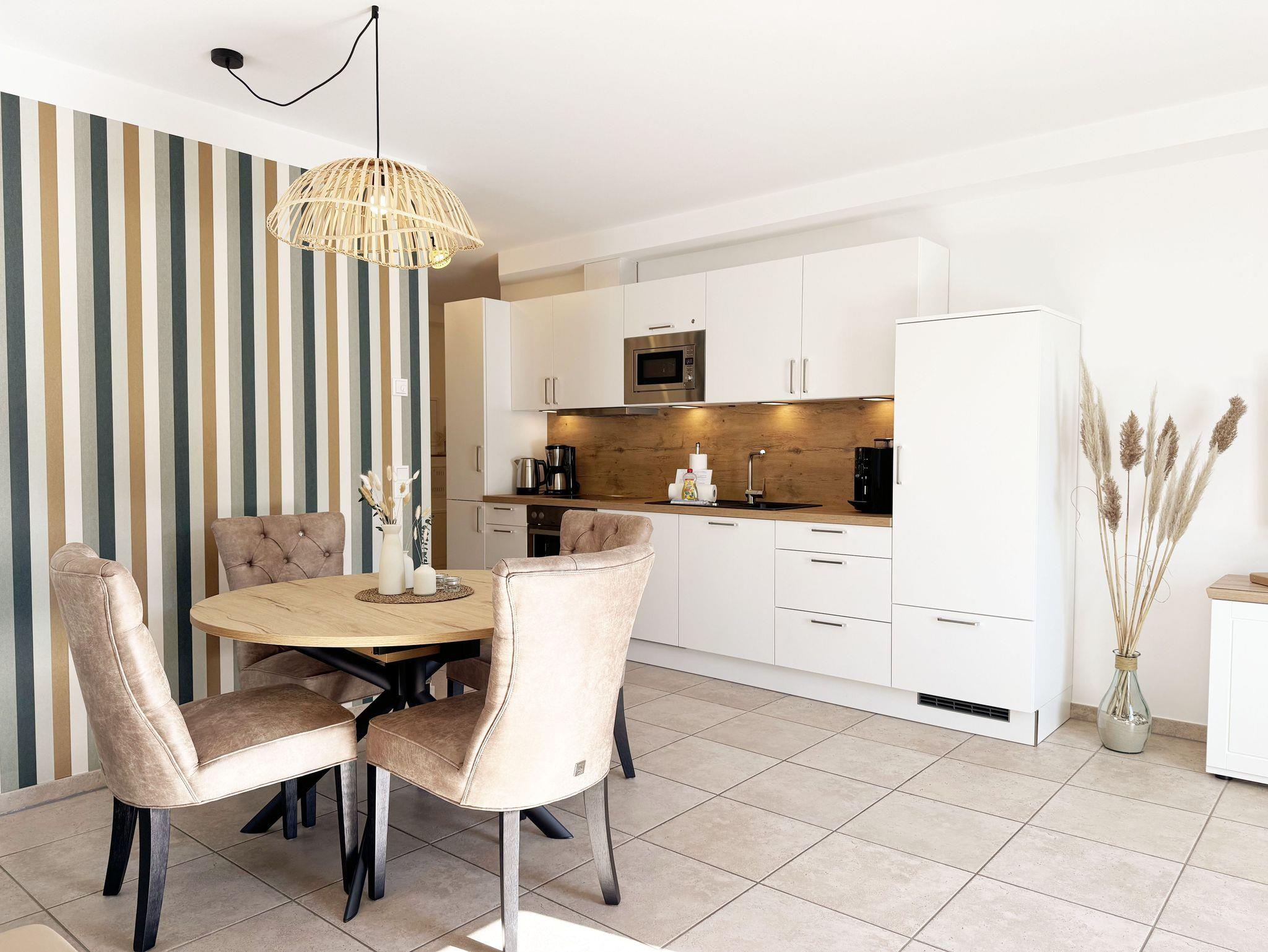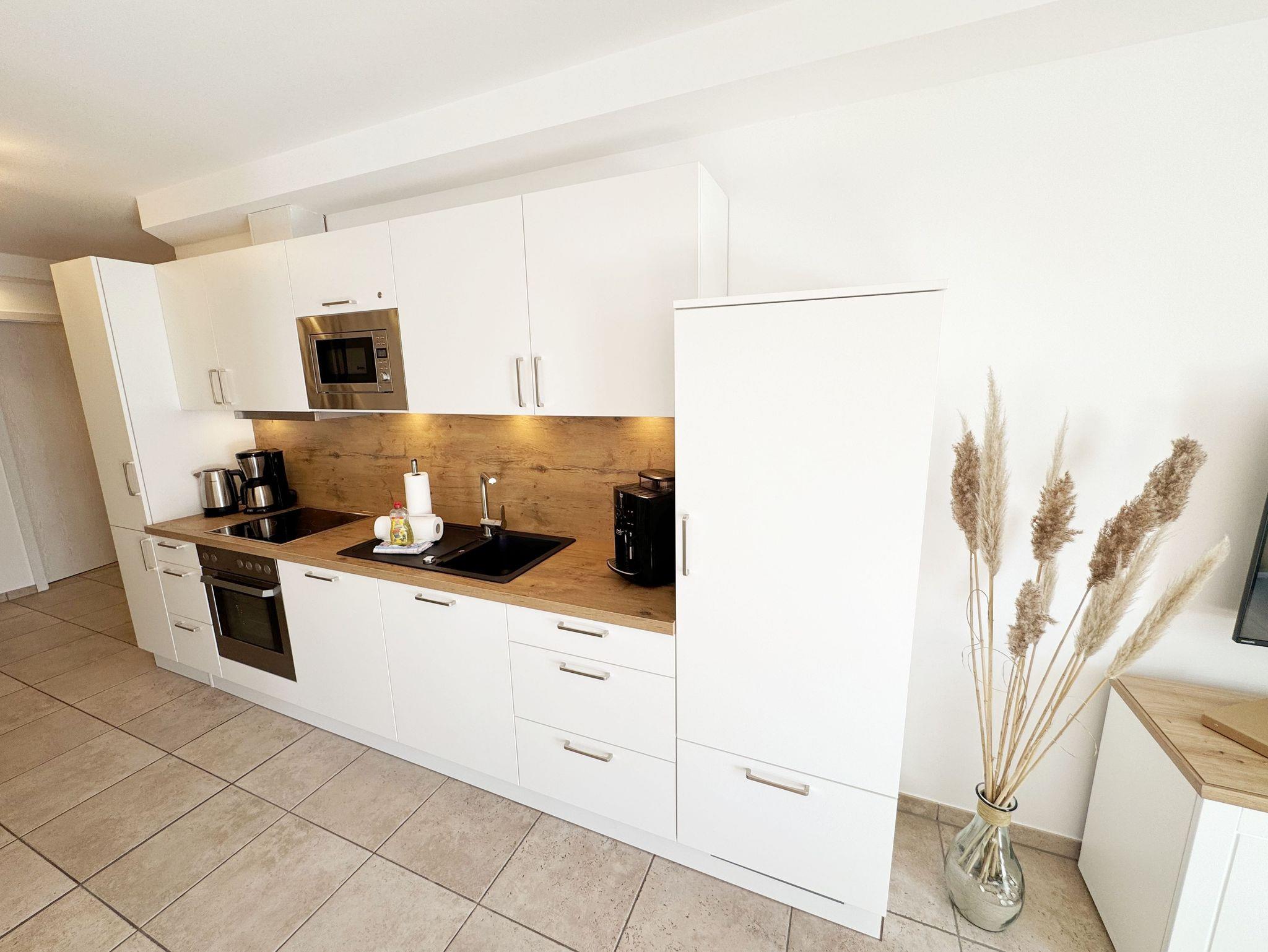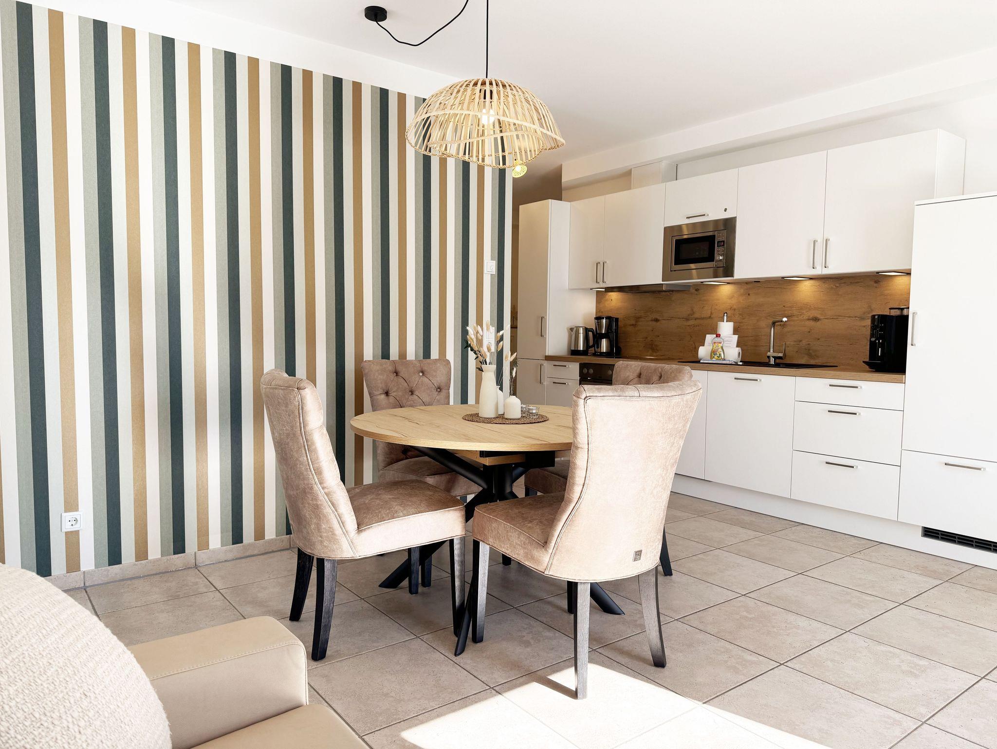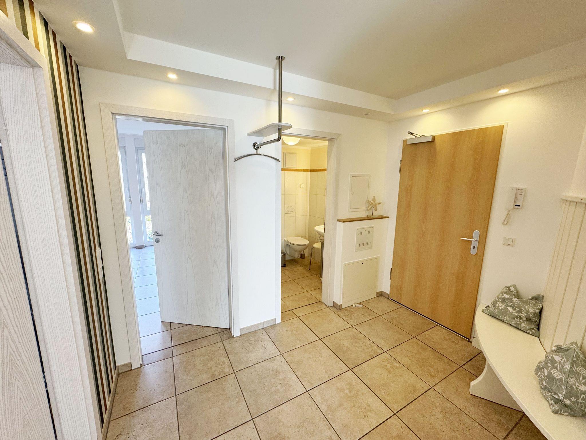 Sie wohnen auf ca. 70 m² in einer 3-Raum-Ferienwohnung für max. 2 bis 4 Personen. Die Nichtraucherferienwohnung befindet sich in der Villa Salus, in der 1. Etage. Der Eingangsbereich ist mit einer Garderobe, einem Ganzkörperspiegel und einer Sitzbank versehen. Von hier gelangen Sie in den Wohn-/Essbereich, der Ihnen mit seinen bodentiefen Fenstern eine helle und lichtdurchflutete Atmosphäre bietet. Der gemütliche Wohnbereich bietet Ihnen eine Couch, einen Couchtisch, beleuchtete Vitrine, ein TV-Board mit Smart-TV und ein Sky Angebot wie Serien, Blockbuster-Filmen sowie Live-Sport. Ein DAB-CD-Radio mit USB-Anschluss und ein WLAN-Zugang runden den technischen Bereich ab. Von hier gelangen Sie auf Ihren bestuhlten Balkon (West) mit Sonnenschirm. Die angrenzende Küchenzeile ist mit einem Backofen, einem Ceranfeld, einer Mikrowelle, einer Spülmaschine, einem Kühlschrank mit Gefrierfach, einer Kaffeemaschine, einem Wasserkocher, einem Toaster, einem Mixer, einem Pürierstab sowie Küchenhelfern ausgestattet. Abgerundet wird der Bereich mit einem Esstisch. Das erste Schlafzimmer verfügt über ein Doppelbett (1,80m x 2,00m) mit Nachttischablagen, verstellbare Lattenroste, einen Ganzkörperspiegel, einen Kleiderschrank sowie ein Smart-TV. Von hier gelangen Sie direkt in eines der beiden Bäder, welches mit einer Dusche (flacher Einstieg), einem Waschplatz, einem WC, einem Handtuchheizkörper, einem Kosmetikspiegel, einem Fön und Fenster ausgestattet ist. Das zweite Schlafzimmer verfügt über ein Doppelbett (1,80m x 2,00m) mit Nachttischablagen, verstellbare Lattenroste, einen Ganzkörperspiegel, einen Kleiderschrank sowie einen Schreibtisch. Von hier haben Sie auch einen Zugang zu ihrem West-Balkon. In beiden Schlafzimmern sorgen Insektenschutzgitter für einen angenehmen Schlaf. Das 2. innenliegende Badezimmer erreichen Sie vom Flurbereich, welches ebenfalls mit einer Dusche (flacher Einstieg), einem Waschplatz, einem WC und einem Handtuchheizkörper ausgestattet ist. Für eine wohlige Wärme sorgt die in der gesamten Wohnung verlegte Fußbodenheizung. In der gesamten Wohnung können Sie sich über Außenrollläden freuen. Für unsere kleinen Gäste stehen ein Hochstuhl sowie ein Kinderreisebett (inklusive Zusatzmatratze) zur Verfügung. Reinigungsutensilien sowie ein Wäscheständer stehen Ihnen zusätzlich zur Verfügung. Haustiere sind nicht erlaubt. Ihre mitgebrachten oder auch geliehenen Fahrräder können Sie im zugehörigen eigenen Abstellraum im Erdgeschoss unterstellen. Hier können Sie auch eine Waschmaschine, einen Trockner sowie ein Bügelbrett und ein Bügeleisen nutzen. Ihr eigener Stellplatz (Nr. 04) befindet sich direkt hinter dem Haus. Die Erstausstattung eines Wäschepaketes (komplette Bettwäsche, 1 Duschhandtuch, 2 kleine Handtücher) können Sie bis 14 Tage vor Anreise gegen einen Aufpreis dazu buchen oder durch Eigenes ergänzen. Ab 2 gebuchten Paketen erhalten Sie einmalig 1 Geschirrhandtuch und 1 Duschvorleger hinzu.