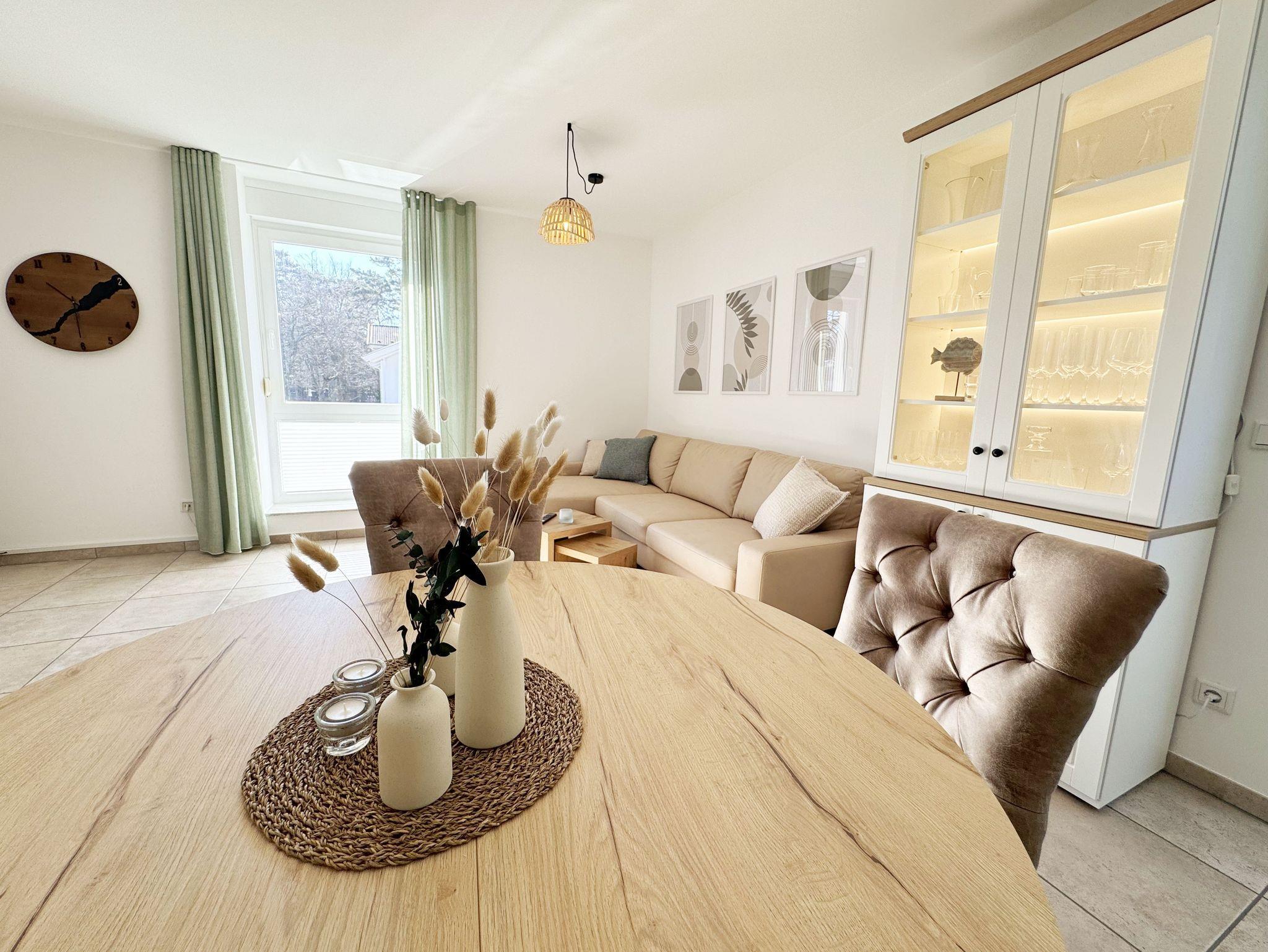 Sie wohnen auf ca. 70 m² in einer 3-Raum-Ferienwohnung für max. 2 bis 4 Personen. Die Nichtraucherferienwohnung befindet sich in der Villa Salus, in der 1. Etage. Der Eingangsbereich ist mit einer Garderobe, einem Ganzkörperspiegel und einer Sitzbank versehen. Von hier gelangen Sie in den Wohn-/Essbereich, der Ihnen mit seinen bodentiefen Fenstern eine helle und lichtdurchflutete Atmosphäre bietet. Der gemütliche Wohnbereich bietet Ihnen eine Couch, einen Couchtisch, beleuchtete Vitrine, ein TV-Board mit Smart-TV sowie ein DAB-CD-Radio und USB-Anschluss. Der technische Bereich wird mit einem inklusiven WLAN-Zugang abgerundet. Von hier gelangen Sie auf Ihren bestuhlten Balkon (West) mit Sonnenschirm. Die angrenzende Küchenzeile ist mit einem Backofen, einem Ceranfeld, einer Mikrowelle, einer Spülmaschine, einem Kühlschrank mit Gefrierfach, einer Kaffeemaschine, einem Wasserkocher, einem Toaster, einem Mixer, einem Pürierstab sowie Küchenhelfern ausgestattet. Abgerundet wird der Bereich mit einem Esstisch. Das erste Schlafzimmer verfügt über ein Doppelbett (1,80m x 2,00m) mit Nachttischablagen, verstellbare Lattenroste, einen Ganzkörperspiegel, einen Kleiderschrank sowie ein Smart-TV. Von hier gelangen Sie direkt in eines der beiden Bäder, welches mit einer Dusche (flacher Einstieg), einem Waschplatz, einem WC, einem Handtuchheizkörper, einem Kosmetikspiegel, einem Fön und Fenster ausgestattet ist. Das zweite Schlafzimmer verfügt über ein Doppelbett (1,80m x 2,00m) mit Nachttischablagen, verstellbare Lattenroste, einen Ganzkörperspiegel, einen Kleiderschrank sowie einen Schreibtisch. Von hier haben Sie auch einen Zugang zu ihrem West-Balkon. In beiden Schlafzimmern sorgen Insektenschutzgitter für einen angenehmen Schlaf. Das 2. innenliegende Badezimmer erreichen Sie vom Flurbereich, welches ebenfalls mit einer Dusche (flacher Einstieg), einem Waschplatz, einem WC und einem Handtuchheizkörper ausgestattet ist. Für eine wohlige Wärme sorgt die in der gesamten Wohnung verlegte Fußbodenheizung. In der gesamten Wohnung können Sie sich über Außenrollläden freuen. Für unsere kleinen Gäste stehen ein Hochstuhl sowie ein Kinderreisebett (inklusive Zusatzmatratze) zur Verfügung. Reinigungsutensilien sowie ein Wäscheständer stehen Ihnen zusätzlich zur Verfügung. Haustiere sind nicht erlaubt. Ihre mitgebrachten oder auch geliehenen Fahrräder können Sie im zugehörigen eigenen Abstellraum im Erdgeschoss unterstellen. Hier können Sie auch eine Waschmaschine, einen Trockner sowie ein Bügelbrett und ein Bügeleisen nutzen. Ihr eigener Stellplatz (Nr. 04) befindet sich direkt hinter dem Haus. Die Erstausstattung eines Wäschepaketes (komplette Bettwäsche, 1 Duschhandtuch, 2 kleine Handtücher) können Sie bis 14 Tage vor Anreise gegen einen Aufpreis dazu buchen oder durch Eigenes ergänzen. Ab 2 gebuchten Paketen erhalten Sie einmalig 1 Geschirrhandtuch und 1 Duschvorleger hinzu.