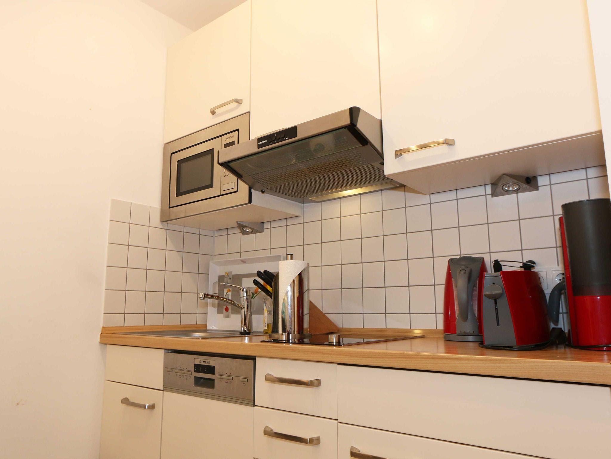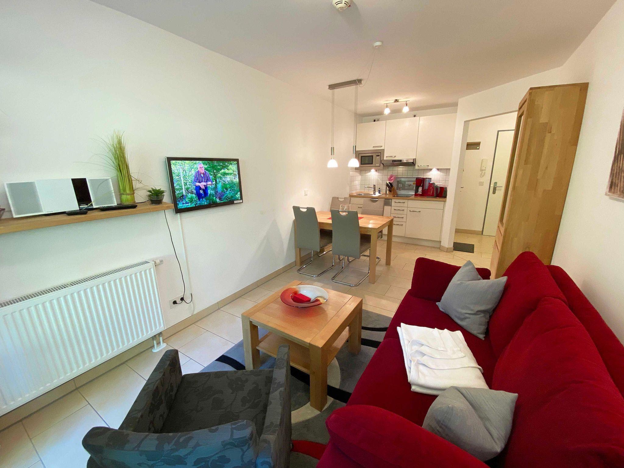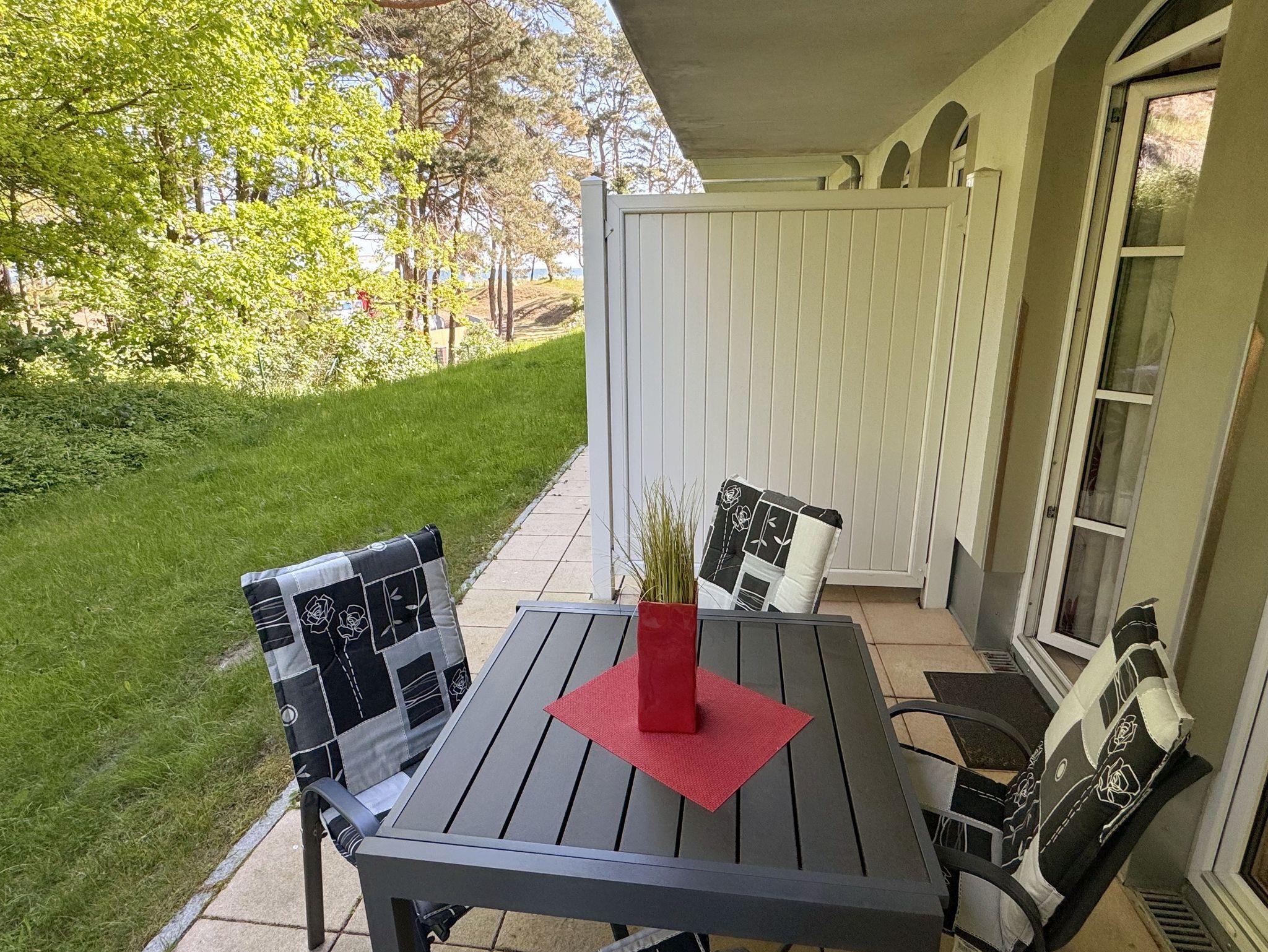 Ihre Nichtraucher-Ferienwohnung ist mit viel Liebe zum Detail ausgestattet und eingerichtet. Sie wohnen in einer ca. 40 m² großen 2-Zimmerwohnung, die für max. 2 Erwachsene + 1 Kleinkind bis 3 Jahre im Kinderreisebett ausgelegt ist. Die Wohnung A 0.14 befindet sich im Erdgeschoss und ist per Fahrstuhl aus der Tiefgarage bequem zu erreichen. In der Wohnung finden Sie einen kombinierten Wohn-/Koch- und Essbereich. Die integrierte Küchenzeile lässt mit Mikrowelle mit Grillfunktion, Ceranfeld, Spülmaschine, Kühlschrank mit Gefrierfach, Kaffeemaschine, Wasserkocher, Toaster und anderen praktischen Helfern keine Wünsche offen. Im Wohnbereich ist weiterhin eine Essecke sowie eine gemütliche Couch, Couchtisch, Leselampe, Smart-TV und Mini-Stereoanlage mit USB-Anschluss vorhanden. Auch auf einen Internetanschluss (WLAN/LAN) müssen Sie nicht verzichten. Dieser ist für Sie inklusive. Die Terrasse ist vom Wohn-/Essbereich begehbar und möbliert. Von der windgeschützten Terrasse (Nord/West) blickt man durch den Kiefernbaumbestand seitlich in Richtung Meer. Das Schlafzimmer ist mit einem Doppelbett (1,80 m x 2,00 m) mit verstellbaren Lattenrosten (Kopfteil), Nachttischkonsolen, einem Smart-TV, Insektenschutzgitter sowie einem Kleiderschrank ausgestattet. Der Wohn- und Schlafraum kann abgedunkelt werden. Das Bad verfügt über eine ebenerdige Dusche, Waschbecken, Fön, Kosmetikspiegel, WC und Handtuchheizkörper. Ein Kinderhochstuhl und ein Kinderreisebett (ohne Zusatzmatratze, ohne Bett Inlett) stehen Ihnen inklusive zur Verfügung. Ein eigener PKW-Stellplatz (Nr.50, Einfahrtshöhe 2,00m) befindet sich in der Tiefgarage des Hauses. Im Keller des Hauses haben Sie die Möglichkeit eine Waschmaschine/Trockner gegen Gebühr zu nutzen. Haustiere sind nicht erlaubt. Mit dem Fahrstuhl des Hauses A gelangen sie in das Untergeschoss der Meeresblickanlage, wo Sie ein großzügiger und heller Wellnessbereich erwartet. Hier können sie in einem Pool kleine Bahnen schwimmen, in 2 Saunen Ihren Kreislauf in Schwung bringen, in einem dazugehörigen Ruheraum Ihren Körper wieder beruhigen, in einer Schneckendusche sowie weiteren Duschen das kühle Nass genießen und auf einer Außenterrasse mit Außendusche die frische Luft einatmen. Die Erstausstattung eines Wäschepaketes (komplette Bettwäsche, 1 Duschhandtuch, 2 kleine Handtücher) können Sie bis 14 Tage vor Anreise gegen einen Aufpreis dazu buchen oder durch eigene ergänzen. Ab 2 gebuchten Paketen erhalten Sie einmalig 1 Geschirrhandtuch und 1 Duschvorleger hinzu.