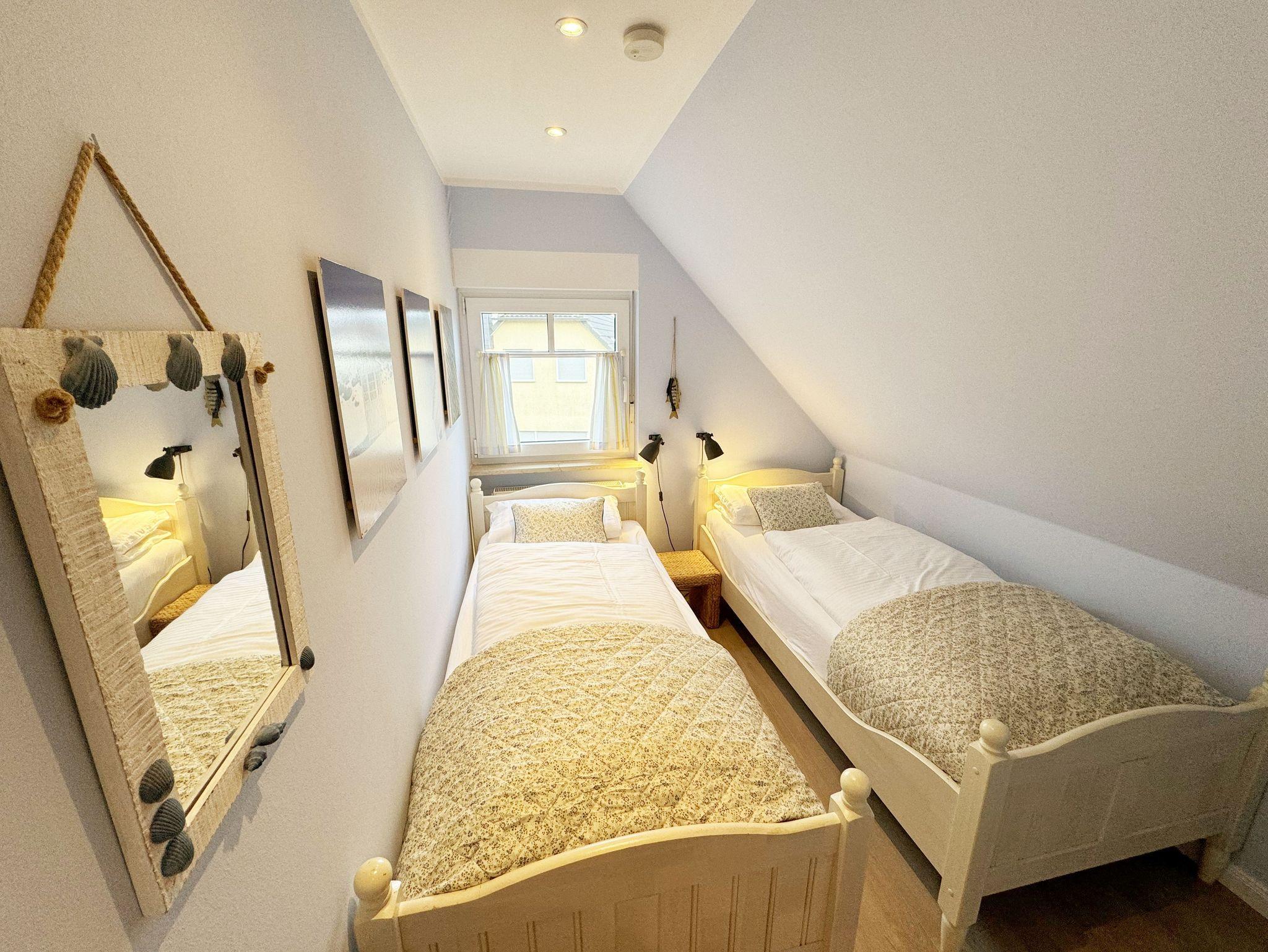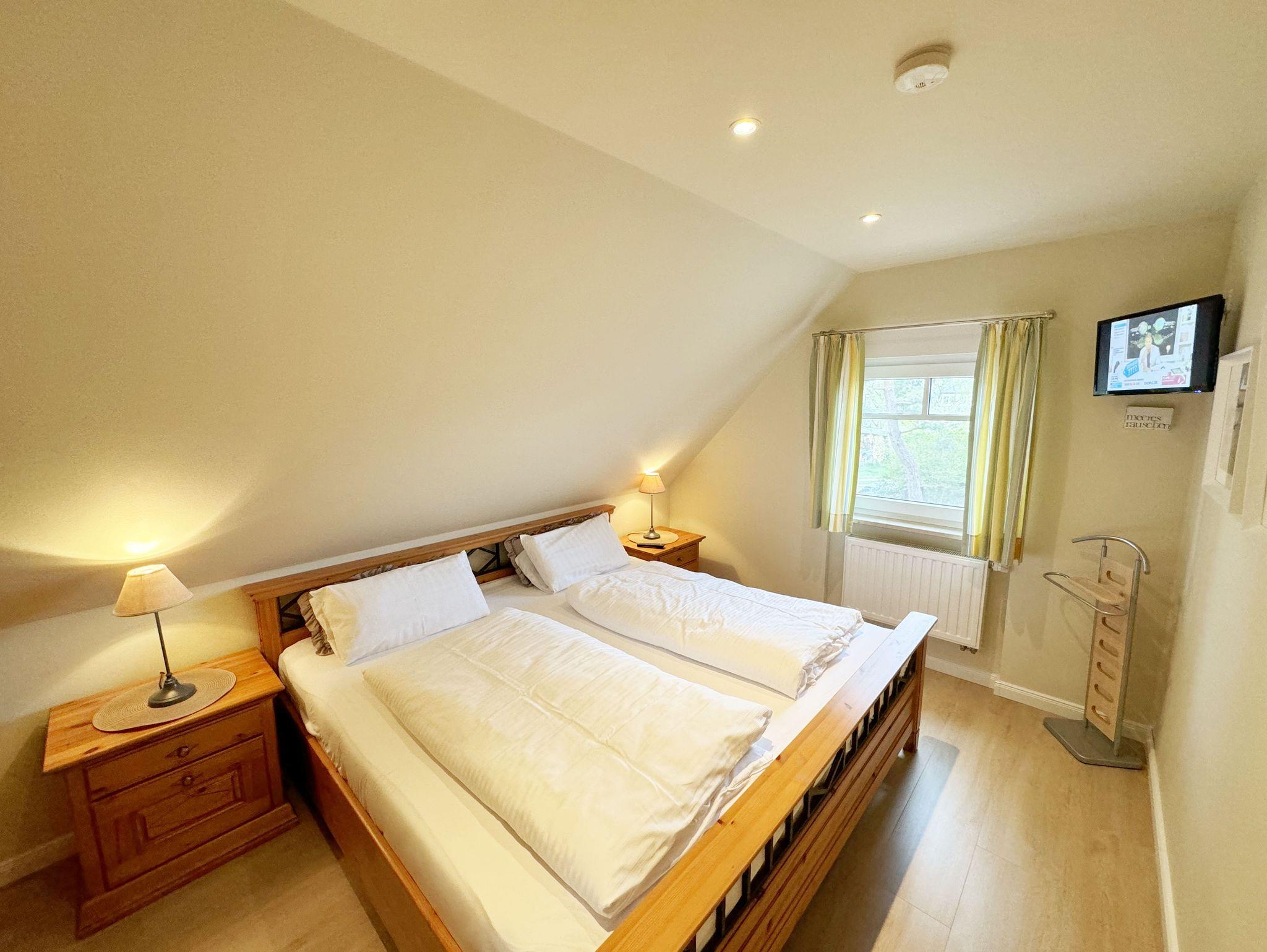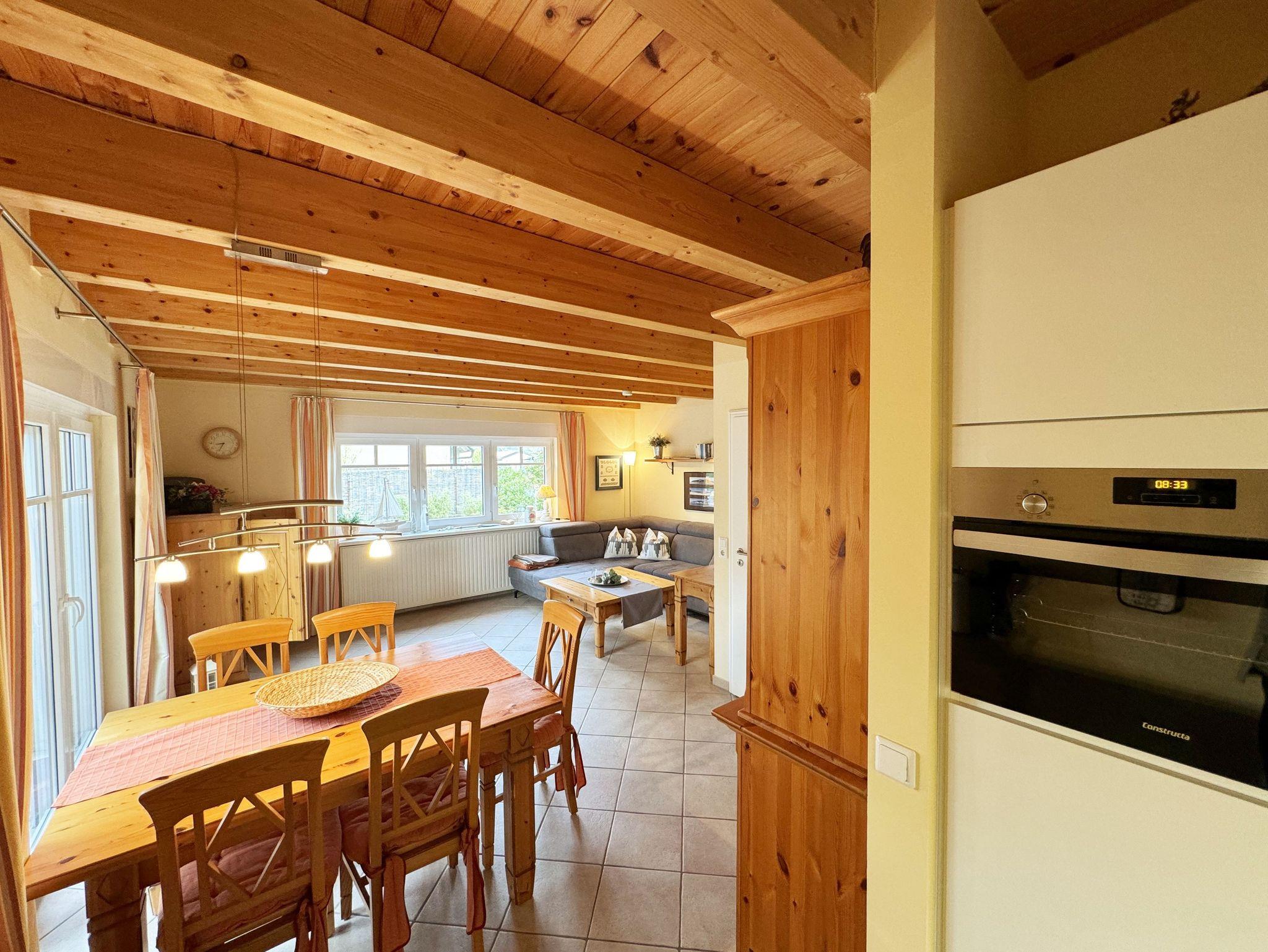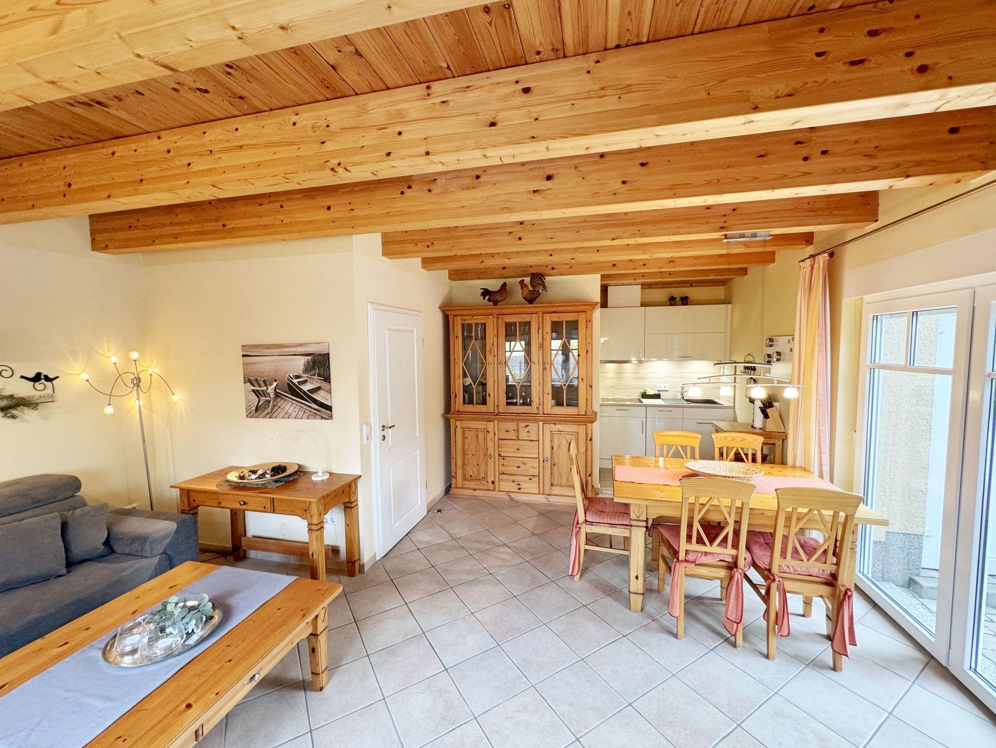 Die 70 qm große Doppelhaushälfte (Nichtraucher) für 2 bis 5 Personen und 1 Kleinkind bis 3 Jahre im Kinderreisebett, wurde mit viel Liebe zum Detail ausgestattet und eingerichtet. Die Haushälfte verläuft über 2 Etagen und besteht im Erdgeschoss aus einem großzügigen Wohn-/Essbereich mit einer vollausgestatteten Küchenzeile sowie einem Gäste-WC. Im Obergeschoss finden Sie 2 separate Schlafräume, das große Badezimmer und einen Abstellraum. Der helle Wohnbereich mit Couchecke (Aufbettungsmöglichkeit für eine 5. Person/1,30m x 1,90m), Couchtisch, Leselampe, ein Bücherregal mit kleiner Buchauswahl, ein großer Smart-TV im TV-Schrank mit DVD-Player und eine kleine Musikanlage sorgen für Ihre Unterhaltungsmöglichkeiten. Ein kostenfreier WLAN-Zugang (250 Mbit/S) steht Ihnen auch zur Verfügung. Die angrenzende Küchenecke lässt mit einem Backofen, Ceran-Kochfeld, Geschirrspüler, Kühlschrank mit Eisfach, Kaffeemaschine, Senseo Padmaschine, Wasserkocher, Toaster, weiteren praktischen Helfern sowie einen Essplatz mit 5 Stühlen keine Wünsche offen. Auf gleicher Ebene finden Sie auch das Gäste-WC. Von der bestuhlten Terrasse (Süd/West) mit Strandkorb gelangen Sie in einen separaten Abstellraum mit Waschmaschine/Trockner (inklusive), Bügelbrett, Bügeleisen, Staubsauger und Reinigungsutensilien. Im Obergeschoss befinden sich beide Schlafzimmer. Das größere verfügt über ein Doppelbett (2,00 m x 2,00 m), Nachttischkonsolen, einen Kleiderschrank und eine Kommode mit Flachbild-TV. Das kleinere Schlafzimmer wird durch 2 Einzelbetten (á 0,90 m x 2,00 m) und eine Kommode mit Flachbild-TV abgerundet. Alle Betten wurden mit Komfort Kaltschaum - Matratzen und verstellbaren Lattenroste ausgestattet sowie Insektenschutzgittern. Das großzügige Tageslichtbad wird durch eine Dusche, WC, Waschtisch mit Spiegelschrank, Kosmetikspiegel, Fön und Badezimmermöbel komplettiert. Alle Räumlichkeiten können durch Rollläden verdunkelt werden. Hochwertige Steinzeugfliesen wurden im Erdgeschoss verlegt und im Bad sowie in den Schlafräumen massive Holzdielen. Einen PKW-Stellplatz finden Sie im Carport, wo auch bei Bedarf dahinter ein 2. Stellplatz genutzt werden kann. Ein verschlossener Abstellraum für Ihre mitgebrachten oder geliehenen Fahrräder befindet sich am Carport. Haustiere sind nicht erlaubt. Die Erstausstattung eines Wäschepaketes (komplette Bettwäsche, 1 Duschhandtuch, 1 kleines Handtuch) können Sie bis 14 Tage vor Anreise gegen einen Aufpreis dazu buchen oder durch eigene ergänzen. Ab 2 gebuchten Paketen erhalten Sie einmalig 1 Geschirrhandtuch und 1 Duschvorleger hinzu.