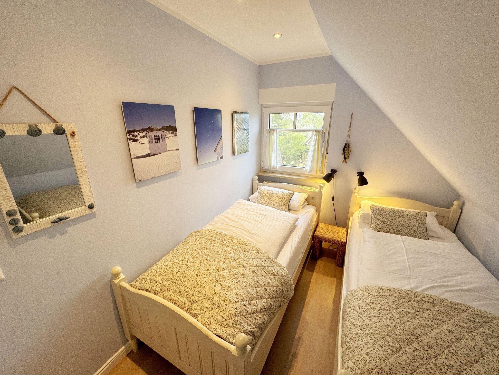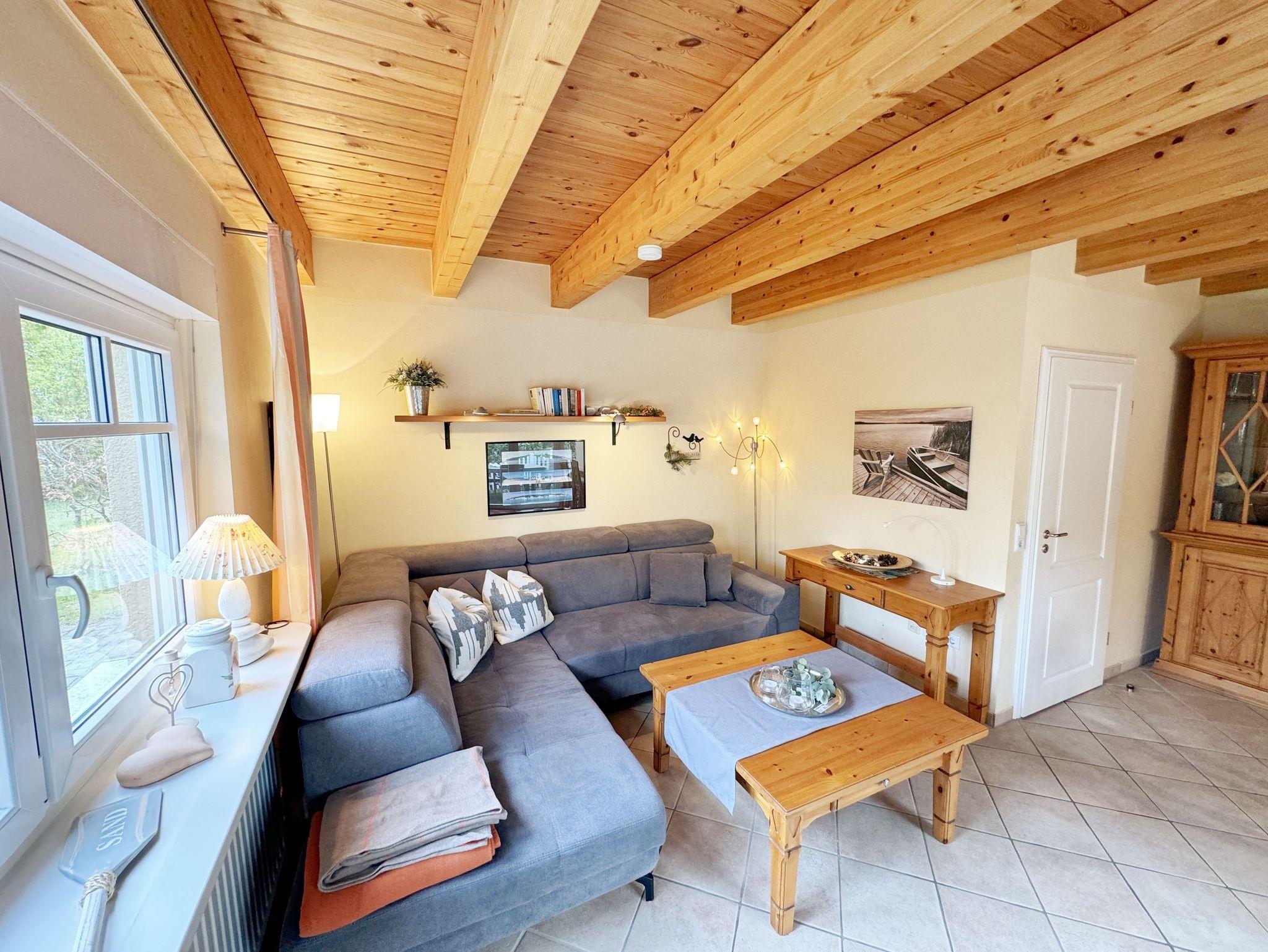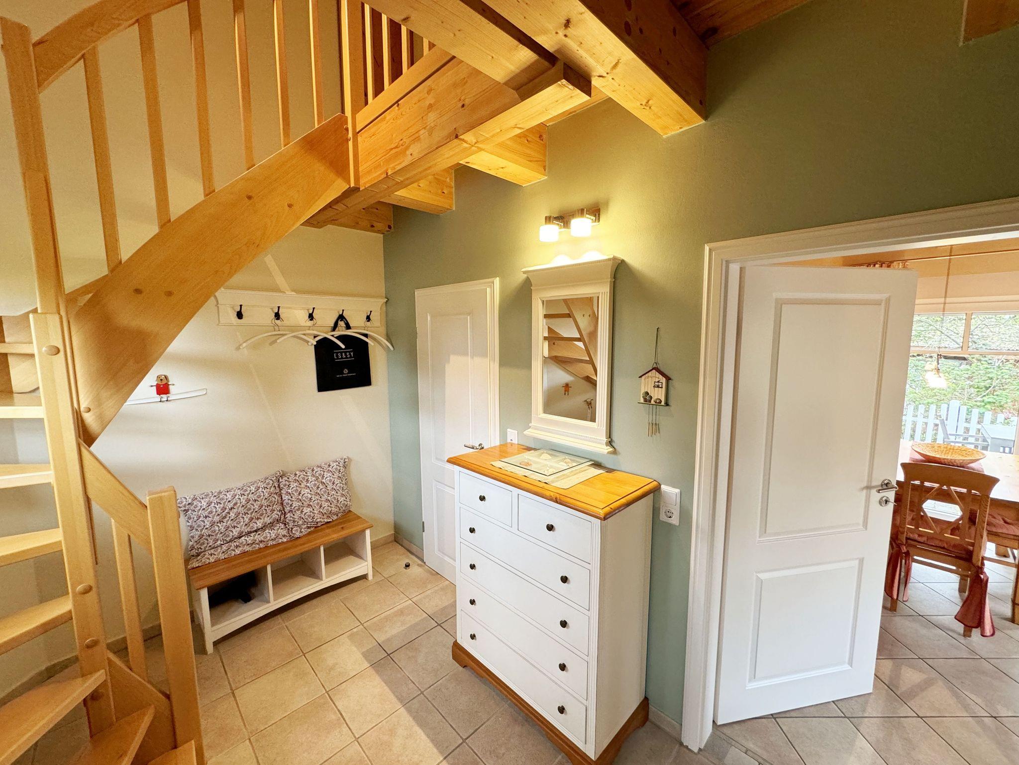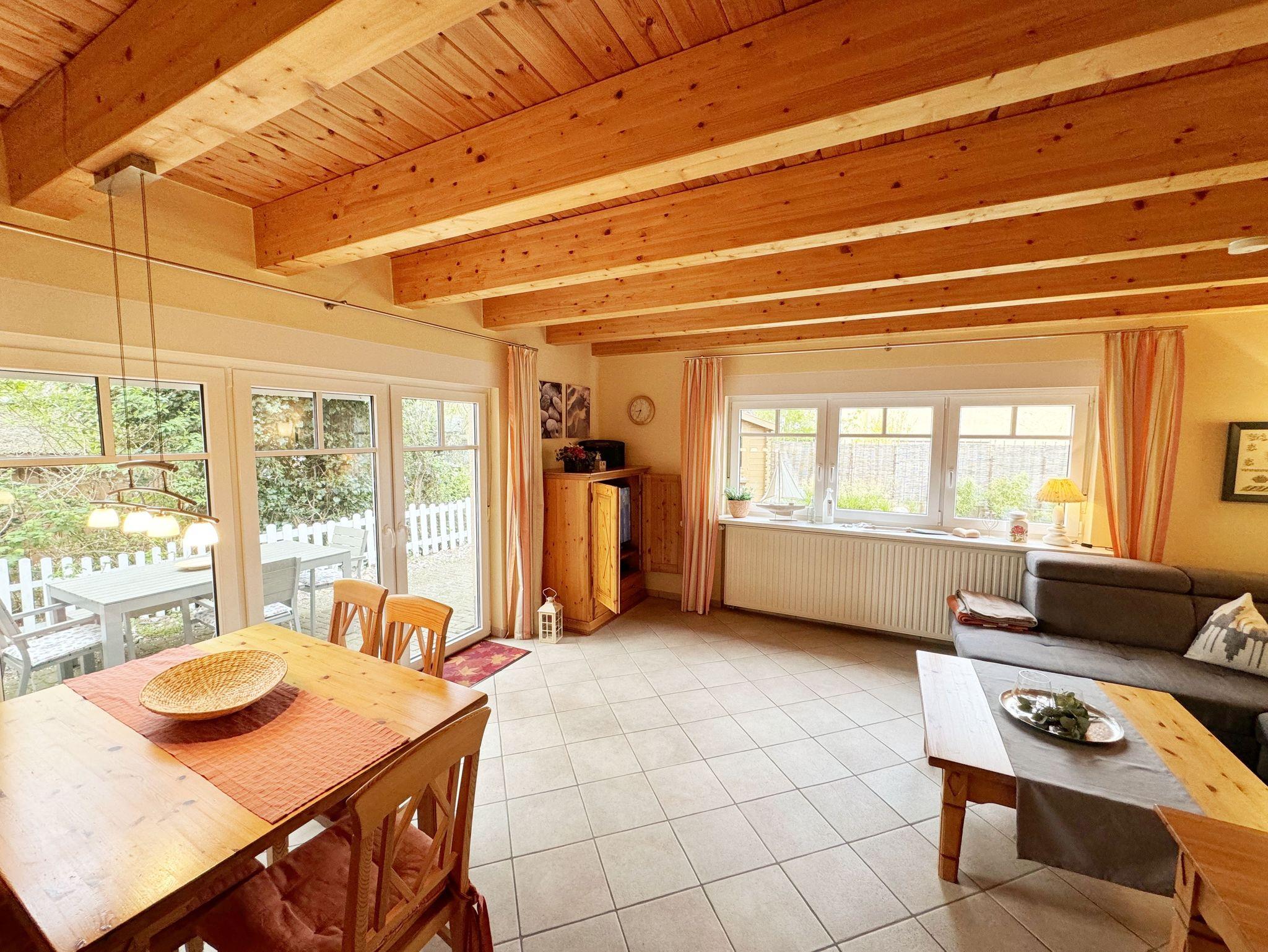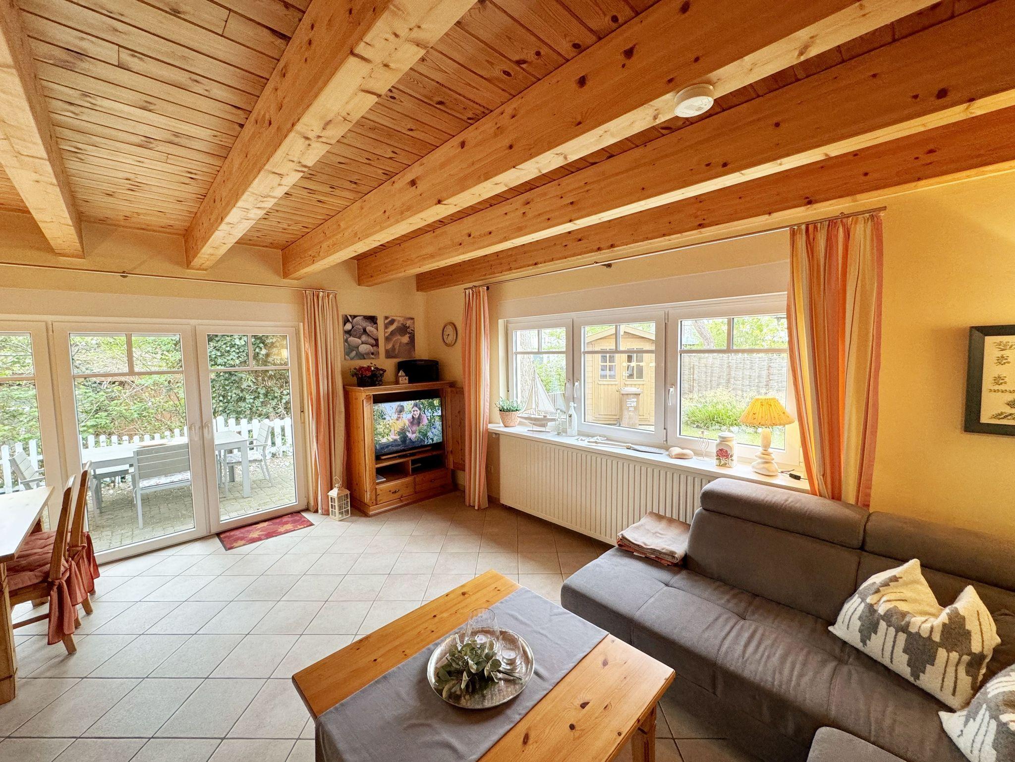 Die 70 qm große Doppelhaushälfte (Nichtraucher) für 2 bis 5 Personen und 1 Kleinkind bis 3 Jahre im Kinderreisebett, wurde mit viel Liebe zum Detail ausgestattet und eingerichtet. Die Haushälfte verläuft über 2 Etagen und besteht im Erdgeschoss aus einem großzügigen Wohn-/Essbereich mit einer vollausgestatteten Küchenzeile sowie einem Gäste-WC. Im Obergeschoss finden Sie 2 separate Schlafräume, das große Badezimmer und einen Abstellraum. Der helle Wohnbereich mit Couchecke (Aufbettungsmöglichkeit für eine 5. Person/1,30m x 1,90m), Couchtisch, Leselampe, ein Bücherregal mit kleiner Buchauswahl, ein großer Smart-TV im TV-Schrank mit DVD-Player und eine kleine Musikanlage sorgen für Ihre Unterhaltungsmöglichkeiten. Ein kostenfreier WLAN-Zugang (250 Mbit/S) steht Ihnen auch zur Verfügung. Die angrenzende Küchenecke lässt mit einem Backofen, Ceran-Kochfeld, Geschirrspüler, Kühlschrank mit Eisfach, Kaffeemaschine, Senseo Padmaschine, Wasserkocher, Toaster, weiteren praktischen Helfern sowie einen Essplatz mit 5 Stühlen keine Wünsche offen. Auf gleicher Ebene finden Sie auch das Gäste-WC. Von der bestuhlten Terrasse (Süd/West) mit Strandkorb gelangen Sie in einen separaten Abstellraum mit Waschmaschine/Trockner (inklusive), Bügelbrett, Bügeleisen, Staubsauger und Reinigungsutensilien. Im Obergeschoss befinden sich beide Schlafzimmer. Das größere verfügt über ein Doppelbett (2,00 m x 2,00 m), Nachttischkonsolen, einen Kleiderschrank und eine Kommode mit Flachbild-TV. Das kleinere Schlafzimmer wird durch 2 Einzelbetten (á 0,90 m x 2,00 m) und eine Kommode mit Flachbild-TV abgerundet. Alle Betten wurden mit Komfort Kaltschaum - Matratzen und verstellbaren Lattenroste ausgestattet sowie Insektenschutzgittern. Das großzügige Tageslichtbad wird durch eine Dusche, WC, Waschtisch mit Spiegelschrank, Kosmetikspiegel, Fön und Badezimmermöbel komplettiert. Alle Räumlichkeiten können durch Rollläden verdunkelt werden. Hochwertige Steinzeugfliesen wurden im Erdgeschoss verlegt und im Bad sowie in den Schlafräumen massive Holzdielen. Einen PKW-Stellplatz finden Sie im Carport, wo auch bei Bedarf dahinter ein 2. Stellplatz genutzt werden kann. Ein verschlossener Abstellraum für Ihre mitgebrachten oder geliehenen Fahrräder befindet sich am Carport. Haustiere sind nicht erlaubt. Die Erstausstattung eines Wäschepaketes (komplette Bettwäsche, 1 Duschhandtuch, 1 kleines Handtuch) können Sie bis 14 Tage vor Anreise gegen einen Aufpreis dazu buchen oder durch eigene ergänzen. Ab 2 gebuchten Paketen erhalten Sie einmalig 1 Geschirrhandtuch und 1 Duschvorleger hinzu.