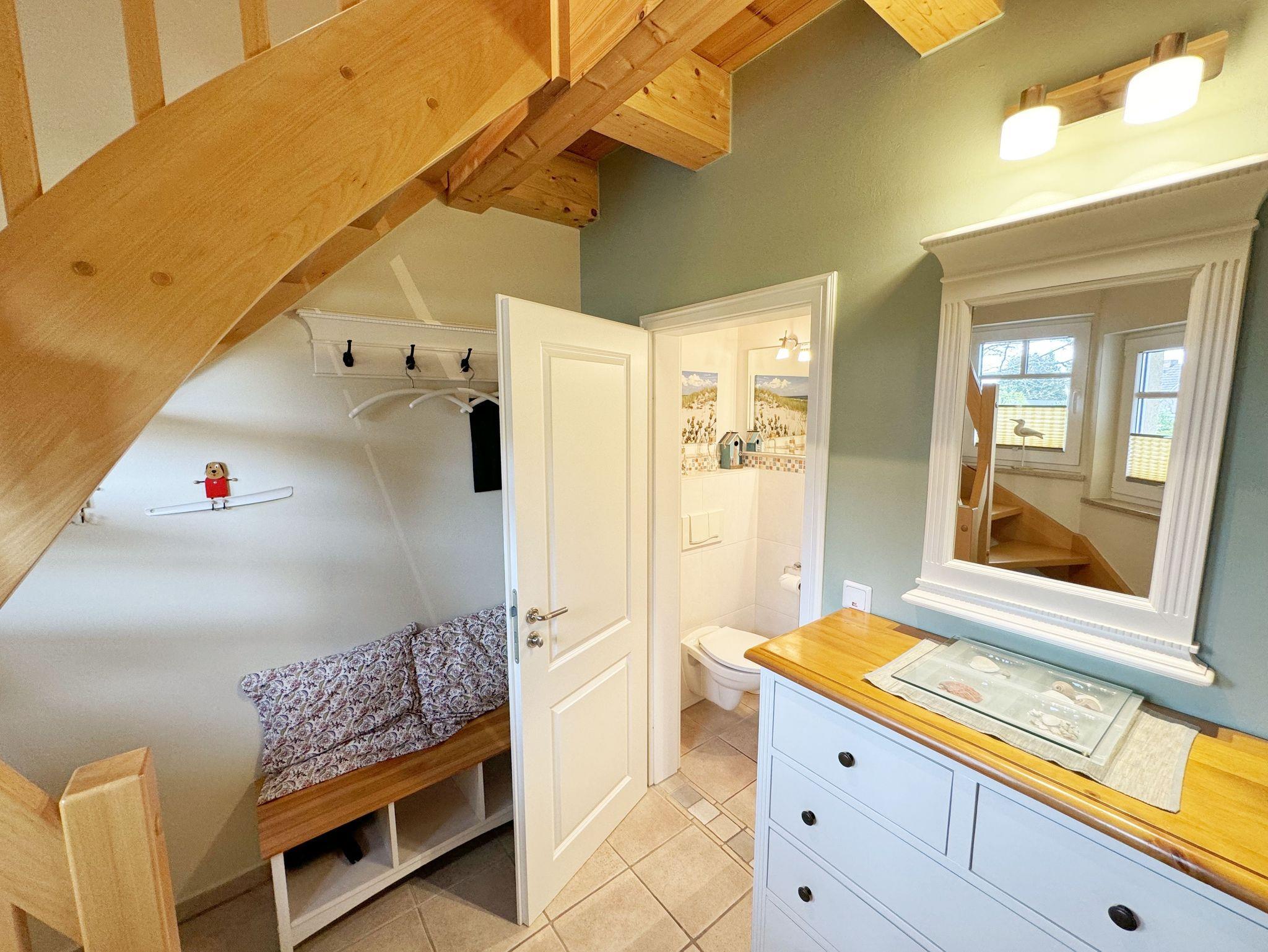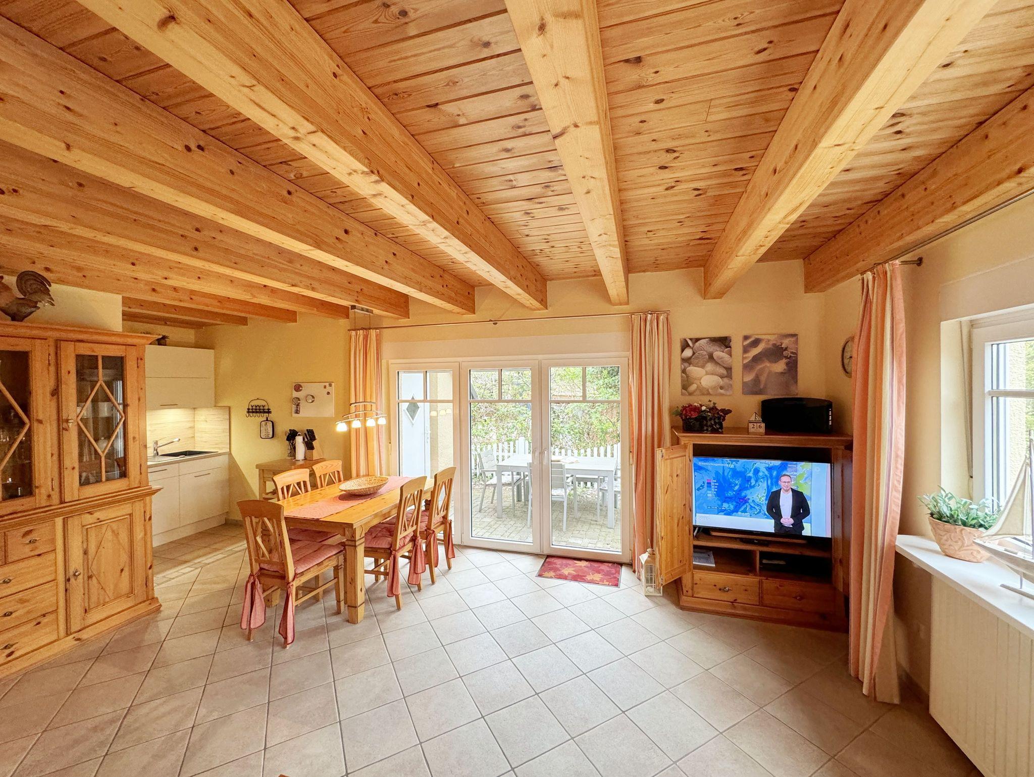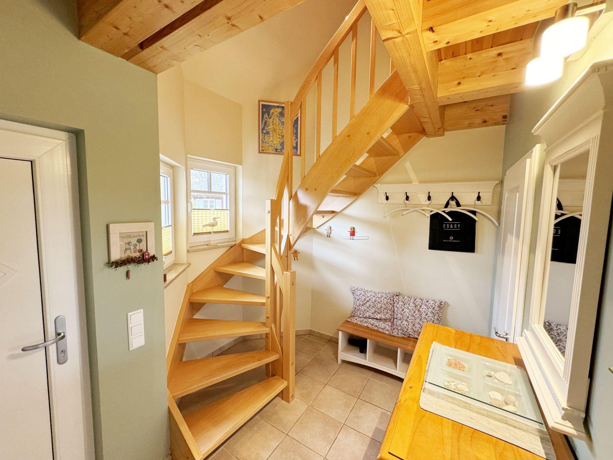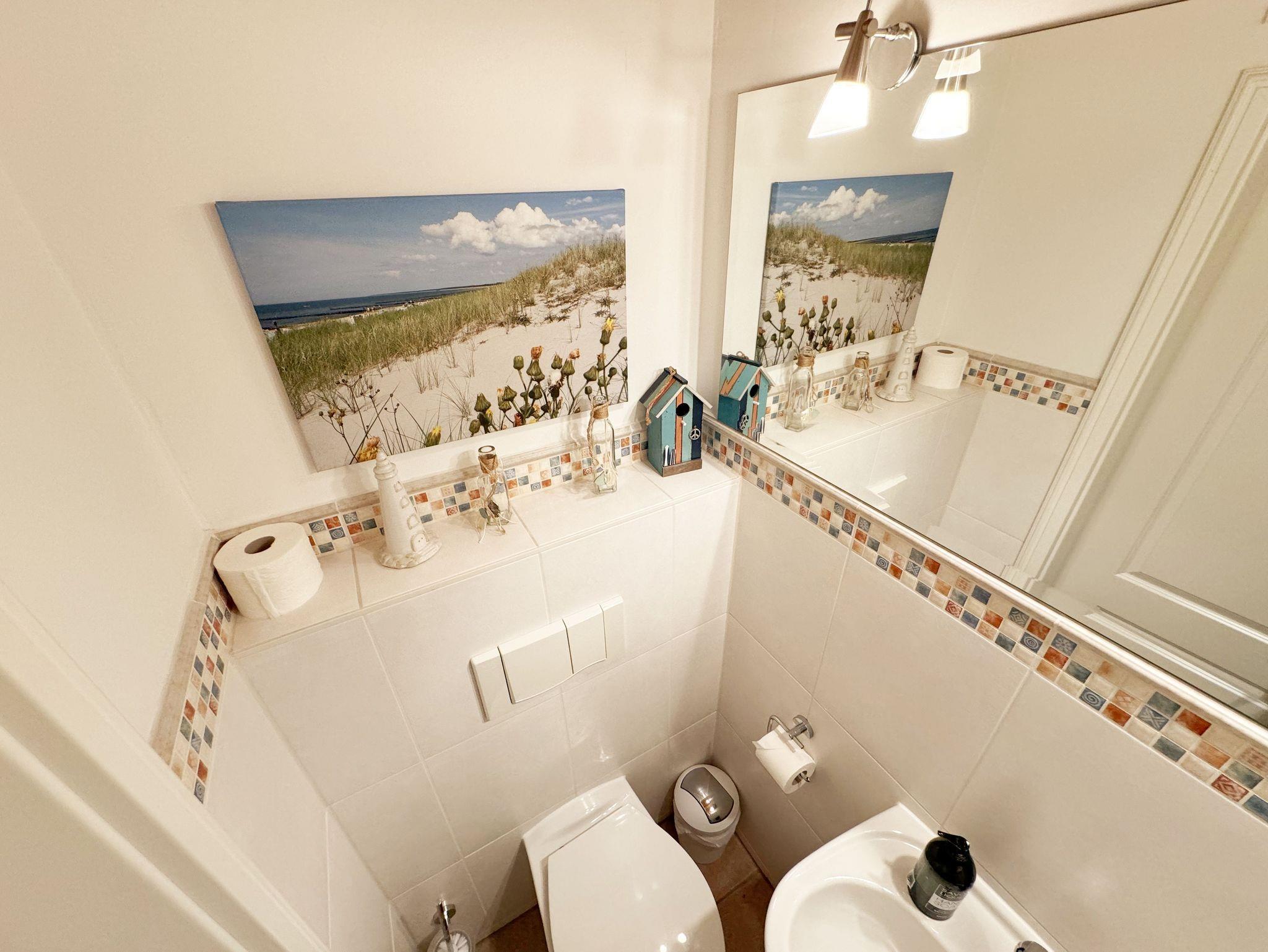 Die 70 qm große Doppelhaushälfte (Nichtraucher) für 2 bis 5 Personen und 1 Kleinkind bis 3 Jahre im Kinderreisebett, wurde mit viel Liebe zum Detail ausgestattet und eingerichtet. Die Haushälfte verläuft über 2 Etagen und besteht im Erdgeschoss aus einem großzügigen Wohn-/Essbereich mit einer vollausgestatteten Küchenzeile sowie einem Gäste-WC. Im Obergeschoss finden Sie 2 separate Schlafräume, das große Badezimmer und einen Abstellraum. Der helle Wohnbereich mit Couchecke (Aufbettungsmöglichkeit für eine 5. Person/1,30m x 1,90m), Couchtisch, Leselampe, ein Bücherregal mit kleiner Buchauswahl, ein großer Smart-TV im TV-Schrank mit DVD-Player und eine kleine Musikanlage sorgen für Ihre Unterhaltungsmöglichkeiten. Ein kostenfreier WLAN-Zugang (250 Mbit/S) steht Ihnen auch zur Verfügung. Die angrenzende Küchenecke lässt mit einem Backofen, Ceran-Kochfeld, Geschirrspüler, Kühlschrank mit Eisfach, Kaffeemaschine, Senseo Padmaschine, Wasserkocher, Toaster, weiteren praktischen Helfern sowie einen Essplatz mit 5 Stühlen keine Wünsche offen. Auf gleicher Ebene finden Sie auch das Gäste-WC. Von der bestuhlten Terrasse (Süd/West) mit Strandkorb gelangen Sie in einen separaten Abstellraum mit Waschmaschine/Trockner (inklusive), Bügelbrett, Bügeleisen, Staubsauger und Reinigungsutensilien. Im Obergeschoss befinden sich beide Schlafzimmer. Das größere verfügt über ein Doppelbett (2,00 m x 2,00 m), Nachttischkonsolen, einen Kleiderschrank und eine Kommode mit Flachbild-TV. Das kleinere Schlafzimmer wird durch 2 Einzelbetten (á 0,90 m x 2,00 m) und eine Kommode mit Flachbild-TV abgerundet. Alle Betten wurden mit Komfort Kaltschaum - Matratzen und verstellbaren Lattenroste ausgestattet sowie Insektenschutzgittern. Das großzügige Tageslichtbad wird durch eine Dusche, WC, Waschtisch mit Spiegelschrank, Kosmetikspiegel, Fön und Badezimmermöbel komplettiert. Alle Räumlichkeiten können durch Rollläden verdunkelt werden. Hochwertige Steinzeugfliesen wurden im Erdgeschoss verlegt und im Bad sowie in den Schlafräumen massive Holzdielen. Einen PKW-Stellplatz finden Sie im Carport, wo auch bei Bedarf dahinter ein 2. Stellplatz genutzt werden kann. Ein verschlossener Abstellraum für Ihre mitgebrachten oder geliehenen Fahrräder befindet sich am Carport. Haustiere sind nicht erlaubt. Die Erstausstattung eines Wäschepaketes (komplette Bettwäsche, 1 Duschhandtuch, 1 kleines Handtuch) können Sie bis 14 Tage vor Anreise gegen einen Aufpreis dazu buchen oder durch eigene ergänzen. Ab 2 gebuchten Paketen erhalten Sie einmalig 1 Geschirrhandtuch und 1 Duschvorleger hinzu.