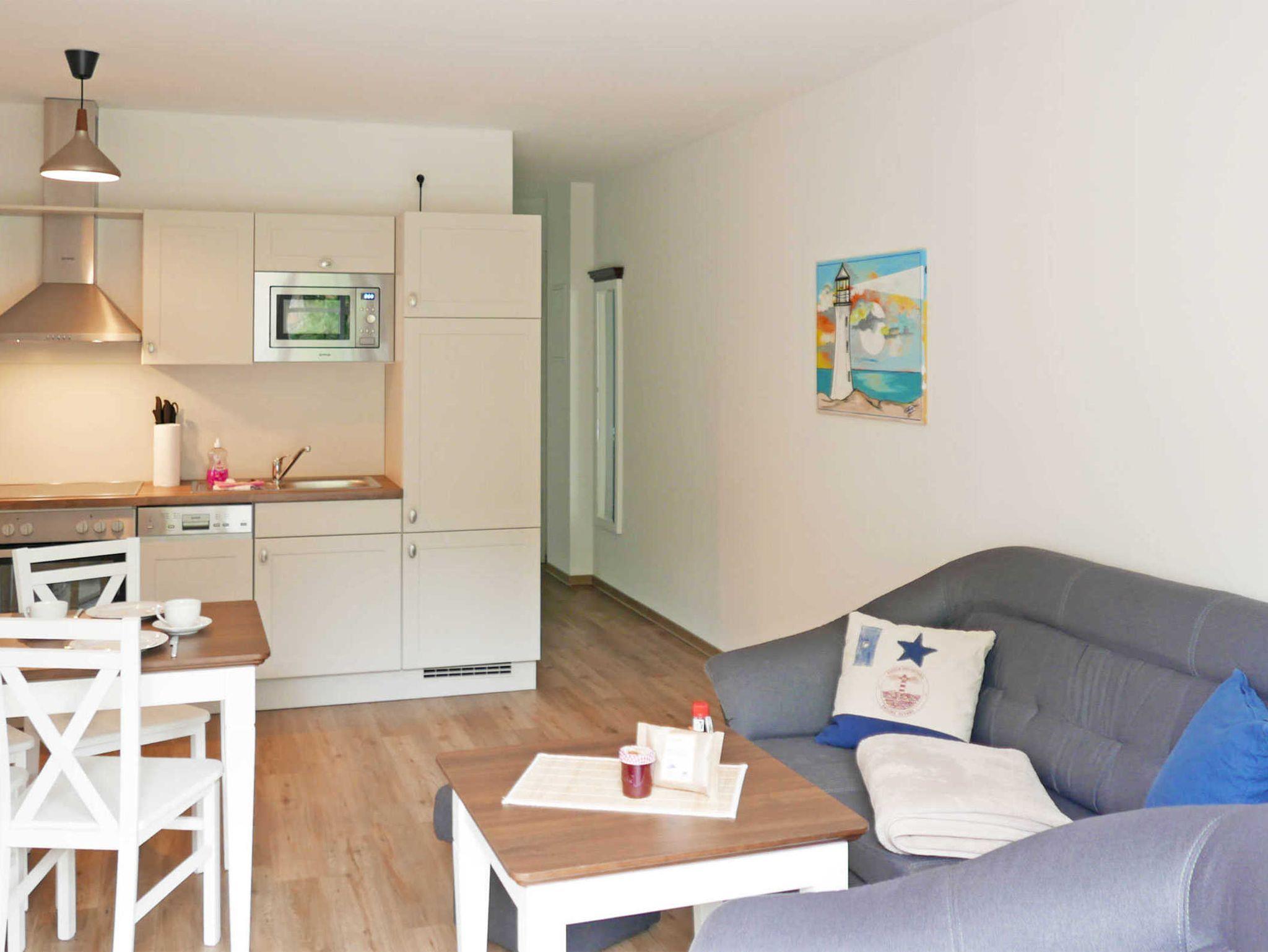 Die offene Küche ist ausgestattet mit 4-Plattenherd, Kühlschrank mit Gefrierfach, Mikrowelle sowie Geschirrspülmaschine.