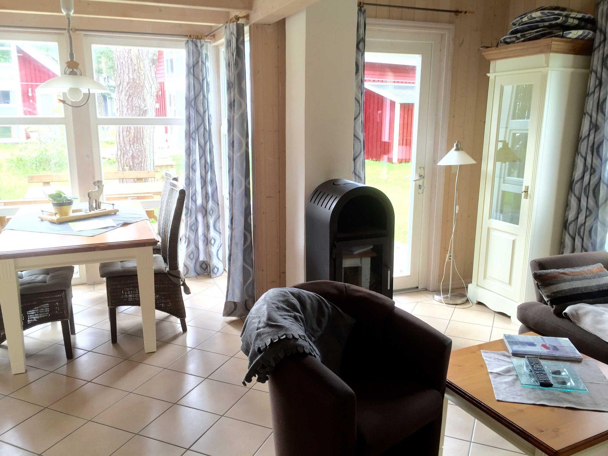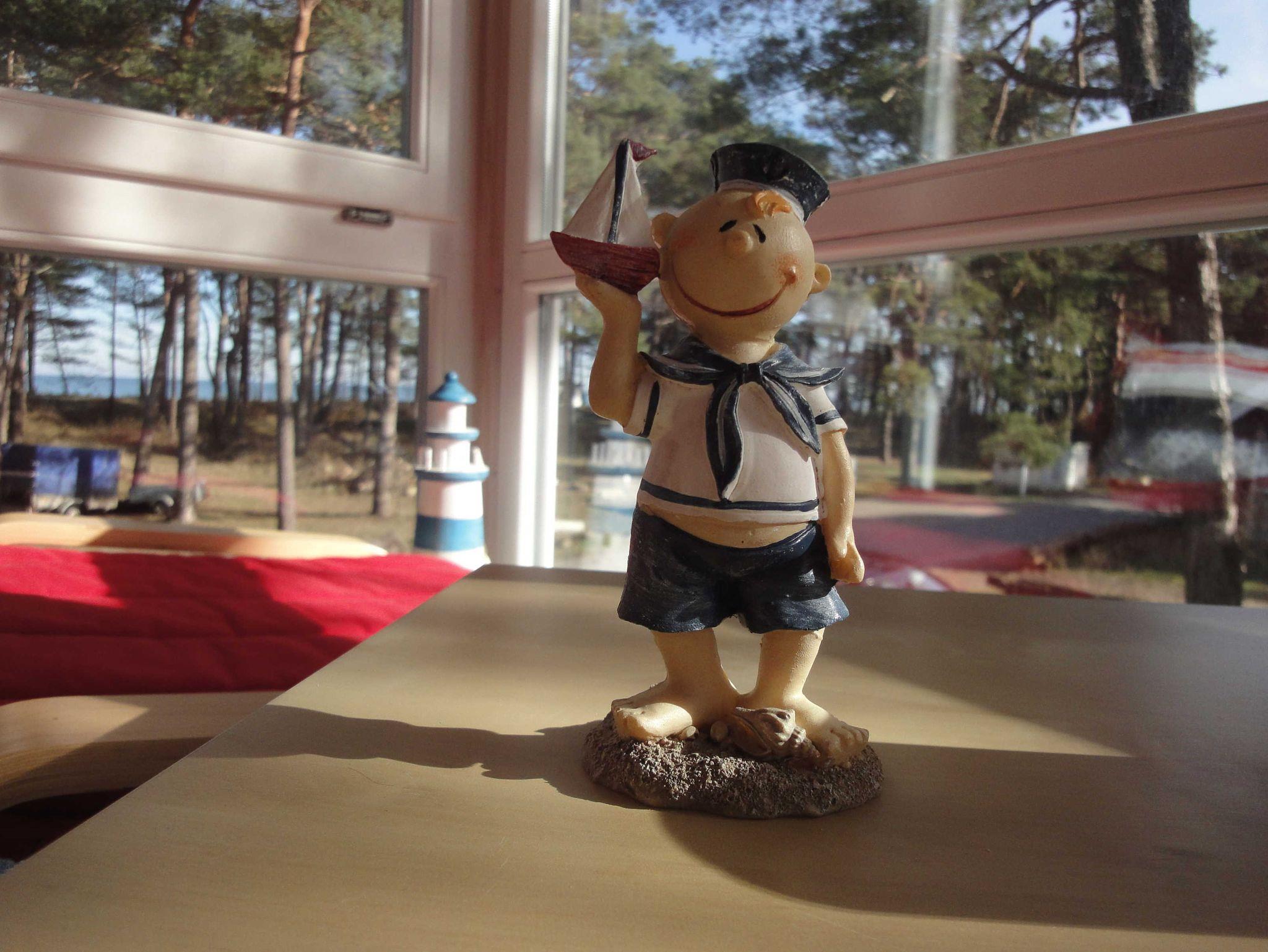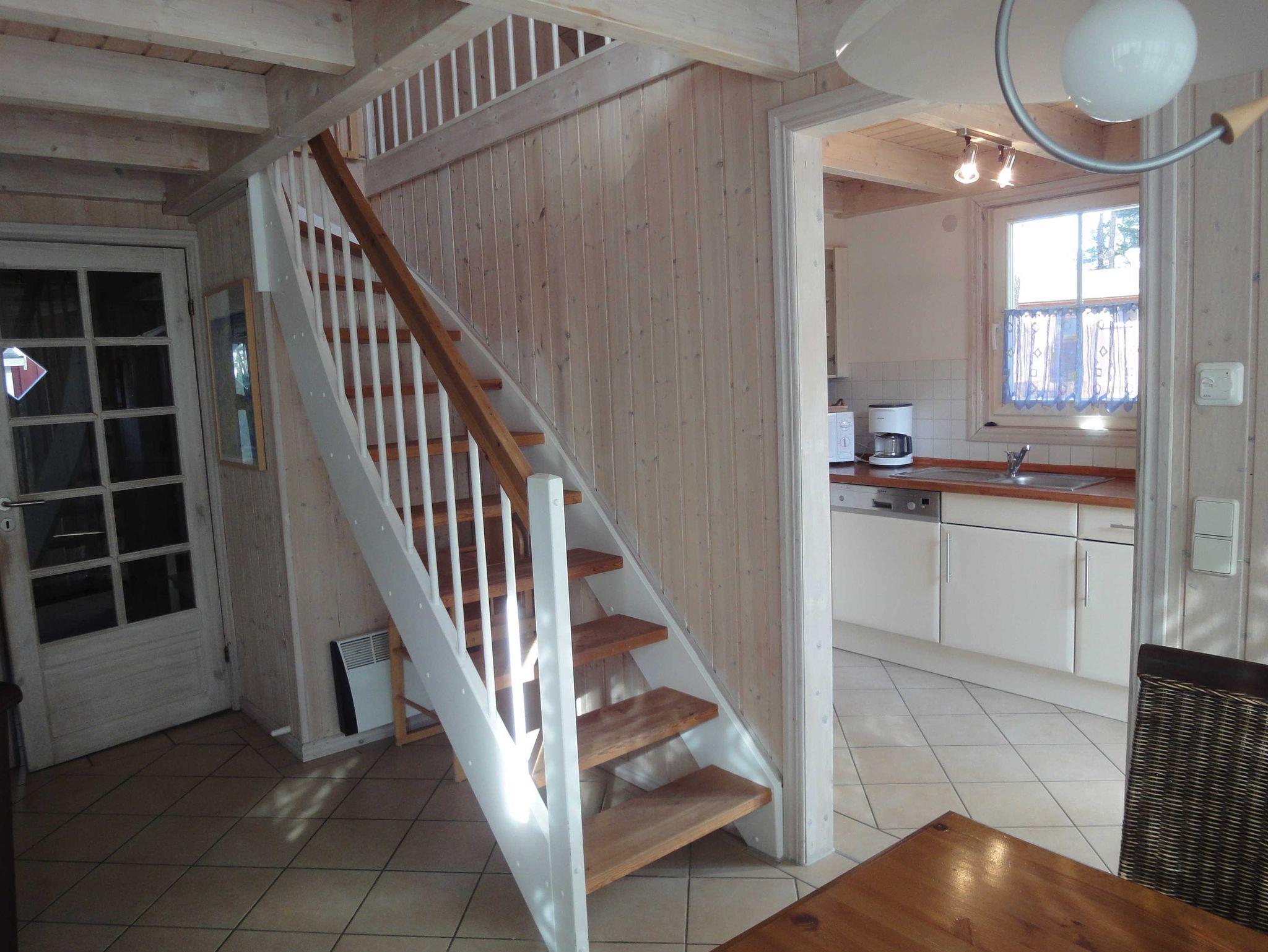 Im Erdgeschoss befinden sich Flur, Wohn/Esszimmer mit Kaminofen, voll ausgestattete Küche, erstes Schlafzimmer mit Doppelbett und ein großes Bad mit WC, Waschplatz, Dusche, Badewanne, Sauna und Waschmaschine. Über eine Treppe gelangen Sie auf die Galerie und in das zweite Schlafzimmer, welches mit zwei Einzelbetten und einem Kinderbett ausgestattet ist. Die Sitzecke auf der Galerie lädt zum Verweilen ein, genießen Sie den Blick auf die Ostsee.
