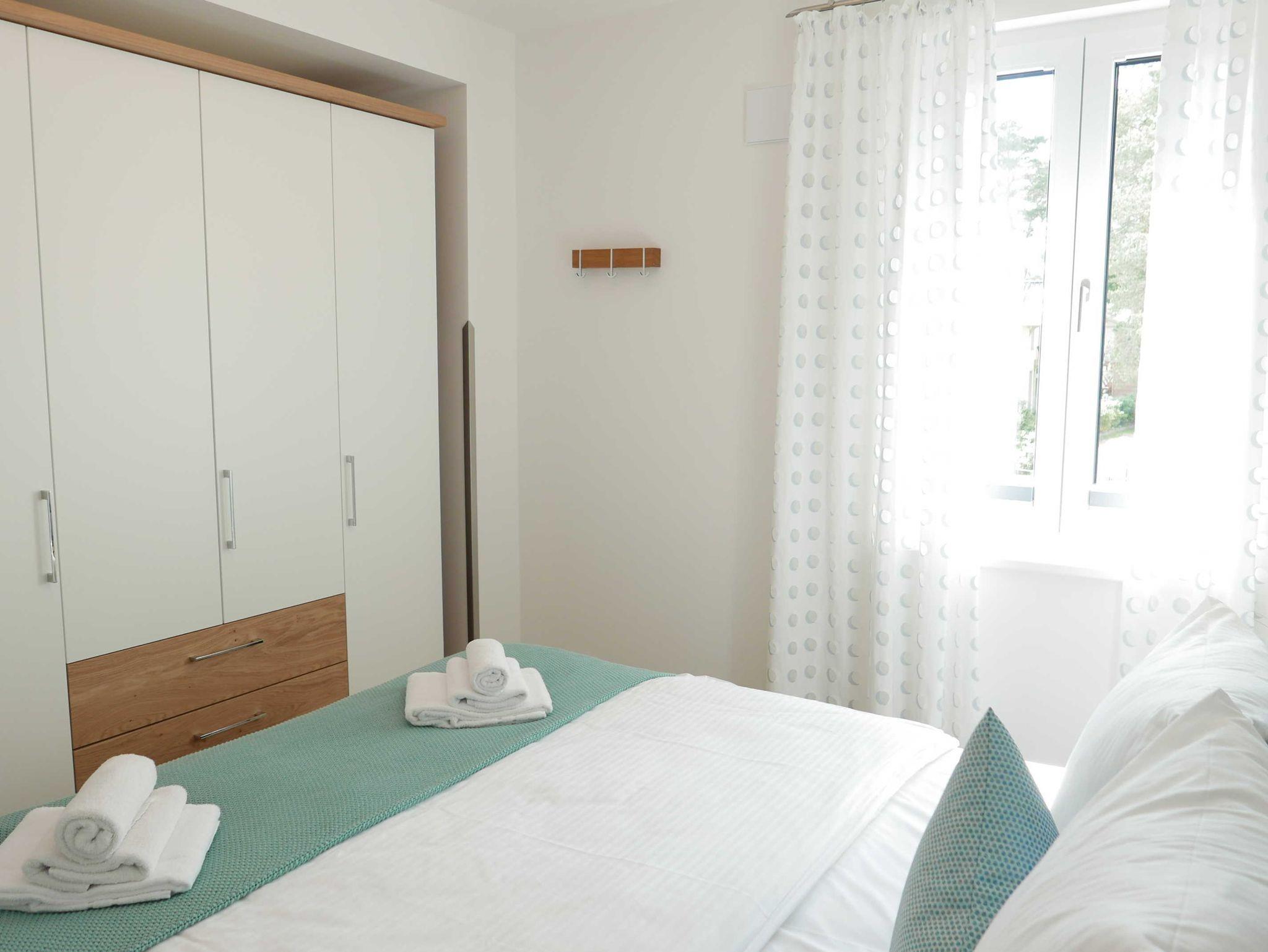 Helle Luxuswohnung mit Meerblick und Parkplatz mit Stromanschluss in der Villa Düne im Villen-Ensemble Baabe. Die Wohnung liegt in der 2. Etage und bietet mit ca. 65qm viel Platz für eine Familie oder 2 Paare. Es gibt 2 Schlafzimmer, die jeweils auch einen Fernseher haben sowie ein extra Gäste-WC In allen Räumen sorgt eine Fußbodenheizung für wohlige Wärme. Vom Balkon hat man einen schönen seitlichen Meerblick.
