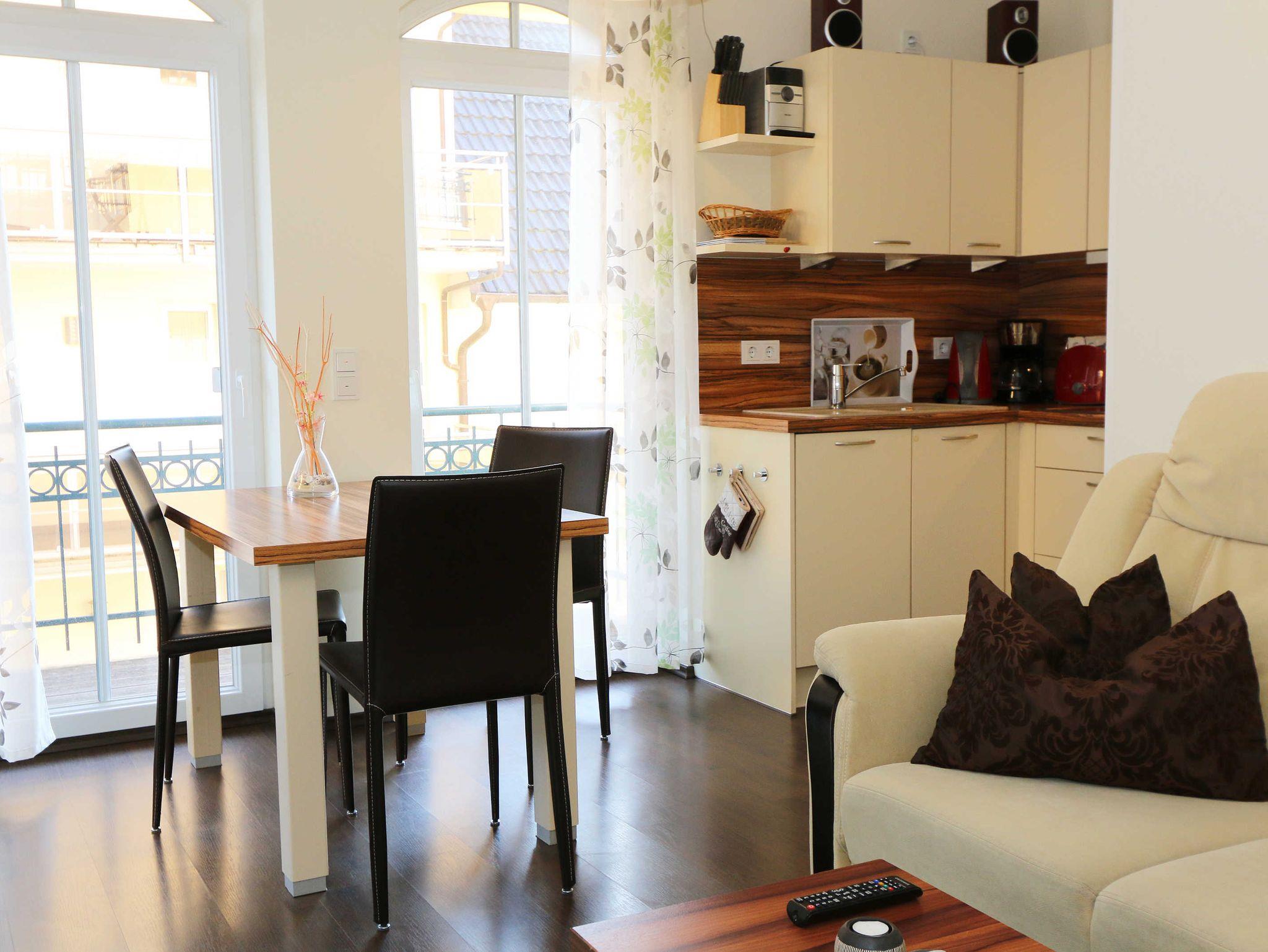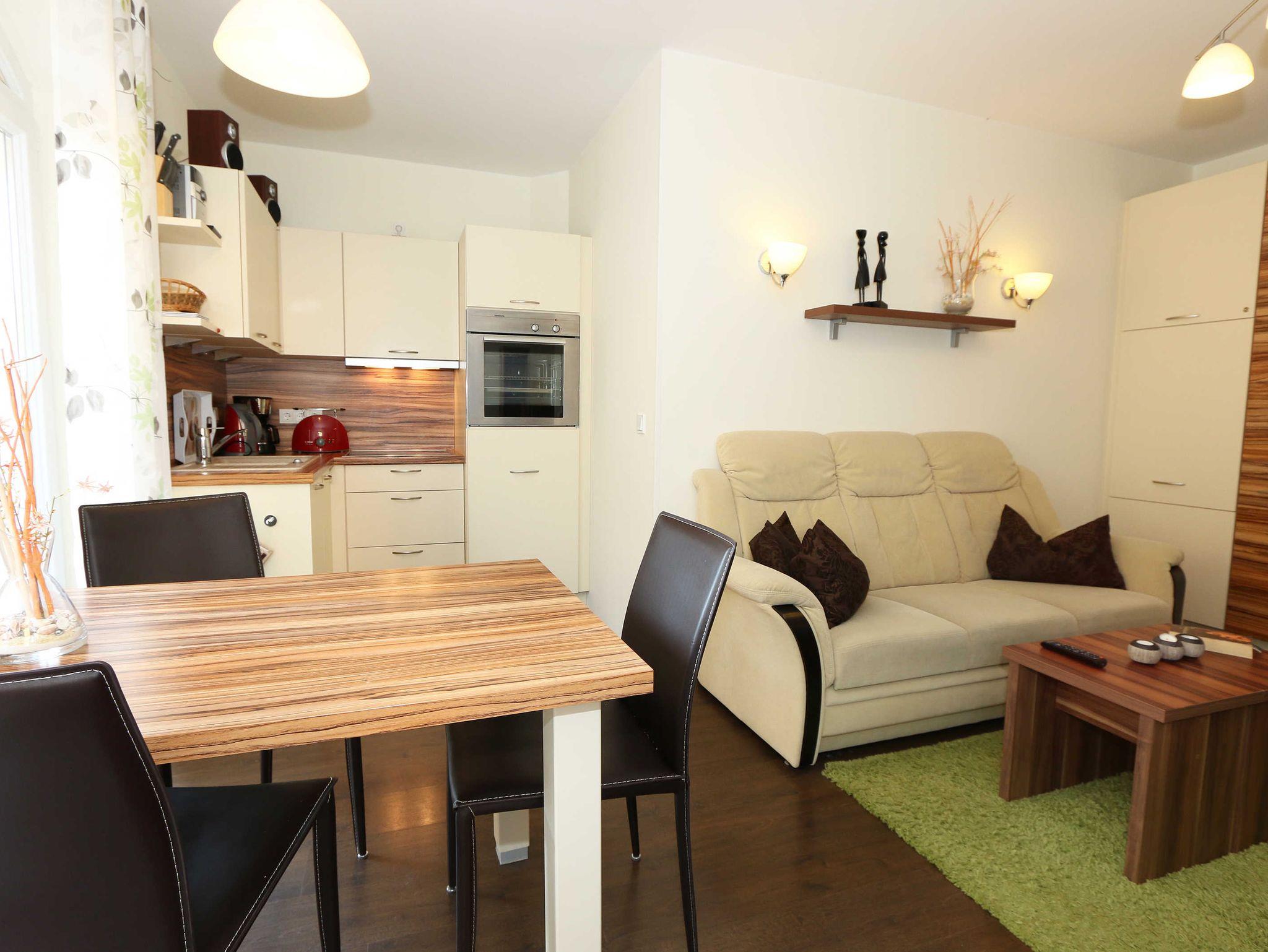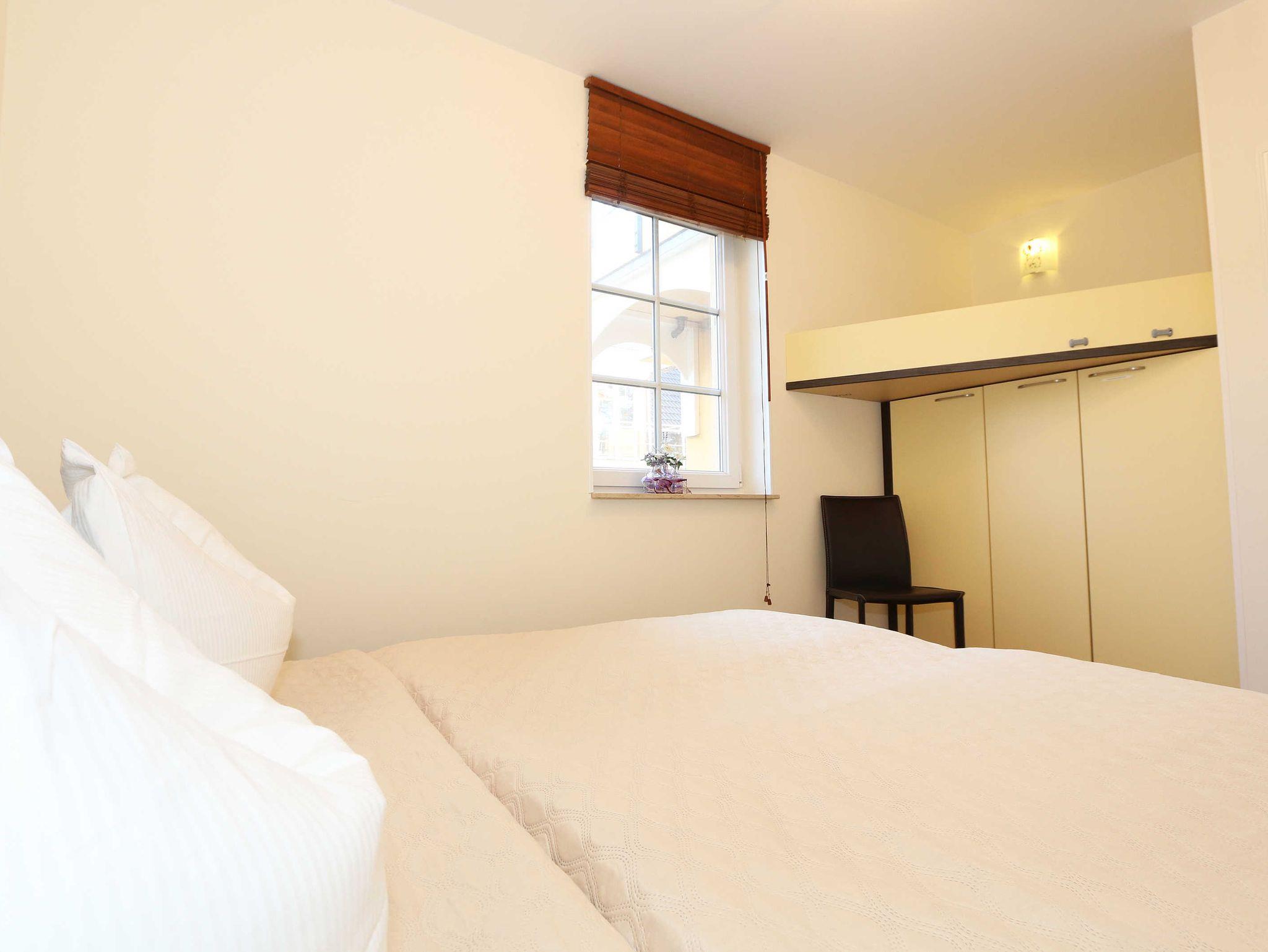 Die Nichtraucherwohnung hat eine Nutzfläche von etwa 40 qm, ist für max. 2 Personen + 1 Kind bis 10 Jahre (1,40 m Länge) eingerichtet und befindet sich im 1.OG in der Kurparkresidenz welche Sie durch den Fahrstuhl bequem erreichen. Freuen Sie sich auf eine Wohnung, die komplett mit Laminat und mit einer Fußbodenheizung ausgestattet ist. Durch die großen bodentiefen Glasfenster, bzw. ?Türen bekommt die Wohnung viel Tageslicht. Das Wohnzimmer verfügt über eine Couch mit Couchtisch, Smart-TV, Blu- Ray-Player und einer integrierten Küchenzeile mit Geschirrspüler, Keramikspüle, Ceranfeld, Backofen, Kühlschrank mit Gefrierfach, Kaffeemaschine, Toaster & Wasserkocher. Wlan ist für Sie inklusive. Das Schlafzimmer besteht aus einem Boxspringbett (1,60m x 2,00m), 1 Hochbett und einem Kleiderschrank sowie Insektenschutzgitter. Das innenliegende Bad ist mit einer Dusche, WC und Fön ausgestattet. Auf einem der beiden Balkone (ein Balkon überdacht -Loggia) können Sie schon morgens die Sonne genießen. Durch die Strandkiefern des Kurparks hindurch hat man teilweise Meerblick. Bei der Einrichtung haben wir viel Wert auf hochwertige Materialien gelegt und auf eine angenehme Atmosphäre geachtet, denn Sie haben Urlaub und sollen sich wohl fühlen. Haustiere sind nicht erlaubt. Im Keller des Hauses befindet sich eine Waschmaschine und ein Trockner, der gegen Gebühr genutzt werden kann. Zur Wohnung gehört ein Tiefgaragenstellplatz (Einfahrtshöhe 1,95m /Nr. 08). Die Erstausstattung eines Wäschepaketes (komplette Bettwäsche, 1 Duschhandtuch, 1 kleines Handtuch) können Sie bis 14 Tage vor Anreise gegen einen Aufpreis dazu buchen oder durch eigene ergänzen. Ab 2 gebuchten Paketen erhalten Sie einmalig 1 Geschirrhandtuch und 1 Duschvorleger hinzu.