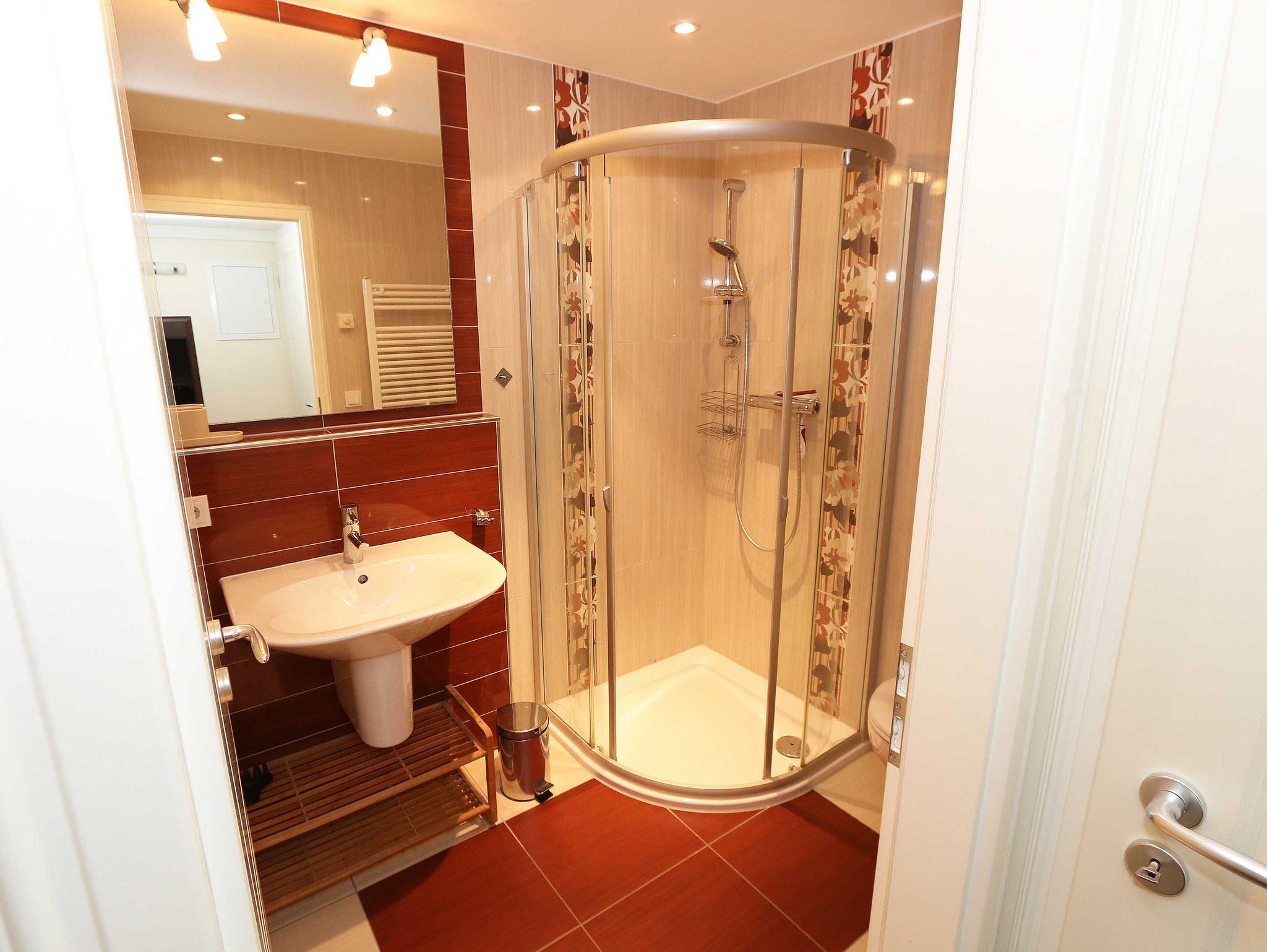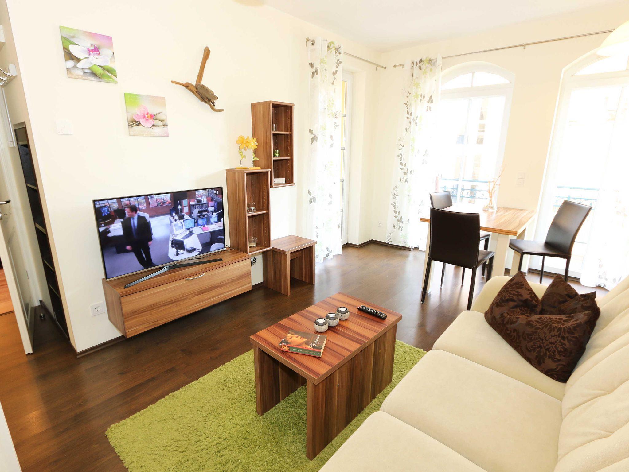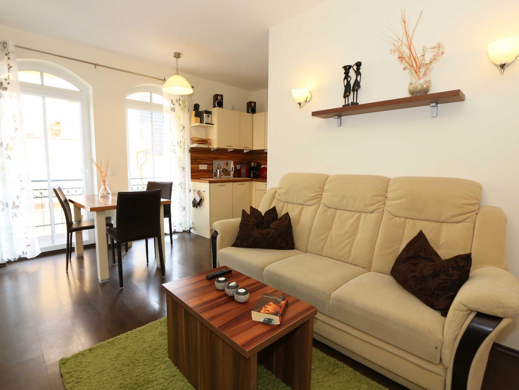 Die Nichtraucherwohnung hat eine Nutzfläche von etwa 40 qm, ist für max. 2 Personen + 1 Kind bis 10 Jahre (1,40 m Länge) eingerichtet und befindet sich im 1.OG in der Kurparkresidenz welche Sie durch den Fahrstuhl bequem erreichen. Freuen Sie sich auf eine Wohnung, die komplett mit Laminat und mit einer Fußbodenheizung ausgestattet ist. Durch die großen bodentiefen Glasfenster, bzw. ?Türen bekommt die Wohnung viel Tageslicht. Das Wohnzimmer verfügt über eine Couch mit Couchtisch, Smart-TV, Blu- Ray-Player und einer integrierten Küchenzeile mit Geschirrspüler, Keramikspüle, Ceranfeld, Backofen, Kühlschrank mit Gefrierfach, Kaffeemaschine, Toaster & Wasserkocher. Wlan ist für Sie inklusive. Das Schlafzimmer besteht aus einem Boxspringbett (1,60m x 2,00m), 1 Hochbett und einem Kleiderschrank sowie Insektenschutzgitter. Das innenliegende Bad ist mit einer Dusche, WC und Fön ausgestattet. Auf einem der beiden Balkone (ein Balkon überdacht -Loggia) können Sie schon morgens die Sonne genießen. Durch die Strandkiefern des Kurparks hindurch hat man teilweise Meerblick. Bei der Einrichtung haben wir viel Wert auf hochwertige Materialien gelegt und auf eine angenehme Atmosphäre geachtet, denn Sie haben Urlaub und sollen sich wohl fühlen. Haustiere sind nicht erlaubt. Im Keller des Hauses befindet sich eine Waschmaschine und ein Trockner, der gegen Gebühr genutzt werden kann. Zur Wohnung gehört ein Tiefgaragenstellplatz (Einfahrtshöhe 1,95m /Nr. 08). Die Erstausstattung eines Wäschepaketes (komplette Bettwäsche, 1 Duschhandtuch, 1 kleines Handtuch) können Sie bis 14 Tage vor Anreise gegen einen Aufpreis dazu buchen oder durch eigene ergänzen. Ab 2 gebuchten Paketen erhalten Sie einmalig 1 Geschirrhandtuch und 1 Duschvorleger hinzu.