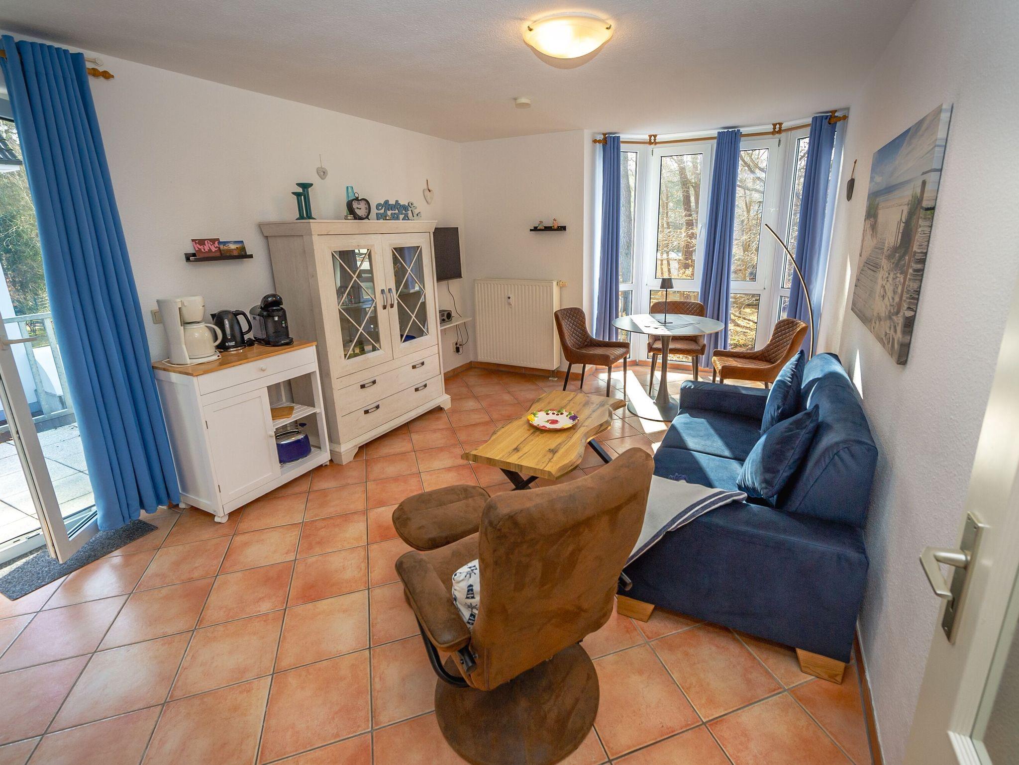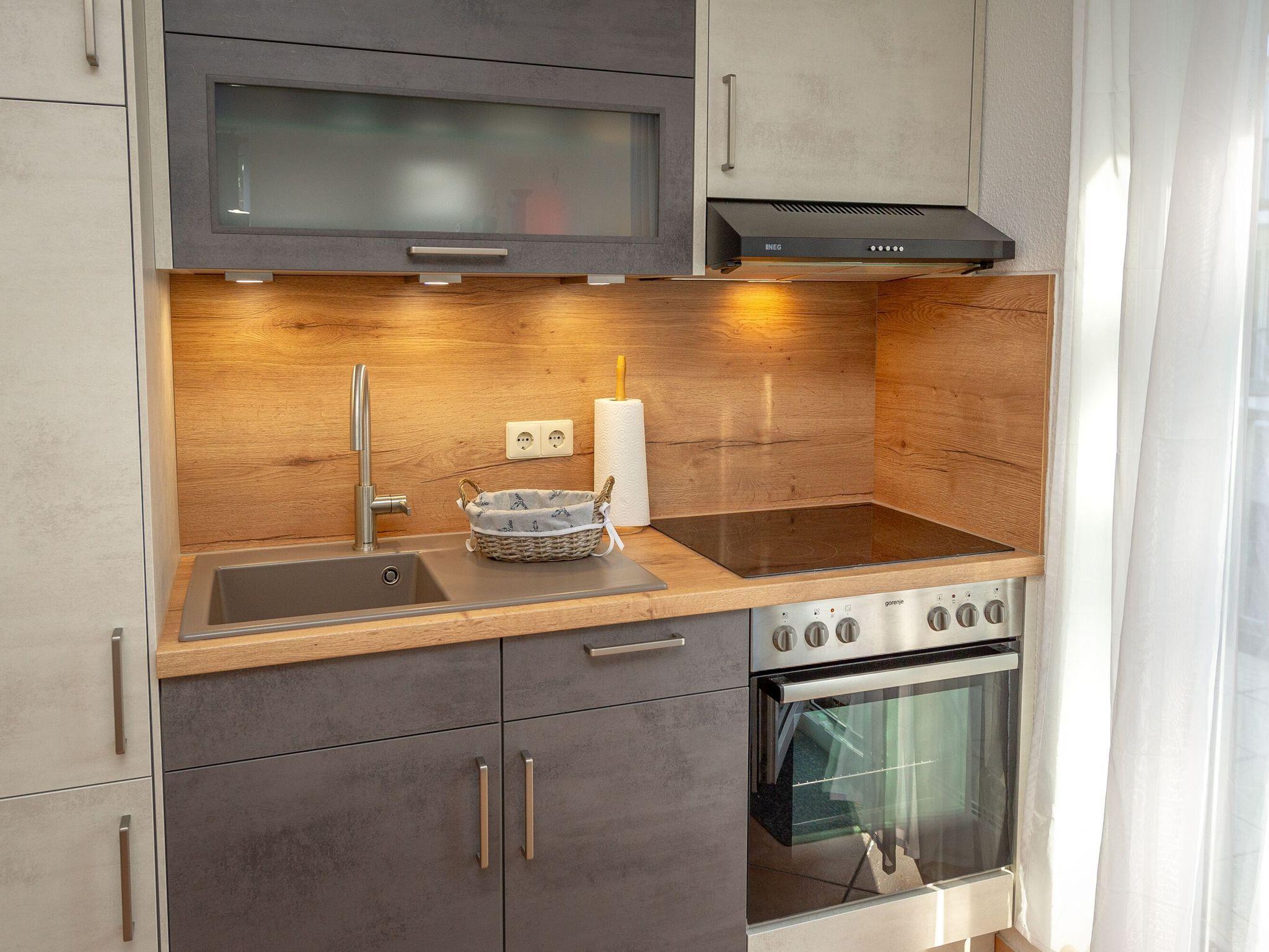 Das geräumige Wohn-/Esszimmer ist mit einer gemütlichen Couch, einem Relaxsessel, einem Flachbild-TV, Internetradio, einer Essecke und einer Küchenzeile eingerichtet. Hier stehen Ihnen u.a. ein Ceranherd inkl. Backofen, ein Kühlschrank mit Gefrierfach, eine Filterkaffee- und eine Tassimo-Kaffeemaschine, ein Wasserkocher, ein Toaster und diverses weiteres Kleininventar zur Verfügung. Einen Bäcker für die frischen Brötchen am Morgen gibt es direkt im Haus, auch zum nächsten Einkaufsmarkt ist es nicht weit.