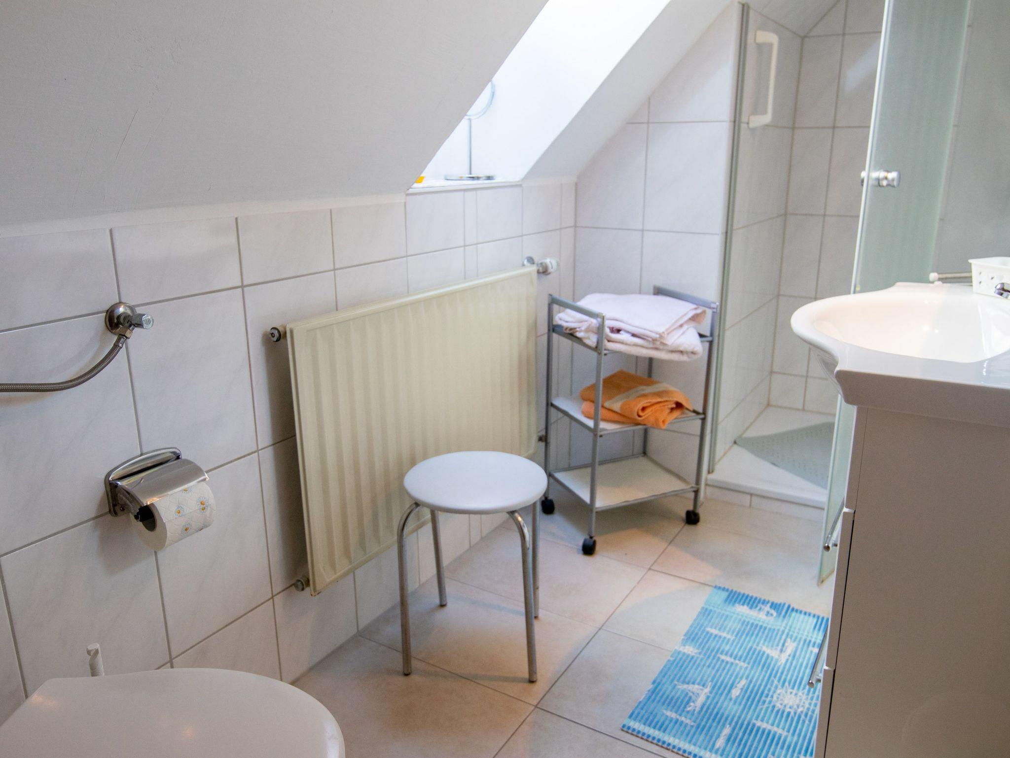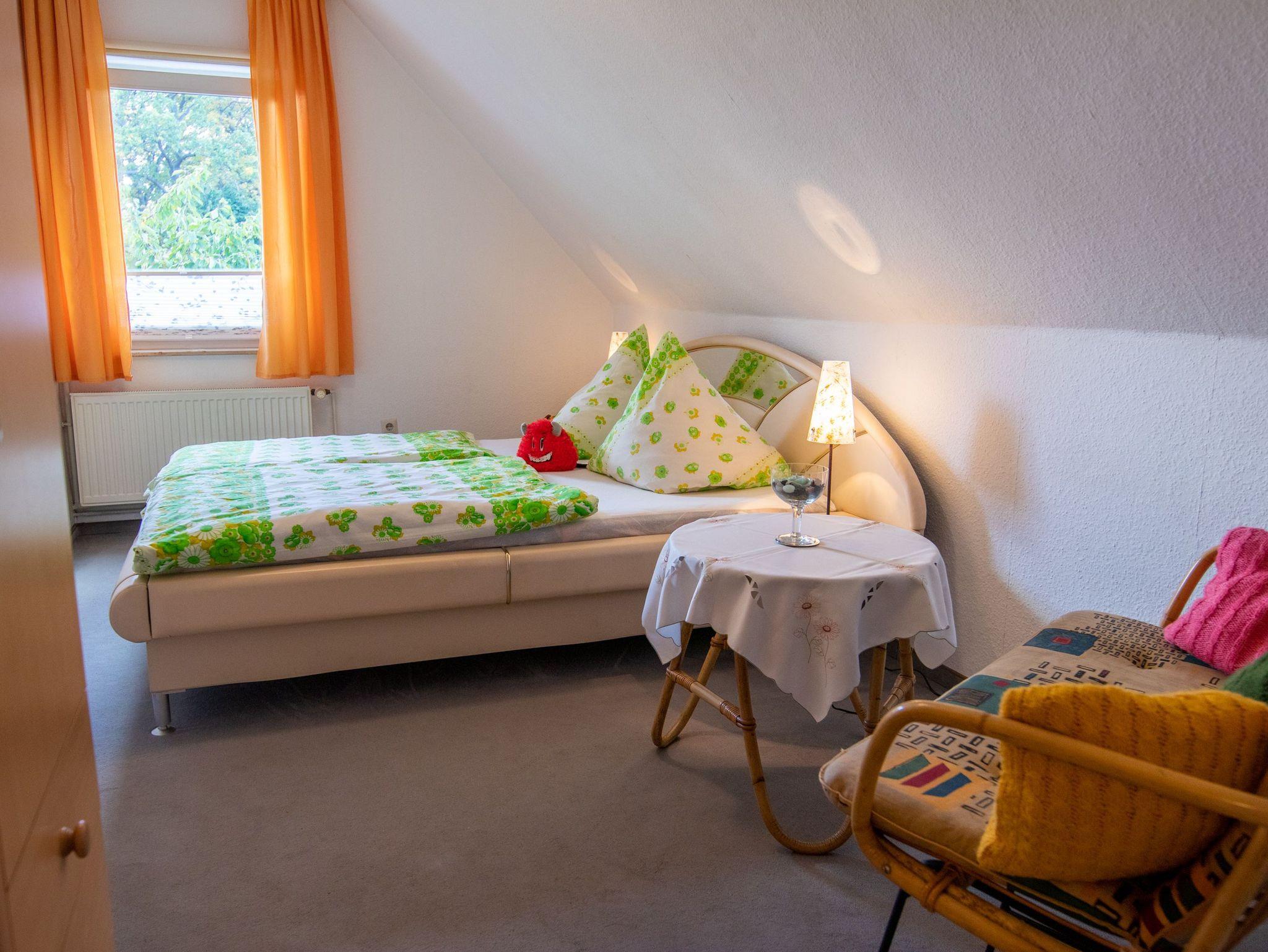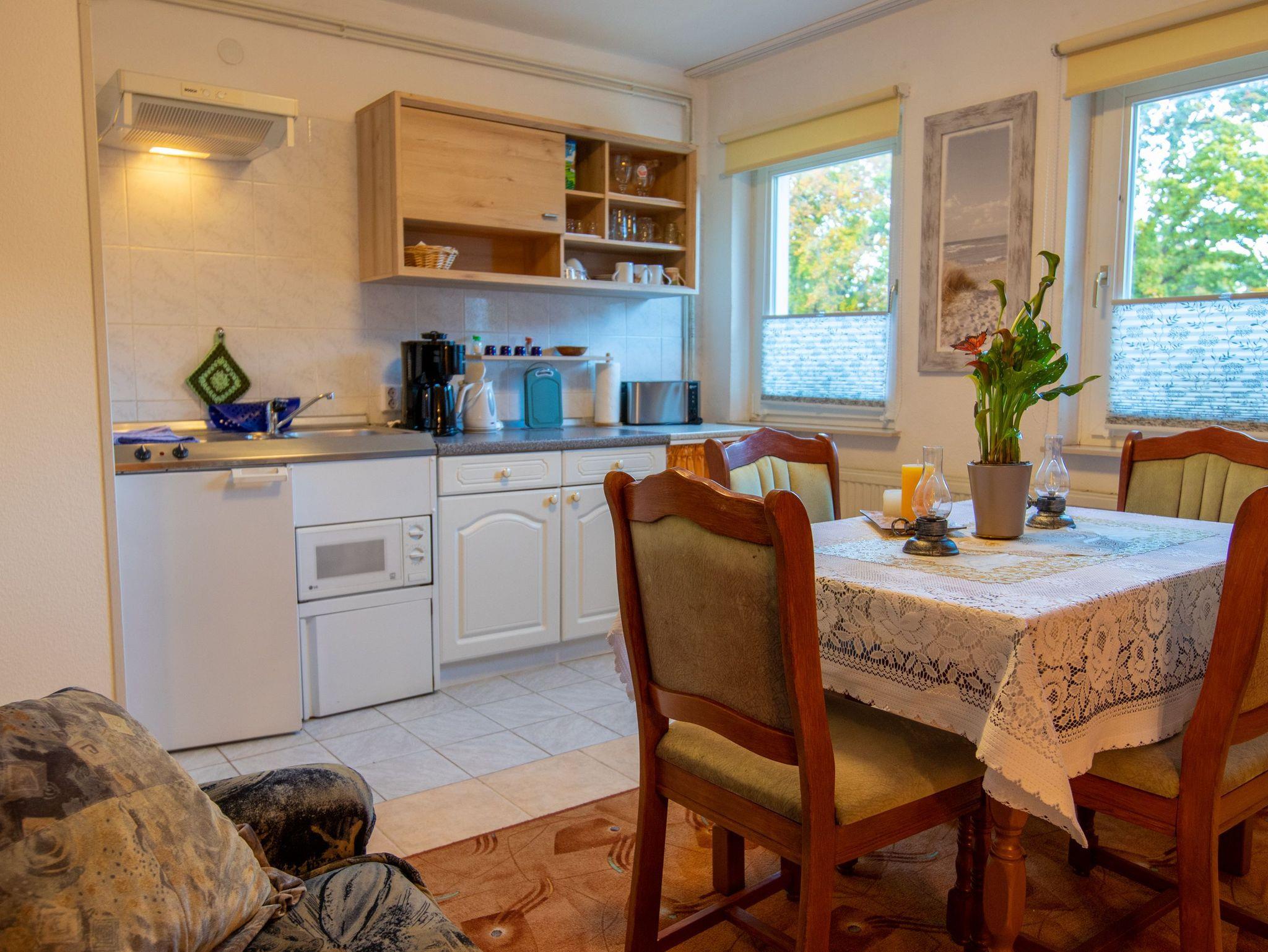 Die Ferienwohnung 2 im Haus Parchow im Ostseebad Baabe bietet bis zu 4 Personen Platz. Sie befindet sich im Dachgeschoss des Hauses der Vermieter und ist über eine separate Außentreppe zu erreichen. Auf 70 m² Wohnfläche verfügt die Ferienwohnung über 2 Schlafzimmer mit Doppelbetten (180x200) und eine offene Wohn-Küche mit Essbereich, Sofa und TV. Die Küchenzeile bietet den Gästen eine Kühlschrank mit Gefrierfach, ein Kochfeld, einen Minibackofen, Mikrowelle, Wasserkocher, Toaster sowie Küchenhelfer und Geschirr für den täglichen Bedarf. Das kleine Tageslicht-Bad ist mit einer Dusche und WC ausgestattet.