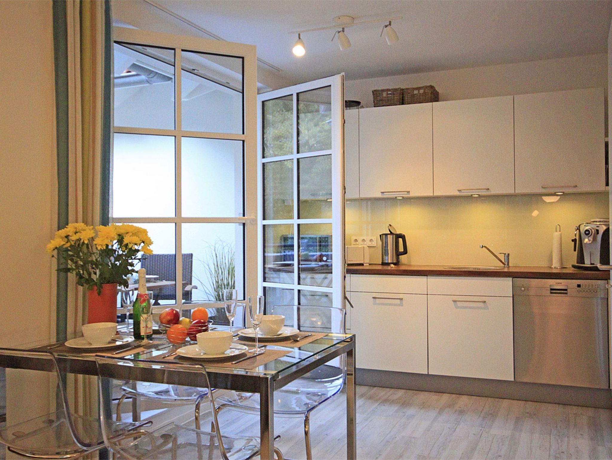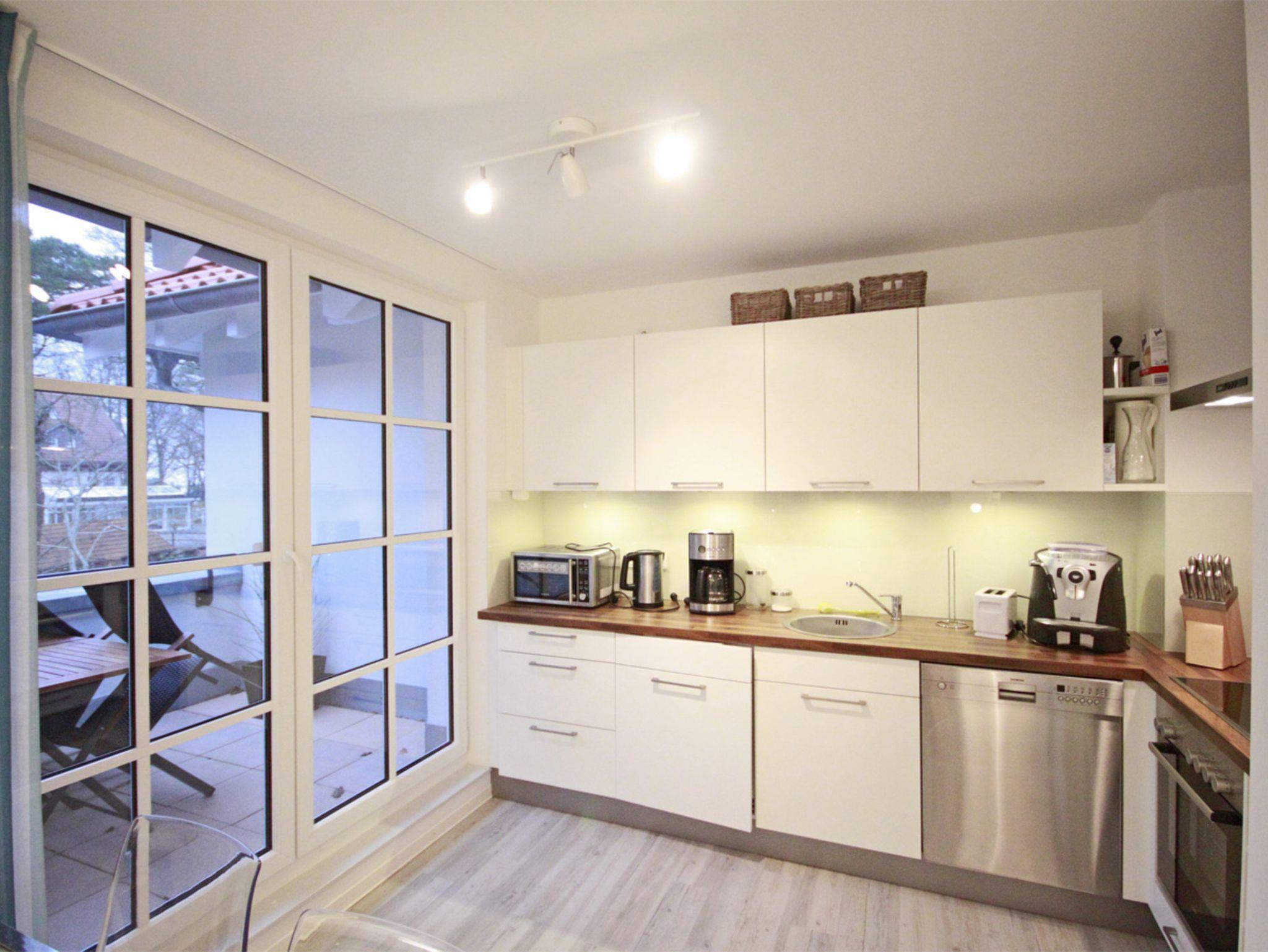 In den Wohn-/Essraum ist die offene Küche integriert. Sie bietet einen 4-Plattenherd mit Backofen, Geschirrspüler, Kühlschrank mit Gefrierfach, Mikrowelle, Toaster, Kaffeemaschine.