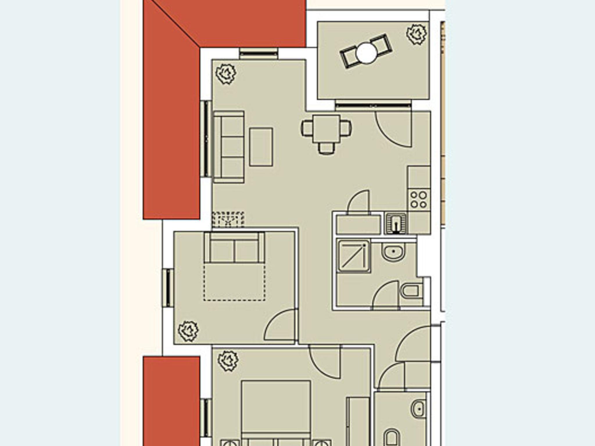 Die Nichtraucher-Unterkunft hat 2 Schlafzimmer - eines mit einem Doppelboxspringbett, eines mit 2 Einzelbetten - beide mit TV. Gegen einen einmaligen Aufpreis kann ein Babybett (für Kinder bis einschl. 2 Jahre) dazugestellt werden. Auch ein Hochstuhl kann dazugebucht werden.