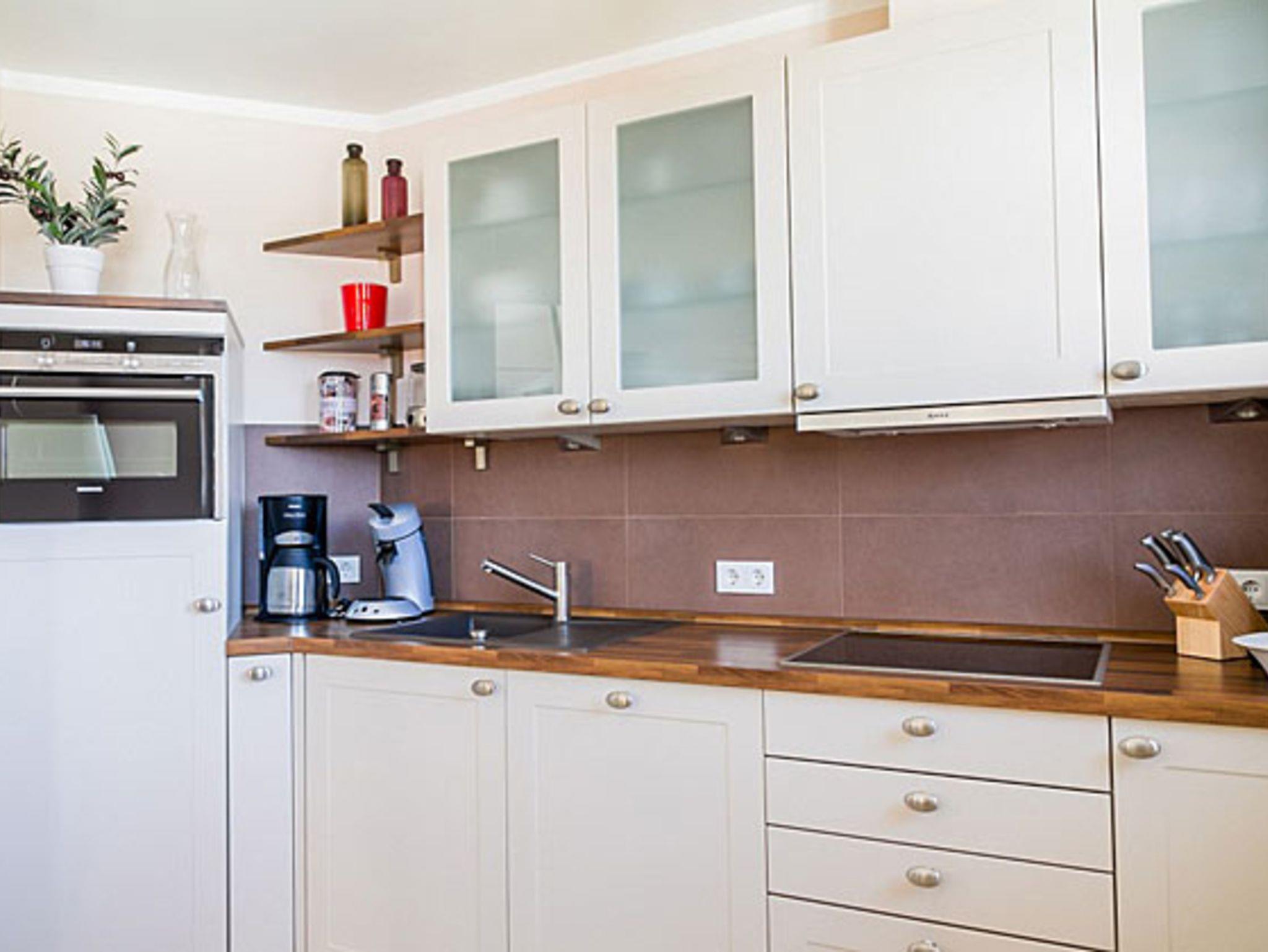 Die offene Küche - ebenfalls für 6 Personen eingerichtet - hat einen 4-Plattenherd (Ceranfeld), einen Kombimikrowellenbackofen, einen Kühlschrank mit Gefrierfach, Geschirrspüler, Toaster, Wasserkocher, Kaffeemaschine und eine Senseo-Kaffeemaschine. Der Dunstabzug über dem Herd hat Außenlüftung. Für gesellige Abende steht ein großer Esstisch im Wohnbereich.