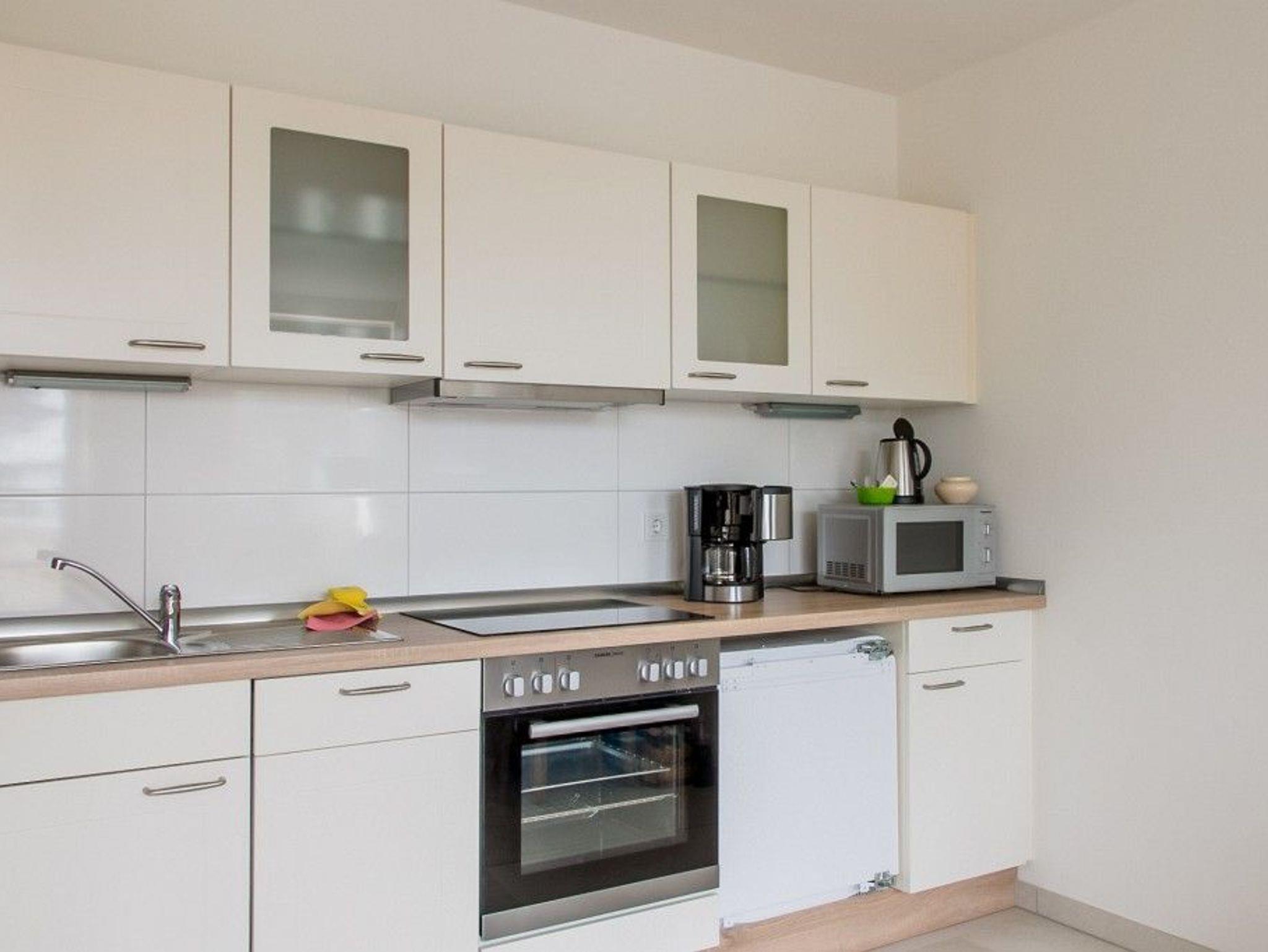 Die Küchenzeile ist modern mit 4-Platten-Ceranherd/Backofen, Kühlschrank/Gefrierfach, Geschirrspülmaschine, Kaffeemaschine, Toaster und Mikrowelle eingerichtet.