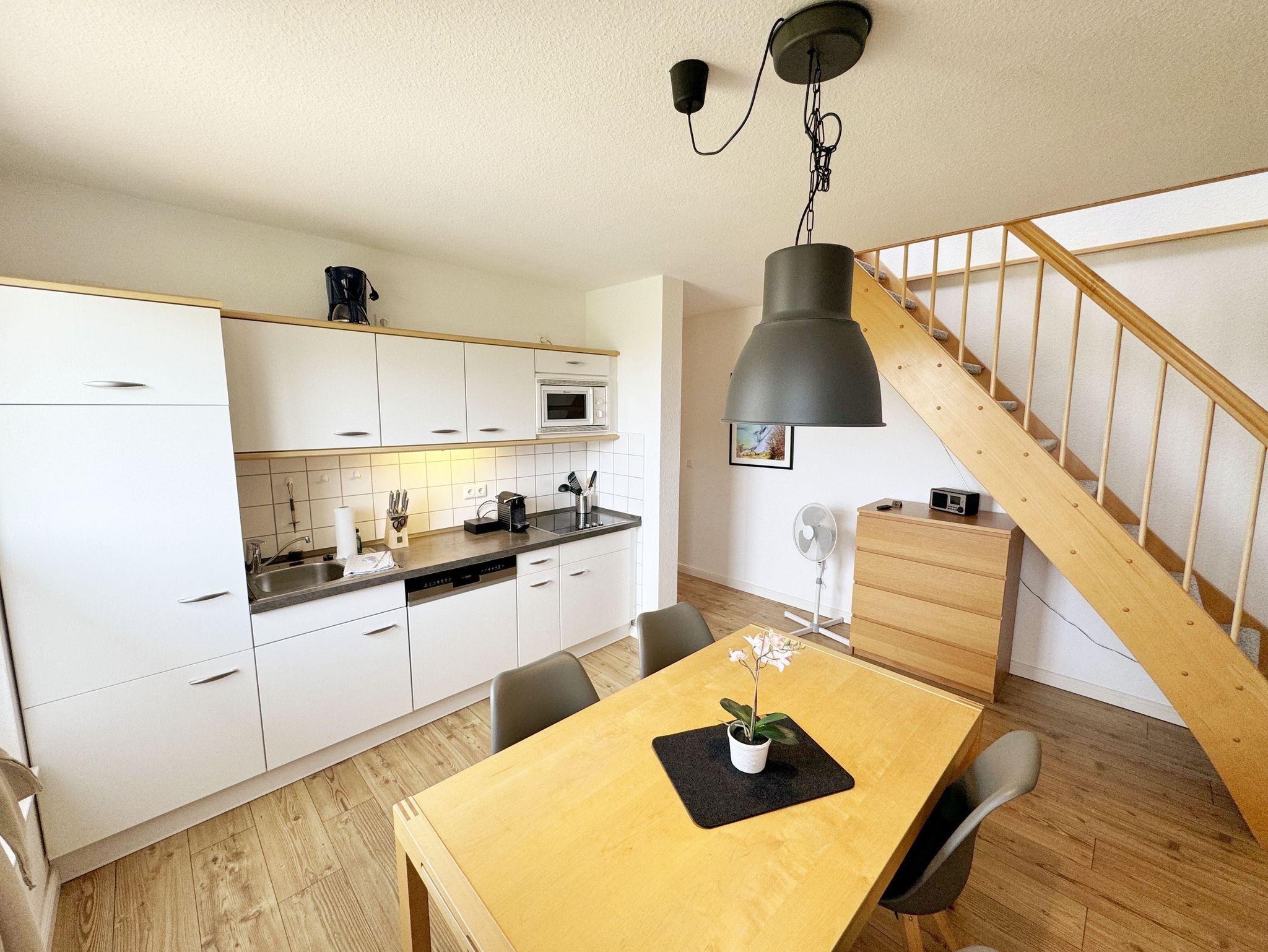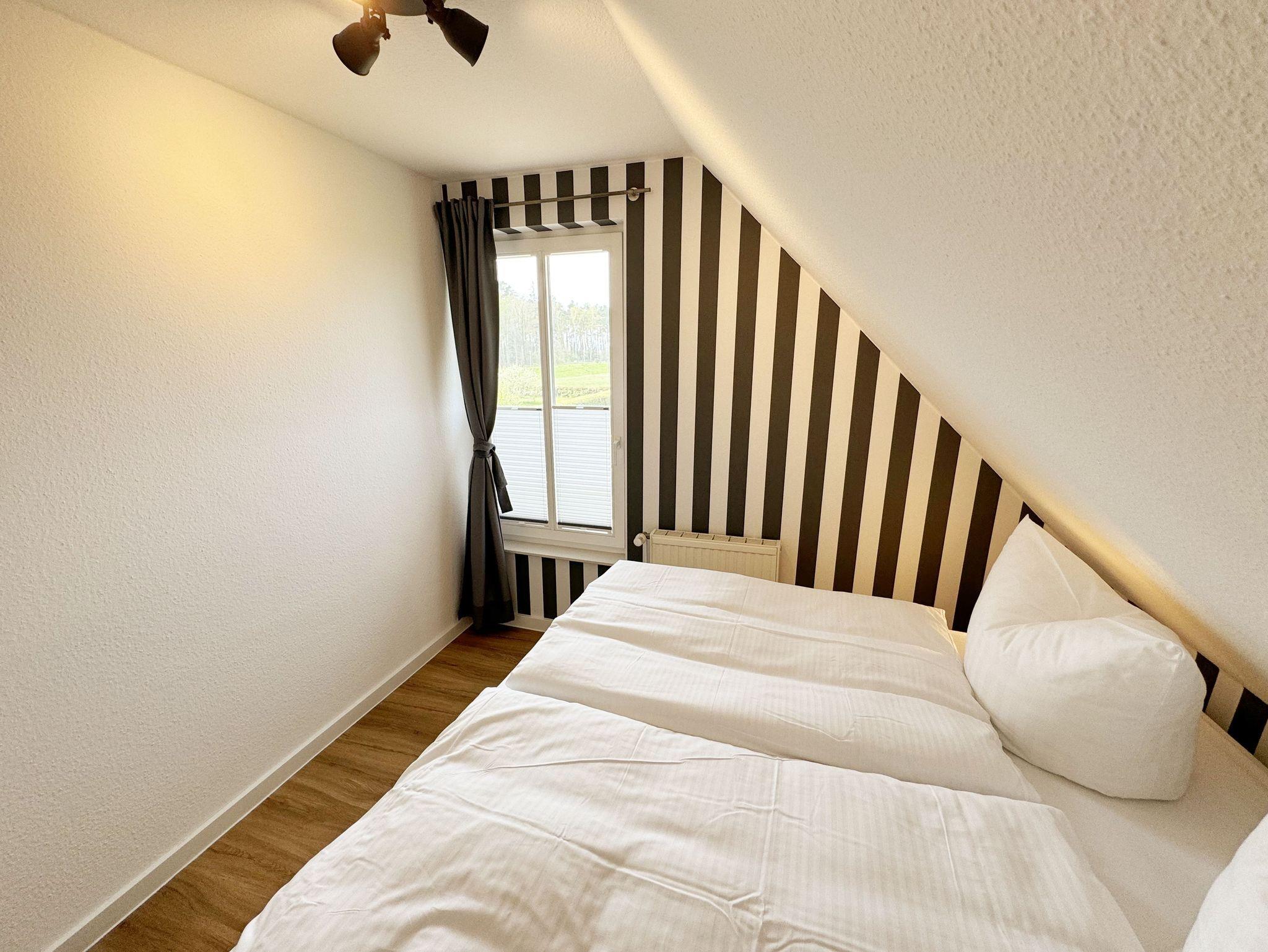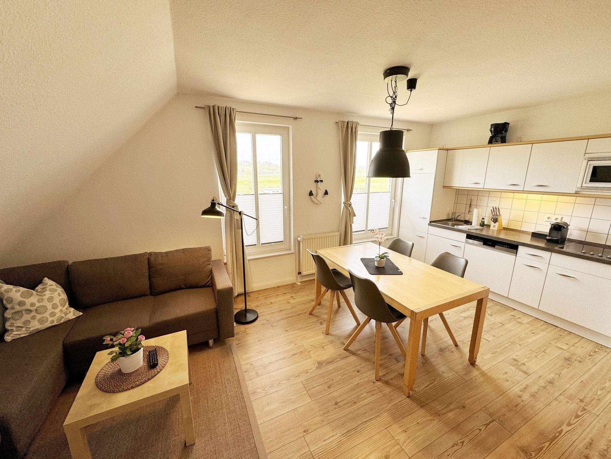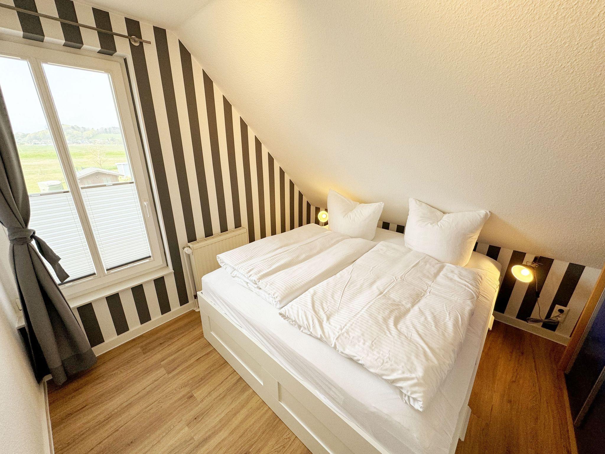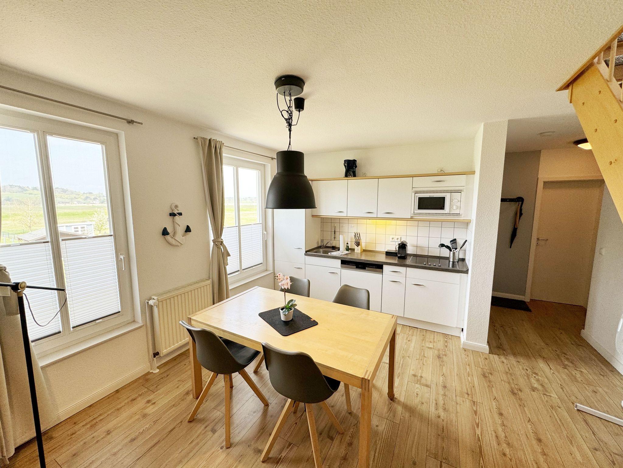 Die Ferienwohnung Fährmann`s Ausblick befindet sich im Obergeschoss des Gästehaus Am Brook. Der Name ist hier auch Programm, denn der Weitblick auf den Hafen von Baabe, Seedorf und zum Greifswalder Bodden ist traumhaft. Die 70 qm Nichtraucher-Maisonette-Wohnung ist modern und hell im skandinavischen Stil eingerichtet und bietet Platz für max. 4 Erwachsene und zwei Kleinkinder bis 3 Jahre im Kinderreisebett. Fotografien der Insel lassen Sie beim Eintreten auf der Insel ankommen. Über einen kleinen Flur mit Garderobe gelangen Sie direkt in den großen Wohn- und Essbereich mit Einbauküche. Die bodentiefen Fenster mit Absturzsicherung und Insektenschutzgittern haben Südausrichtung und sorgen für viel Tageslicht. Der Wohnbereich ist gemütlich gestaltet und lädt zum Entspannen ein. Es verfügt über eine bequeme Eckcouch mit variablem Fußteil, einen Couchtisch, eine Stehlampe und einen Sessel. Hier können Sie es sich gemütlich machen, einen Film auf dem 55-Zoll-Smart-TV genießen oder der Musik aus dem Bluetooth-Radio lauschen. Ein WLAN-Anschluss rundet den technischen Bereich ab. In dem Sideboard finden Sie ausreichend Stauraum für Ihre persönlichen Gegenstände. Zusätzlich befindet sich dort eine Spielesammlung für die ganze Familie sowie eine kleine Auswahl an Büchern. Die Einbauküche beinhaltet alles, was Sie zur Zubereitung Ihrer Mahlzeiten benötigen. Wie ein Induktionsherd, ein Kühlschrank mit Gefrierfach, eine Mikrowelle und ein Geschirrspüler. Darüber hinaus steht Ihnen sowohl eine Filter-Kaffeemaschine als auch eine Nespresso-Kapselmaschine, ein Wasserkocher, ein Toaster, ein Messerblock sowie viele Kochutensilien zur Verfügung. Ein Esstisch rundet den Küchenbereich ab. Von hier aus gelangen Sie über eine Treppe mit Treppenschutz in den oberen Schlafbereich. Hier befindet sich ein Doppelbett (1,80m x 2,00 m) mit Nachttischablagen, verstellbare Lattenroste und Leseleuchten, ein Kleiderschrank sowie Verdunklungsrollo´s und Insektenschutzgitter. Dazu ist ein Kinderbett (160 x 70 cm) vorhanden. Der Raum bietet die Möglichkeit noch ein Kinderbett (optional) zu stellen. Das untere Schlafzimmer der Ferienwohnung verfügt über ein komfortables Doppelbett (1,60m x 2,00m), Wand-Nachttischlampen, Insektenschutzgitter sowie ein Kleiderschrank. Die bodentiefen Fenster sind mit Verdunklungsvorhängen ausgestattet, um Ihnen einen erholsamen Schlaf zu ermöglichen. Das kompakte Tageslicht-Bad ist funktional gestaltet und verfügt über eine Eck-Dusche, ein Fön, ein WC, ein Insektenschutzgitter und ein Waschplatz. Eine Ablage bietet Platz für Kosmetikutensilien und ein beleuchteter Spiegel sorgt für die richtige Ausleuchtung. Ebenso finden Sie in Ihrer Wohnung ein Wäscheständer, Reinigungsutensilien und ein Standventilator vor. Wenn es Sie nach draußen zieht, so steht Ihnen ein 2500 qm großer Gemeinschaftsgarten zur Verfügung, der zum Verweilen einlädt. Dort finden Sie Strandkörbe Sitzgelegenheiten sowie einen Grillplatz, den Sie gemeinsam mit anderen Gästen nutzen können. Ein Haustier ist gegen eine Gebühr ein gern gesehener Gast. Ihre mitgebrachten oder geliehenen Fahrräder können Sie auf dem Grundstück abstellen. Ein PKW-Stellplatz befindet sich direkt am Haus. Die Erstausstattung eines Wäschepaketes (komplette Bettwäsche, 1 Duschhandtuch, 2 kleine Handtücher) können Sie bis 14 Tage vor Anreise gegen einen Aufpreis dazu buchen oder durch eigene ergänzen. Ab 2 gebuchten Paketen erhalten Sie einmalig 1 Geschirrhandtuch und 1 Duschvorleger hinzu.