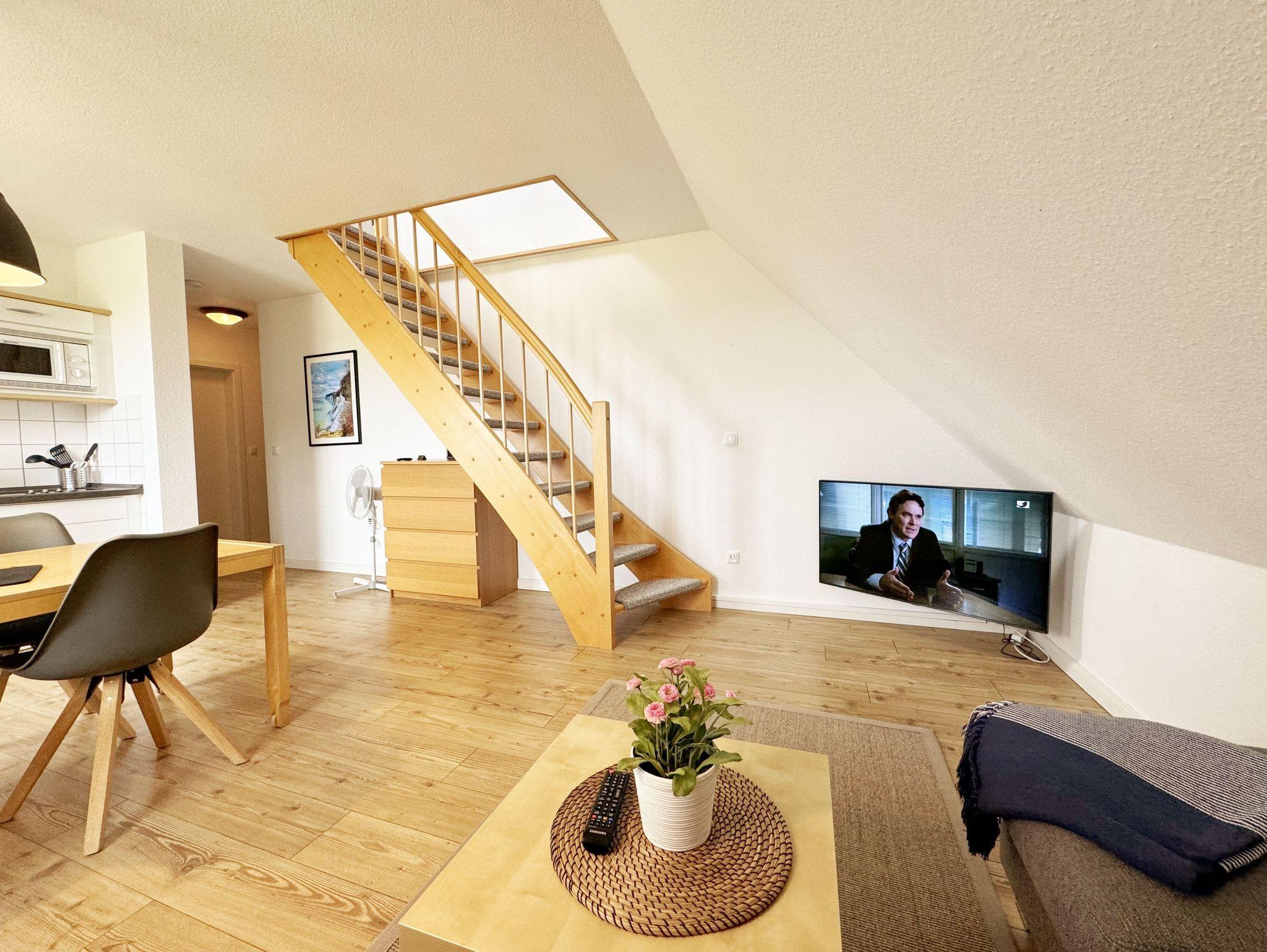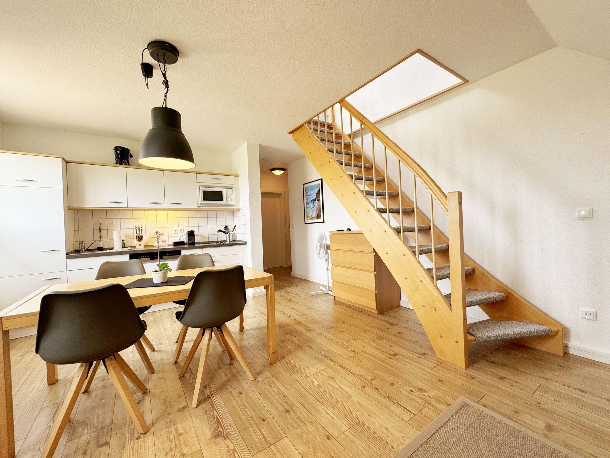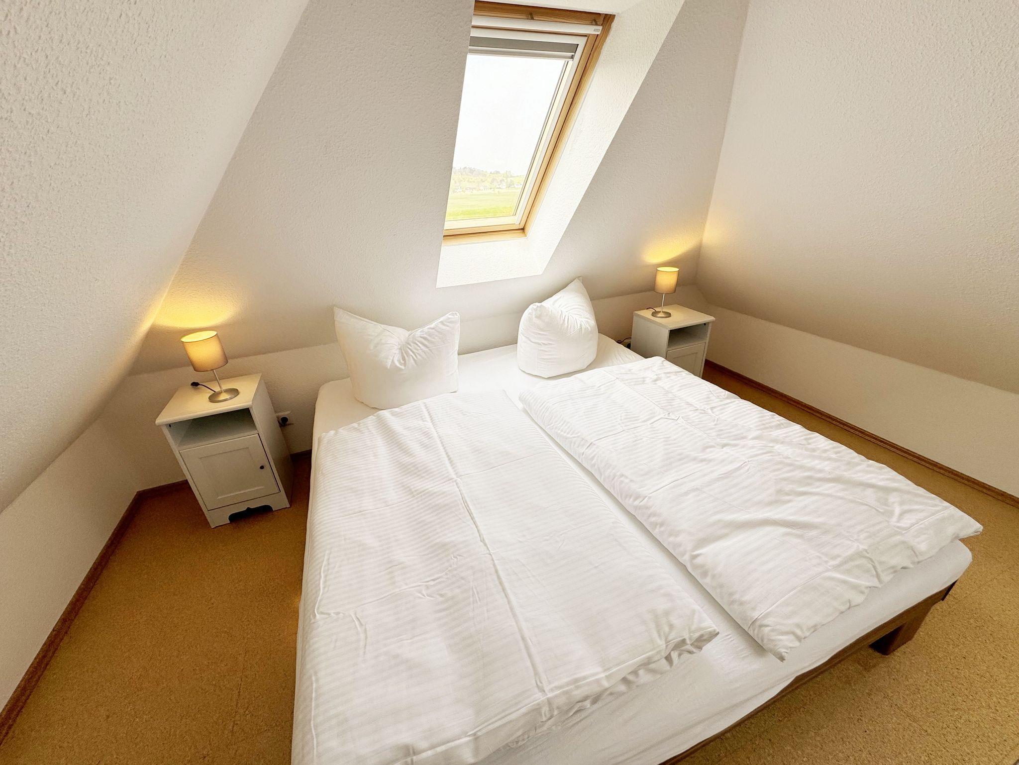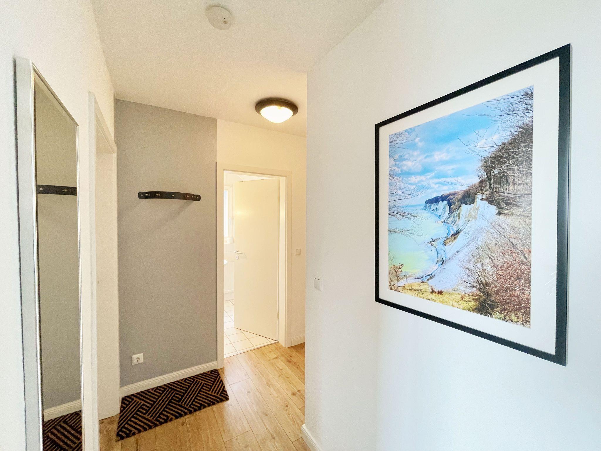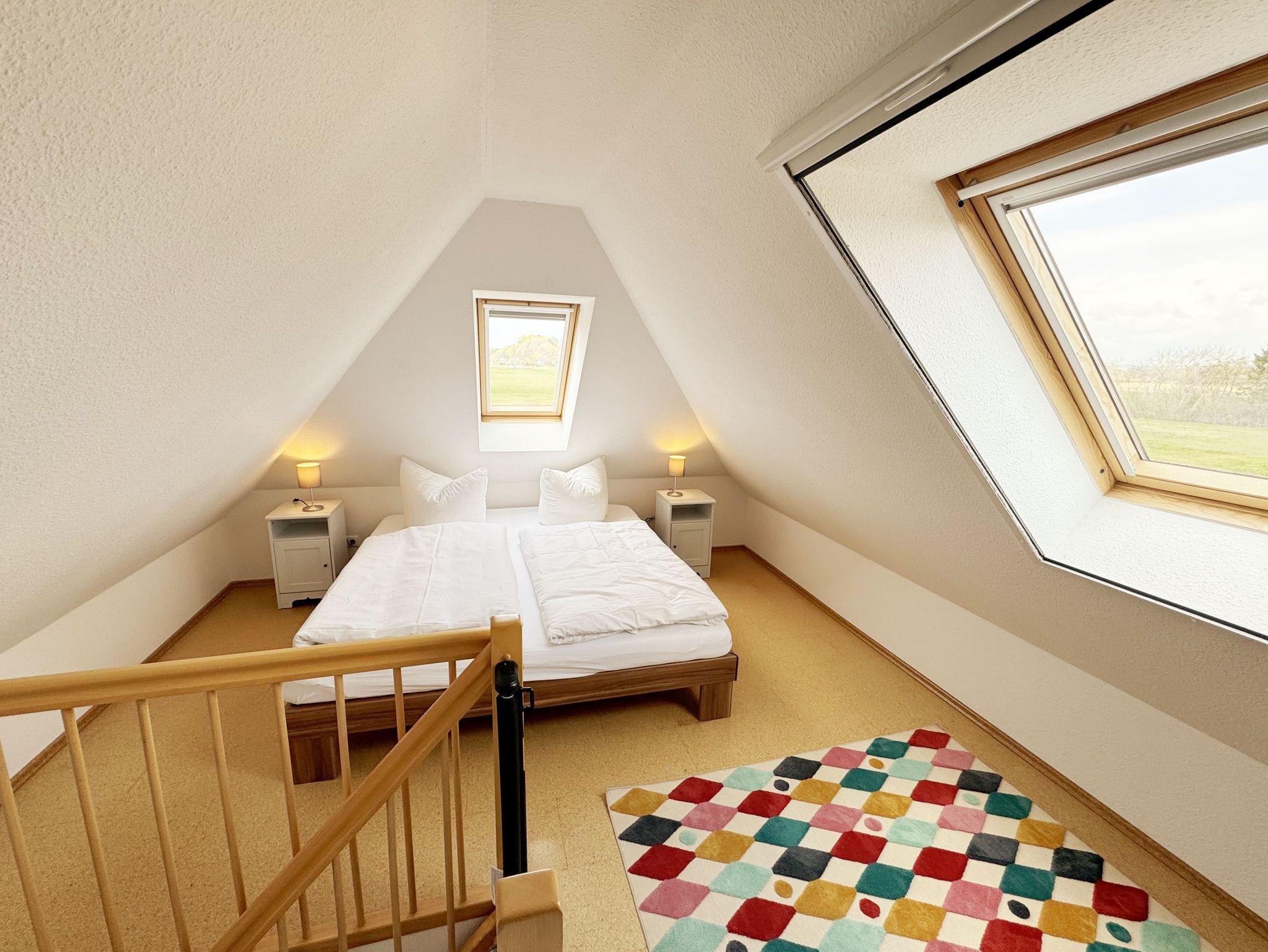 Die Ferienwohnung Fährmann`s Ausblick befindet sich im Obergeschoss des Gästehaus Am Brook. Der Name ist hier auch Programm, denn der Weitblick auf den Hafen von Baabe, Seedorf und zum Greifswalder Bodden ist traumhaft. Die 70 qm Nichtraucher-Maisonette-Wohnung ist modern und hell im skandinavischen Stil eingerichtet und bietet Platz für max. 4 Erwachsene und zwei Kleinkinder bis 3 Jahre im Kinderreisebett. Fotografien der Insel lassen Sie beim Eintreten auf der Insel ankommen. Über einen kleinen Flur mit Garderobe gelangen Sie direkt in den großen Wohn- und Essbereich mit Einbauküche. Die bodentiefen Fenster mit Absturzsicherung und Insektenschutzgittern haben Südausrichtung und sorgen für viel Tageslicht. Der Wohnbereich ist gemütlich gestaltet und lädt zum Entspannen ein. Es verfügt über eine bequeme Eckcouch mit variablem Fußteil, einen Couchtisch, eine Stehlampe und einen Sessel. Hier können Sie es sich gemütlich machen, einen Film auf dem 55-Zoll-Smart-TV genießen oder der Musik aus dem Bluetooth-Radio lauschen. Ein WLAN-Anschluss rundet den technischen Bereich ab. In dem Sideboard finden Sie ausreichend Stauraum für Ihre persönlichen Gegenstände. Zusätzlich befindet sich dort eine Spielesammlung für die ganze Familie sowie eine kleine Auswahl an Büchern. Die Einbauküche beinhaltet alles, was Sie zur Zubereitung Ihrer Mahlzeiten benötigen. Wie ein Induktionsherd, ein Kühlschrank mit Gefrierfach, eine Mikrowelle und ein Geschirrspüler. Darüber hinaus steht Ihnen sowohl eine Filter-Kaffeemaschine als auch eine Nespresso-Kapselmaschine, ein Wasserkocher, ein Toaster, ein Messerblock sowie viele Kochutensilien zur Verfügung. Ein Esstisch rundet den Küchenbereich ab. Von hier aus gelangen Sie über eine Treppe mit Treppenschutz in den oberen Schlafbereich. Hier befindet sich ein Doppelbett (1,80m x 2,00 m) mit Nachttischablagen, verstellbare Lattenroste und Leseleuchten, ein Kleiderschrank sowie Verdunklungsrollo´s und Insektenschutzgitter. Dazu ist ein Kinderbett (160 x 70 cm) vorhanden. Der Raum bietet die Möglichkeit noch ein Kinderbett (optional) zu stellen. Das untere Schlafzimmer der Ferienwohnung verfügt über ein komfortables Doppelbett (1,60m x 2,00m), Wand-Nachttischlampen, Insektenschutzgitter sowie ein Kleiderschrank. Die bodentiefen Fenster sind mit Verdunklungsvorhängen ausgestattet, um Ihnen einen erholsamen Schlaf zu ermöglichen. Das kompakte Tageslicht-Bad ist funktional gestaltet und verfügt über eine Eck-Dusche, ein Fön, ein WC, ein Insektenschutzgitter und ein Waschplatz. Eine Ablage bietet Platz für Kosmetikutensilien und ein beleuchteter Spiegel sorgt für die richtige Ausleuchtung. Ebenso finden Sie in Ihrer Wohnung ein Wäscheständer, Reinigungsutensilien und ein Standventilator vor. Wenn es Sie nach draußen zieht, so steht Ihnen ein 2500 qm großer Gemeinschaftsgarten zur Verfügung, der zum Verweilen einlädt. Dort finden Sie Strandkörbe Sitzgelegenheiten sowie einen Grillplatz, den Sie gemeinsam mit anderen Gästen nutzen können. Ein Haustier ist gegen eine Gebühr ein gern gesehener Gast. Ihre mitgebrachten oder geliehenen Fahrräder können Sie auf dem Grundstück abstellen. Ein PKW-Stellplatz befindet sich direkt am Haus. Die Erstausstattung eines Wäschepaketes (komplette Bettwäsche, 1 Duschhandtuch, 2 kleine Handtücher) können Sie bis 14 Tage vor Anreise gegen einen Aufpreis dazu buchen oder durch eigene ergänzen. Ab 2 gebuchten Paketen erhalten Sie einmalig 1 Geschirrhandtuch und 1 Duschvorleger hinzu.