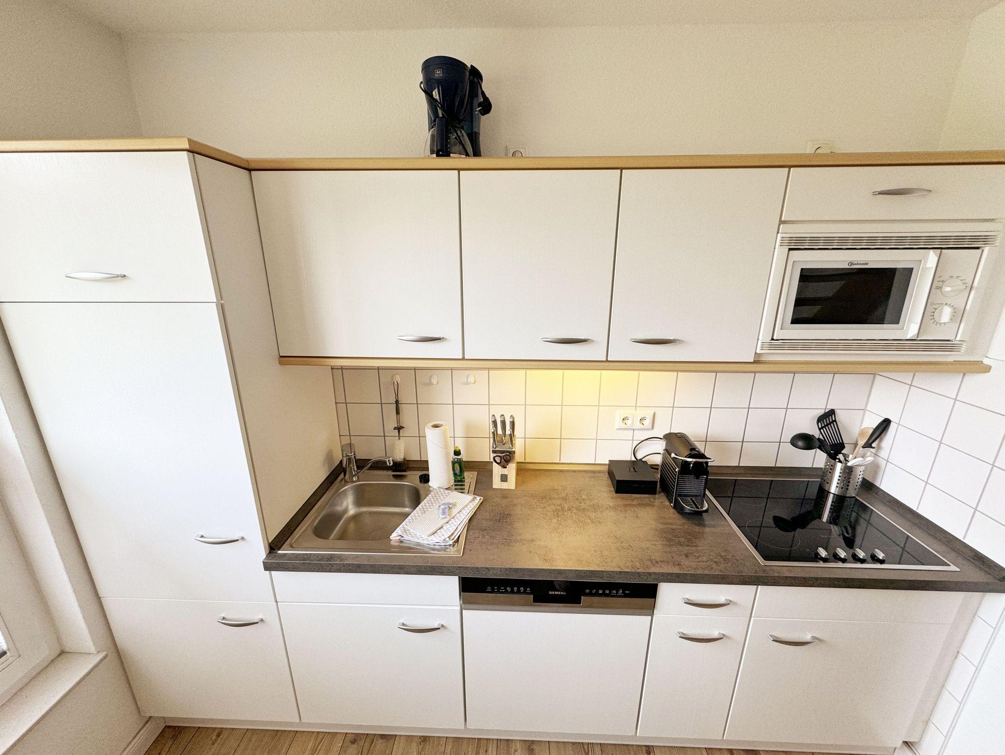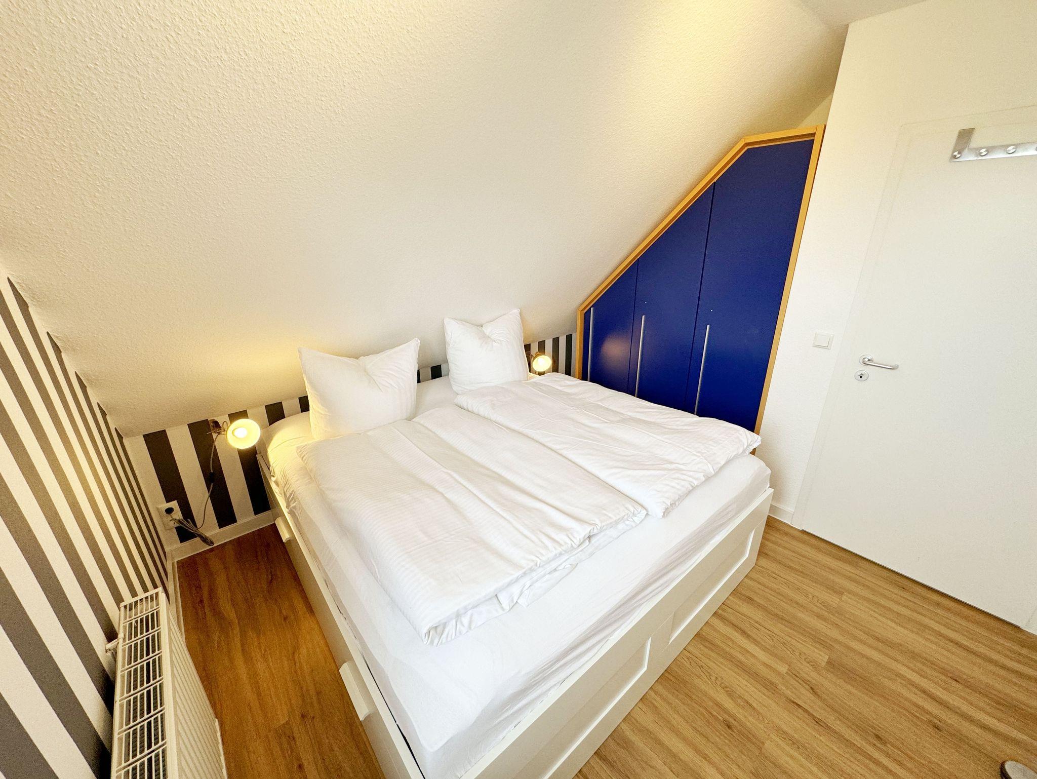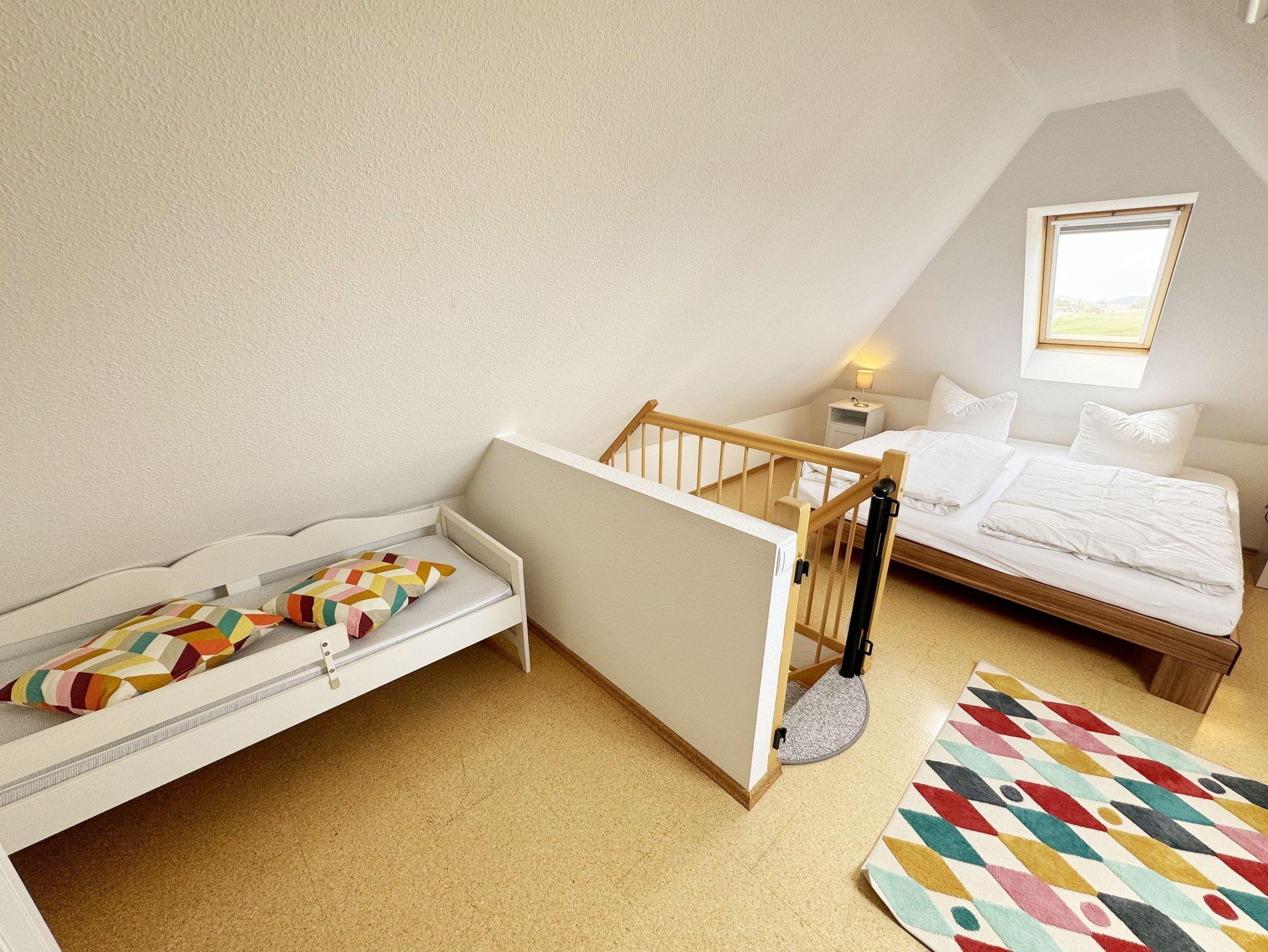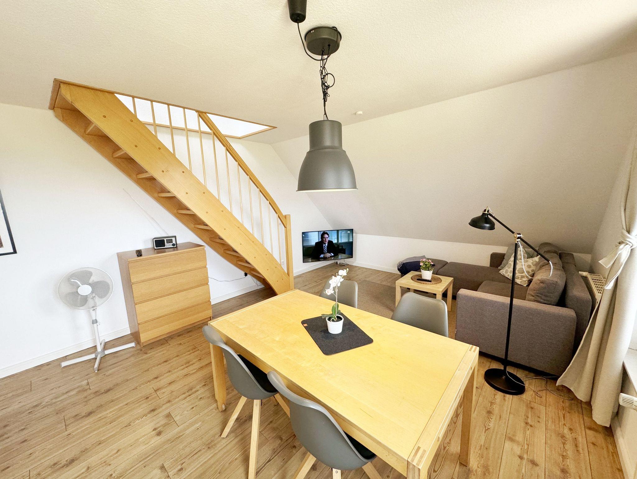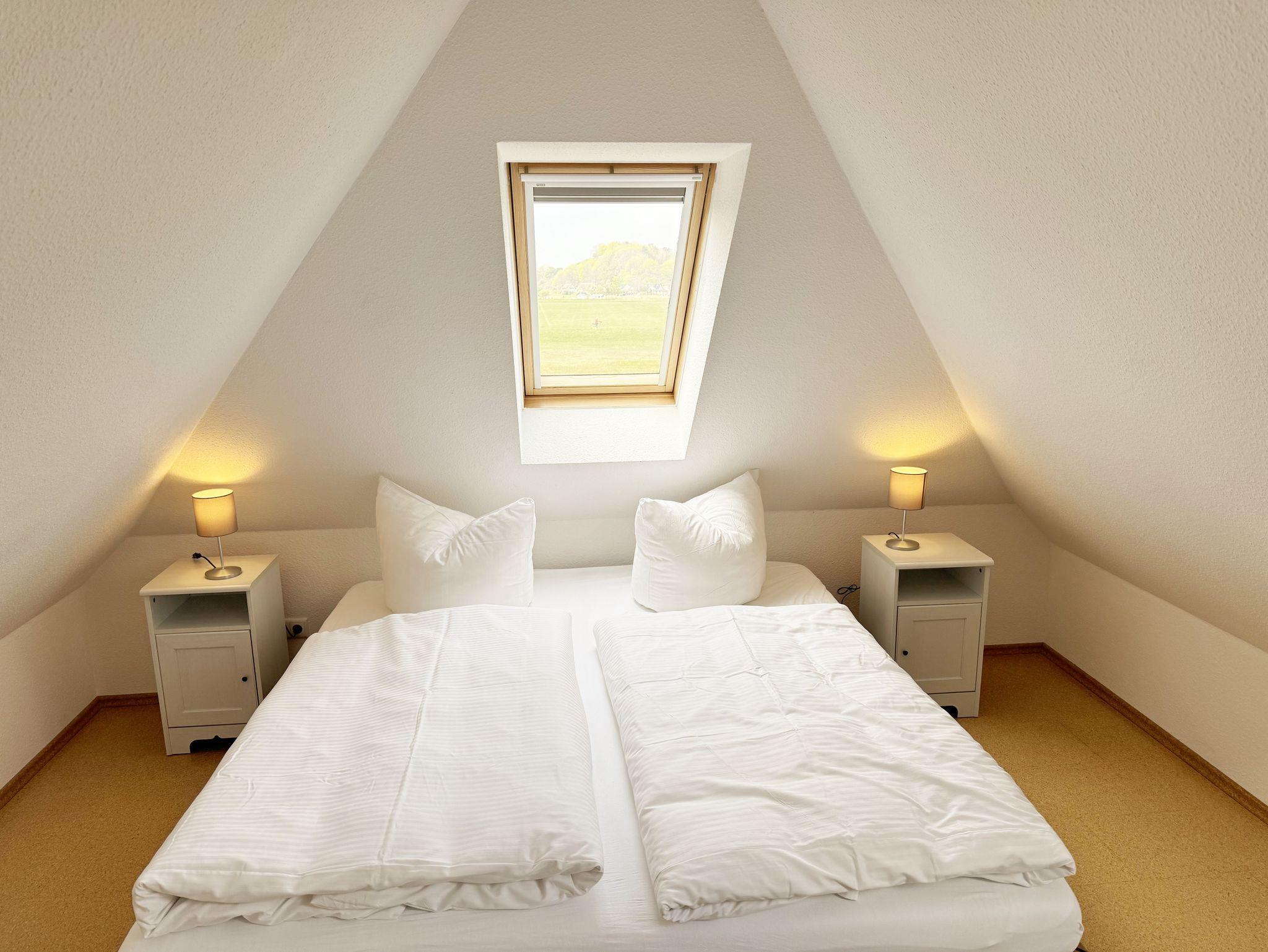 Die Ferienwohnung Fährmann`s Ausblick befindet sich im Obergeschoss des Gästehaus Am Brook. Der Name ist hier auch Programm, denn der Weitblick auf den Hafen von Baabe, Seedorf und zum Greifswalder Bodden ist traumhaft. Die 70 qm Nichtraucher-Maisonette-Wohnung ist modern und hell im skandinavischen Stil eingerichtet und bietet Platz für max. 4 Erwachsene und zwei Kleinkinder bis 3 Jahre im Kinderreisebett. Fotografien der Insel lassen Sie beim Eintreten auf der Insel ankommen. Über einen kleinen Flur mit Garderobe gelangen Sie direkt in den großen Wohn- und Essbereich mit Einbauküche. Die bodentiefen Fenster mit Absturzsicherung und Insektenschutzgittern haben Südausrichtung und sorgen für viel Tageslicht. Der Wohnbereich ist gemütlich gestaltet und lädt zum Entspannen ein. Es verfügt über eine bequeme Eckcouch mit variablem Fußteil, einen Couchtisch, eine Stehlampe und einen Sessel. Hier können Sie es sich gemütlich machen, einen Film auf dem 55-Zoll-Smart-TV genießen oder der Musik aus dem Bluetooth-Radio lauschen. Ein WLAN-Anschluss rundet den technischen Bereich ab. In dem Sideboard finden Sie ausreichend Stauraum für Ihre persönlichen Gegenstände. Zusätzlich befindet sich dort eine Spielesammlung für die ganze Familie sowie eine kleine Auswahl an Büchern. Die Einbauküche beinhaltet alles, was Sie zur Zubereitung Ihrer Mahlzeiten benötigen. Wie ein Induktionsherd, ein Kühlschrank mit Gefrierfach, eine Mikrowelle und ein Geschirrspüler. Darüber hinaus steht Ihnen sowohl eine Filter-Kaffeemaschine als auch eine Nespresso-Kapselmaschine, ein Wasserkocher, ein Toaster, ein Messerblock sowie viele Kochutensilien zur Verfügung. Ein Esstisch rundet den Küchenbereich ab. Von hier aus gelangen Sie über eine Treppe mit Treppenschutz in den oberen Schlafbereich. Hier befindet sich ein Doppelbett (1,80m x 2,00 m) mit Nachttischablagen, verstellbare Lattenroste und Leseleuchten, ein Kleiderschrank sowie Verdunklungsrollo´s und Insektenschutzgitter. Dazu ist ein Kinderbett (160 x 70 cm) vorhanden. Der Raum bietet die Möglichkeit noch ein Kinderbett (optional) zu stellen. Das untere Schlafzimmer der Ferienwohnung verfügt über ein komfortables Doppelbett (1,60m x 2,00m), Wand-Nachttischlampen, Insektenschutzgitter sowie ein Kleiderschrank. Die bodentiefen Fenster sind mit Verdunklungsvorhängen ausgestattet, um Ihnen einen erholsamen Schlaf zu ermöglichen. Das kompakte Tageslicht-Bad ist funktional gestaltet und verfügt über eine Eck-Dusche, ein Fön, ein WC, ein Insektenschutzgitter und ein Waschplatz. Eine Ablage bietet Platz für Kosmetikutensilien und ein beleuchteter Spiegel sorgt für die richtige Ausleuchtung. Ebenso finden Sie in Ihrer Wohnung ein Wäscheständer, Reinigungsutensilien und ein Standventilator vor. Wenn es Sie nach draußen zieht, so steht Ihnen ein 2500 qm großer Gemeinschaftsgarten zur Verfügung, der zum Verweilen einlädt. Dort finden Sie Strandkörbe Sitzgelegenheiten sowie einen Grillplatz, den Sie gemeinsam mit anderen Gästen nutzen können. Ein Haustier ist gegen eine Gebühr ein gern gesehener Gast. Ihre mitgebrachten oder geliehenen Fahrräder können Sie auf dem Grundstück abstellen. Ein PKW-Stellplatz befindet sich direkt am Haus. Die Erstausstattung eines Wäschepaketes (komplette Bettwäsche, 1 Duschhandtuch, 2 kleine Handtücher) können Sie bis 14 Tage vor Anreise gegen einen Aufpreis dazu buchen oder durch eigene ergänzen. Ab 2 gebuchten Paketen erhalten Sie einmalig 1 Geschirrhandtuch und 1 Duschvorleger hinzu.