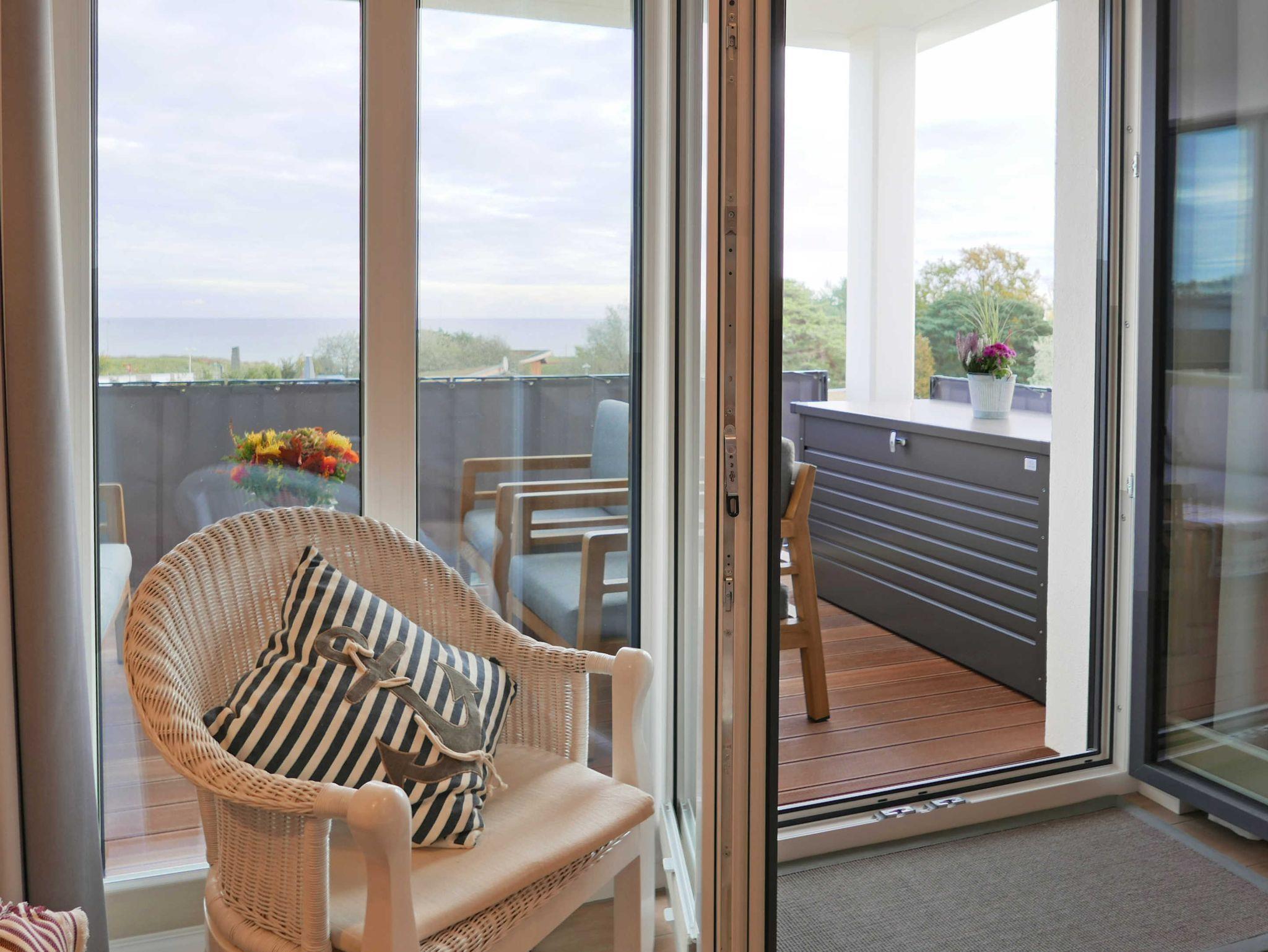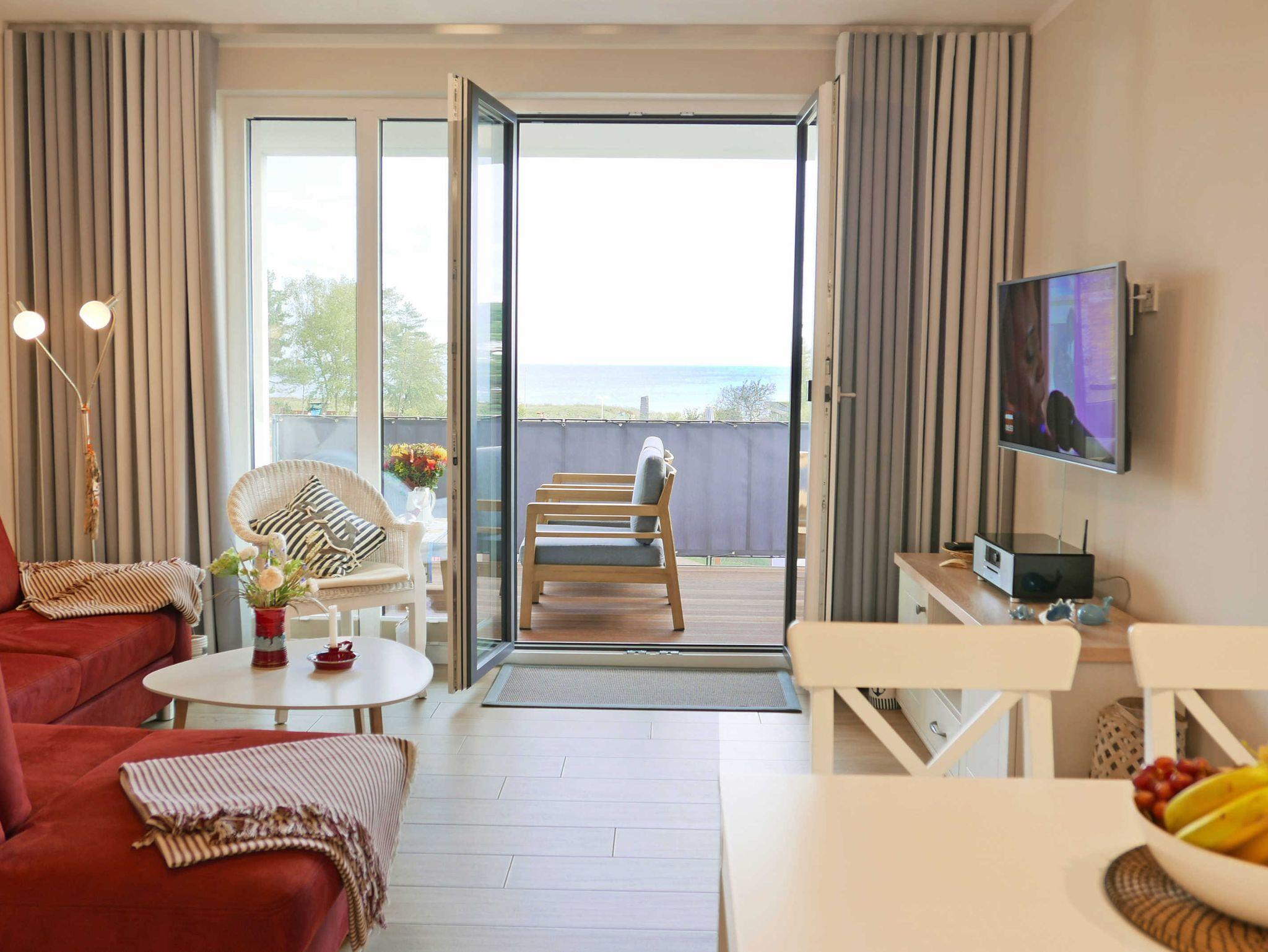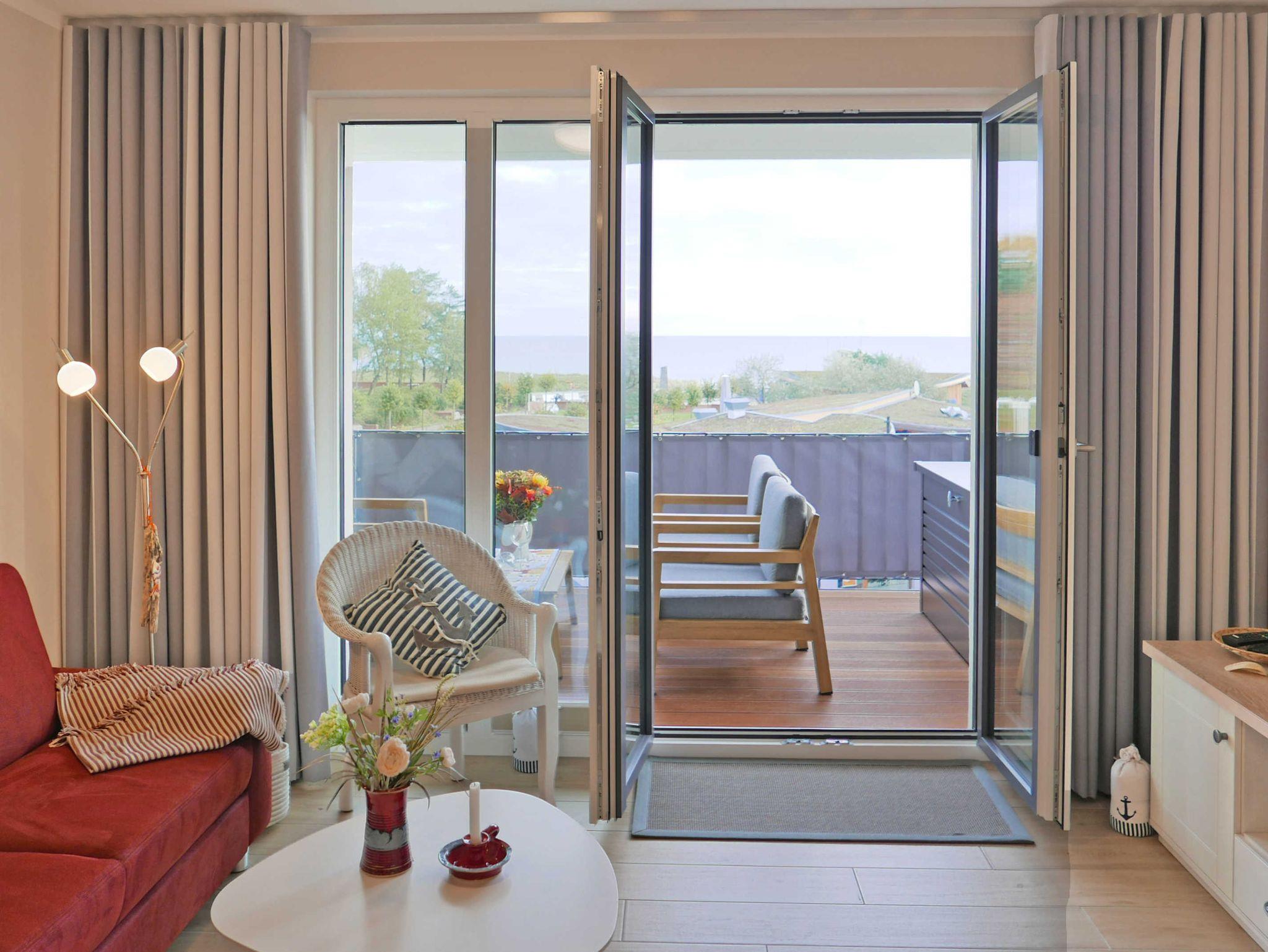 Die helle und gemütliche 2-Zimmer-Ferienwohnung mit Balkon und direktem Meerblick liegt in dem 2019 neu eröffneten Villen-Ensemble.