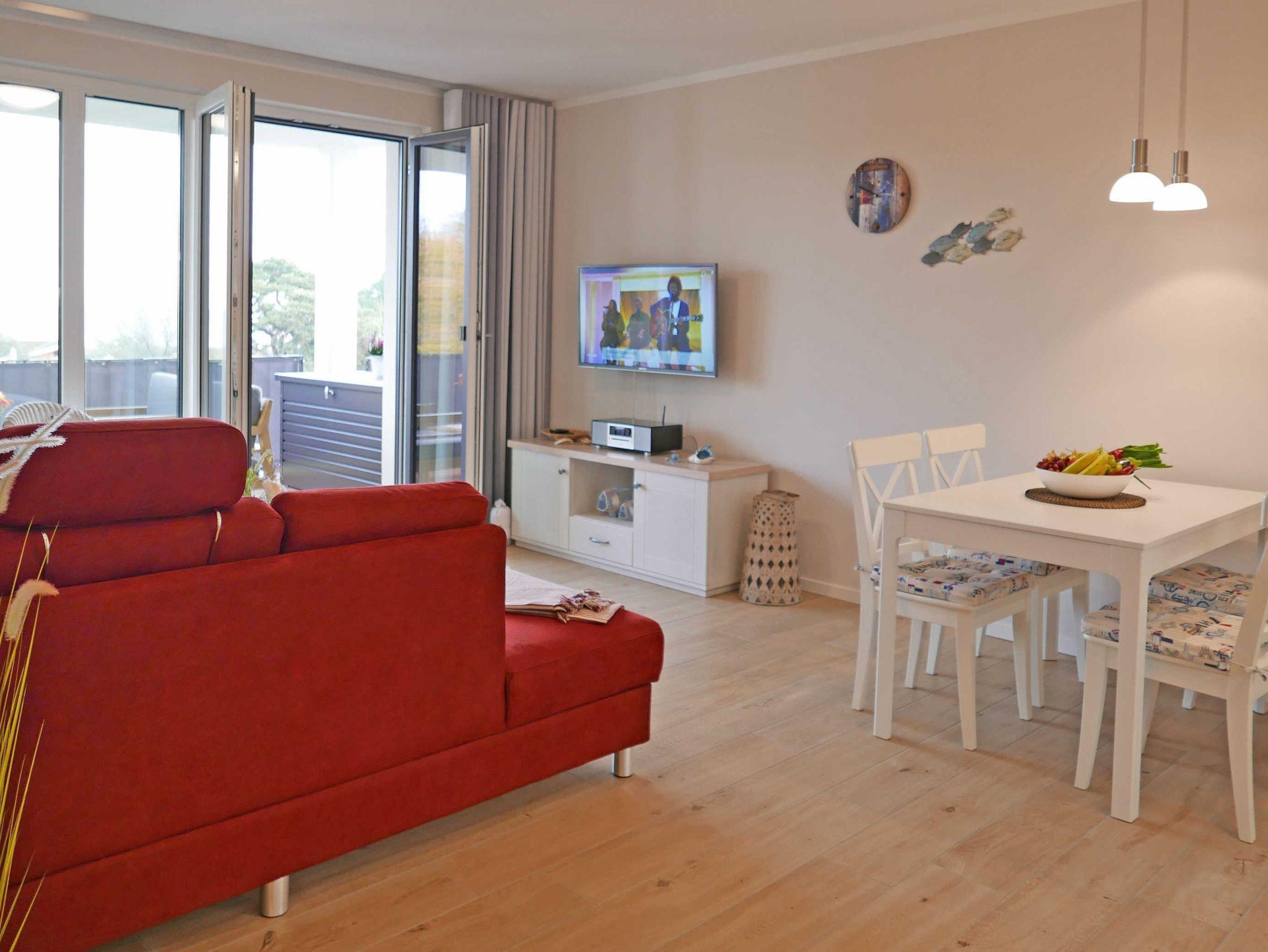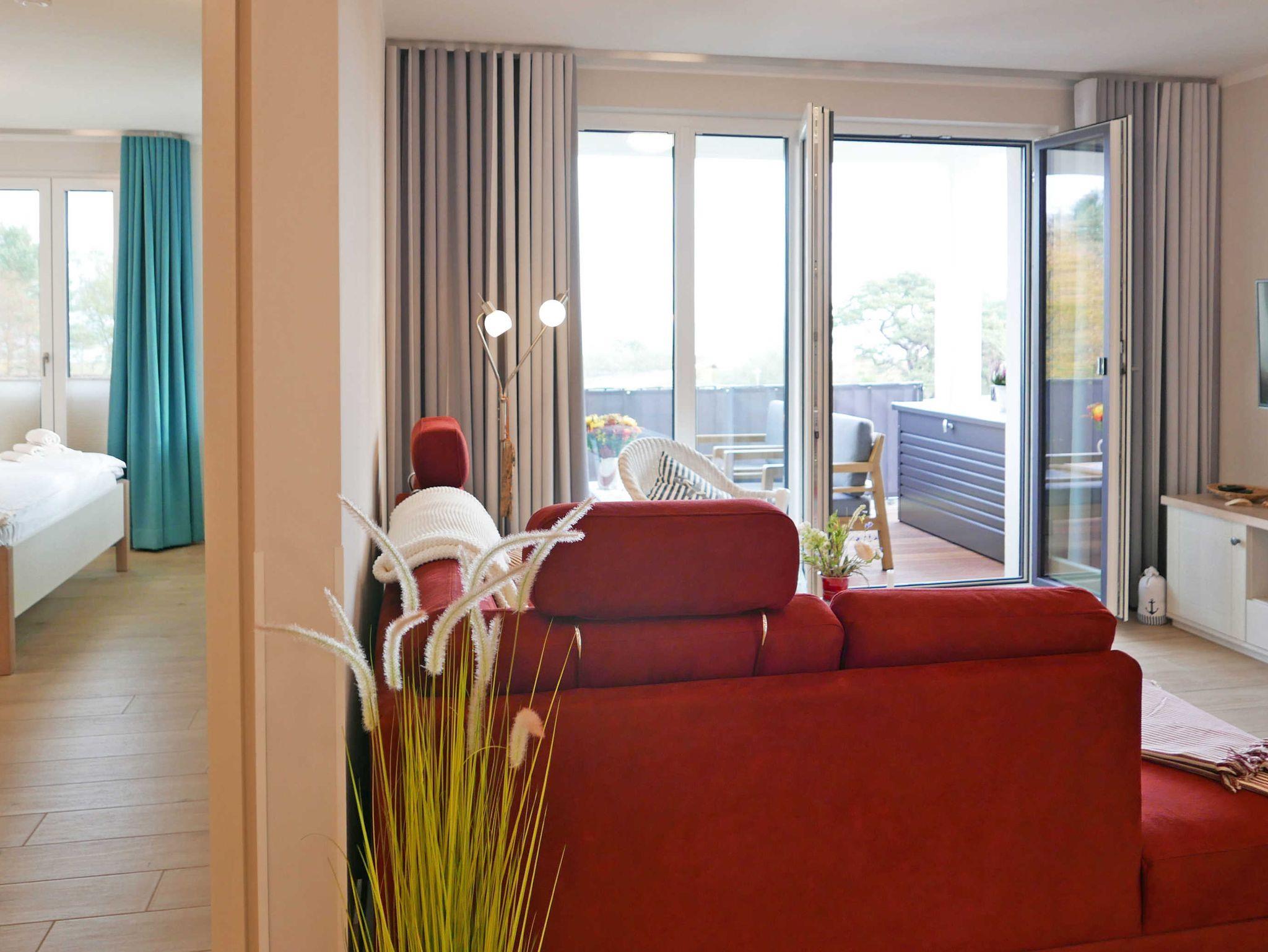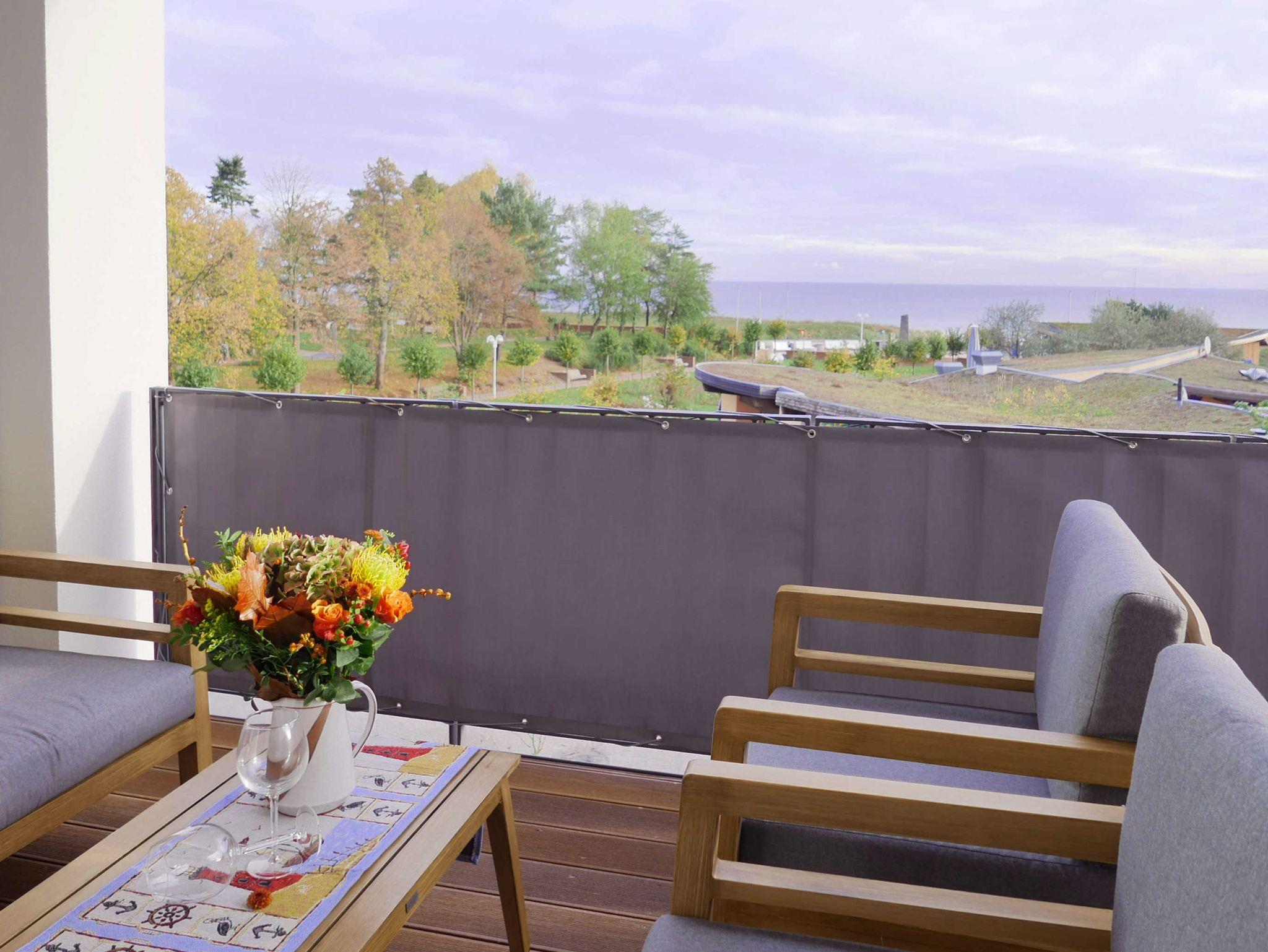Die helle und gemütliche 2-Zimmer-Ferienwohnung mit Balkon und direktem Meerblick liegt in dem 2019 neu eröffneten Villen-Ensemble.