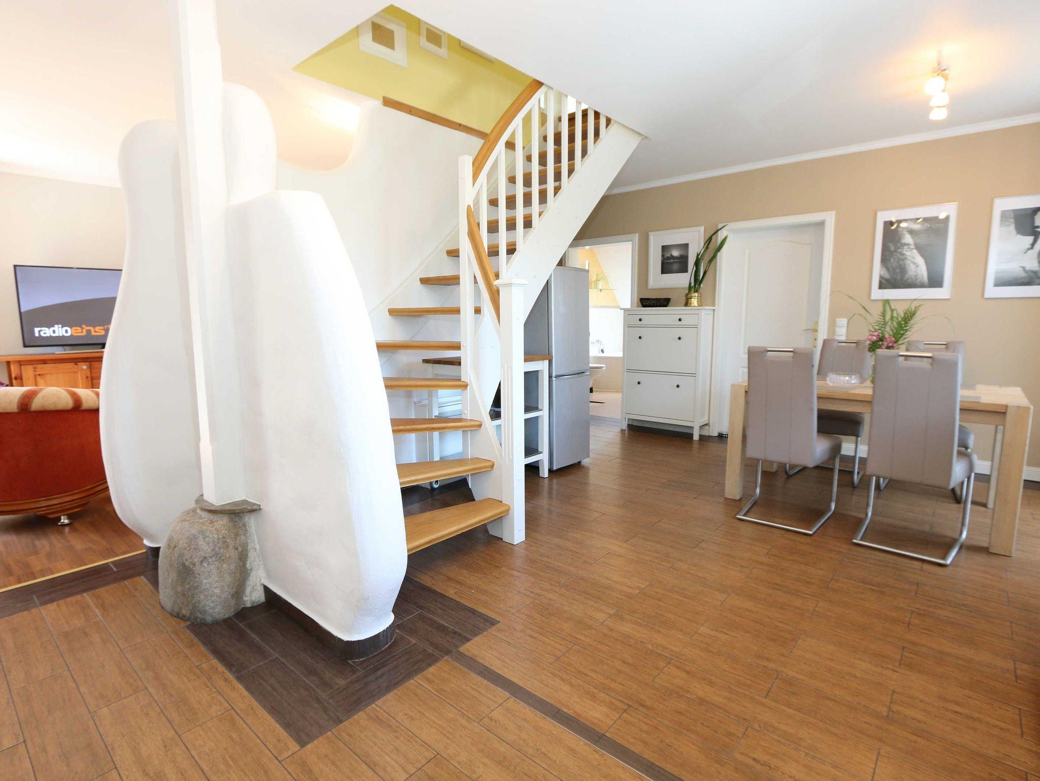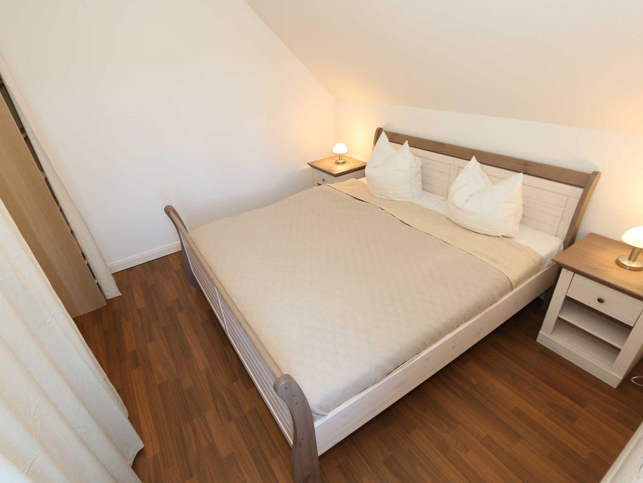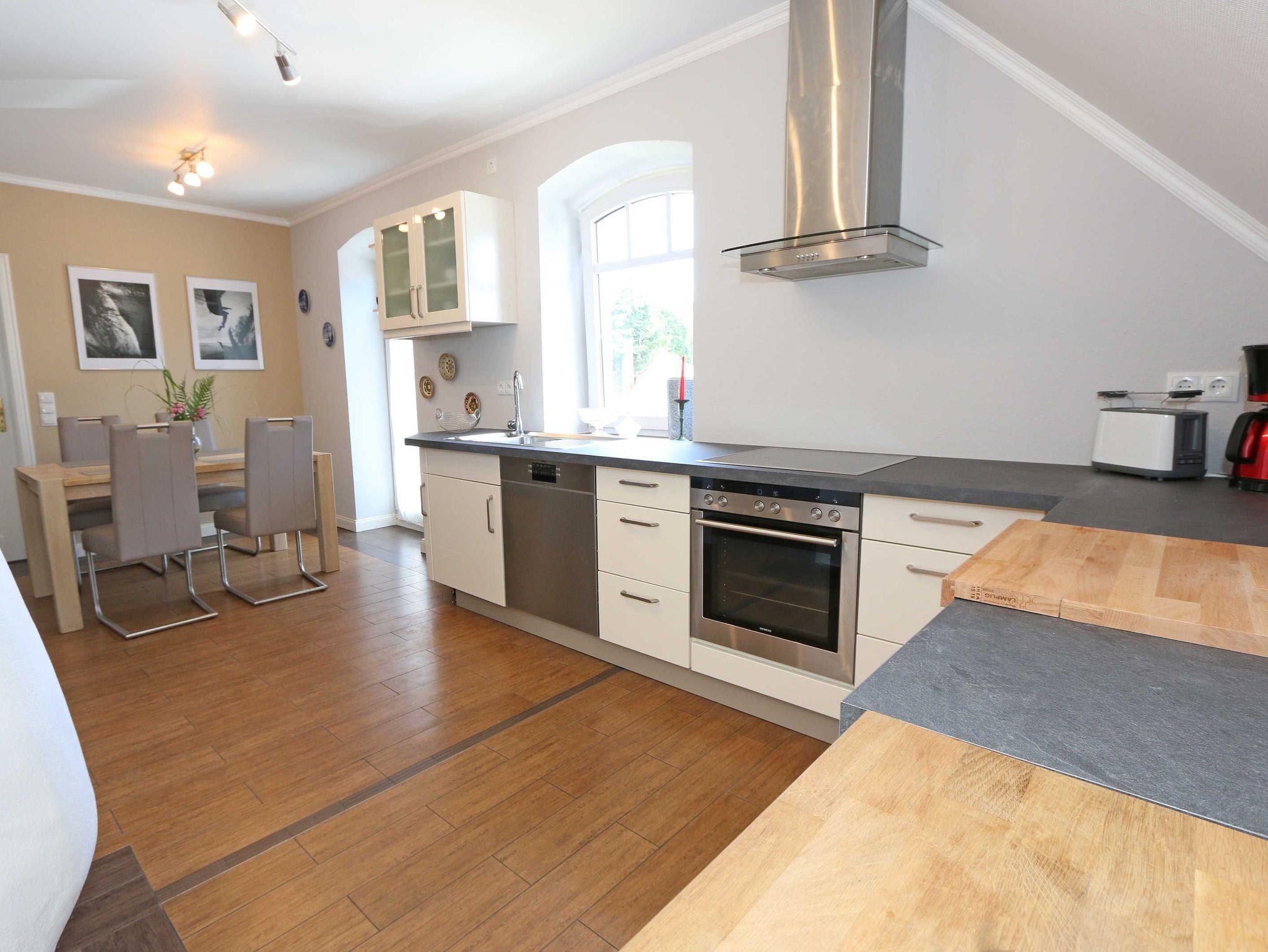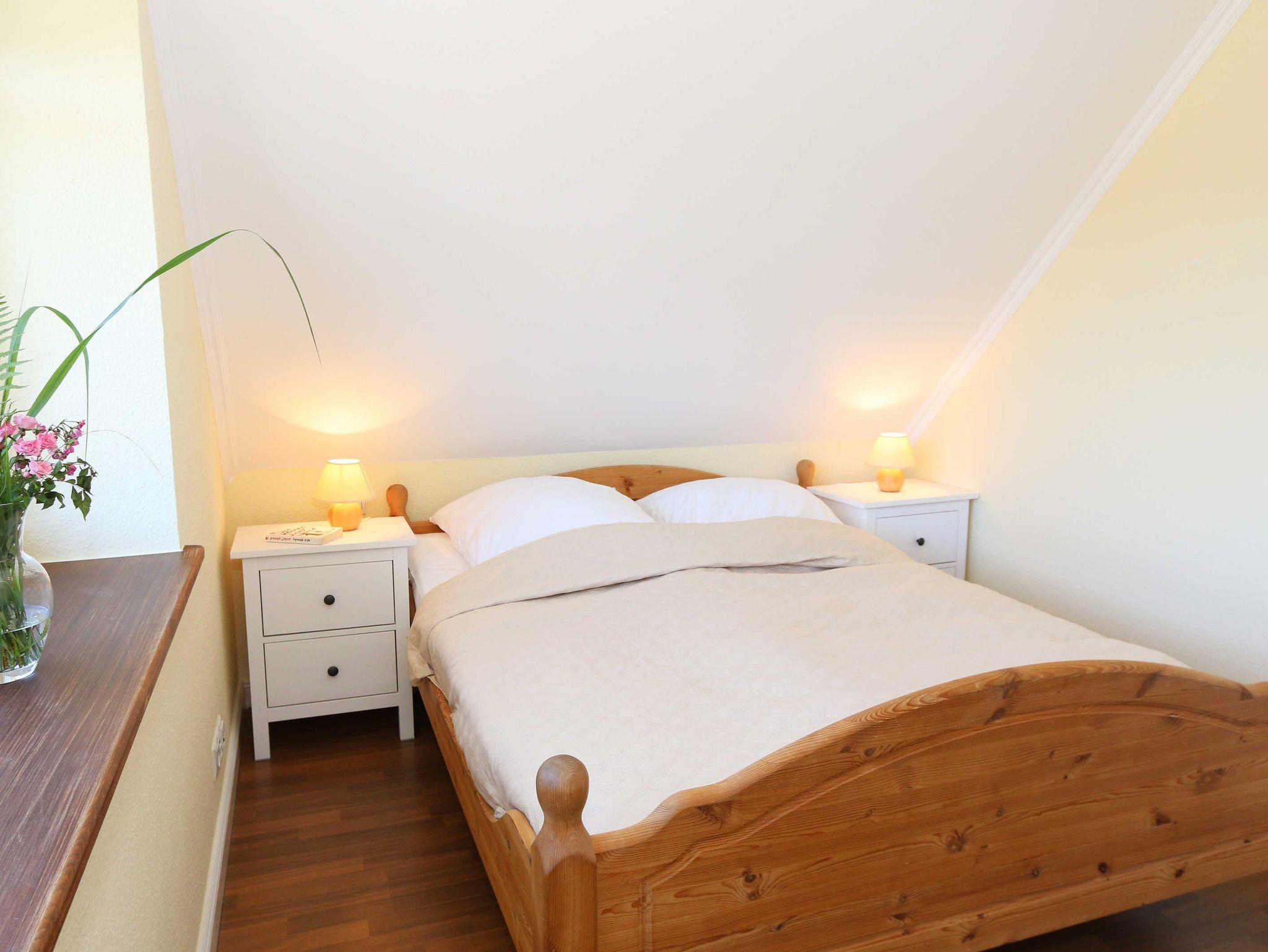 Die großzügige Nichtraucherferienwohnung 02, welche sich über 2 Etagen erstreckt, befindet sich in der 1. Etage des Hauses. Mit Ihren ca. 90 m² bietet Sie ausreichend Platz für max. 6 Erwachsene + 2 Kleinkinder bis 3 Jahre im Kinderreisebett. Auf einer Ebene befinden sich ein Schlafzimmer, ein großes Bad sowie die großzügige Küche mit angrenzendem Wohnbereich. Der gemütliche Wohnbereich umfasst eine große Couchecke mit Couchtisch, Leselampe, Sideboard, Smart-TV sowie eine Mini-Stereo-Anlage. An kühleren Tagen sorgt ein Kamin für Gemütlichkeit und Wärme. Auch auf einen Internetanschluss (WLAN) brauchen Sie im Urlaub nicht verzichten. Dieser ist inklusive für Sie. Von hier gelangen Sie auf den bestuhlten Süd/West Balkon. Die angrenzende und vollausgestattete Küche verfügt über einen Geschirrspüler, Backofen mit Ceranfeld und Abzugshaube, einen großen Kühlschrank mit Eisfach, Mikrowelle, Kaffeemaschine, Toaster, Wasserkocher und diverse Küchenutensilien. Ein Esstisch rundet diesen Bereich ab. Das 1. Schlafzimmer verfügt über ein Doppelbett (1,80 m x 2,00 m), verstellbare Lattenroste, Nachttischablagen, einen Kleiderschrank, Verdunklungsmöglichkeit sowie ein Smart-TV. Das großzügige Tageslicht-Bad umfasst eine Eckbadewanne, eine Dusche, ein WC, einen Waschtisch sowie einen Fön. Über eine Treppe vom Küchenbereich gelangen Sie in die obere Etage. Das 2. Schlafzimmer mit Dachschrägen verfügt über ein Doppelbett (1,80 m x 2,00 m), einen Kleiderschrank, Verdunklungsmöglichkeiten sowie einen Schreibtisch. Das 3. Schlafzimmer verfügt über ein Doppelbett (1,60 m x 2,00 m), verstellbare Lattenroste, Nachttischablagen, einen Kleiderschrank, Verdunklungsmöglichkeiten sowie einen Smart-TV. Ein Gäste-WC mit kleinem Waschbecken rundet die obere Etage ab. Alle Räumlichkeiten wurden mit Fliesen sowie einer Fußbodenheizung ausgestattet. Mit einem eigenen und mitgebrachten Schlafplatz sind max. 2 Haustiere gegen eine Gebühr gern gesehene Gäste. Ihre mitgebrachten oder auch geliehenen Fahrräder können Sie im Schuppen unterstellen. Im separaten Waschhaus können Sie gegen eine Kasse des Vertrauens eine Waschmaschine und einen Trockner nutzen. Ein PKW-Stellplatz mit Ladestation befindet sich direkt am Haus. Die Erstausstattung eines Wäschepaketes (komplette Bettwäsche, 1 Duschhandtuch, 1 kleines Handtuch) können Sie bis 14 Tage vor Anreise gegen einen Aufpreis dazu buchen oder durch eigene ergänzen. Ab 2 gebuchten Paketen erhalten Sie einmalig 1 Geschirrhandtuch und 1 Duschvorleger hinzu.