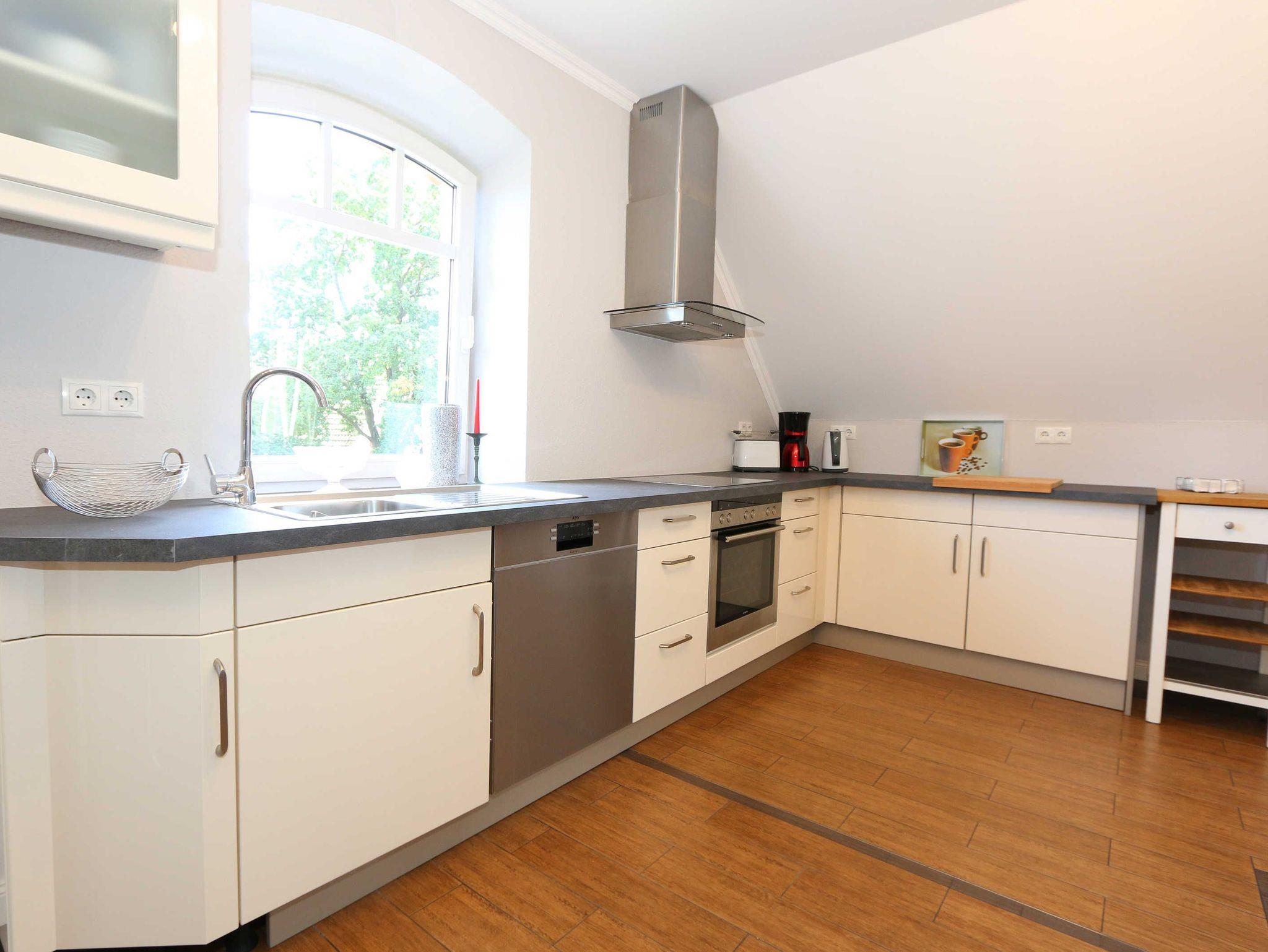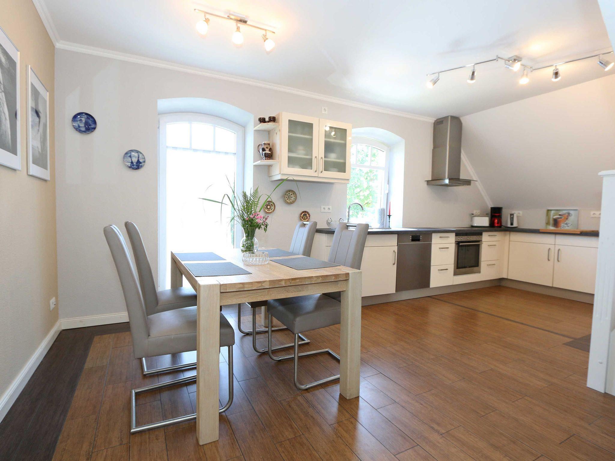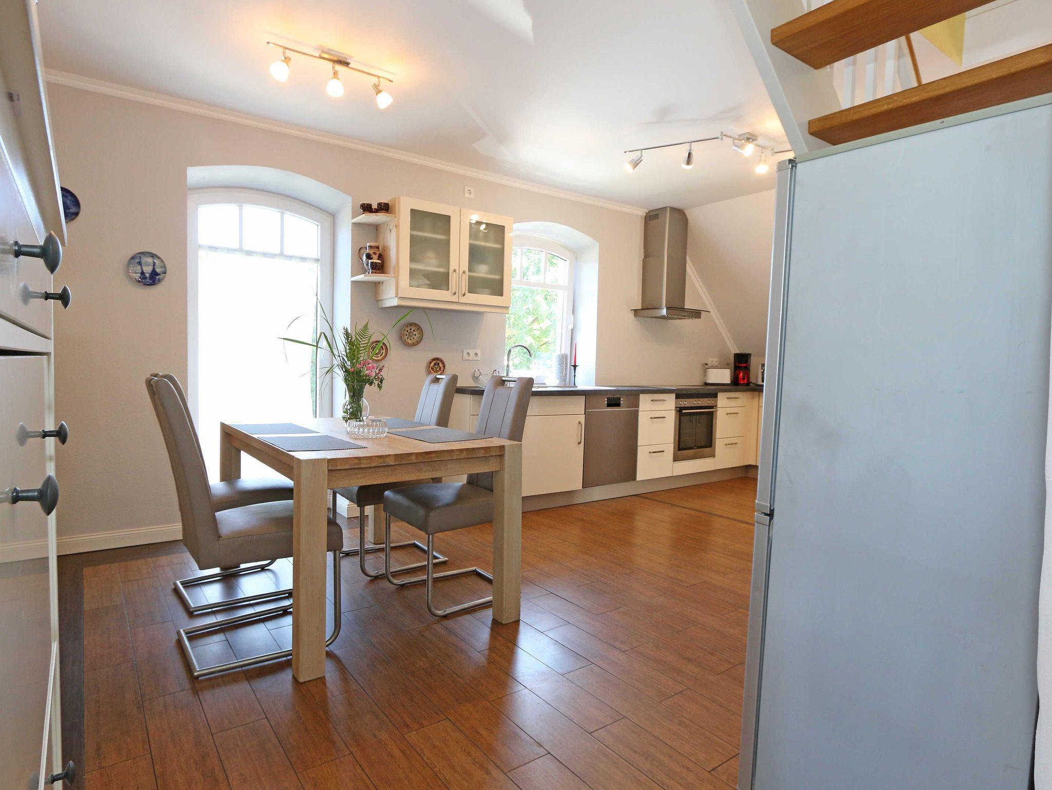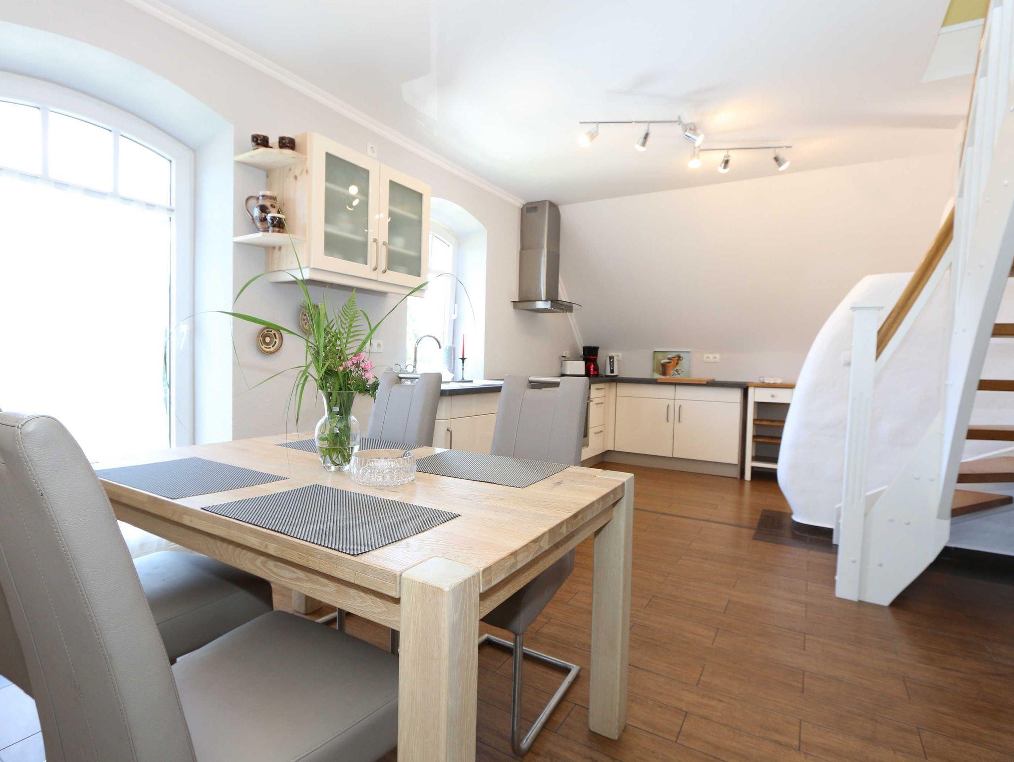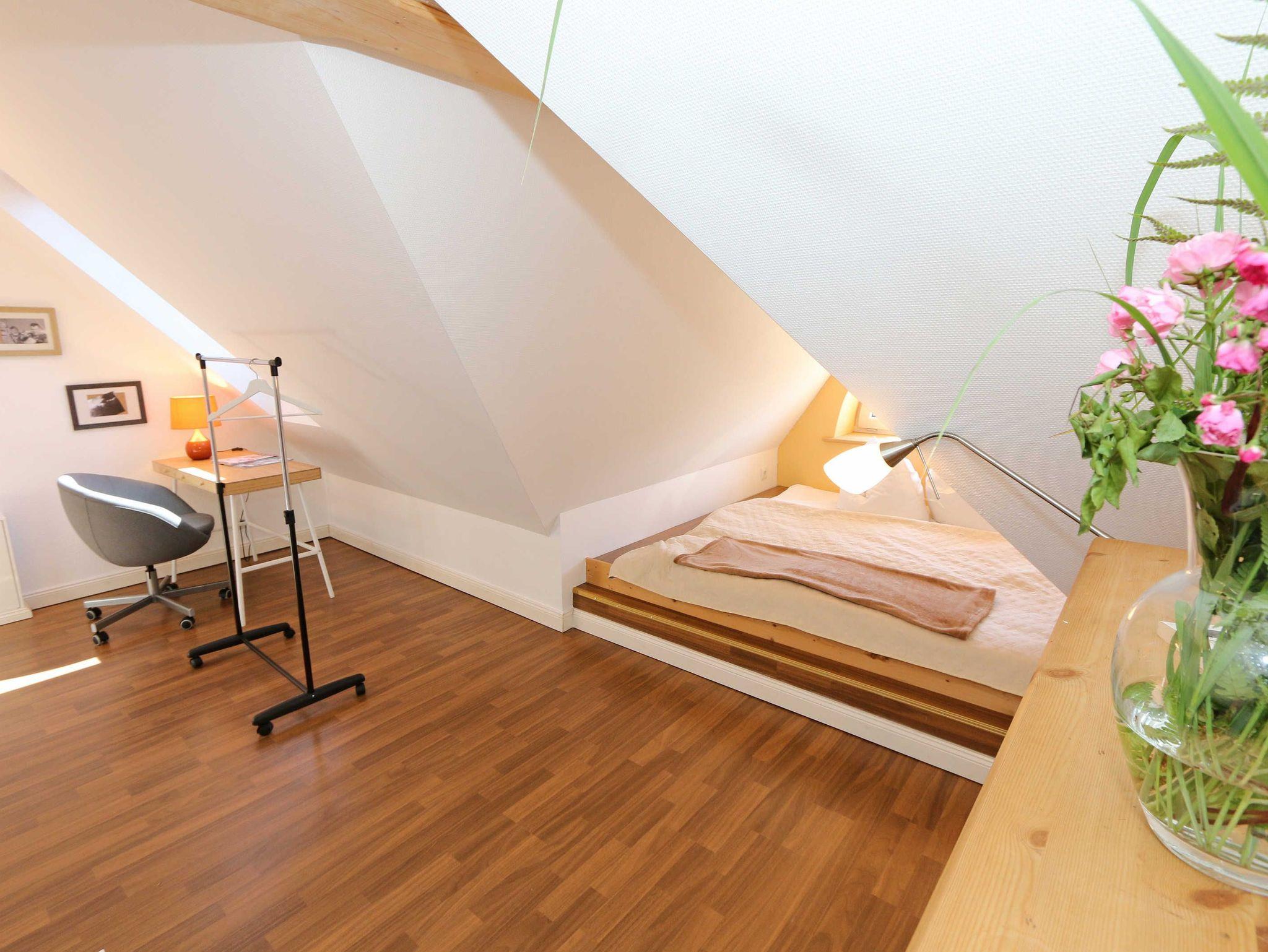 Die großzügige Nichtraucherferienwohnung 02, welche sich über 2 Etagen erstreckt, befindet sich in der 1. Etage des Hauses. Mit Ihren ca. 90 m² bietet Sie ausreichend Platz für max. 6 Erwachsene + 2 Kleinkinder bis 3 Jahre im Kinderreisebett. Auf einer Ebene befinden sich ein Schlafzimmer, ein großes Bad sowie die großzügige Küche mit angrenzendem Wohnbereich. Der gemütliche Wohnbereich umfasst eine große Couchecke mit Couchtisch, Leselampe, Sideboard, Smart-TV sowie eine Mini-Stereo-Anlage. An kühleren Tagen sorgt ein Kamin für Gemütlichkeit und Wärme. Auch auf einen Internetanschluss (WLAN) brauchen Sie im Urlaub nicht verzichten. Dieser ist inklusive für Sie. Von hier gelangen Sie auf den bestuhlten Süd/West Balkon. Die angrenzende und vollausgestattete Küche verfügt über einen Geschirrspüler, Backofen mit Ceranfeld und Abzugshaube, einen großen Kühlschrank mit Eisfach, Mikrowelle, Kaffeemaschine, Toaster, Wasserkocher und diverse Küchenutensilien. Ein Esstisch rundet diesen Bereich ab. Das 1. Schlafzimmer verfügt über ein Doppelbett (1,80 m x 2,00 m), verstellbare Lattenroste, Nachttischablagen, einen Kleiderschrank, Verdunklungsmöglichkeit sowie ein Smart-TV. Das großzügige Tageslicht-Bad umfasst eine Eckbadewanne, eine Dusche, ein WC, einen Waschtisch sowie einen Fön. Über eine Treppe vom Küchenbereich gelangen Sie in die obere Etage. Das 2. Schlafzimmer mit Dachschrägen verfügt über ein Doppelbett (1,80 m x 2,00 m), einen Kleiderschrank, Verdunklungsmöglichkeiten sowie einen Schreibtisch. Das 3. Schlafzimmer verfügt über ein Doppelbett (1,60 m x 2,00 m), verstellbare Lattenroste, Nachttischablagen, einen Kleiderschrank, Verdunklungsmöglichkeiten sowie einen Smart-TV. Ein Gäste-WC mit kleinem Waschbecken rundet die obere Etage ab. Alle Räumlichkeiten wurden mit Fliesen sowie einer Fußbodenheizung ausgestattet. Mit einem eigenen und mitgebrachten Schlafplatz sind max. 2 Haustiere gegen eine Gebühr gern gesehene Gäste. Ihre mitgebrachten oder auch geliehenen Fahrräder können Sie im Schuppen unterstellen. Im separaten Waschhaus können Sie gegen eine Kasse des Vertrauens eine Waschmaschine und einen Trockner nutzen. Ein PKW-Stellplatz mit Ladestation befindet sich direkt am Haus. Die Erstausstattung eines Wäschepaketes (komplette Bettwäsche, 1 Duschhandtuch, 1 kleines Handtuch) können Sie bis 14 Tage vor Anreise gegen einen Aufpreis dazu buchen oder durch eigene ergänzen. Ab 2 gebuchten Paketen erhalten Sie einmalig 1 Geschirrhandtuch und 1 Duschvorleger hinzu.