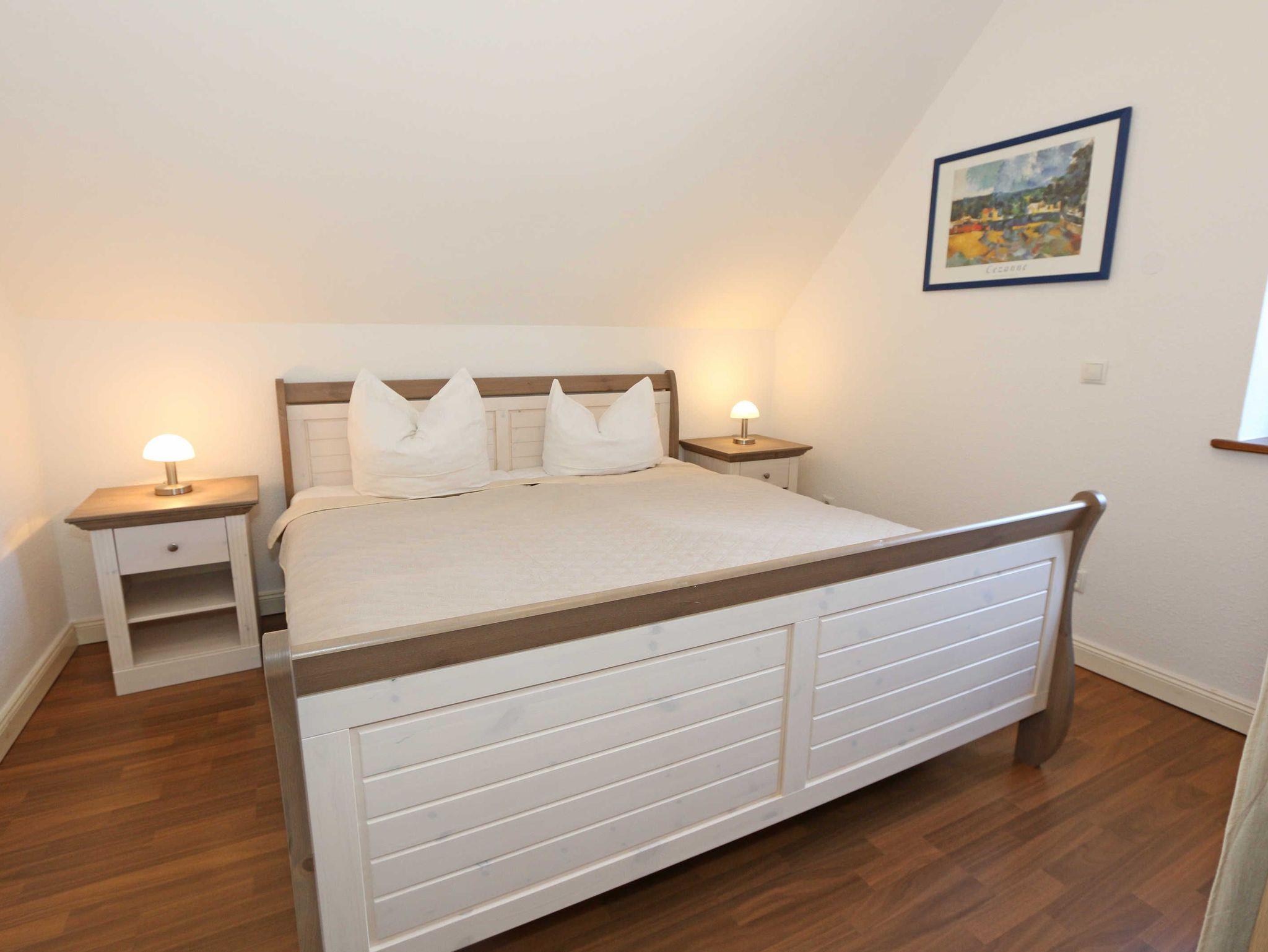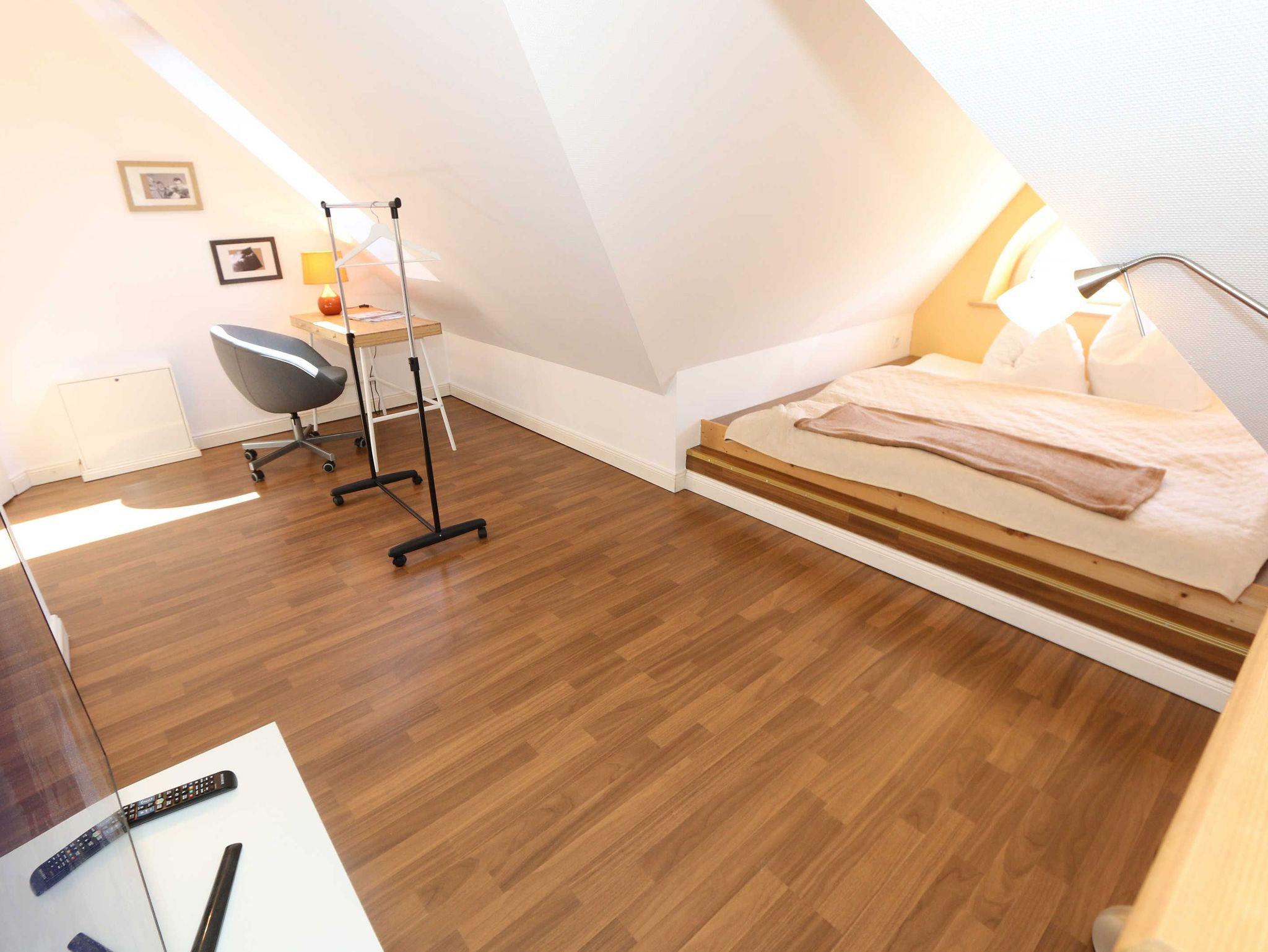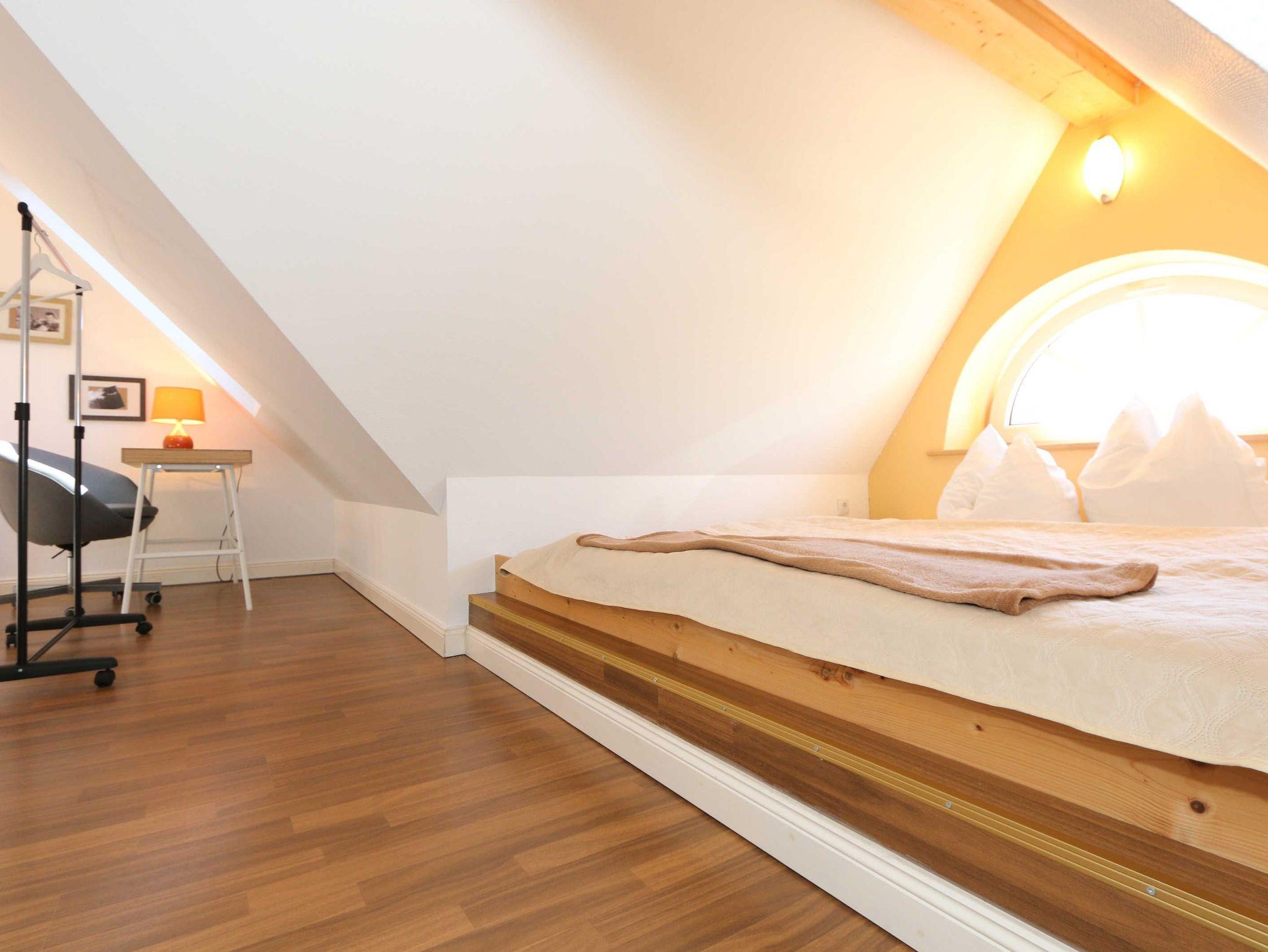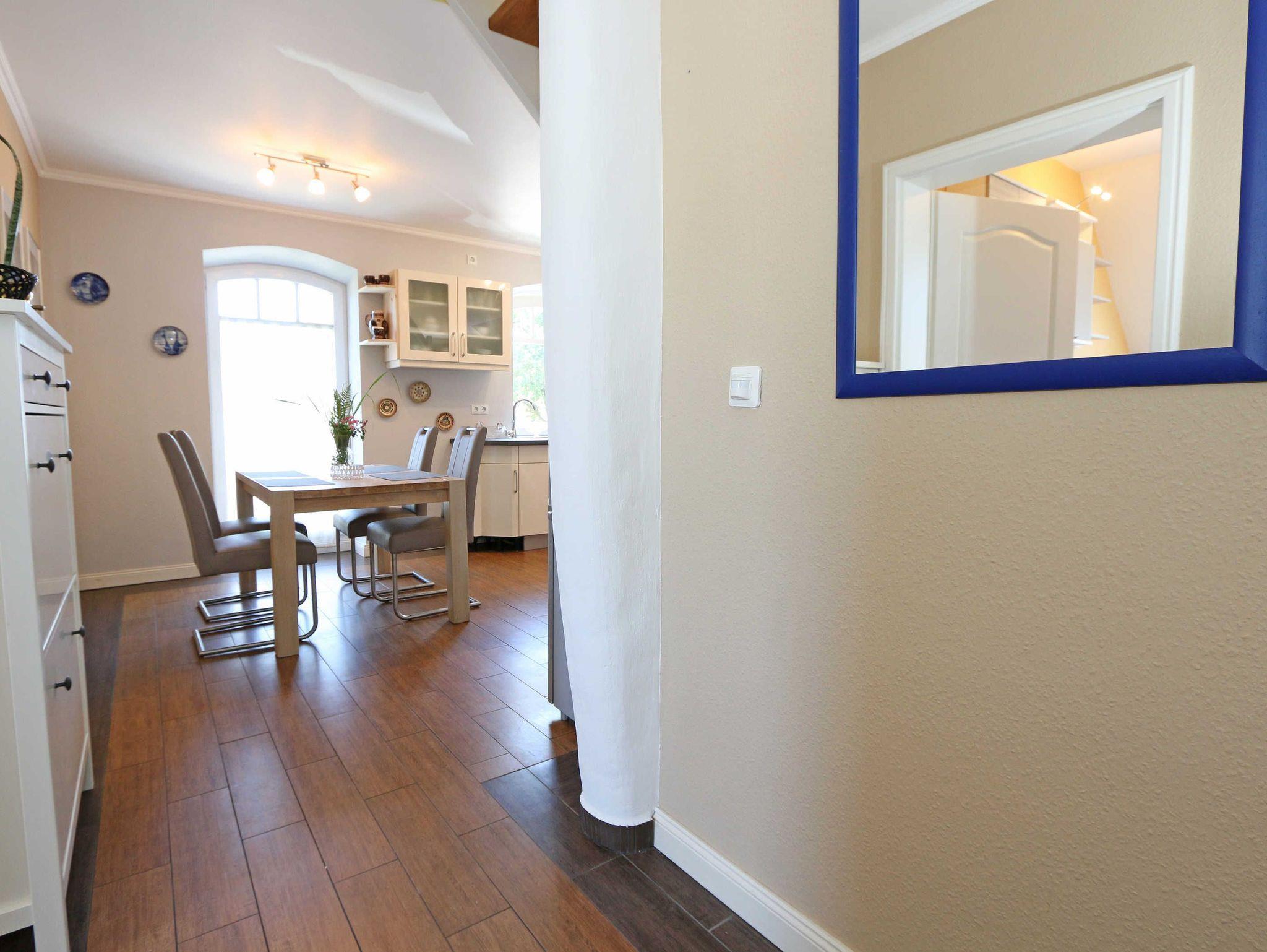 Die großzügige Nichtraucherferienwohnung 02, welche sich über 2 Etagen erstreckt, befindet sich in der 1. Etage des Hauses. Mit Ihren ca. 90 m² bietet Sie ausreichend Platz für max. 6 Erwachsene + 2 Kleinkinder bis 3 Jahre im Kinderreisebett. Auf einer Ebene befinden sich ein Schlafzimmer, ein großes Bad sowie die großzügige Küche mit angrenzendem Wohnbereich. Der gemütliche Wohnbereich umfasst eine große Couchecke mit Couchtisch, Leselampe, Sideboard, Smart-TV sowie eine Mini-Stereo-Anlage. An kühleren Tagen sorgt ein Kamin für Gemütlichkeit und Wärme. Auch auf einen Internetanschluss (WLAN) brauchen Sie im Urlaub nicht verzichten. Dieser ist inklusive für Sie. Von hier gelangen Sie auf den bestuhlten Süd/West Balkon. Die angrenzende und vollausgestattete Küche verfügt über einen Geschirrspüler, Backofen mit Ceranfeld und Abzugshaube, einen großen Kühlschrank mit Eisfach, Mikrowelle, Kaffeemaschine, Toaster, Wasserkocher und diverse Küchenutensilien. Ein Esstisch rundet diesen Bereich ab. Das 1. Schlafzimmer verfügt über ein Doppelbett (1,80 m x 2,00 m), verstellbare Lattenroste, Nachttischablagen, einen Kleiderschrank, Verdunklungsmöglichkeit sowie ein Smart-TV. Das großzügige Tageslicht-Bad umfasst eine Eckbadewanne, eine Dusche, ein WC, einen Waschtisch sowie einen Fön. Über eine Treppe vom Küchenbereich gelangen Sie in die obere Etage. Das 2. Schlafzimmer mit Dachschrägen verfügt über ein Doppelbett (1,80 m x 2,00 m), einen Kleiderschrank, Verdunklungsmöglichkeiten sowie einen Schreibtisch. Das 3. Schlafzimmer verfügt über ein Doppelbett (1,60 m x 2,00 m), verstellbare Lattenroste, Nachttischablagen, einen Kleiderschrank, Verdunklungsmöglichkeiten sowie einen Smart-TV. Ein Gäste-WC mit kleinem Waschbecken rundet die obere Etage ab. Alle Räumlichkeiten wurden mit Fliesen sowie einer Fußbodenheizung ausgestattet. Mit einem eigenen und mitgebrachten Schlafplatz sind max. 2 Haustiere gegen eine Gebühr gern gesehene Gäste. Ihre mitgebrachten oder auch geliehenen Fahrräder können Sie im Schuppen unterstellen. Im separaten Waschhaus können Sie gegen eine Kasse des Vertrauens eine Waschmaschine und einen Trockner nutzen. Ein PKW-Stellplatz mit Ladestation befindet sich direkt am Haus. Die Erstausstattung eines Wäschepaketes (komplette Bettwäsche, 1 Duschhandtuch, 1 kleines Handtuch) können Sie bis 14 Tage vor Anreise gegen einen Aufpreis dazu buchen oder durch eigene ergänzen. Ab 2 gebuchten Paketen erhalten Sie einmalig 1 Geschirrhandtuch und 1 Duschvorleger hinzu.