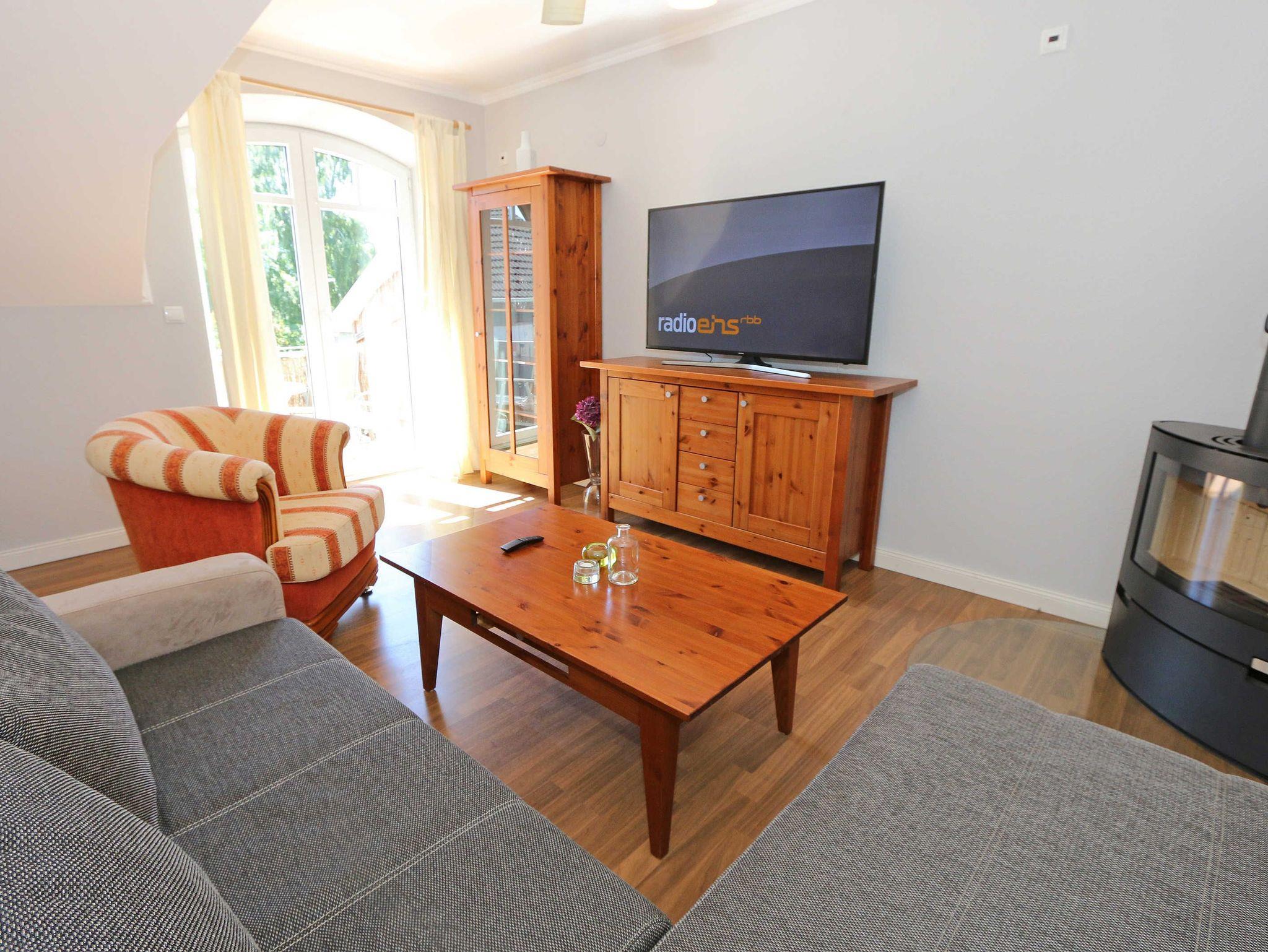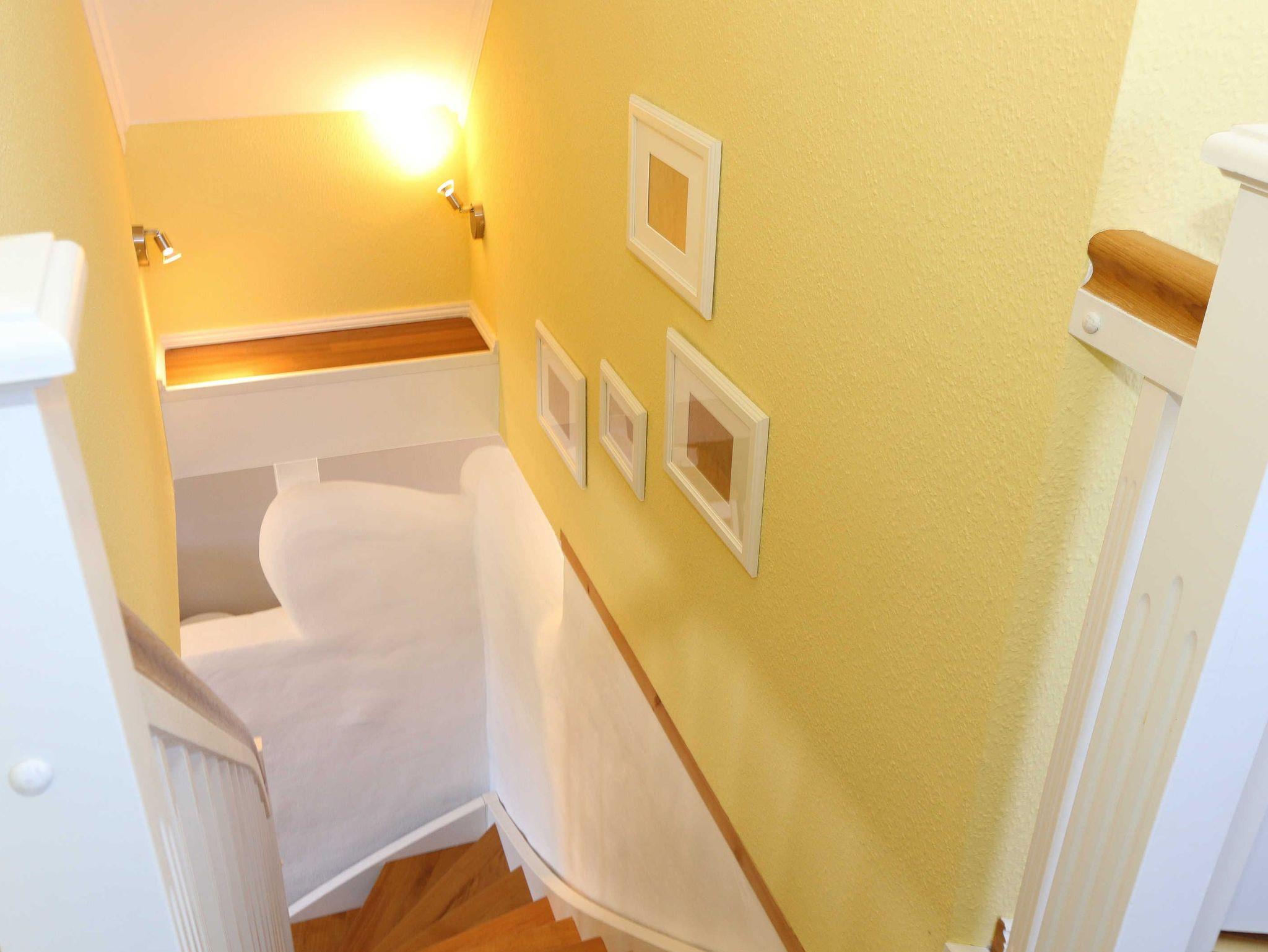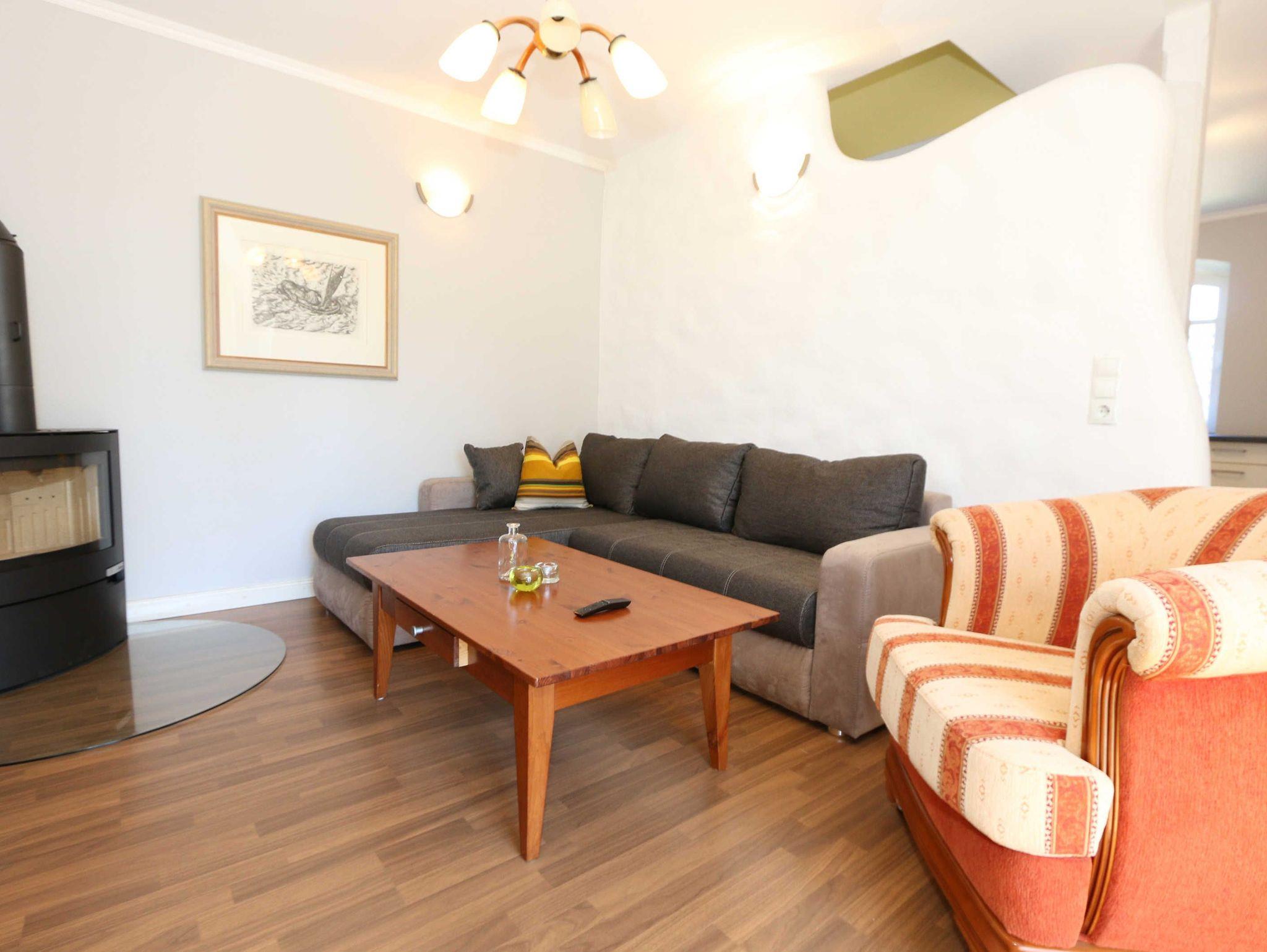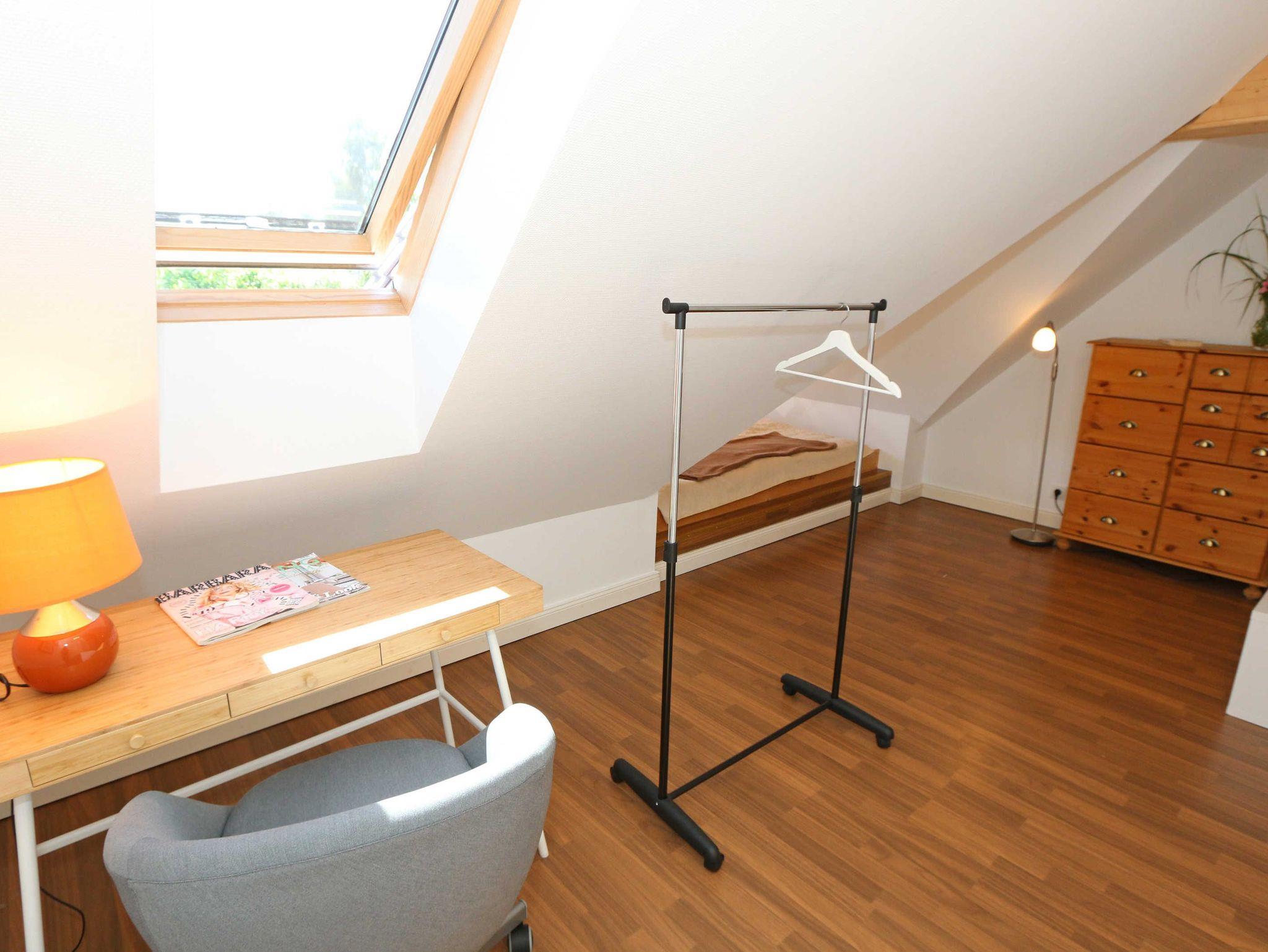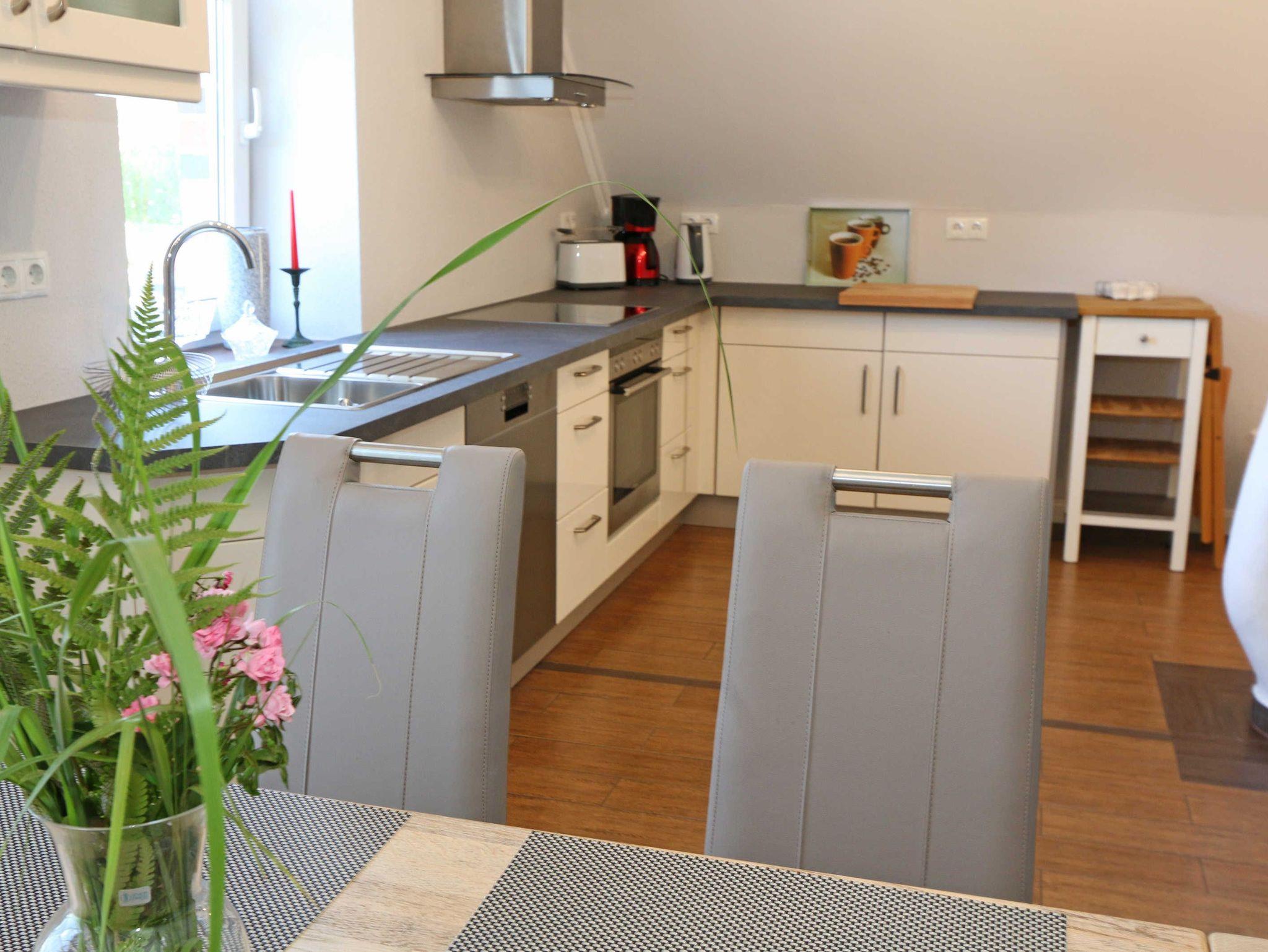 Die großzügige Nichtraucherferienwohnung 02, welche sich über 2 Etagen erstreckt, befindet sich in der 1. Etage des Hauses. Mit Ihren ca. 90 m² bietet Sie ausreichend Platz für max. 6 Erwachsene + 2 Kleinkinder bis 3 Jahre im Kinderreisebett. Auf einer Ebene befinden sich ein Schlafzimmer, ein großes Bad sowie die großzügige Küche mit angrenzendem Wohnbereich. Der gemütliche Wohnbereich umfasst eine große Couchecke mit Couchtisch, Leselampe, Sideboard, Smart-TV sowie eine Mini-Stereo-Anlage. An kühleren Tagen sorgt ein Kamin für Gemütlichkeit und Wärme. Auch auf einen Internetanschluss (WLAN) brauchen Sie im Urlaub nicht verzichten. Dieser ist inklusive für Sie. Von hier gelangen Sie auf den bestuhlten Süd/West Balkon. Die angrenzende und vollausgestattete Küche verfügt über einen Geschirrspüler, Backofen mit Ceranfeld und Abzugshaube, einen großen Kühlschrank mit Eisfach, Mikrowelle, Kaffeemaschine, Toaster, Wasserkocher und diverse Küchenutensilien. Ein Esstisch rundet diesen Bereich ab. Das 1. Schlafzimmer verfügt über ein Doppelbett (1,80 m x 2,00 m), verstellbare Lattenroste, Nachttischablagen, einen Kleiderschrank, Verdunklungsmöglichkeit sowie ein Smart-TV. Das großzügige Tageslicht-Bad umfasst eine Eckbadewanne, eine Dusche, ein WC, einen Waschtisch sowie einen Fön. Über eine Treppe vom Küchenbereich gelangen Sie in die obere Etage. Das 2. Schlafzimmer mit Dachschrägen verfügt über ein Doppelbett (1,80 m x 2,00 m), einen Kleiderschrank, Verdunklungsmöglichkeiten sowie einen Schreibtisch. Das 3. Schlafzimmer verfügt über ein Doppelbett (1,60 m x 2,00 m), verstellbare Lattenroste, Nachttischablagen, einen Kleiderschrank, Verdunklungsmöglichkeiten sowie einen Smart-TV. Ein Gäste-WC mit kleinem Waschbecken rundet die obere Etage ab. Alle Räumlichkeiten wurden mit Fliesen sowie einer Fußbodenheizung ausgestattet. Mit einem eigenen und mitgebrachten Schlafplatz sind max. 2 Haustiere gegen eine Gebühr gern gesehene Gäste. Ihre mitgebrachten oder auch geliehenen Fahrräder können Sie im Schuppen unterstellen. Im separaten Waschhaus können Sie gegen eine Kasse des Vertrauens eine Waschmaschine und einen Trockner nutzen. Ein PKW-Stellplatz mit Ladestation befindet sich direkt am Haus. Die Erstausstattung eines Wäschepaketes (komplette Bettwäsche, 1 Duschhandtuch, 1 kleines Handtuch) können Sie bis 14 Tage vor Anreise gegen einen Aufpreis dazu buchen oder durch eigene ergänzen. Ab 2 gebuchten Paketen erhalten Sie einmalig 1 Geschirrhandtuch und 1 Duschvorleger hinzu.
