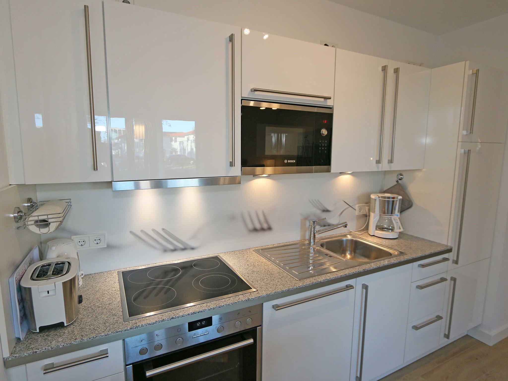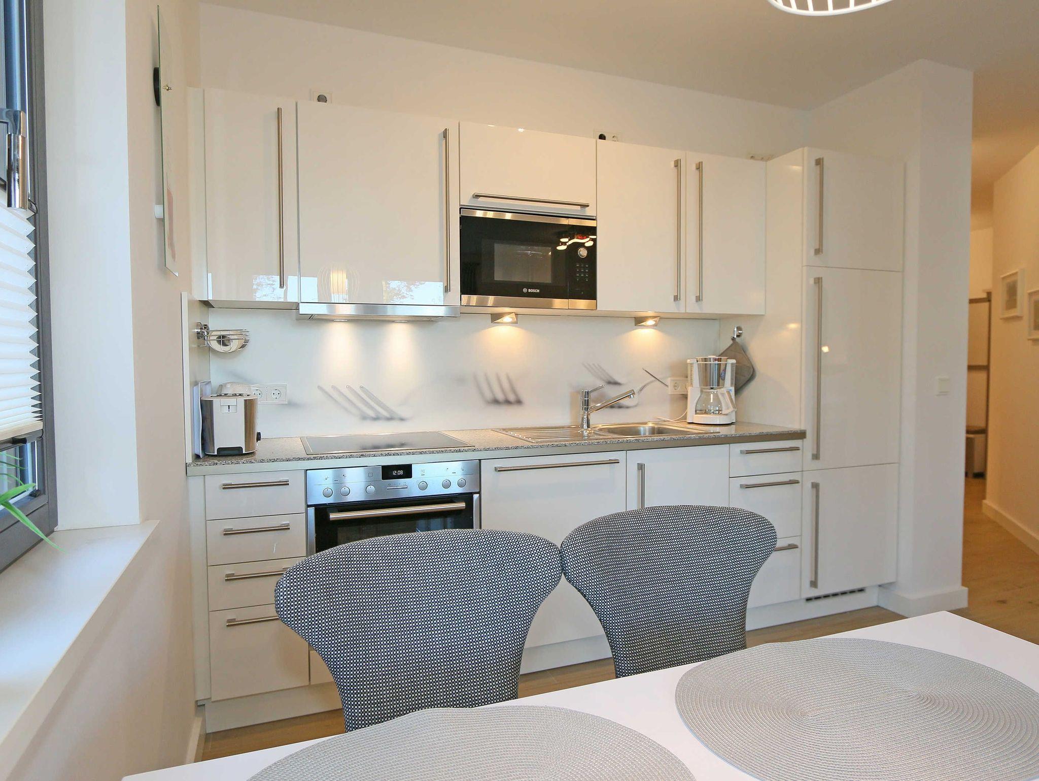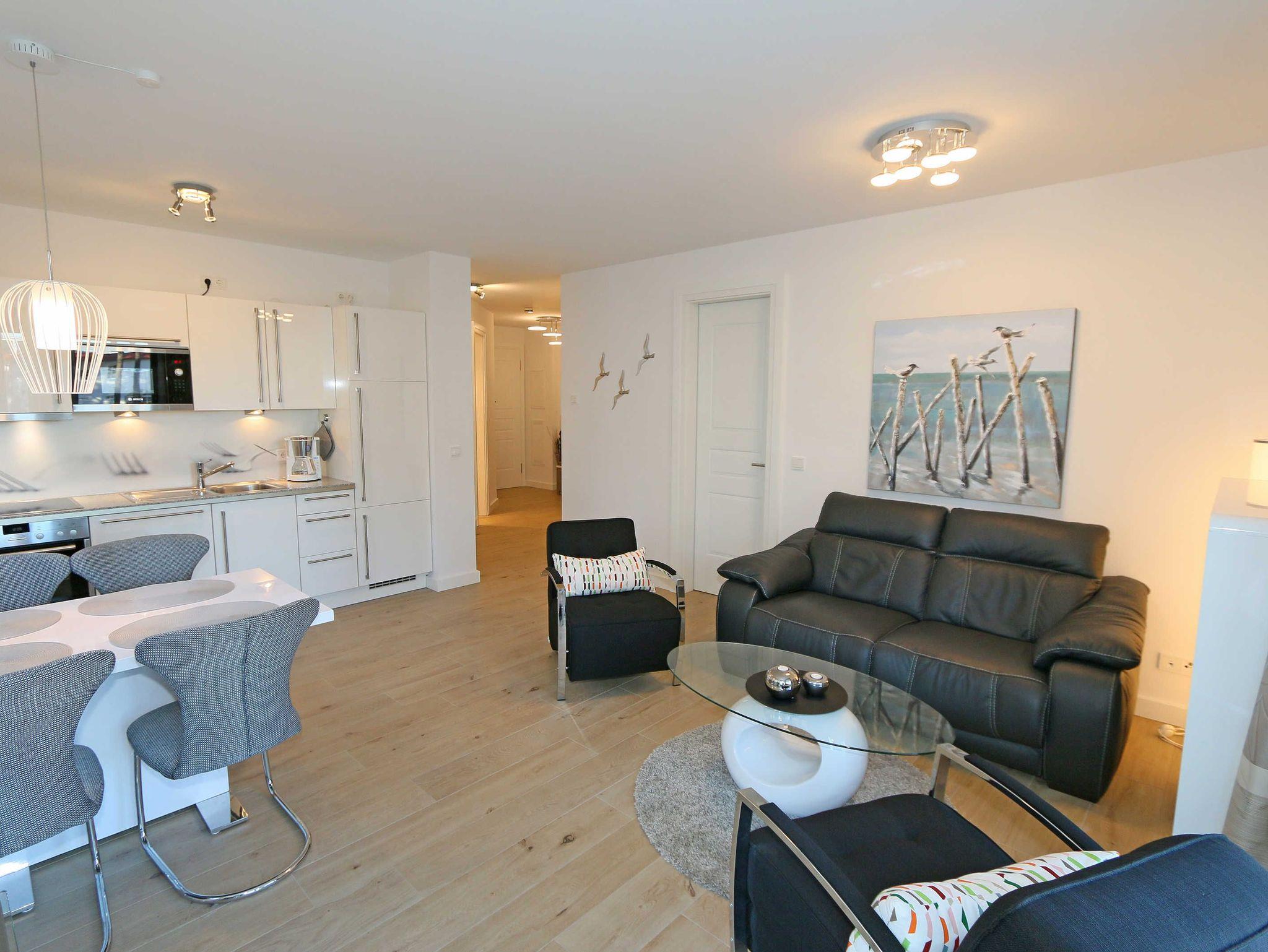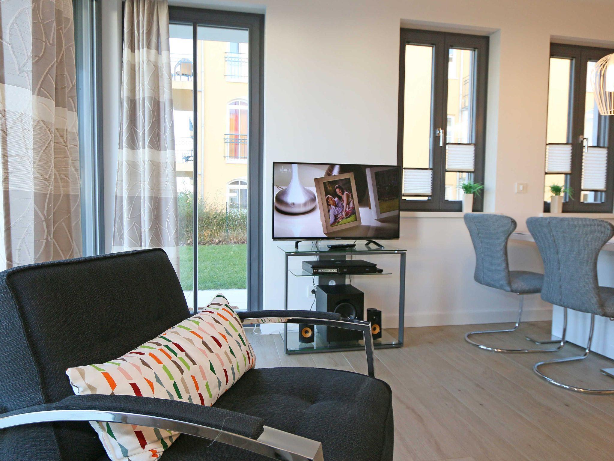 Die 67 m² große Nichtraucherwohnung mit exzellenter Raumaufteilung und hochwertiger Ausstattung bietet Ihnen alle Möglichkeiten für einen erholsamen Urlaub für max. 2 bis 4 Erwachsene. Im hellen Wohn/Esszimmer können Sie in der bequemen Sitzgarnitur mit Couch + 2 Sessel, Couchtisch mit Stehlampe entspannen, ein LG Heimkinosystem mit Blu Ray Player, DVD, Smart TV sowie ein Internet-Radio, CD, Bluetooth, USB und MP3 sorgen für Ihre Unterhaltung. Ein Internetanschluss (WLAN) ist für Sie zusätzlich inklusive. Ein Essplatz für 4 Personen befindet sich vor der mit allem Komfort ausgestatteten Küchenzeile. Hier sind ein Geschirrspüler, 4 Zonen-Ceranfeld mit Backofen, ein Kühlschrank mit Gefrierfach, eine Mikrowelle sowie eine Kaffeemaschine, Toaster, Wasserkocher und viele kleine Küchenhelfer selbstverständlich vorhanden. Vom Wohnbereich gelangen Sie auf die bestuhlte mit Strandkorb (in der Saison) und überdachte Terrasse (Süd/Ost) mit Blick auf den Kurpark. Beide Schlafzimmer sind mit bequemen Boxspringbetten (1,80 m x 2,00 m, durchgehender Topper), Nachttischablagen, Smart-TV und ausreichend Schrankflächen für Ihre Urlaubsgarderobe ausgestattet. Das Aufstellen eines Reisebettes ist in den Schlafzimmern nicht möglich. Das größere Schlafzimmer hat ein eigenes Duschbad, mit Waschtisch, elektrischer Handtuchtrockner, Kosmetikspiegel, Fön und WC. Für einen angenehmen Schlaf sorgen die Außenjalousien. Ein weiteres Bad mit ebenerdiger Regendusche, Waschplatz, elektrischem Handtuchtrockner und WC ist vom geräumigen Flurbereich begehbar. Ein Wäschetrockner/ständer, Bügeleisen sowie ein Staubsauger steht für Sie bereit. In beiden Schlafräumen sowie im Essbereich befinden sich Insektenschutzgitter. Von Ihrem Tiefgaragenstellplatz (Nr. 02/ Einfahrtshöhe 2,00m) gelangen Sie bequem mit dem Aufzug zu Ihrer Ferienwohnung. Durch einen Münzautomaten können Sie die gemeinschaftliche Waschmaschine und Trockner nutzen. Auch die Haus und Münzbetriebene Sauna mit Duschbereich sowie Ruheraum tragen für einen entspannten Urlaub bei. Ihre mitgebrachten oder geliehenen Fahrräder können Sie im begrünten Außenbereich in einem Fahrradhäuschen abstellen. Auch 1 Haustier mit seinem eigenen Schlafplatz ist gegen eine Gebühr ein gern gesehener Gast. Die Erstausstattung eines Wäschepaketes (komplette Bettwäsche, 1 Duschhandtuch, 2 kleine Handtücher) können Sie bis 14 Tage vor Anreise gegen einen Aufpreis dazu buchen oder durch eigene ergänzen. Ab 2 gebuchten Paketen erhalten Sie einmalig 1 Geschirrhandtuch und 1 Duschvorleger hinzu.