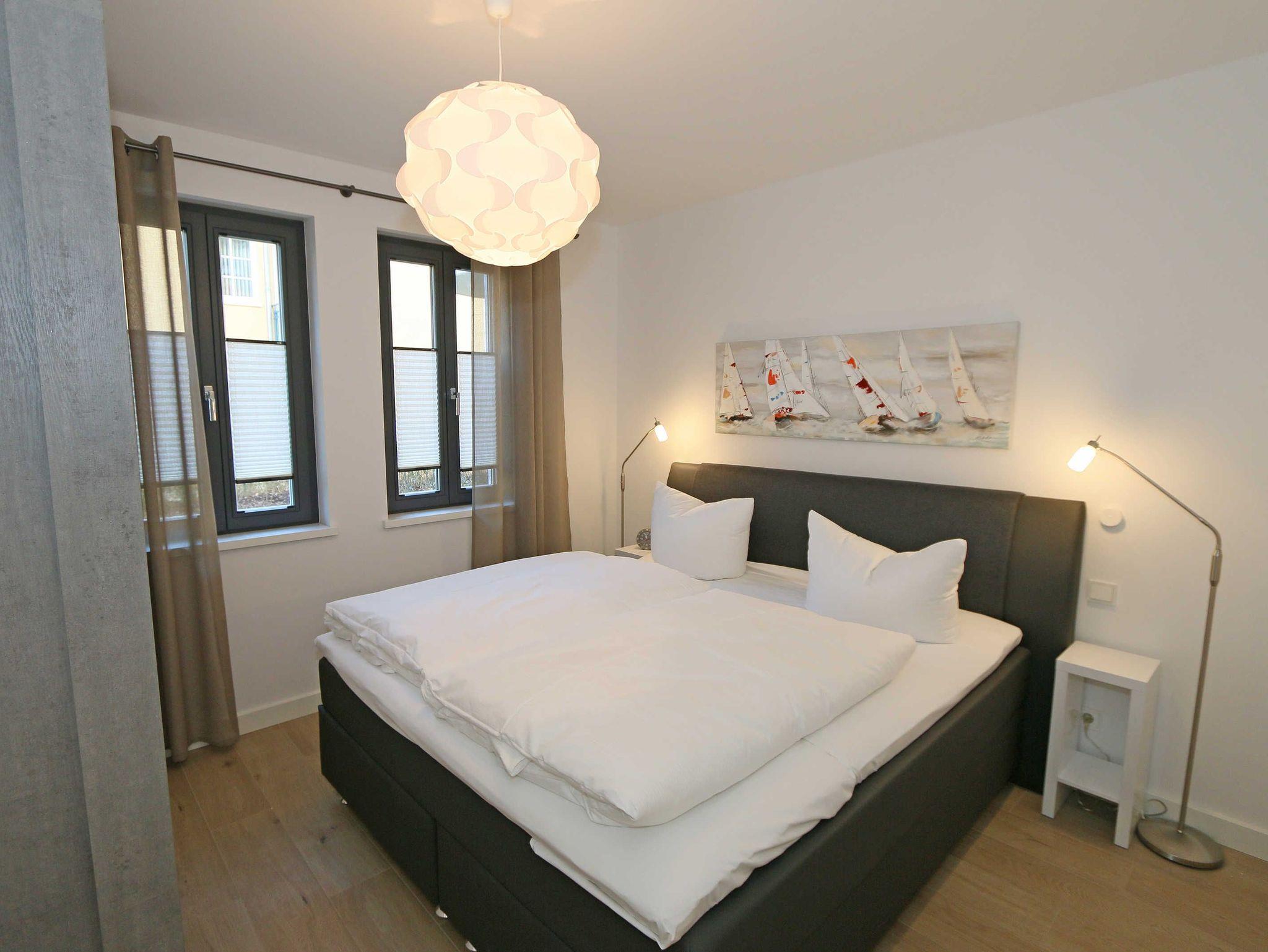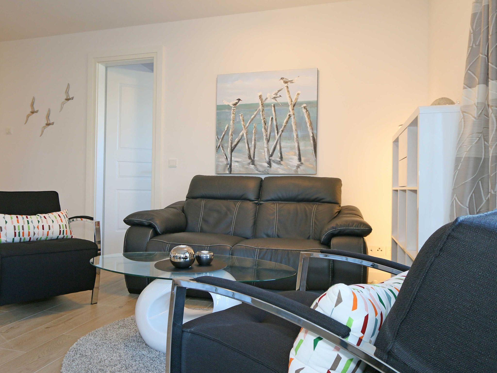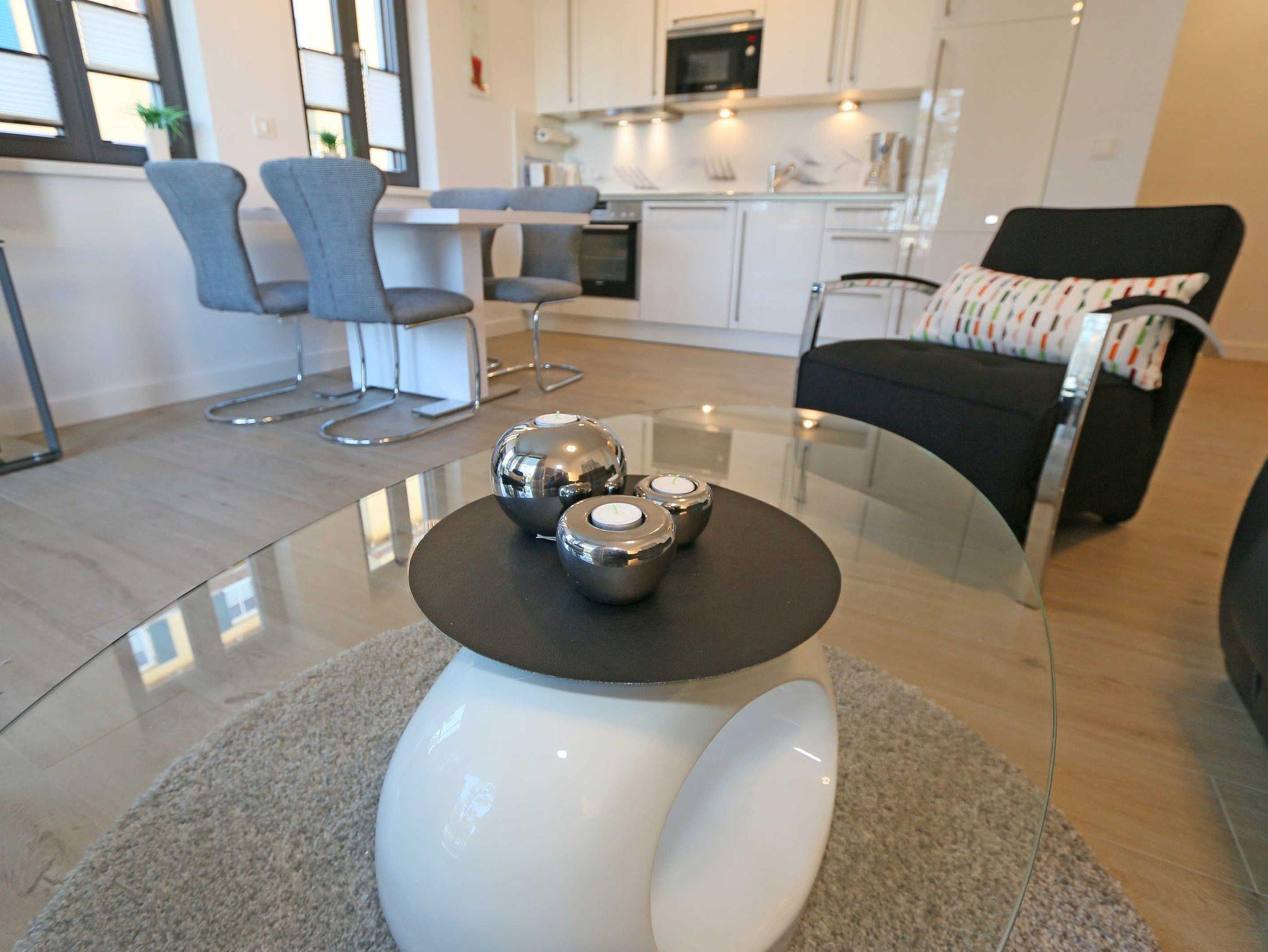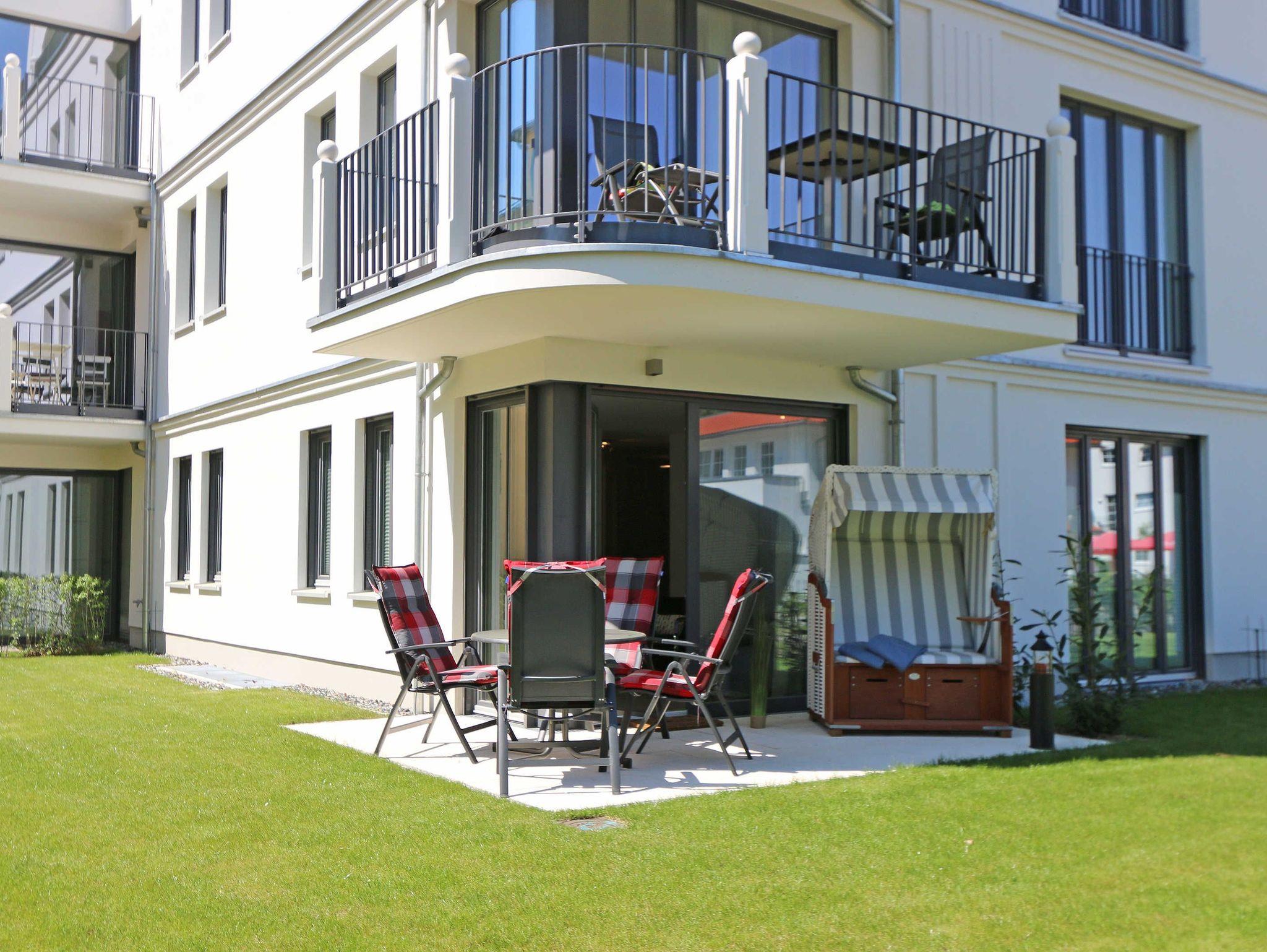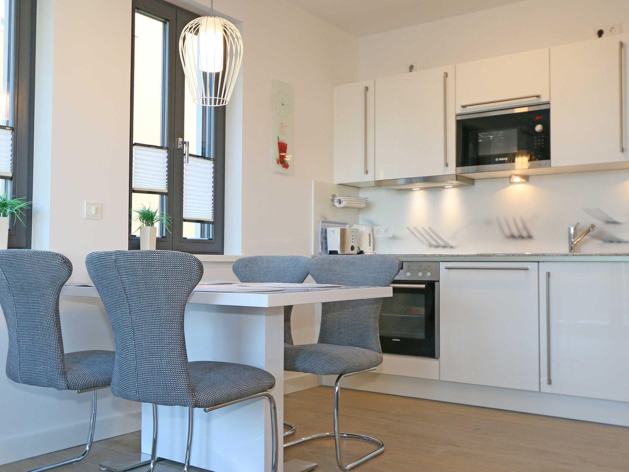 Die 67 m² große Nichtraucherwohnung mit exzellenter Raumaufteilung und hochwertiger Ausstattung bietet Ihnen alle Möglichkeiten für einen erholsamen Urlaub für max. 2 bis 4 Erwachsene. Im hellen Wohn/Esszimmer können Sie in der bequemen Sitzgarnitur mit Couch + 2 Sessel, Couchtisch mit Stehlampe entspannen, ein LG Heimkinosystem mit Blu Ray Player, DVD, Smart TV sowie ein Internet-Radio, CD, Bluetooth, USB und MP3 sorgen für Ihre Unterhaltung. Ein Internetanschluss (WLAN) ist für Sie zusätzlich inklusive. Ein Essplatz für 4 Personen befindet sich vor der mit allem Komfort ausgestatteten Küchenzeile. Hier sind ein Geschirrspüler, 4 Zonen-Ceranfeld mit Backofen, ein Kühlschrank mit Gefrierfach, eine Mikrowelle sowie eine Kaffeemaschine, Toaster, Wasserkocher und viele kleine Küchenhelfer selbstverständlich vorhanden. Vom Wohnbereich gelangen Sie auf die bestuhlte mit Strandkorb (in der Saison) und überdachte Terrasse (Süd/Ost) mit Blick auf den Kurpark. Beide Schlafzimmer sind mit bequemen Boxspringbetten (1,80 m x 2,00 m, durchgehender Topper), Nachttischablagen, Smart-TV und ausreichend Schrankflächen für Ihre Urlaubsgarderobe ausgestattet. Das Aufstellen eines Reisebettes ist in den Schlafzimmern nicht möglich. Das größere Schlafzimmer hat ein eigenes Duschbad, mit Waschtisch, elektrischer Handtuchtrockner, Kosmetikspiegel, Fön und WC. Für einen angenehmen Schlaf sorgen die Außenjalousien. Ein weiteres Bad mit ebenerdiger Regendusche, Waschplatz, elektrischem Handtuchtrockner und WC ist vom geräumigen Flurbereich begehbar. Ein Wäschetrockner/ständer, Bügeleisen sowie ein Staubsauger steht für Sie bereit. In beiden Schlafräumen sowie im Essbereich befinden sich Insektenschutzgitter. Von Ihrem Tiefgaragenstellplatz (Nr. 02/ Einfahrtshöhe 2,00m) gelangen Sie bequem mit dem Aufzug zu Ihrer Ferienwohnung. Durch einen Münzautomaten können Sie die gemeinschaftliche Waschmaschine und Trockner nutzen. Auch die Haus und Münzbetriebene Sauna mit Duschbereich sowie Ruheraum tragen für einen entspannten Urlaub bei. Ihre mitgebrachten oder geliehenen Fahrräder können Sie im begrünten Außenbereich in einem Fahrradhäuschen abstellen. Auch 1 Haustier mit seinem eigenen Schlafplatz ist gegen eine Gebühr ein gern gesehener Gast. Die Erstausstattung eines Wäschepaketes (komplette Bettwäsche, 1 Duschhandtuch, 2 kleine Handtücher) können Sie bis 14 Tage vor Anreise gegen einen Aufpreis dazu buchen oder durch eigene ergänzen. Ab 2 gebuchten Paketen erhalten Sie einmalig 1 Geschirrhandtuch und 1 Duschvorleger hinzu.
