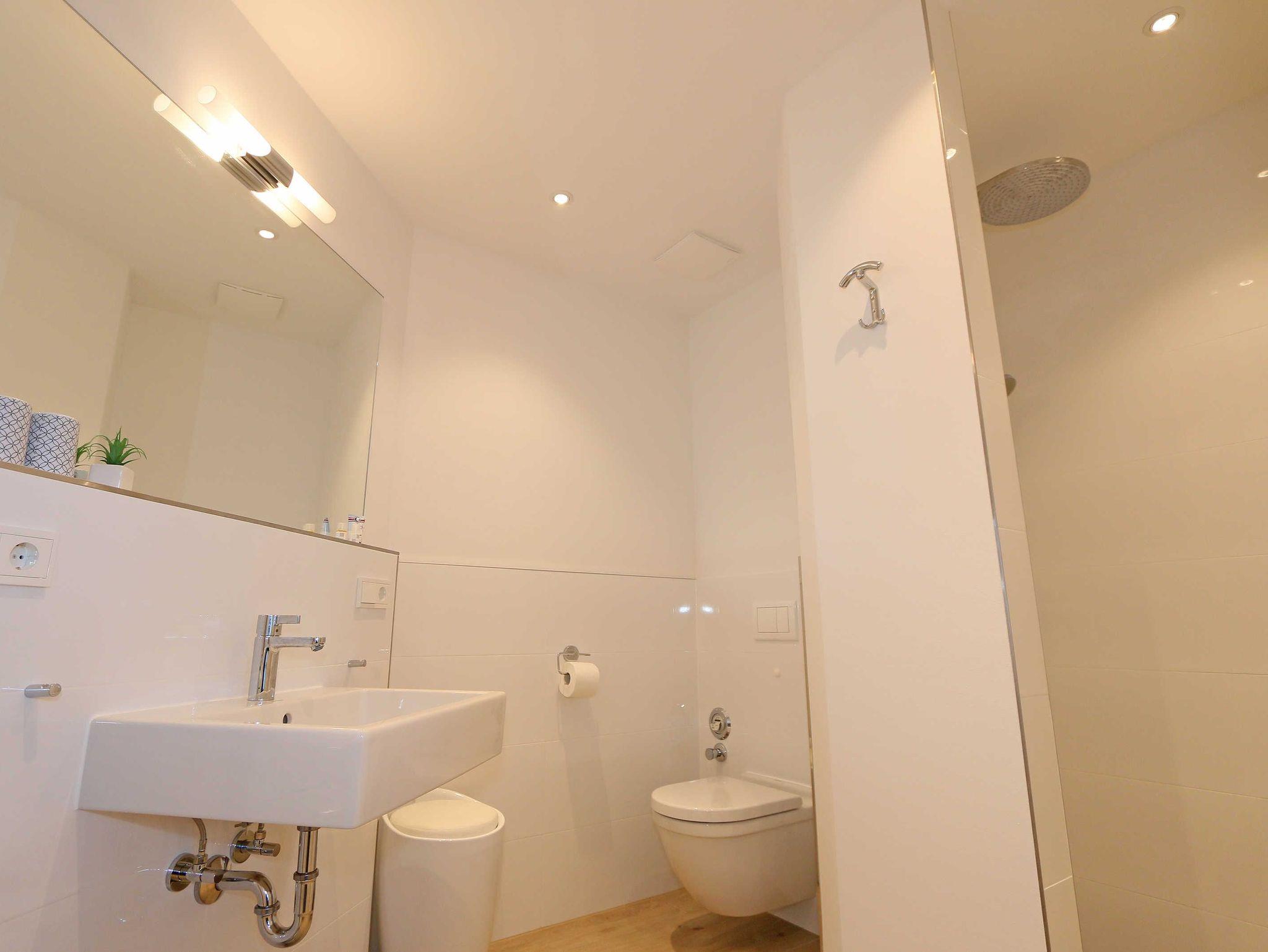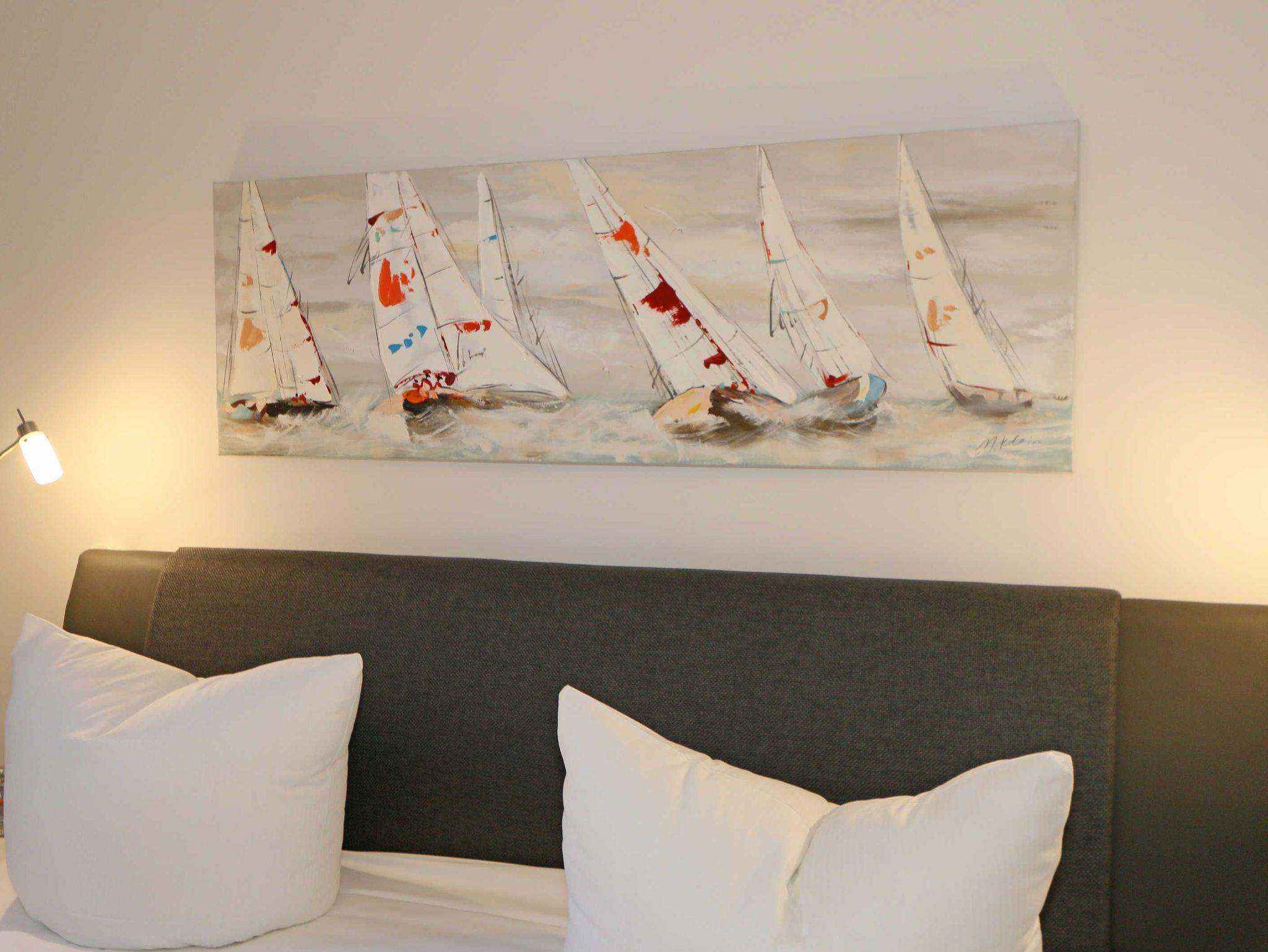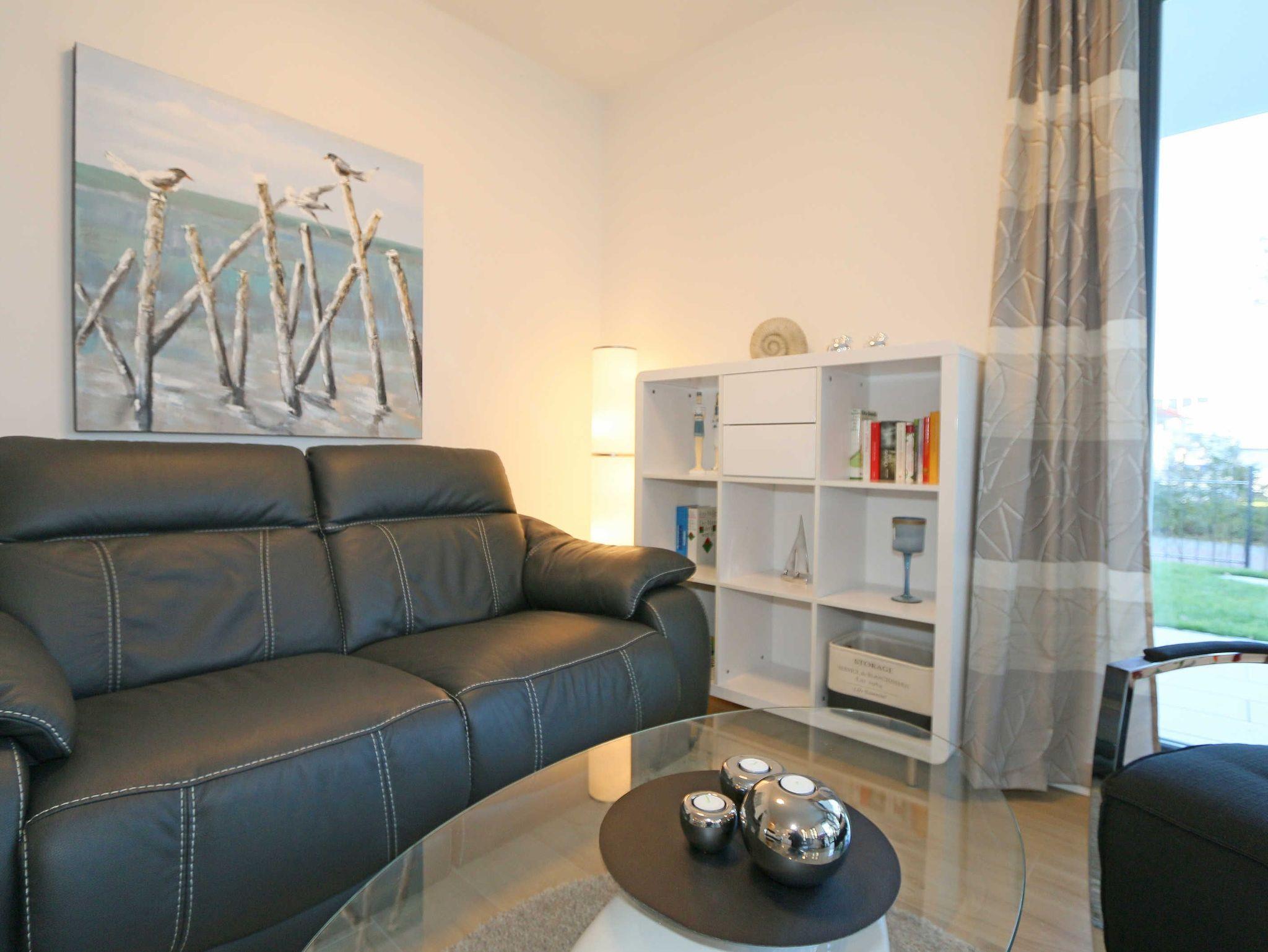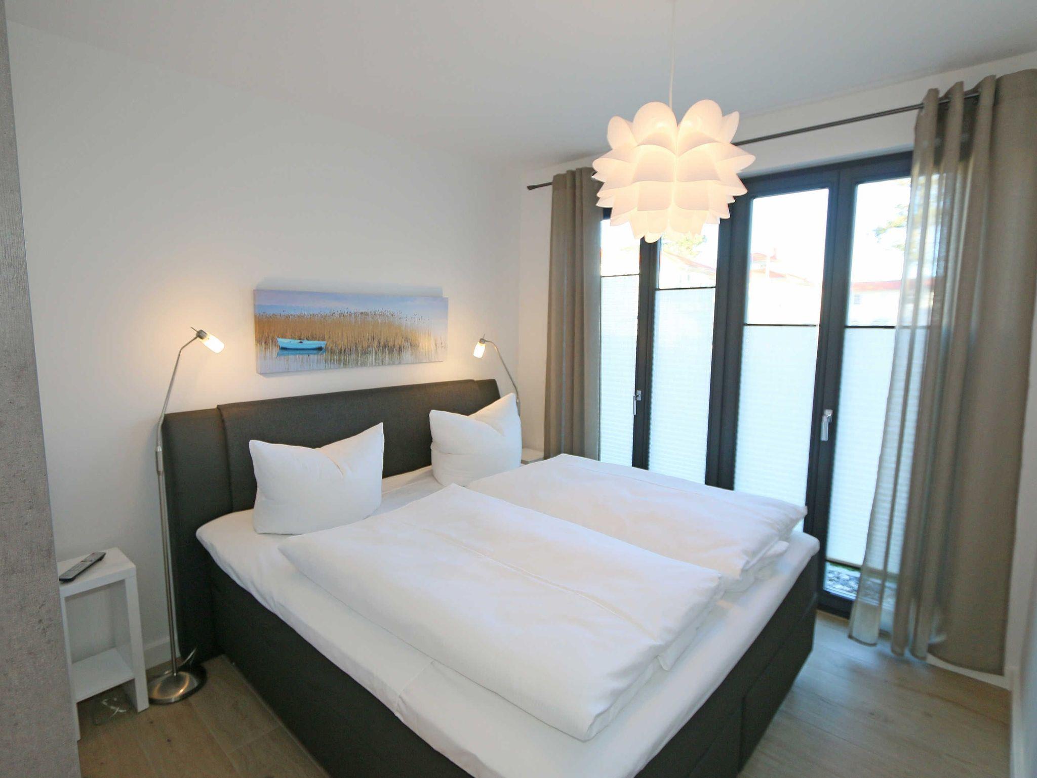 Die 67 m² große Nichtraucherwohnung mit exzellenter Raumaufteilung und hochwertiger Ausstattung bietet Ihnen alle Möglichkeiten für einen erholsamen Urlaub für max. 2 bis 4 Erwachsene. Im hellen Wohn/Esszimmer können Sie in der bequemen Sitzgarnitur mit Couch + 2 Sessel, Couchtisch mit Stehlampe entspannen, ein LG Heimkinosystem mit Blu Ray Player, DVD, Smart TV sowie ein Internet-Radio, CD, Bluetooth, USB und MP3 sorgen für Ihre Unterhaltung. Ein Internetanschluss (WLAN) ist für Sie zusätzlich inklusive. Ein Essplatz für 4 Personen befindet sich vor der mit allem Komfort ausgestatteten Küchenzeile. Hier sind ein Geschirrspüler, 4 Zonen-Ceranfeld mit Backofen, ein Kühlschrank mit Gefrierfach, eine Mikrowelle sowie eine Kaffeemaschine, Toaster, Wasserkocher und viele kleine Küchenhelfer selbstverständlich vorhanden. Vom Wohnbereich gelangen Sie auf die bestuhlte mit Strandkorb (in der Saison) und überdachte Terrasse (Süd/Ost) mit Blick auf den Kurpark. Beide Schlafzimmer sind mit bequemen Boxspringbetten (1,80 m x 2,00 m, durchgehender Topper), Nachttischablagen, Smart-TV und ausreichend Schrankflächen für Ihre Urlaubsgarderobe ausgestattet. Das Aufstellen eines Reisebettes ist in den Schlafzimmern nicht möglich. Das größere Schlafzimmer hat ein eigenes Duschbad, mit Waschtisch, elektrischer Handtuchtrockner, Kosmetikspiegel, Fön und WC. Für einen angenehmen Schlaf sorgen die Außenjalousien. Ein weiteres Bad mit ebenerdiger Regendusche, Waschplatz, elektrischem Handtuchtrockner und WC ist vom geräumigen Flurbereich begehbar. Ein Wäschetrockner/ständer, Bügeleisen sowie ein Staubsauger steht für Sie bereit. In beiden Schlafräumen sowie im Essbereich befinden sich Insektenschutzgitter. Von Ihrem Tiefgaragenstellplatz (Nr. 02/ Einfahrtshöhe 2,00m) gelangen Sie bequem mit dem Aufzug zu Ihrer Ferienwohnung. Durch einen Münzautomaten können Sie die gemeinschaftliche Waschmaschine und Trockner nutzen. Auch die Haus und Münzbetriebene Sauna mit Duschbereich sowie Ruheraum tragen für einen entspannten Urlaub bei. Ihre mitgebrachten oder geliehenen Fahrräder können Sie im begrünten Außenbereich in einem Fahrradhäuschen abstellen. Auch 1 Haustier mit seinem eigenen Schlafplatz ist gegen eine Gebühr ein gern gesehener Gast. Die Erstausstattung eines Wäschepaketes (komplette Bettwäsche, 1 Duschhandtuch, 2 kleine Handtücher) können Sie bis 14 Tage vor Anreise gegen einen Aufpreis dazu buchen oder durch eigene ergänzen. Ab 2 gebuchten Paketen erhalten Sie einmalig 1 Geschirrhandtuch und 1 Duschvorleger hinzu.