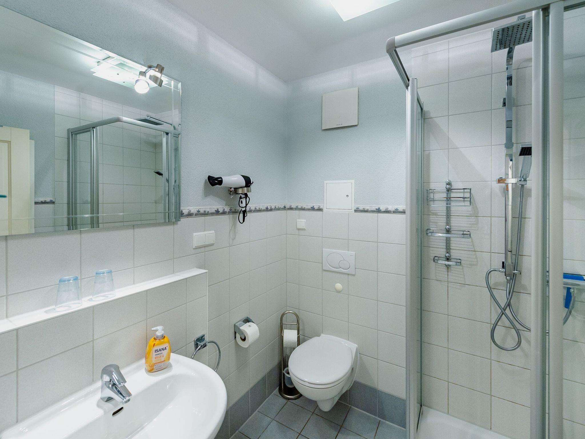 Das geflieste Badezimmer Ihres Urlaubsdomizils überzeugt mit Dusche/WC, einem beleuchteten Waschtisch, Fußbodenheizung und Fön. Für die Urlaubswäsche zwischendurch stehen im Untergeschoss des Hauses eine gemeinschaftlich nutzbare Waschmaschine sowie Bügelutensilien bereit. Die Nutzung ist kostenfrei.