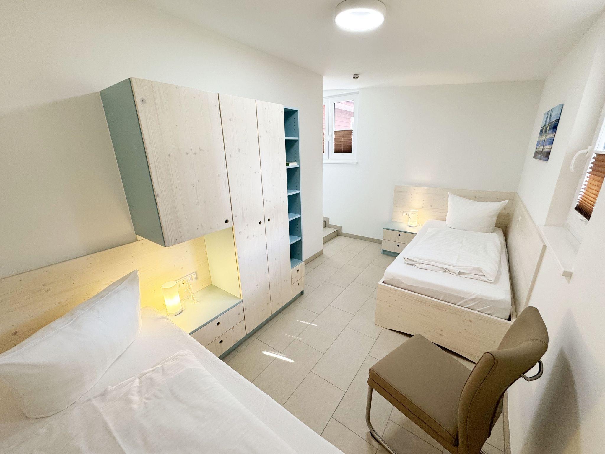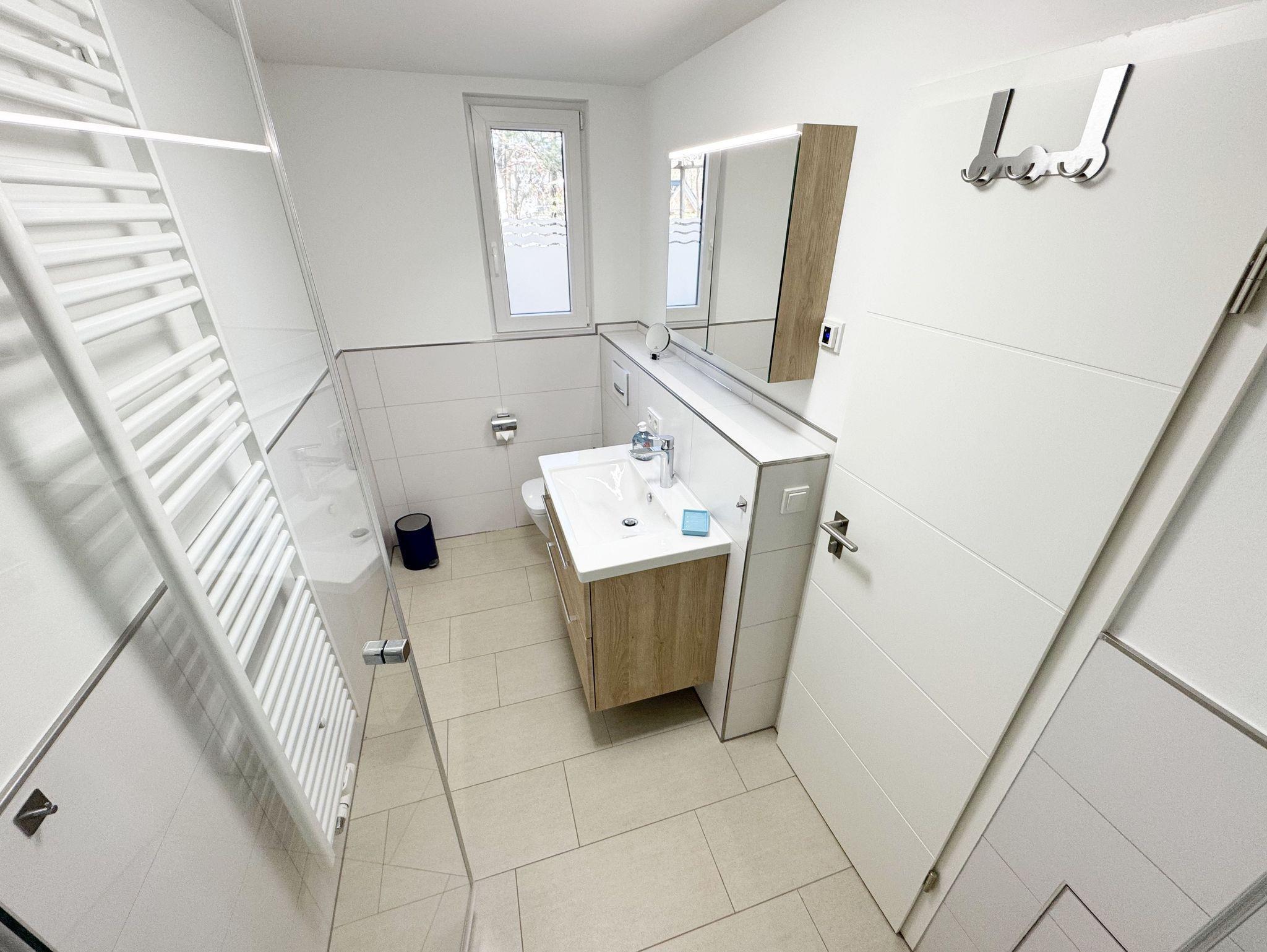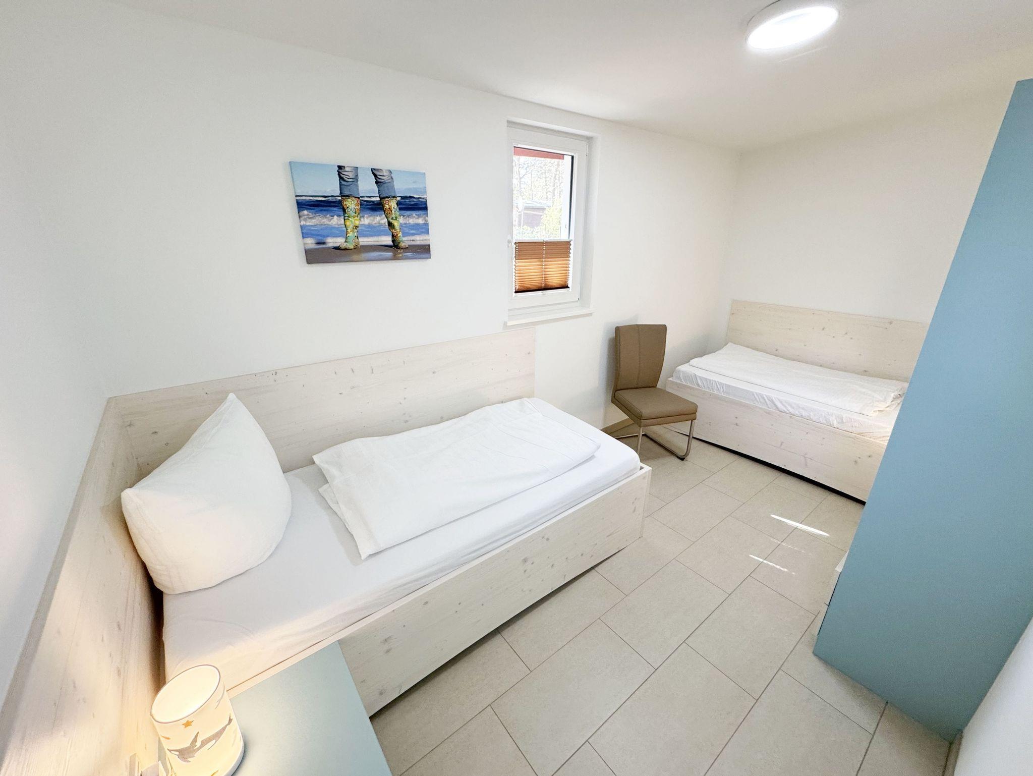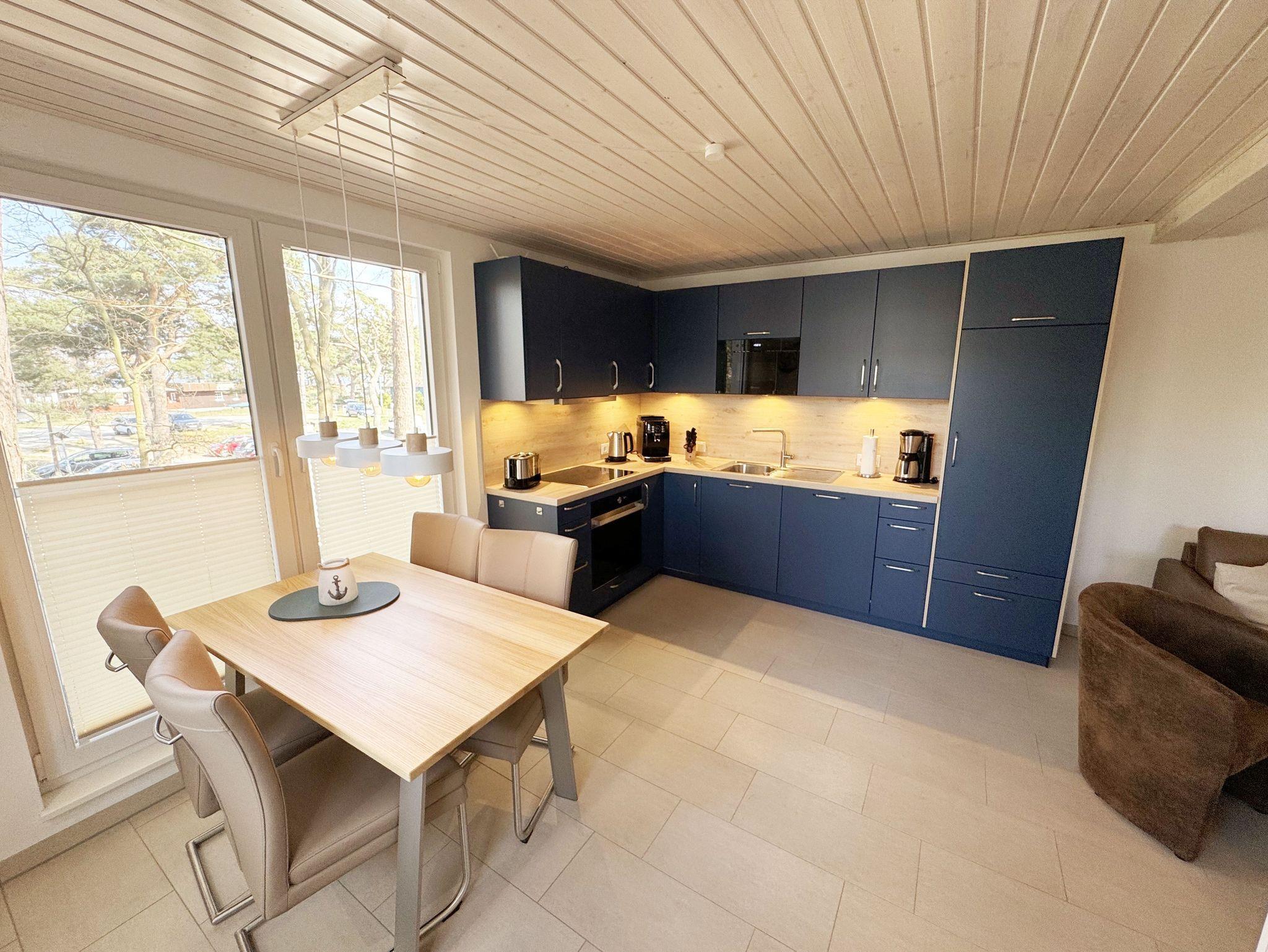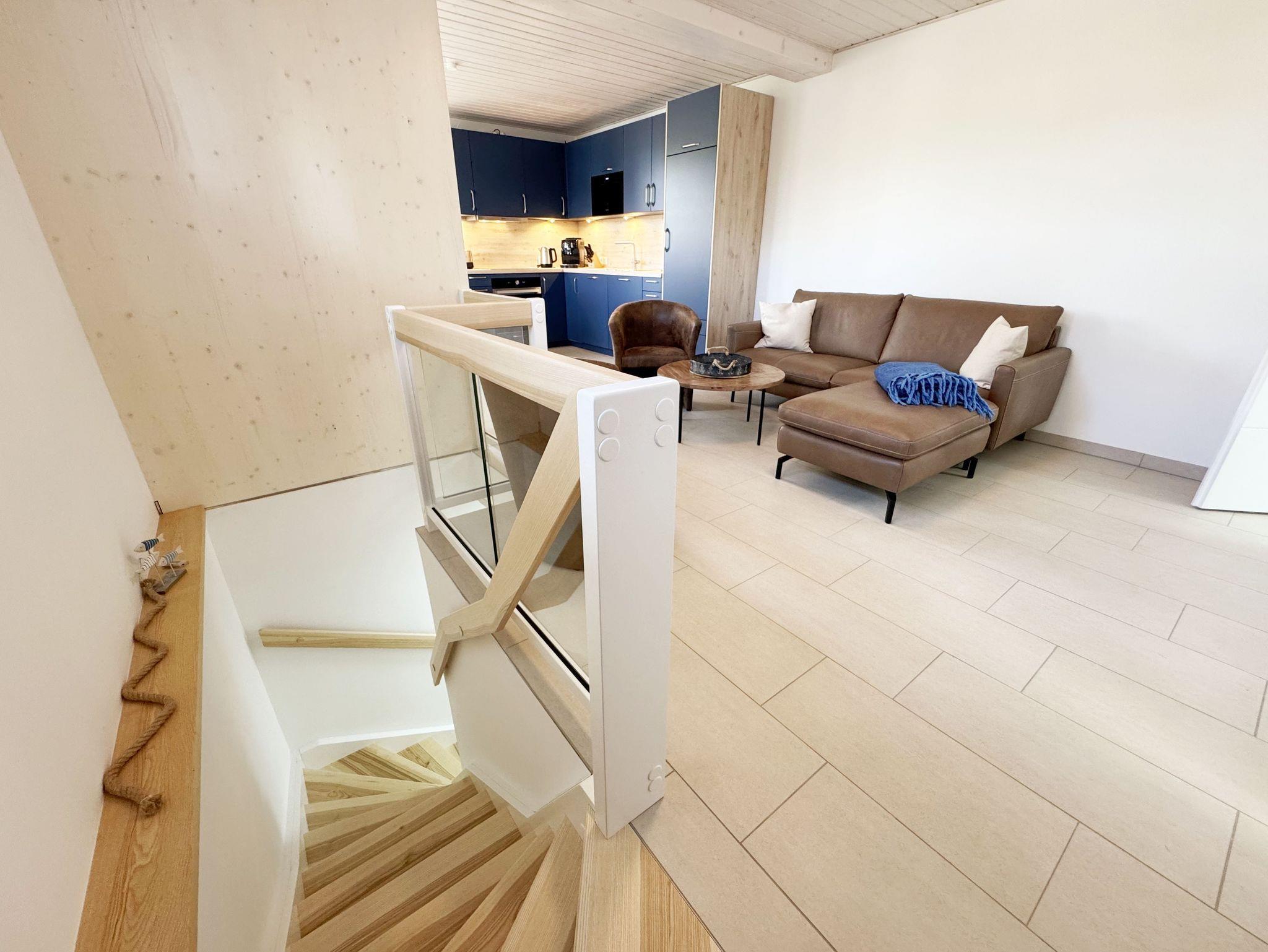 Die komfortable harmonisch eingerichtete DHH Nr. 2 im Haus Düne besticht mit einer durchdachten Raumaufteilung. Auf ca. 70 qm ist diese Nichtraucherwohnung mit viel Liebe zum Detail eingerichtet und bietet ausreichend Platz für bis zu 4 Erwachsene + 1 Kleinkind bis 3 Jahre im Kinderreisebett. Über einen kleinen Absatz gelangen sie in den sehr hellen, mit bodentiefen Fenstern versehenden, Wohn-Essbereich mit Garderobe. Die hochwertige Einbauküchenzeile ist das Herzstück der oberen Etage, welche mit einem Geschirrspüler, einem Kühlschrank mit Eisfach, einen Backofen, ein 4 Zonen Cerankochfeld, einer Mikrowelle, einer Kaffeemaschine, einem Kaffeevollautomat, einem Toaster, einem Wasserkocher, einem Mixer und diversen Küchenutensilien bestückt ist. Ein moderner Esstisch rundet diesen Bereich ab. Der helle Wohnbereich ist mit einer gemütlichen Couch, einem Couchtisch, einer Stehlampe und einer Anrichte mit Smart-TV und WLAN-Zugang bestückt. Durch die bodentiefen Fensterfronten beim Essplatz, die den Raum bestimmen, haben Sie einen weitläufigen Blick auf die Ostsee. So können Sie in absoluter Ruhe den Ausblick genießen. Gesellschaftsspiele und eine kleine Auswahl an Urlaubslektüre lassen Sie auch mal auf andere Gedanken bringen. Von hier gelangen Sie auch auf Ihre bestuhlte Terrasse (Süd/Ost) mit Sonnenliegen und Sonnenschirm. Auf gleicher Ebene aber durch 2 Stufen erreichbar, befindet sich das 1. Schlafzimmer mit 2 Einzelbetten (á 0,90m x 2,00m), verstellbare Lattenroste, Nachttischablagen sowie einem Kleiderschrank mit Safe, Insektenschutzgitter und Verdunklungsmöglichkeiten. Auch eines von 2 Bädern begehen Sie vom Wohnbereich. Das Tageslichtbad ist mit einer ebenerdigen Regen-Dusche und einer Echt-Glasabtrennung, einem WC, einem Waschplatz, einem Fön, einen Kosmetikspiegel, und einem Handtuchtrockner ausgestattet. Ein weiteres Schlafzimmer sowie ein weiteres Bad befinden sich in der unteren Etage, welche Sie durch eine Treppe im Wohnbereich erreichen. Das 2. Schlafzimmer verfügt über ein Doppelbett (1,80m x 2,00m), verstellbare Lattenroste, Nachttischablagen, einen Kleiderschrank, Insektenschutzgitter sowie Verdunklungsmöglichkeiten. Das 2. Tageslichtbad verfügt über eine ebenerdige Dusche, ein WC, einem Waschplatz, einer Waschmaschine mit Trocknerfunktion sowie das Highlight des Hauses eine Sauna, die Ihnen an kalten Tagen nach dem Spaziergang eine wohlige Wärme gibt. Für ein komfortables Ambiente sorgen zudem hochwertige Fliesen sowie eine Fußbodenheizung. Ein Wäscheständer, ein Bügeleisen, ein Bügelbrett, ein Staubsauger sowie Reinigungsutensilien sind zusätzliche Ausstattungsmerkmale. Haustiere sind nicht erlaubt. Das großzügige Grundstück, welches naturbelassen gestaltet wurde, lädt zu einer Runde Badminton oder auch diversen Ballspielen ein. Ihre mitgebrachten oder geliehenen Fahrräder können Sie im Gemeinschaftsschuppen einschließen. Ein PKW-Stellplatz befindet sich direkt auf dem Grundstück. Die Erstausstattung eines Wäschepaketes (komplette Bettwäsche, 1 Duschhandtuch, 2 kleine Handtücher) können Sie bis 14 Tage vor der Anreise gegen einen Aufpreis dazu buchen oder durch eigenes Ergänzen. Ab 2 gebuchten Paketen erhalten Sie einmalig 1 Geschirrtuch und einen Duschvorleger dazu.