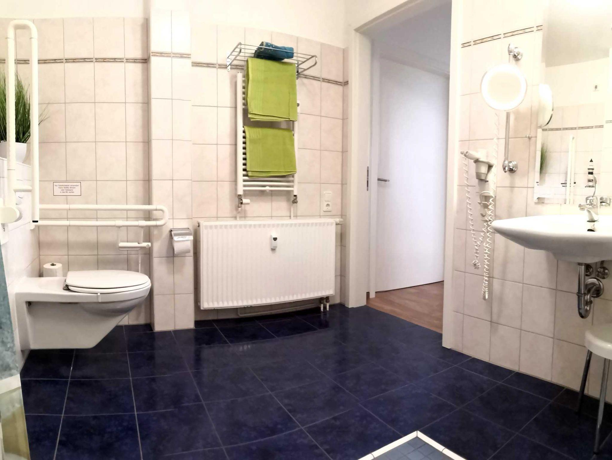 Das komplette Appartement ist barrierefrei und somit rollstuhlgerecht ausgestattet. Sämtliche Einrichtungen wie Spüle, Herd, Waschbecken, etc. sind unterfahrbar. Die Dusche und alle Türschwellen, auch zur Terrasse, sind ebenerdig und barrierefrei passierbar. Ins Souterrain gelangen Sie über das Treppenhaus mittels integriertem Aufzug. Egal, ob Türbreiten oder Handgriffe von Türen und Fenstern, Badeinrichtung, Küchenzeile oder Schlafbereich, überall wurde darauf geachtet, den Belangen von Rollstuhlfahrern gerecht zu werden und zudem ausreichend Platz zum Wenden zu bieten.