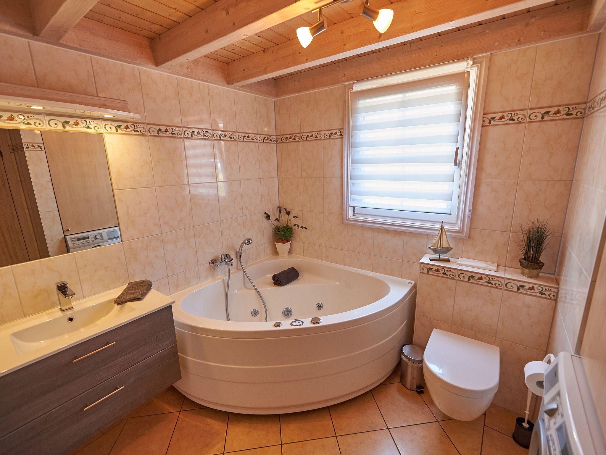 Im Erdgeschoss finden Sie außerdem ein geräumiges Badezimmer mit Dusche/WC, einer Badewanne mit Whirlpoolfunktion, einer privaten Sauna und einer Waschmaschine sowie eines der insgesamt drei Schlafzimmer vor, ausgestattet mit einem komfortablen Doppelbett.