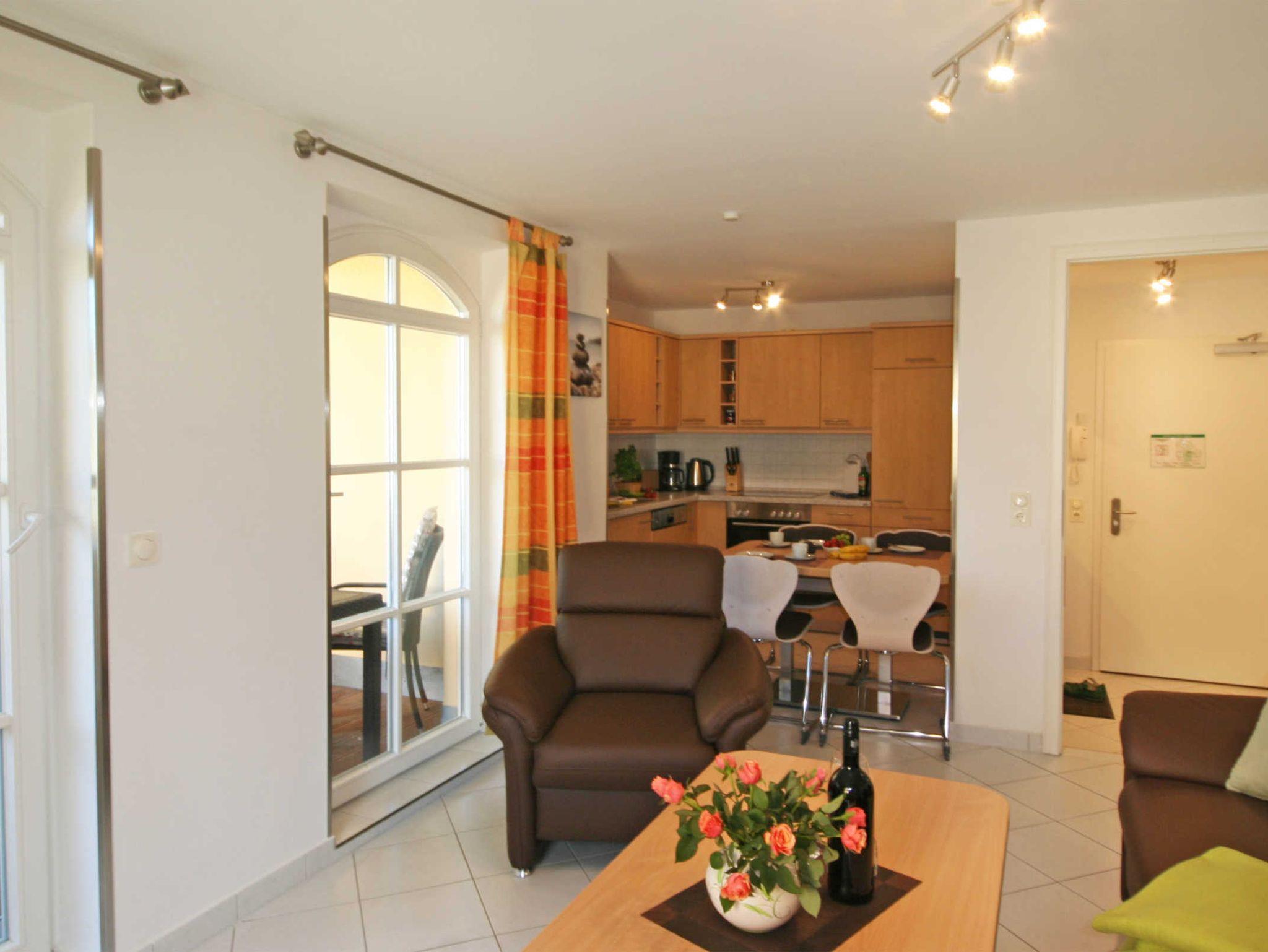 Traumhafte 3-Zimmer-Ferienwohnung in bester Lage mit wunderbarem Blick auf die Ostsee. Verteilt auf zwei Schlafzimmer (jeweils eines mit Doppelbett und eines mit zwei Einzelbetten) können hier 4 Personen Platz finden und einen erholsamen Urlaub genießen. In dem geräumigen Wohnzimmer mit integrierter Küche gibt es sowohl einen Essbereich, als auch einen Sitzbereich mit einem gemütlichem Sofa, Sessel und Fernseher. Von hier aus gelangen Sie auch auf den Hauptbalkon mit Meerblick, auf welchem sich morgens herrlich frühstücken lässt. Der zweite Balkon ist über beide Schlafzimmer begehbar. Die Küche verfügt über einen 4-Plattenherd, Kühlschrank, Backofen, Geschirrspülmaschine, Kaffeemaschine, sowie einen Toaster.