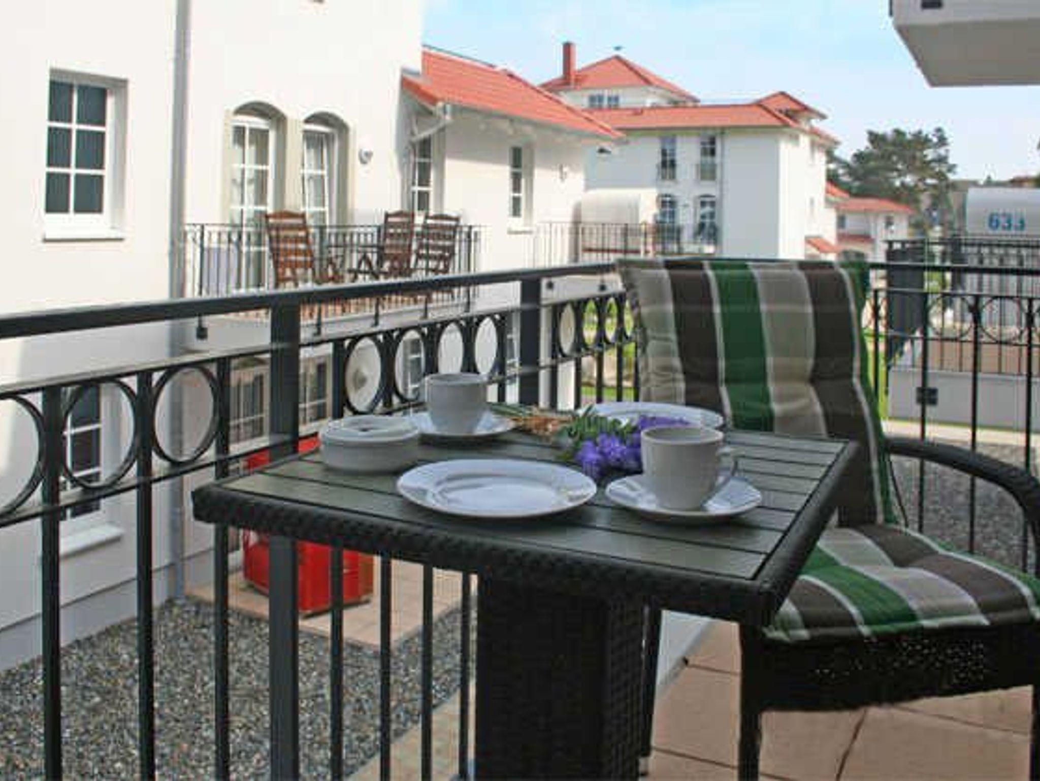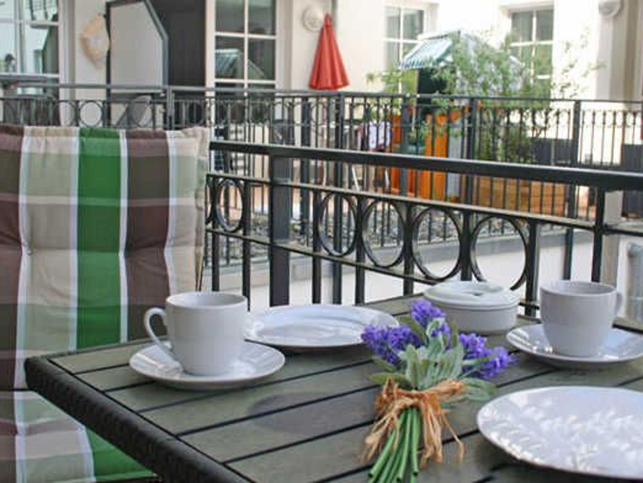 Der nach Osten zum offenen Innenhof gelegene Balkon ist möbliert (4 Sitzplätze).